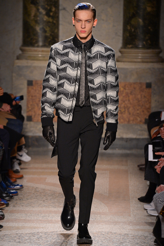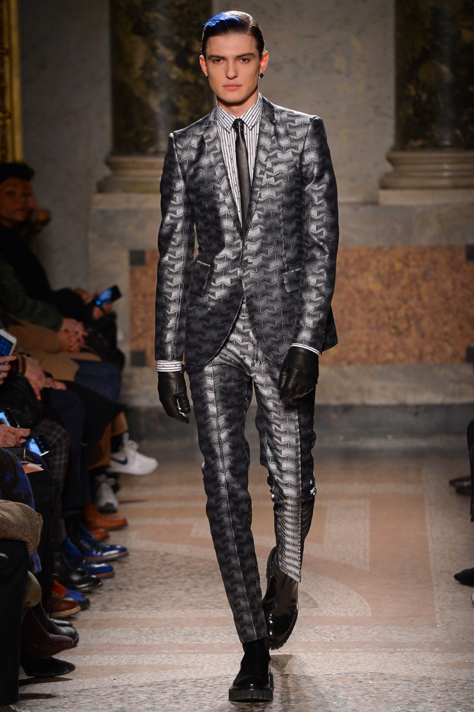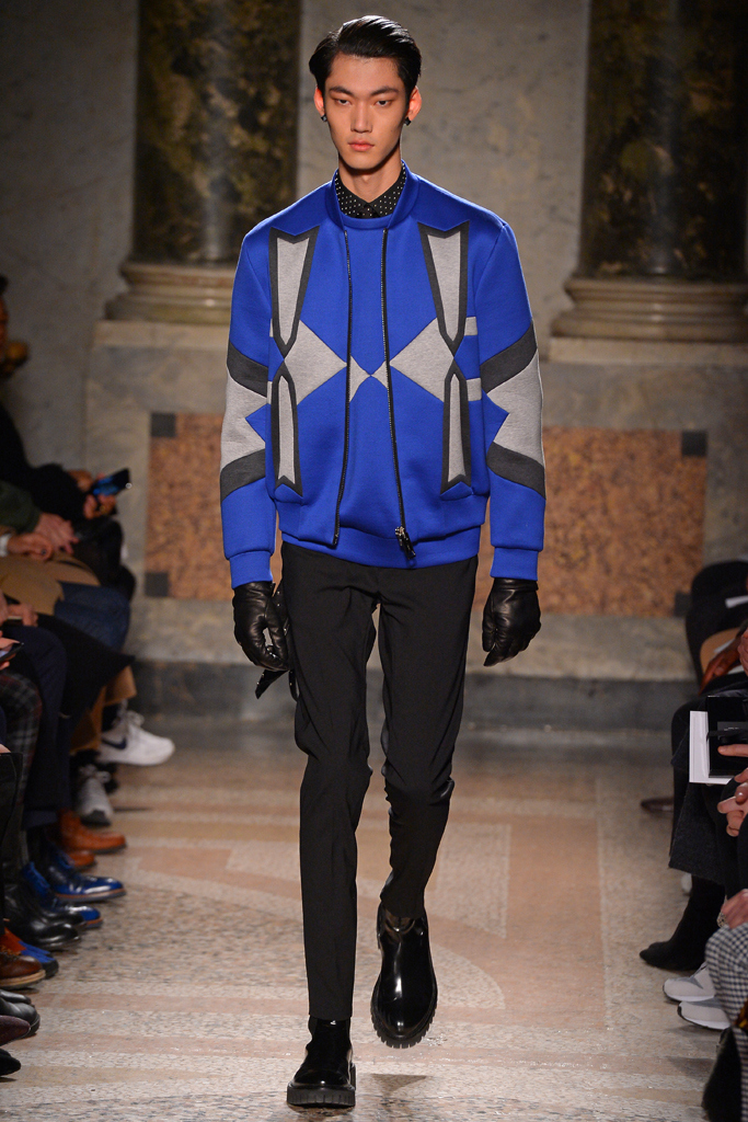 Tom Notte and Bart Van der Herten tapped into the world of sportswear for their fall/winter collection. Neoprene was crafted into bombers featuring graphic patterns, while leather was turned into skintight pants with zippers, and used in the moto racing-inspired patches stitched on the shoulders of a black tailored blazer. Hitting one of the season’s biggest trends so far, the designer played with embellishments, including metallic beads decorating a range of pieces, from poplin shirts to suits.