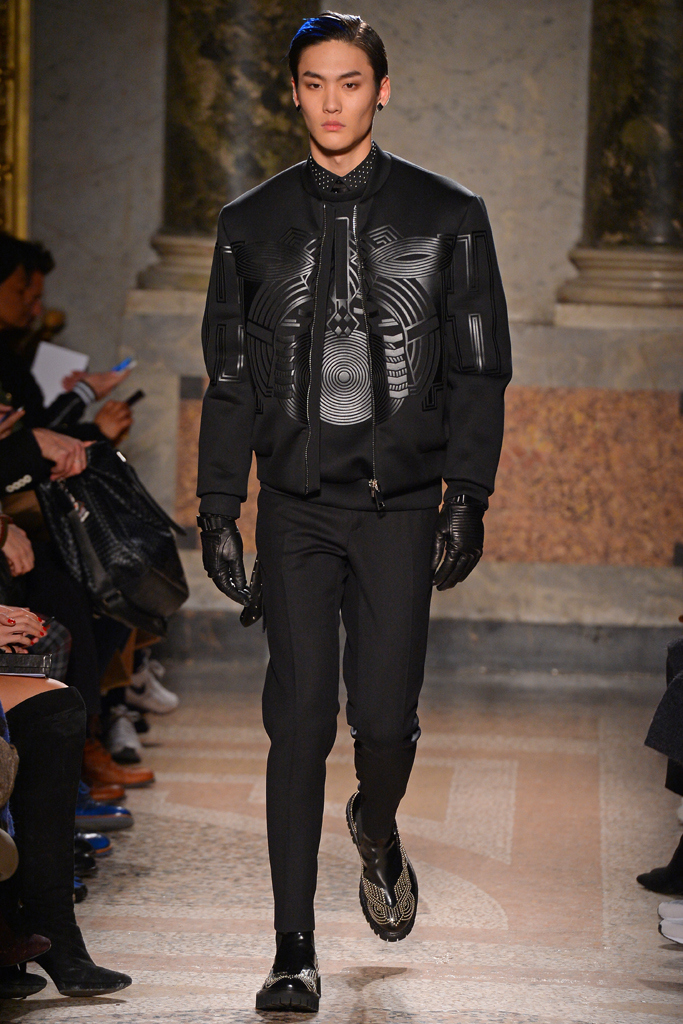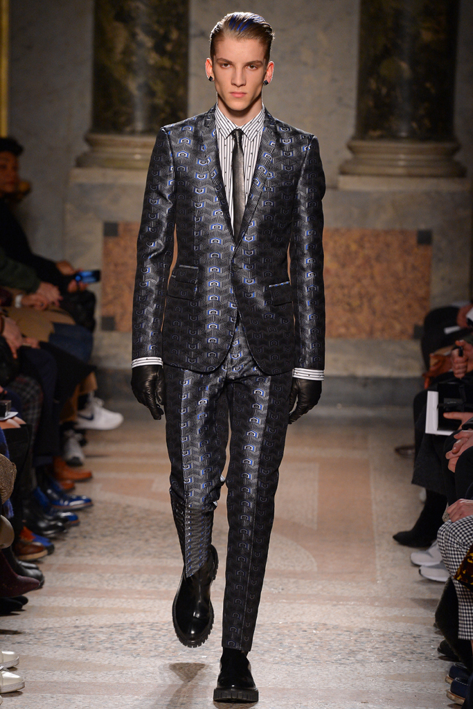 Tom Notte and Bart Van der Herten tapped into the world of sportswear for their fall/winter collection. Neoprene was crafted into bombers featuring graphic patterns, while leather was turned into skintight pants with zippers, and used in the moto racing-inspired patches stitched on the shoulders of a black tailored blazer. Hitting one of the season’s biggest trends so far, the designer played with embellishments, including metallic beads decorating a range of pieces, from poplin shirts to suits.