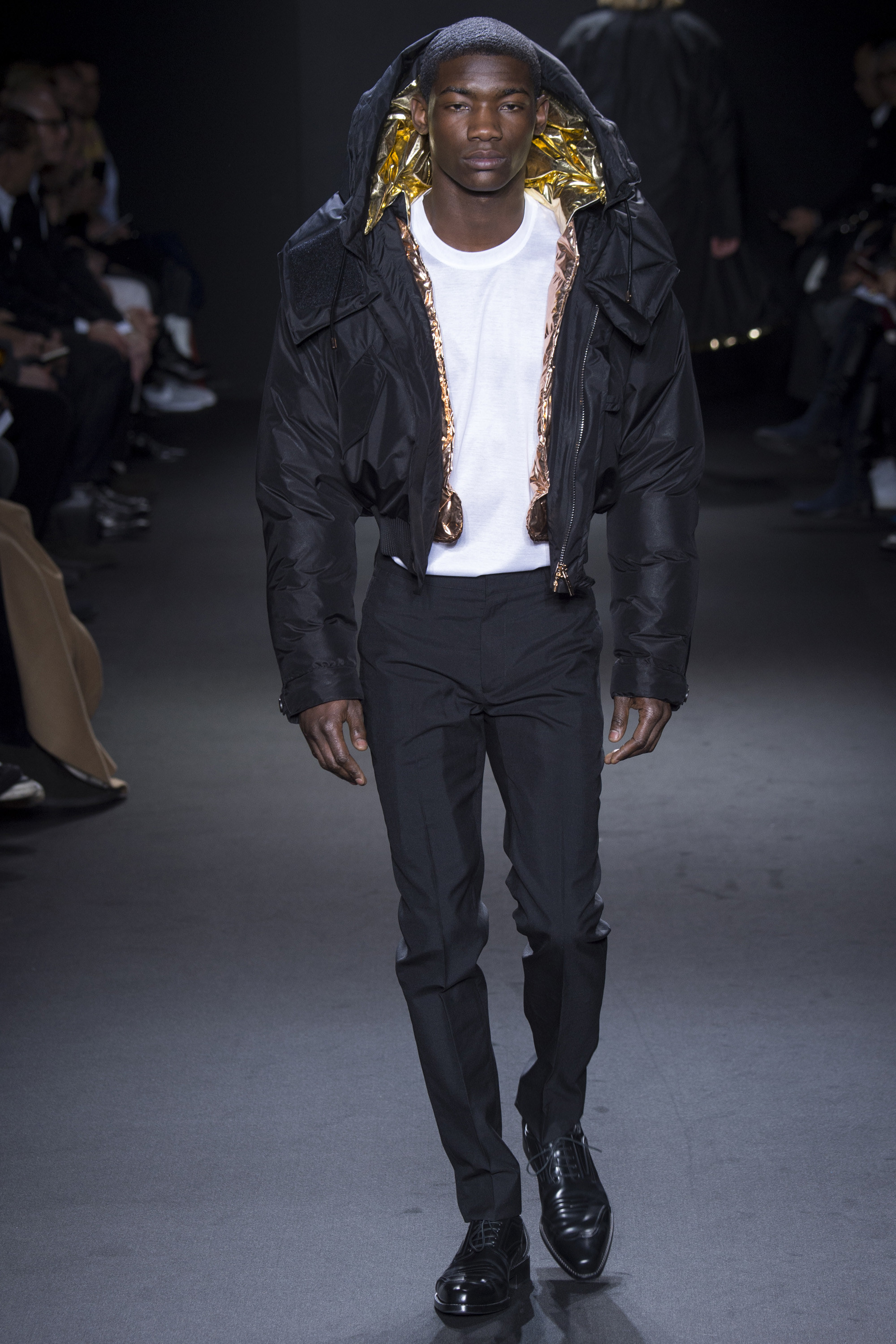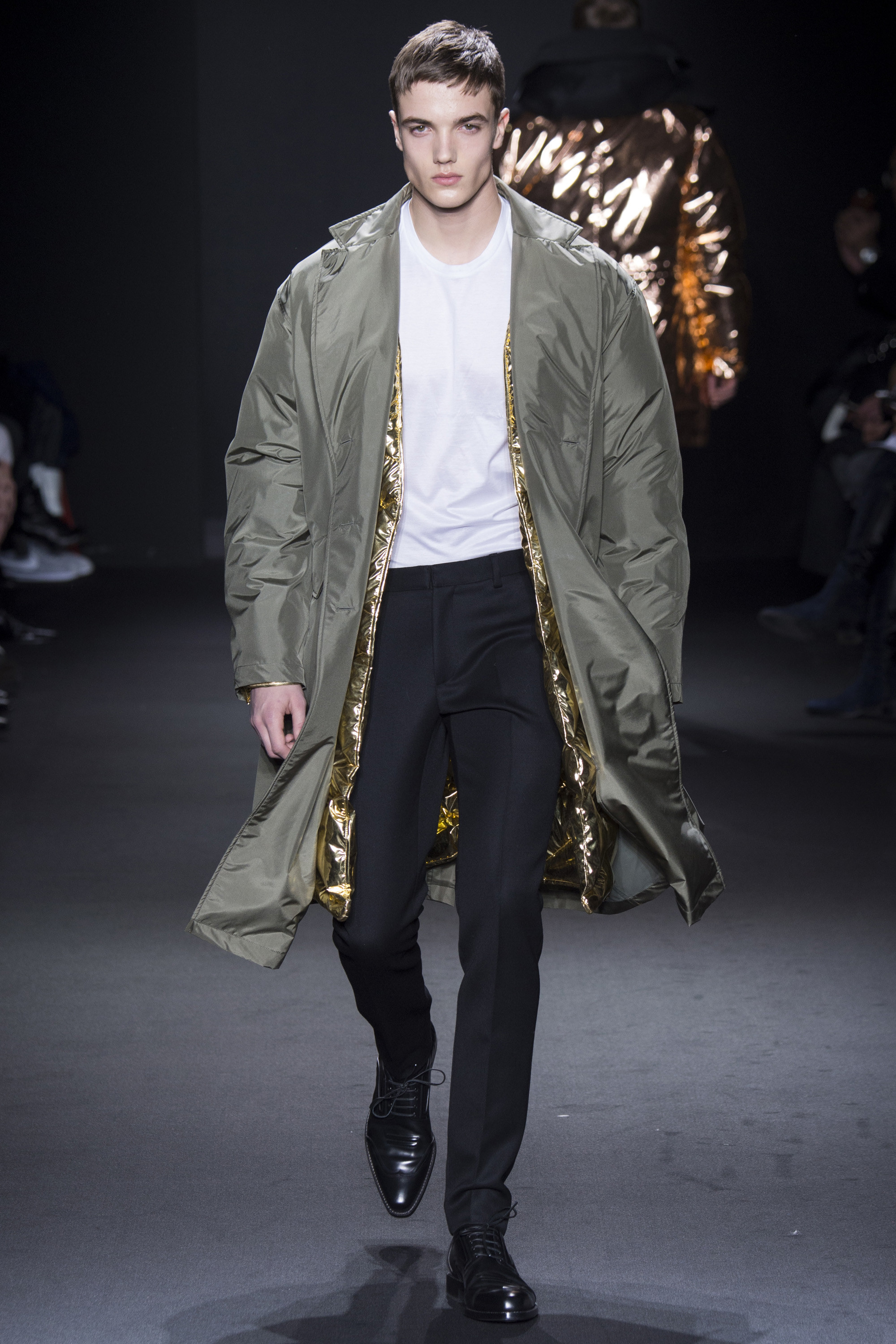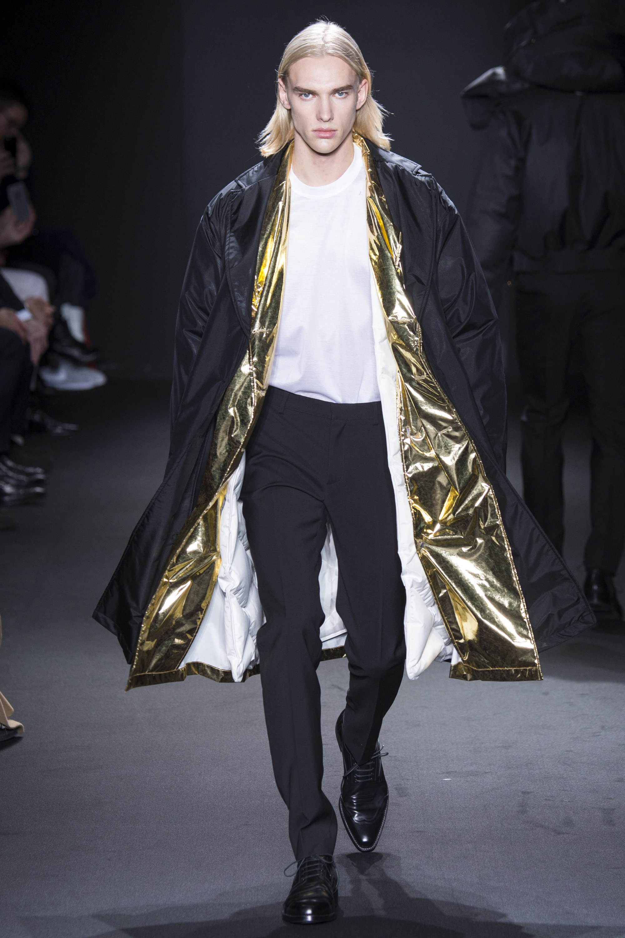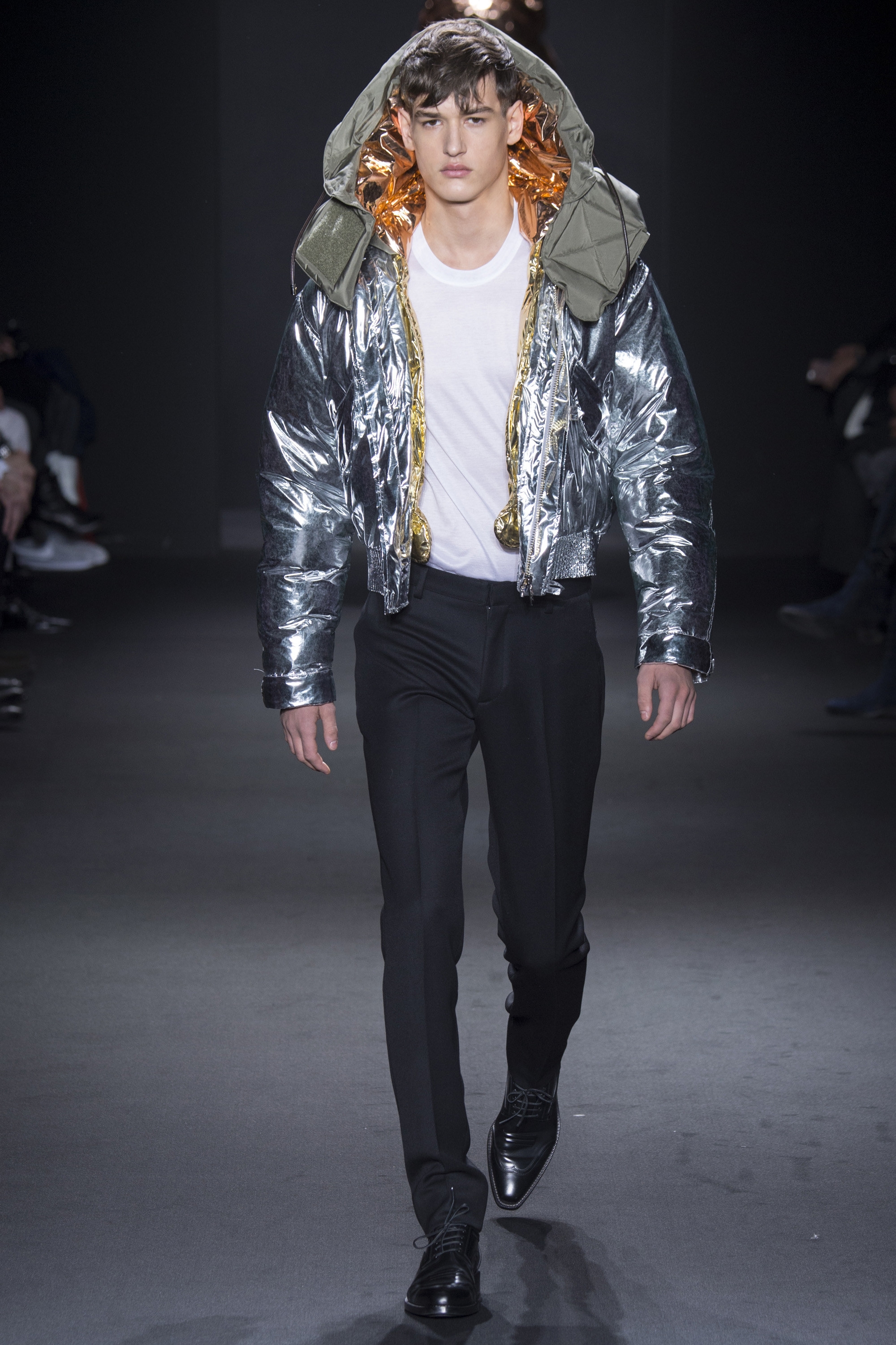 Transformation, however, is a fascinating theme in fashion—and particularly here at Klein. Zucchelli transformed denim into a jacquard, painstakingly woven in a trompe l’oeil of daily wear and tear, making the everyday precious. Zucchelli first used that jean jacquard for Spring—so they lacked the pleasant frisson of surprise. Ditto the foiling, which was reminiscent of a very specific Helmut Lang collection. No one was foiled. Alchemy was the reference Zucchelli tossed out—apparently, it’s something he’s wildly enthusiastic about, and has a library full of reference books on the subject. It did make sense, both as the ostensible inspiration behind all that metallic nylon, pumping up the visual impact of utilitarian anoraks and MA1 jackets; and perhaps of the front row presence of the enigmatic Dallas. Judicious googling ascertained he’s has been transformed into pop culture platinum via the alchemic power of 21st-century social media (apparently, he’s an especially adept user of the social media platform Vine).