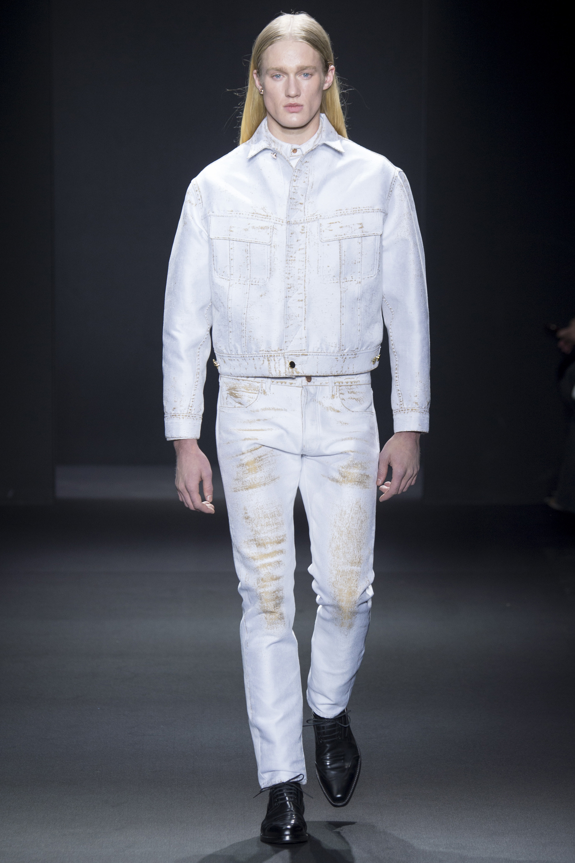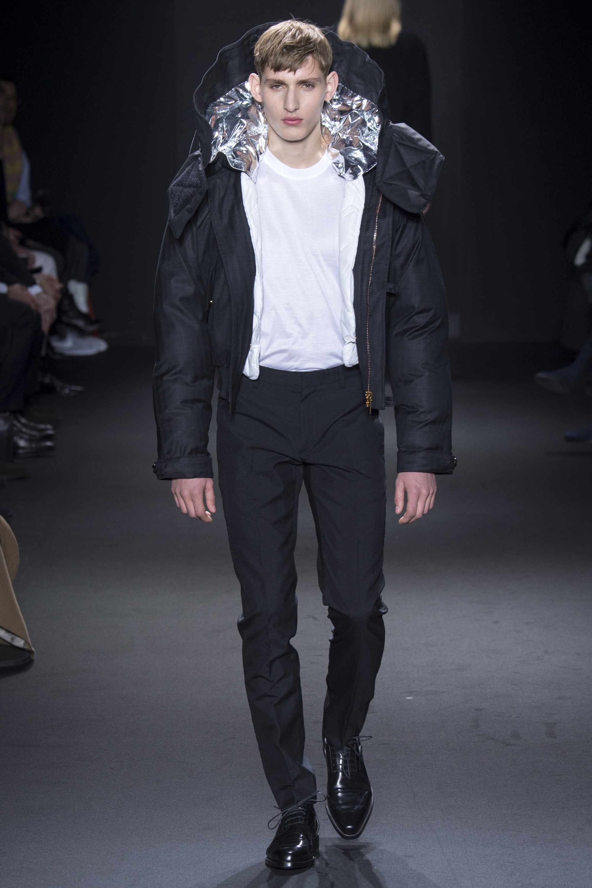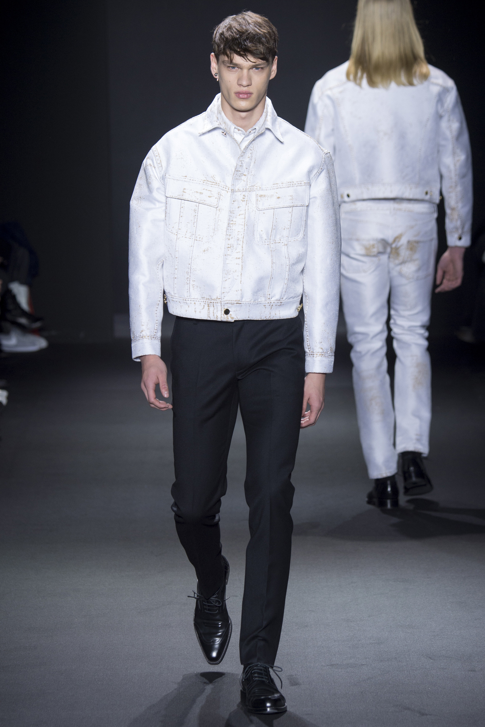 Transformation, however, is a fascinating theme in fashion—and particularly here at Klein. Zucchelli transformed denim into a jacquard, painstakingly woven in a trompe l’oeil of daily wear and tear, making the everyday precious. Zucchelli first used that jean jacquard for Spring—so they lacked the pleasant frisson of surprise. Ditto the foiling, which was reminiscent of a very specific Helmut Lang collection. No one was foiled. Alchemy was the reference Zucchelli tossed out—apparently, it’s something he’s wildly enthusiastic about, and has a library full of reference books on the subject. It did make sense, both as the ostensible inspiration behind all that metallic nylon, pumping up the visual impact of utilitarian anoraks and MA1 jackets; and perhaps of the front row presence of the enigmatic Dallas. Judicious googling ascertained he’s has been transformed into pop culture platinum via the alchemic power of 21st-century social media (apparently, he’s an especially adept user of the social media platform Vine).