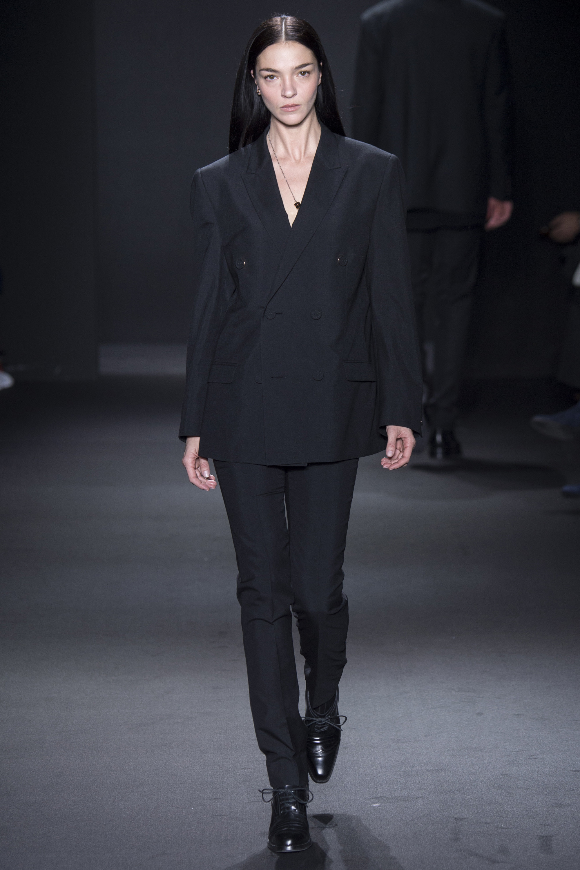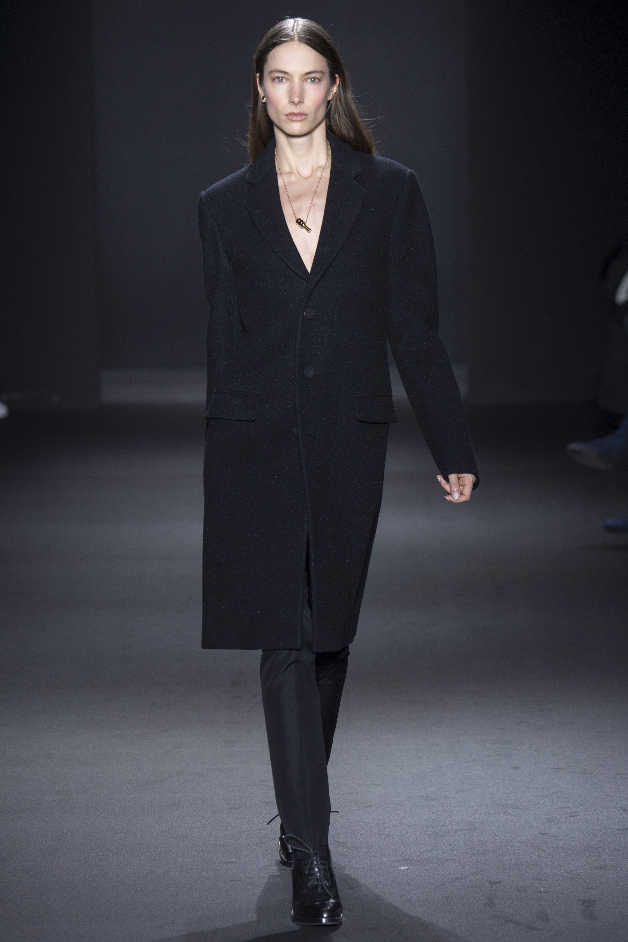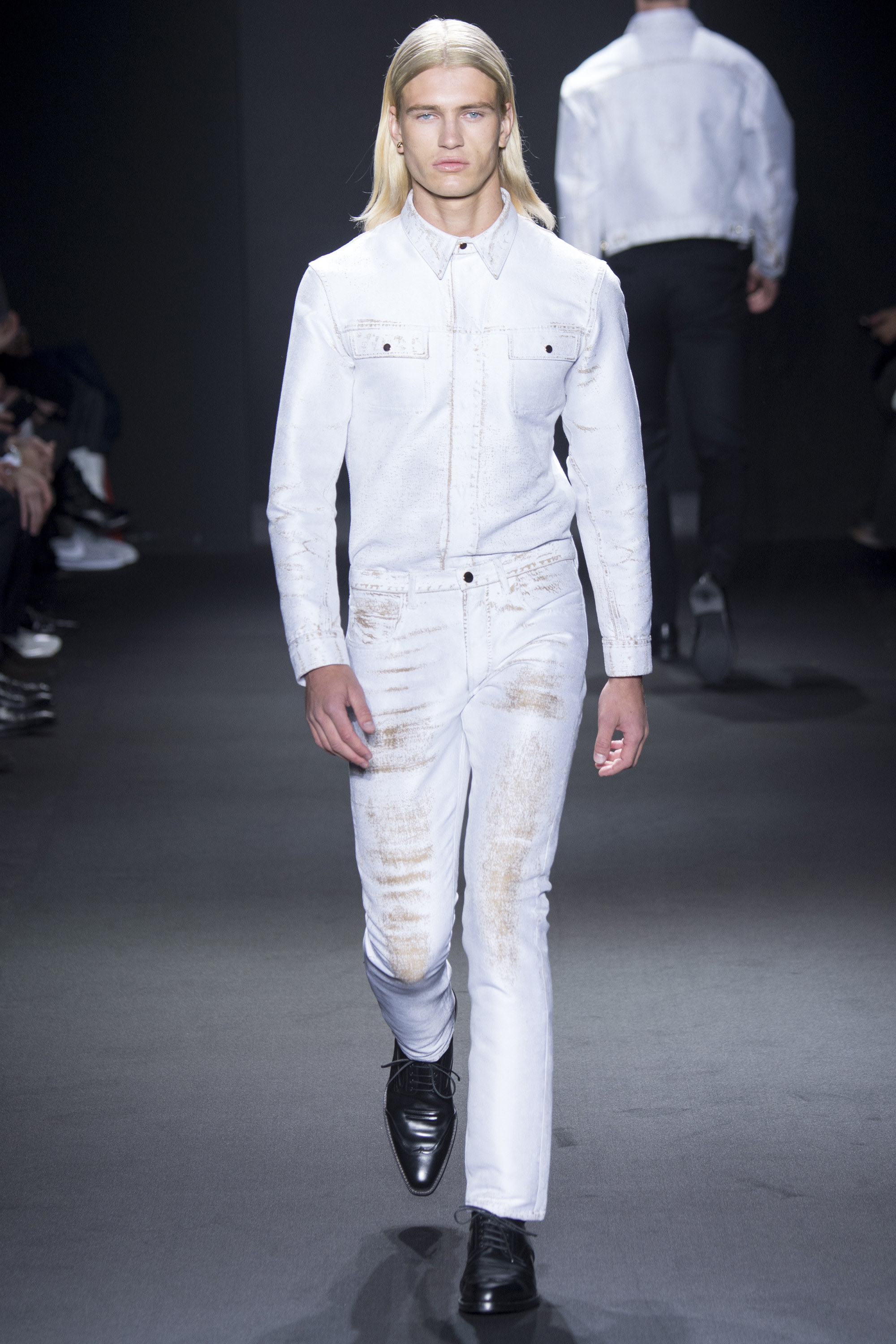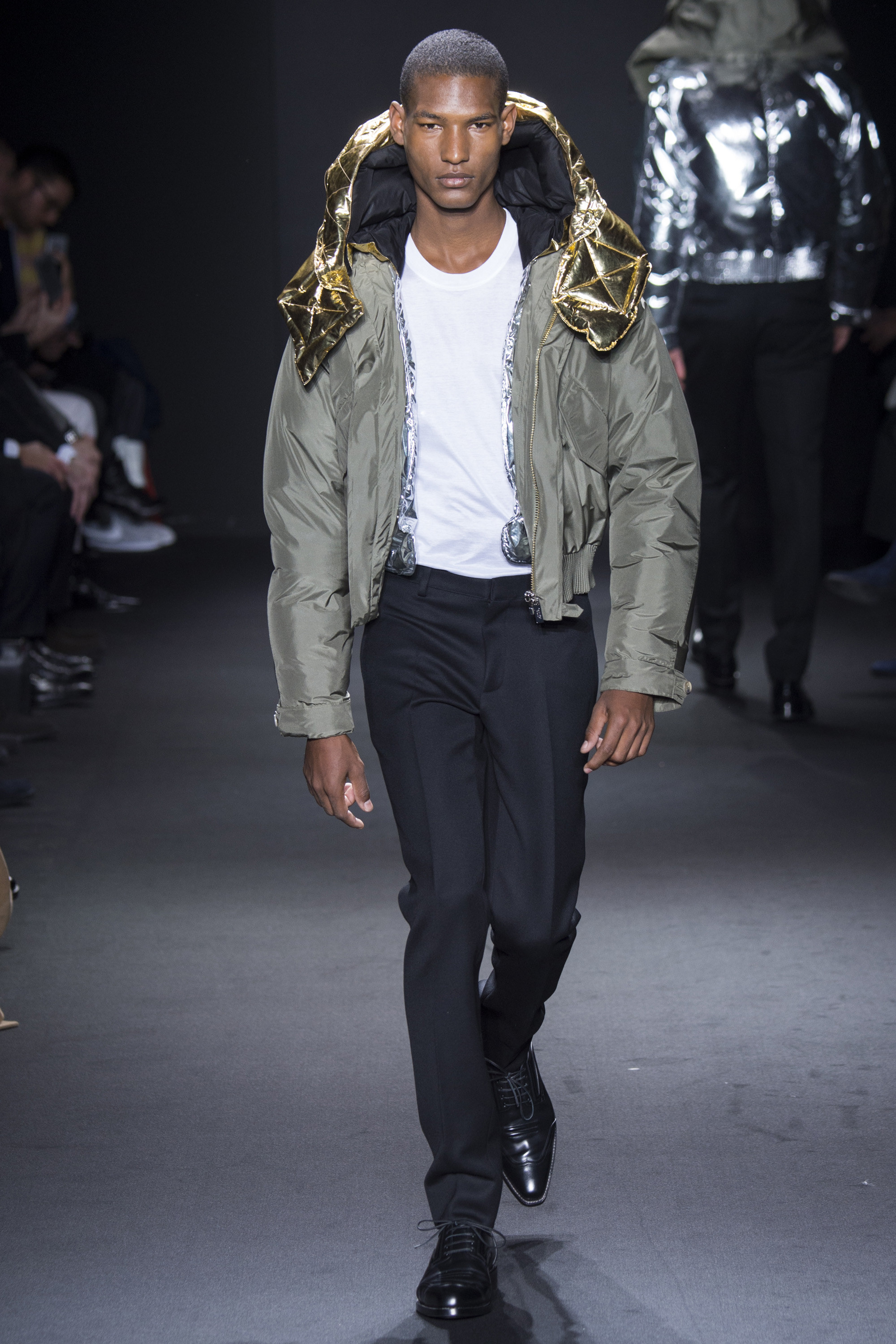 Transformation, however, is a fascinating theme in fashion—and particularly here at Klein. Zucchelli transformed denim into a jacquard, painstakingly woven in a trompe l’oeil of daily wear and tear, making the everyday precious. Zucchelli first used that jean jacquard for Spring—so they lacked the pleasant frisson of surprise. Ditto the foiling, which was reminiscent of a very specific Helmut Lang collection. No one was foiled. Alchemy was the reference Zucchelli tossed out—apparently, it’s something he’s wildly enthusiastic about, and has a library full of reference books on the subject. It did make sense, both as the ostensible inspiration behind all that metallic nylon, pumping up the visual impact of utilitarian anoraks and MA1 jackets; and perhaps of the front row presence of the enigmatic Dallas. Judicious googling ascertained he’s has been transformed into pop culture platinum via the alchemic power of 21st-century social media (apparently, he’s an especially adept user of the social media platform Vine).