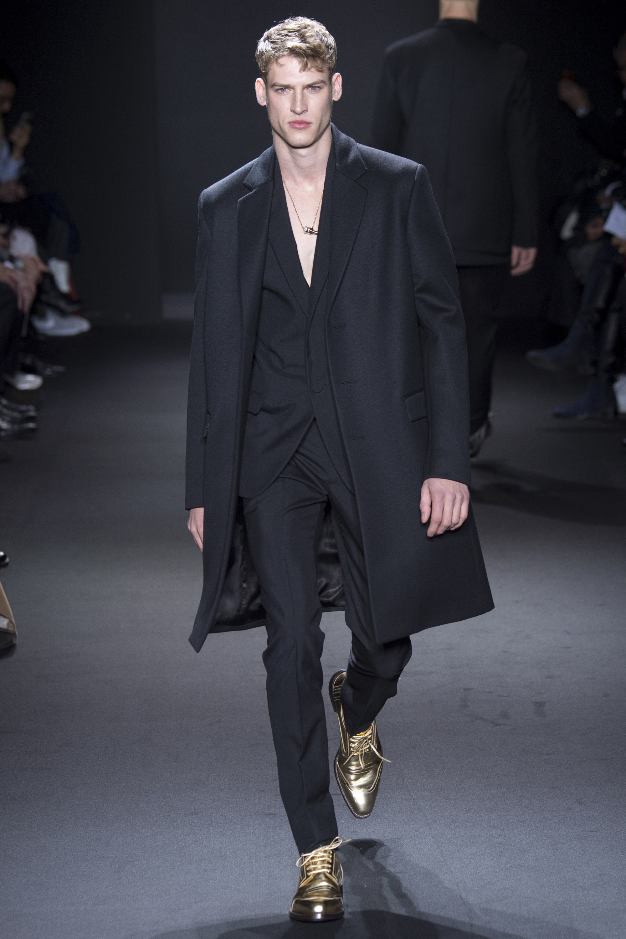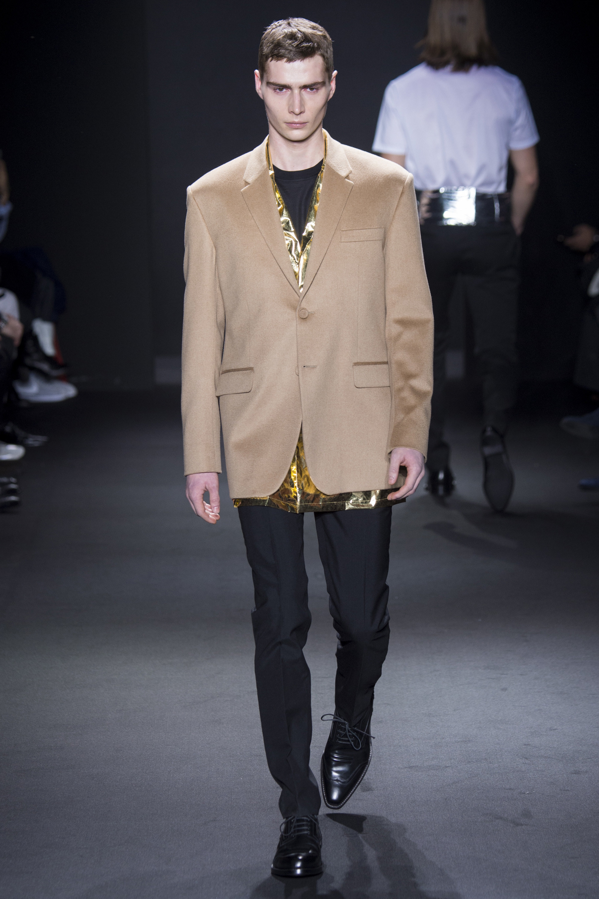 That’s the thing about icons; there aren’t that many that everyone can agree on. Italo Zucchelli has more than a few at his disposal at Calvin Klein, though—garment-wise, the logoed waistband and the world’s first wildly successful designer denims rank up high; there are also those tanned, toned, and semi-clad demigods immortalized by Bruce Weber, the kind of guys those teenage girls would have been screaming for 20 years ago. Foiled nylon in gold, platinum, and rose-gold framed the faces and bodies of those mens’ contemporary counterparts, the buffed-out models that make a Calvin Klein show look utterly different from anything else in menswear. I couldn’t help but think they looked a little like gilded Catholic icons of suspiciously good-looking saints. But maybe that wasn’t intentional.
