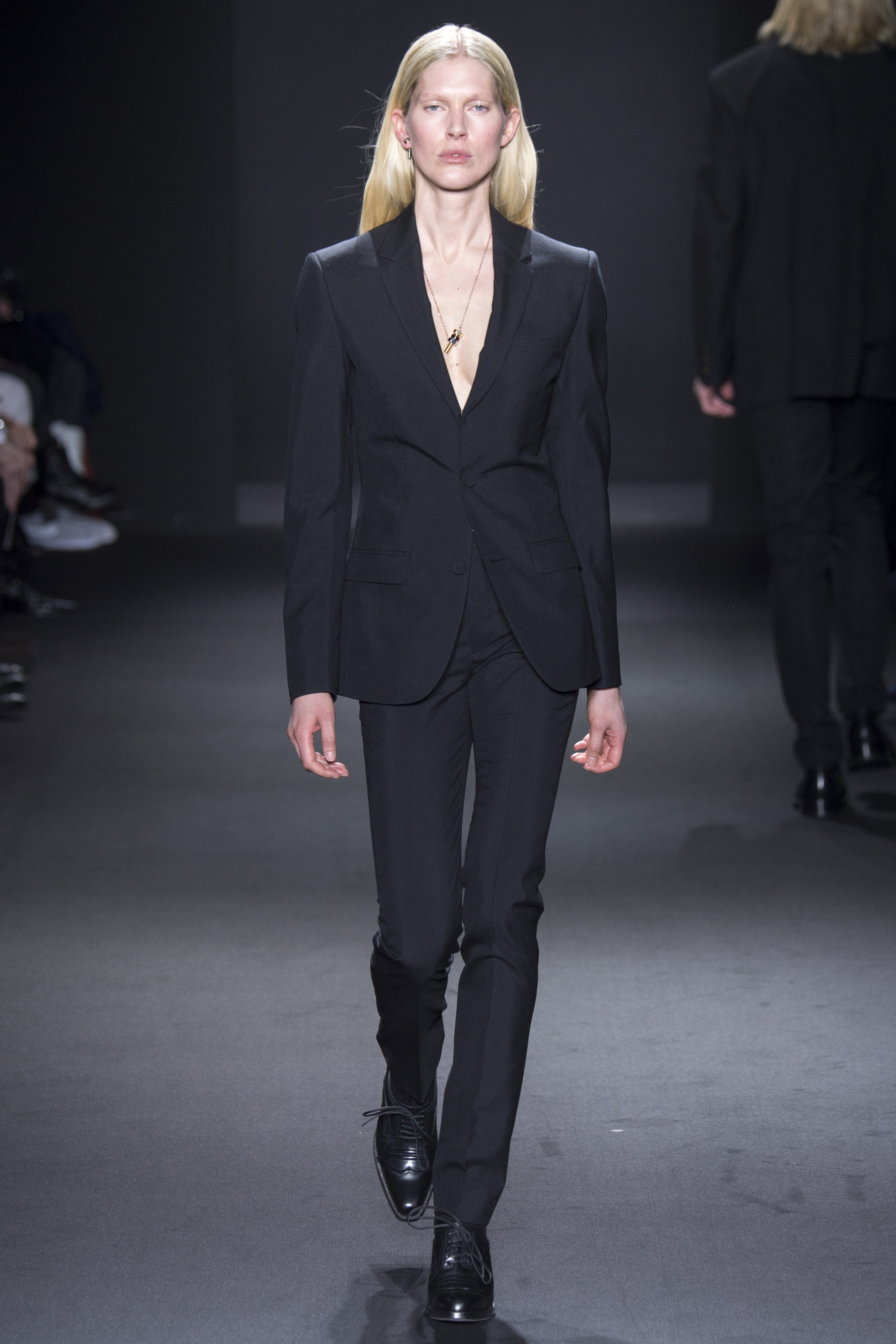 Zucchelli built his collection this time around on another icon: the man’s suit. “I wanted to show the universal power of men’s tailoring,” he said. He decided to do that by putting his men’s suits on women for the first time—the boldface model likes of Mariacarla Boscono, Iselin Steiro, Jessica Miller, and Gemma Ward. They’re not exactly Linda, Christy, Claudia, and Naomi, but the former foursome, they do have an instant-recognition factor. “It’s sensual, sexual,” said Zucchelli of those Calvin suits, worn over bare skin by male and female alike. They were impeccably cut—sometimes so perfectly you didn’t realize quite how they built out the muscular models into Superman proportions. Not that they weren’t already naturally endowed: It takes a special type of man to look good in the CK-waistbanded long-underwear-as-outerwear that bottomed suit jackets at the end of the show. We all know what that means.