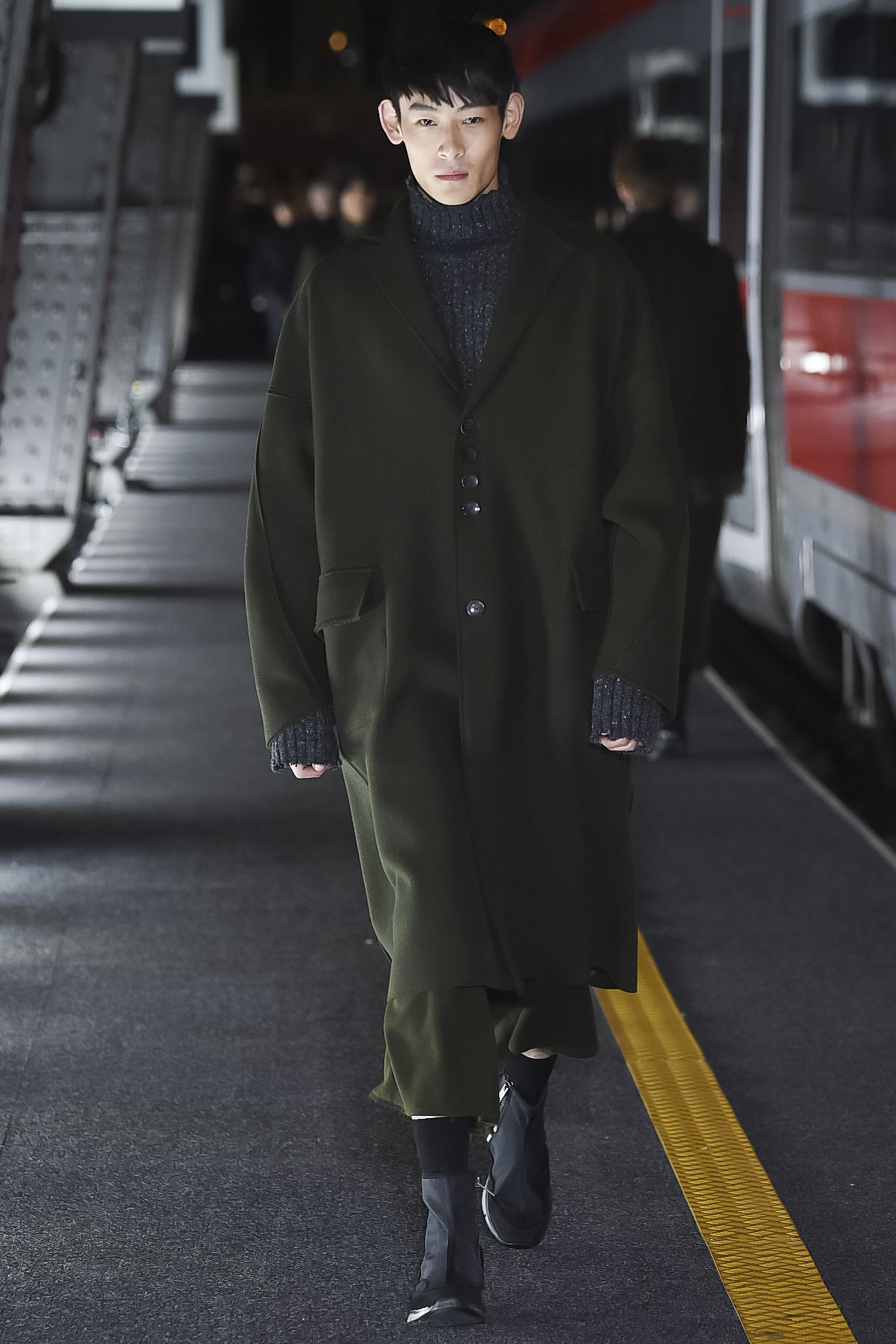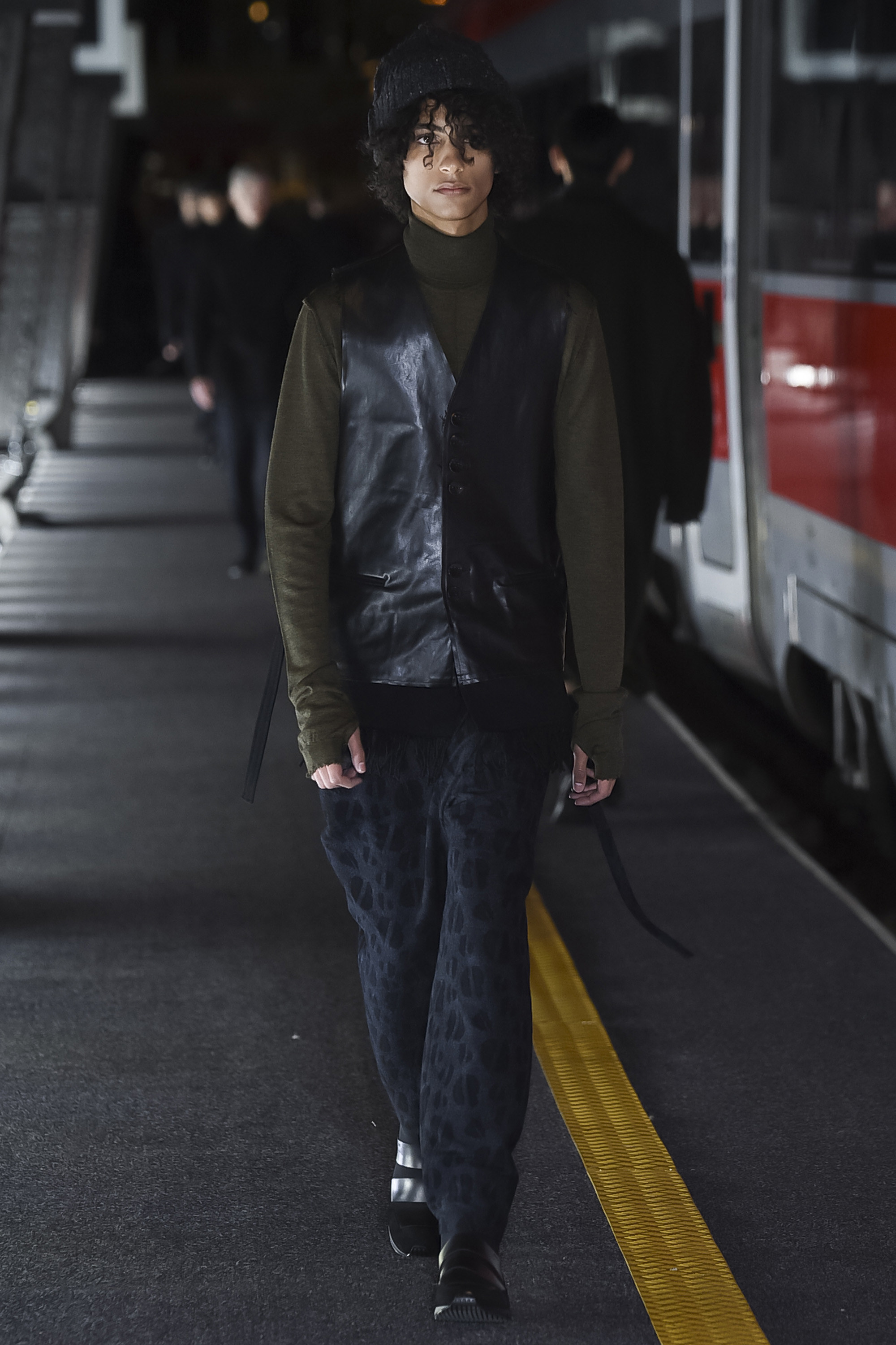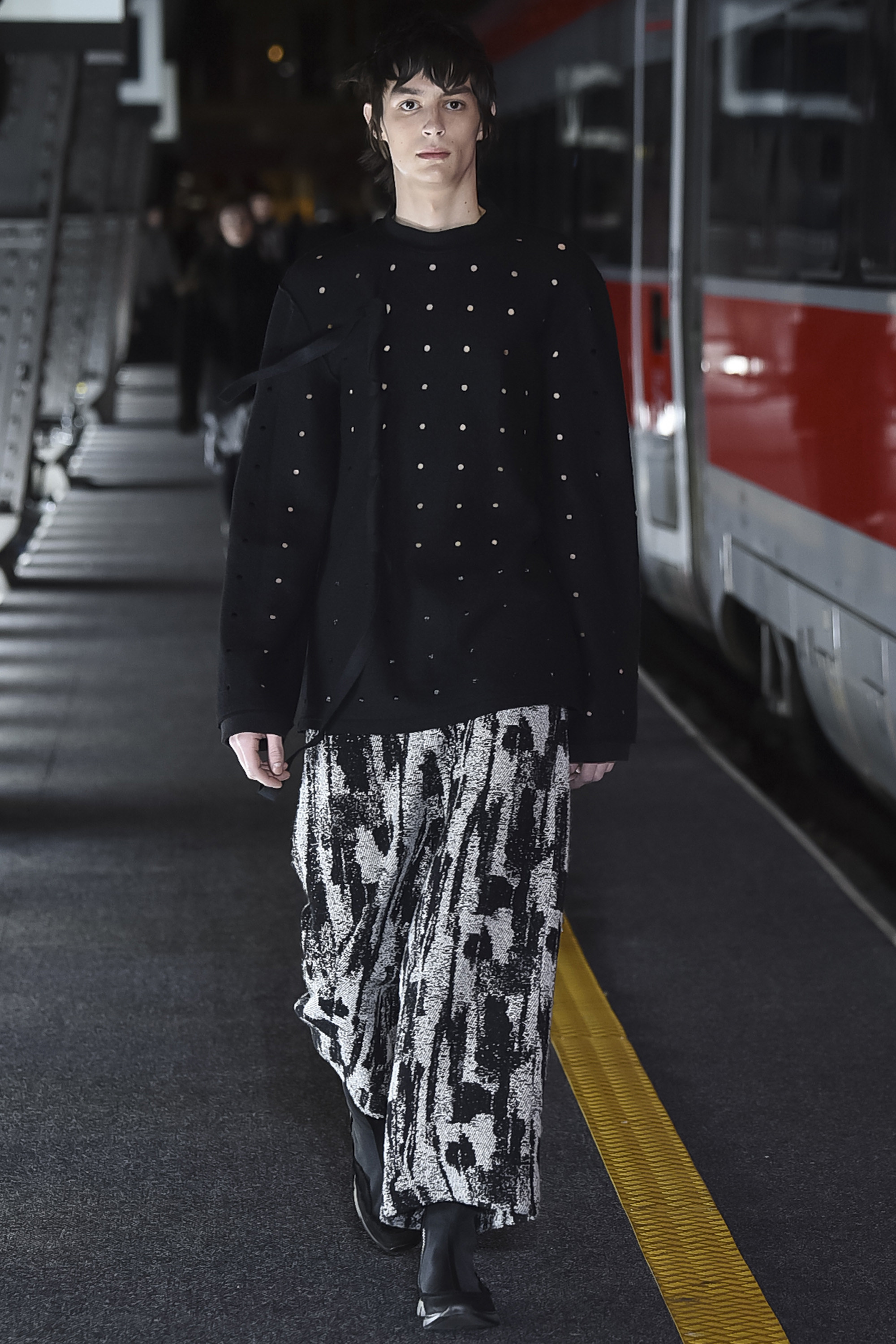 The show on platform 22—due for departure at 8:00 p.m.—was delayed by 35 minutes. That’s life come the climax of Milan menswear Sunday, the most densely packed show day in the calendar. Damir Doma had fantastically swung it to show this collection inside Milan’s central station—a magnificent building that has blessedly endured long beyond its fascist conception. Doma said: “It’s my favorite location in Milan—whenever I come here, I’m extremely impressed. We try to think out of the box and find show spaces that are not so common. But we cannot pay a lot—we are not that kind of company. So we were super-lucky that there was someone in the office here who loves the brand and opened all the gates for us.”