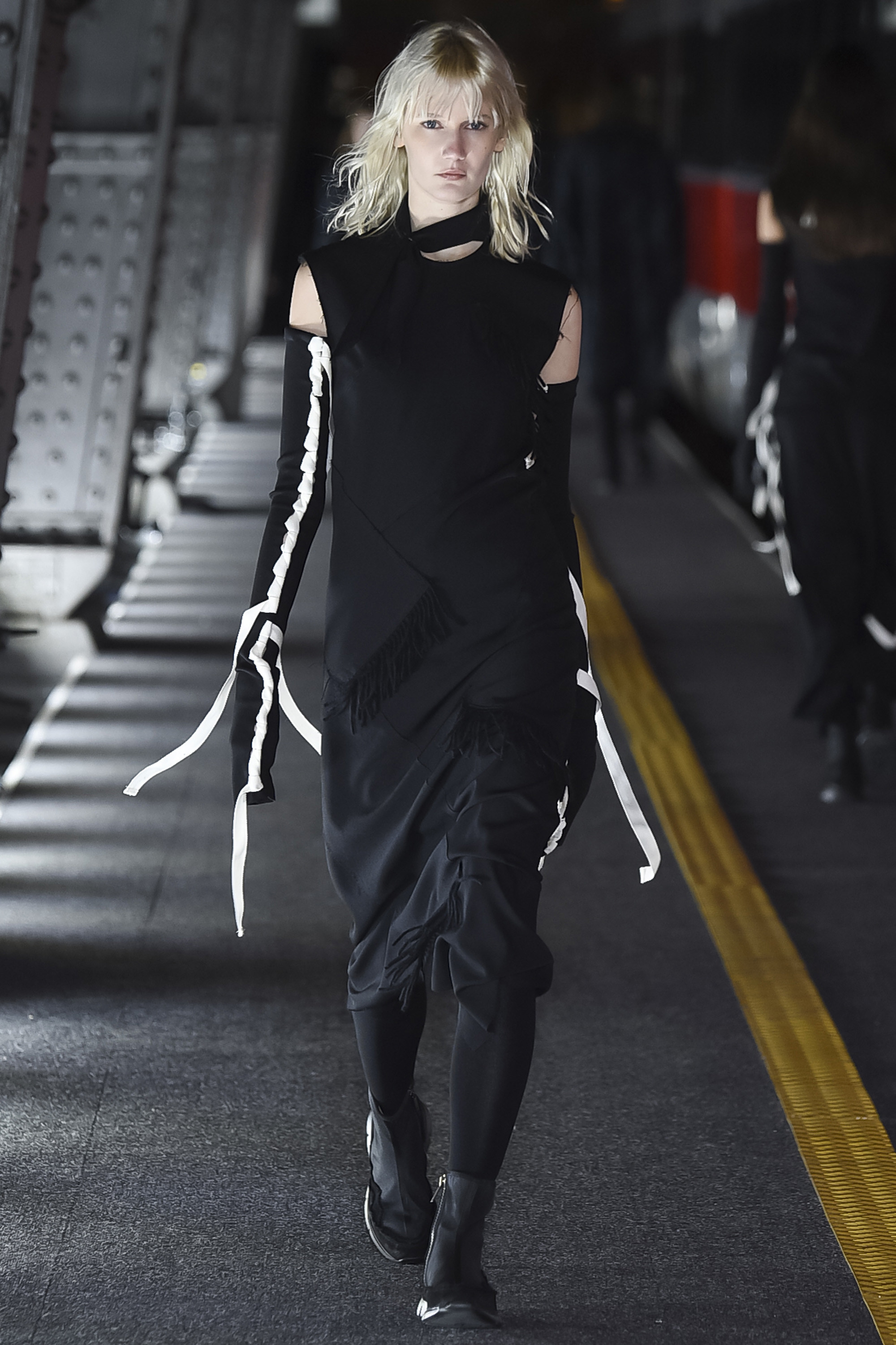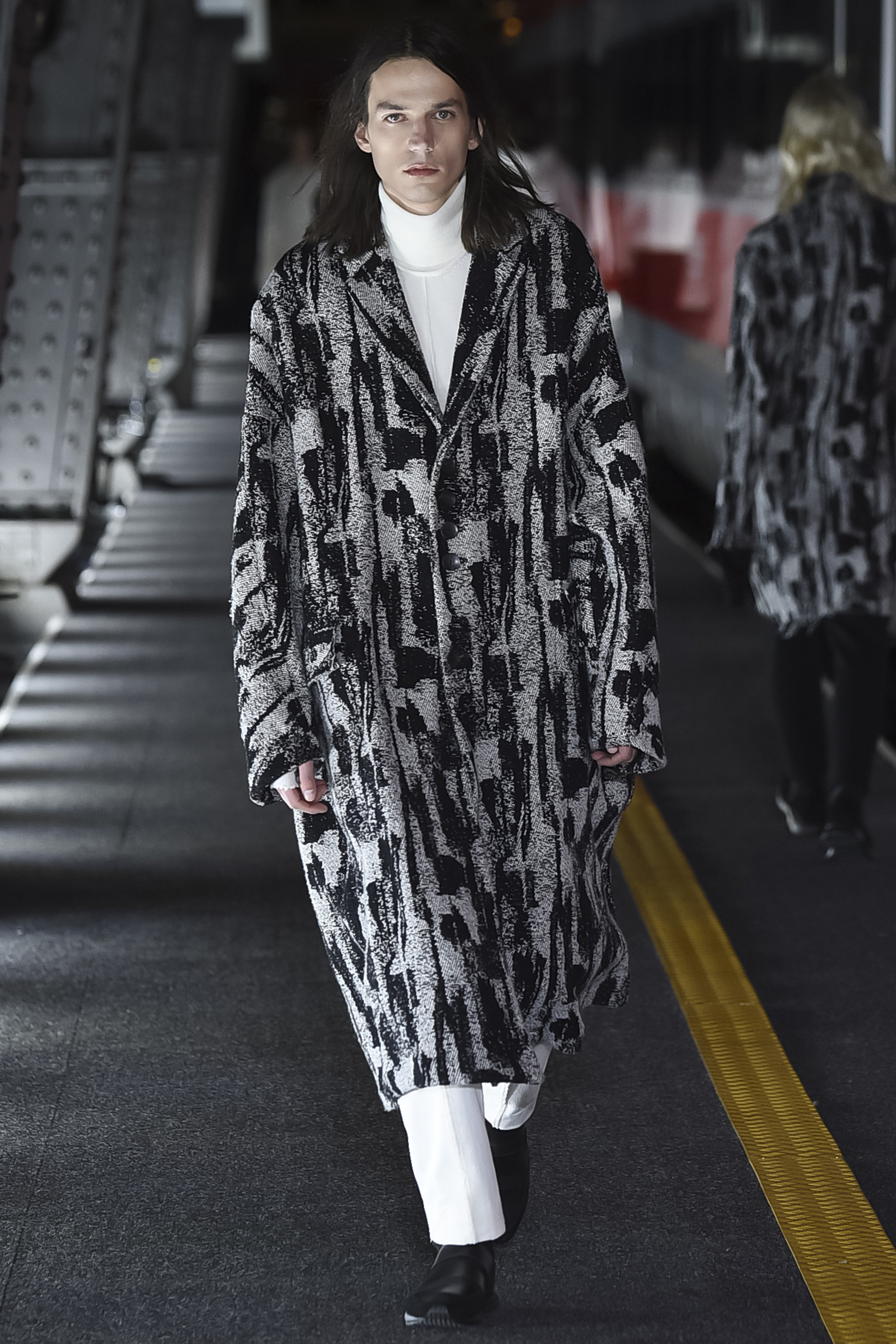 Buttons were clustered at the center of garments, which stretched the eye’s expected perspective. The shades of gray jacquard, a print of what looked like hoofprints on the snow at midnight, and white painted daubs on black background provided the visual texture. Afterward, the audience trailed away like commuters on the last train from Fall ’16. Doma said of his venue: “It was very symbolic. Because for the last two collections we have been transitioning from Paris—we were changing staff and ateliers—and this is the first one that feels like it was completely done in Milan. I feel I have arrived.”
