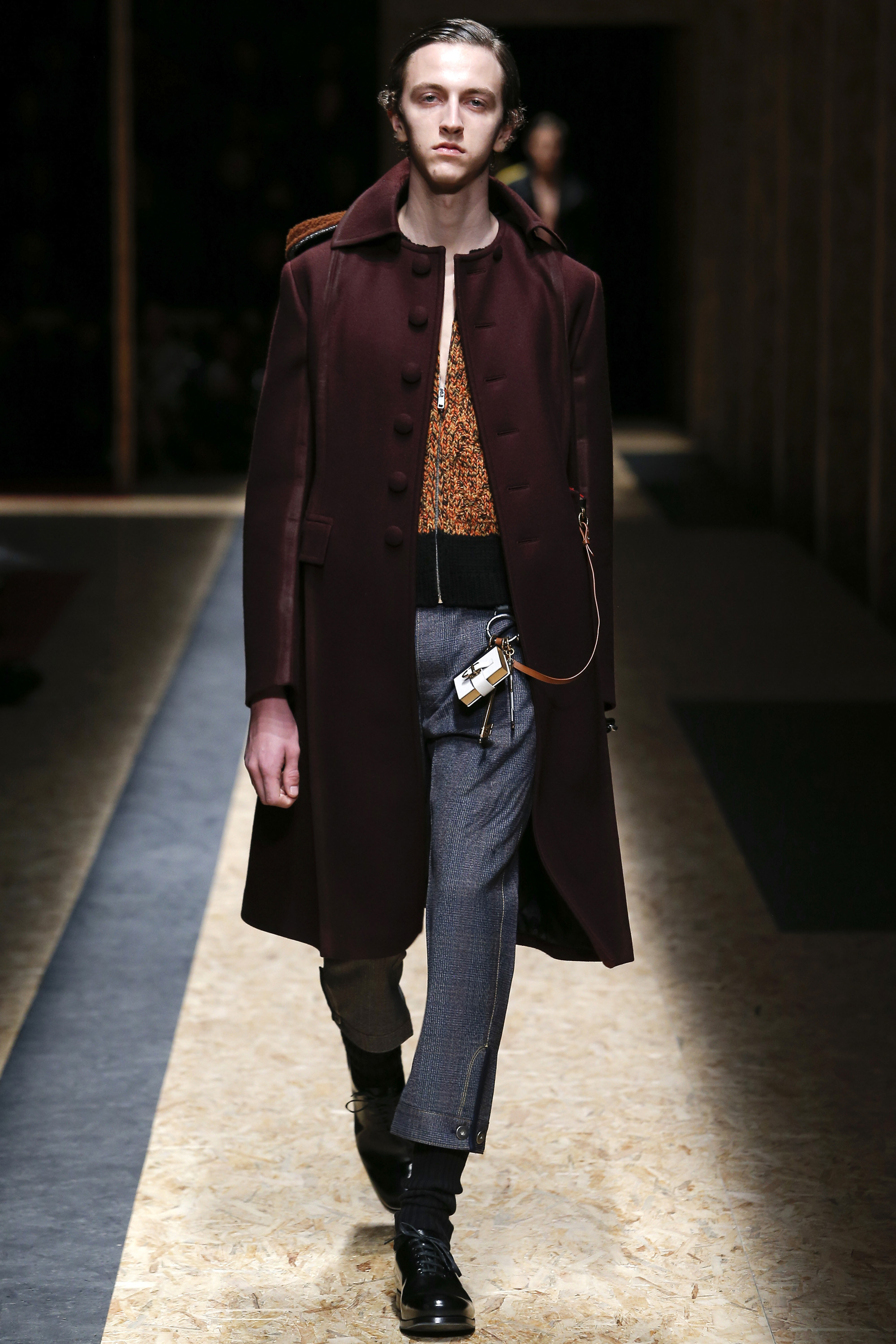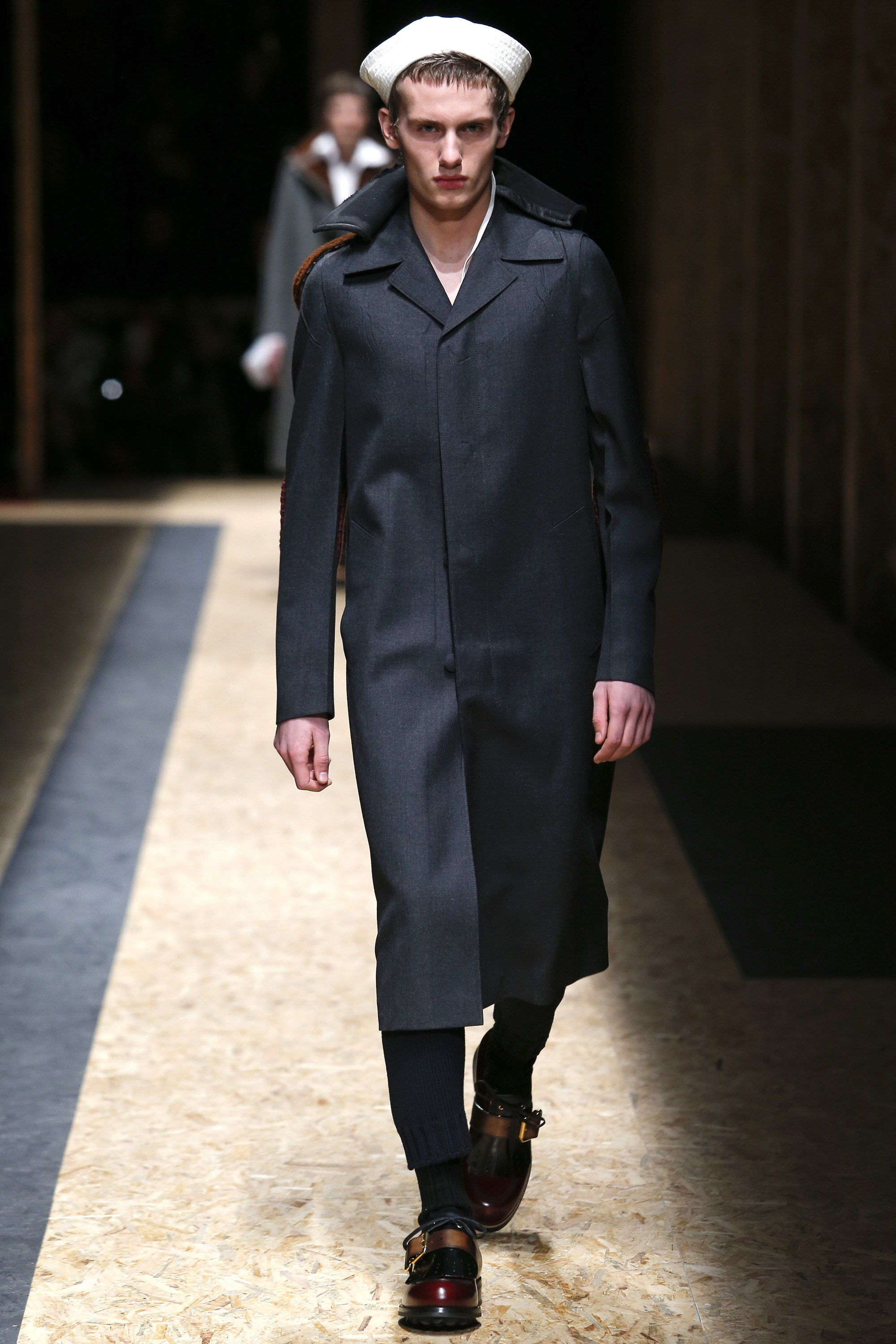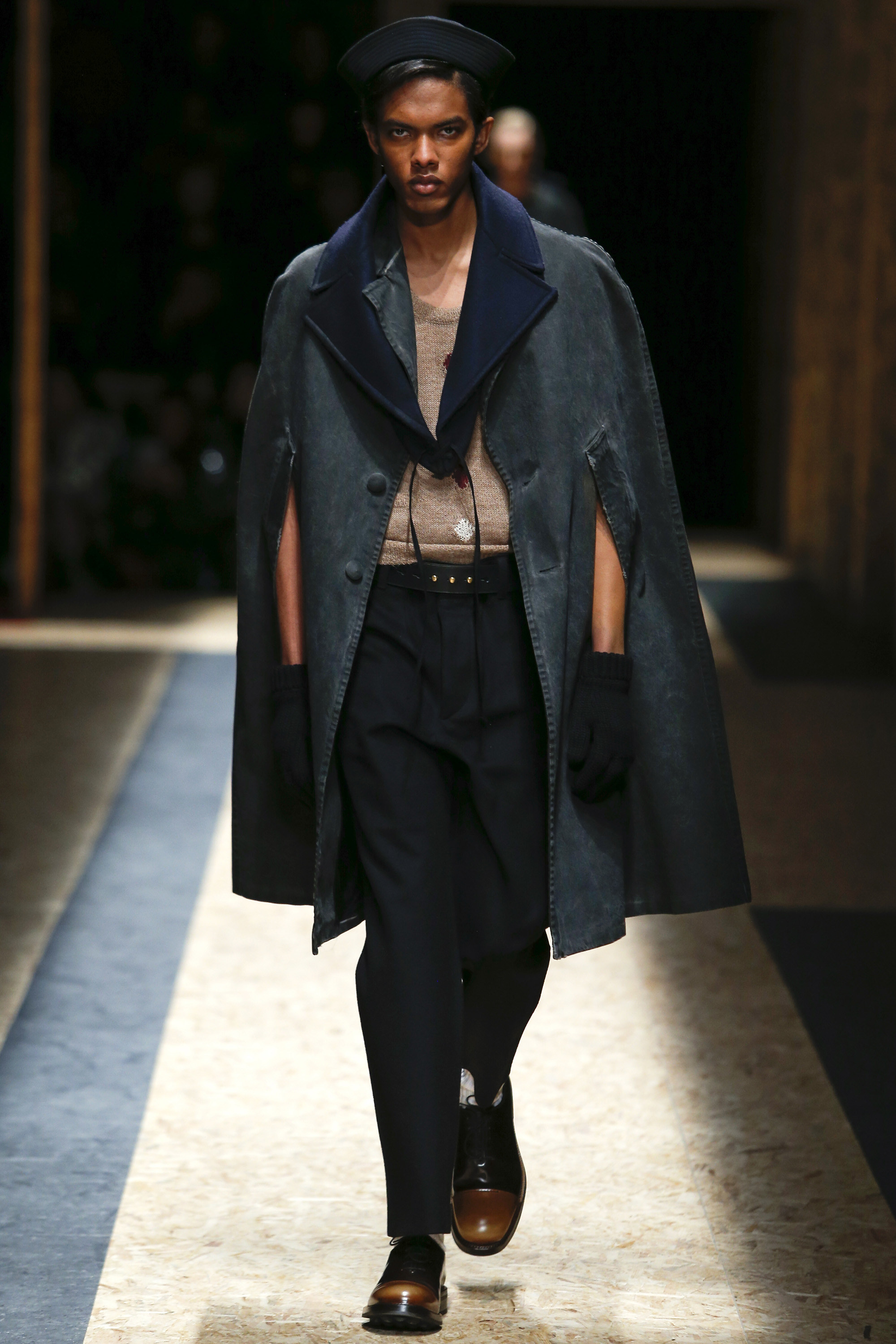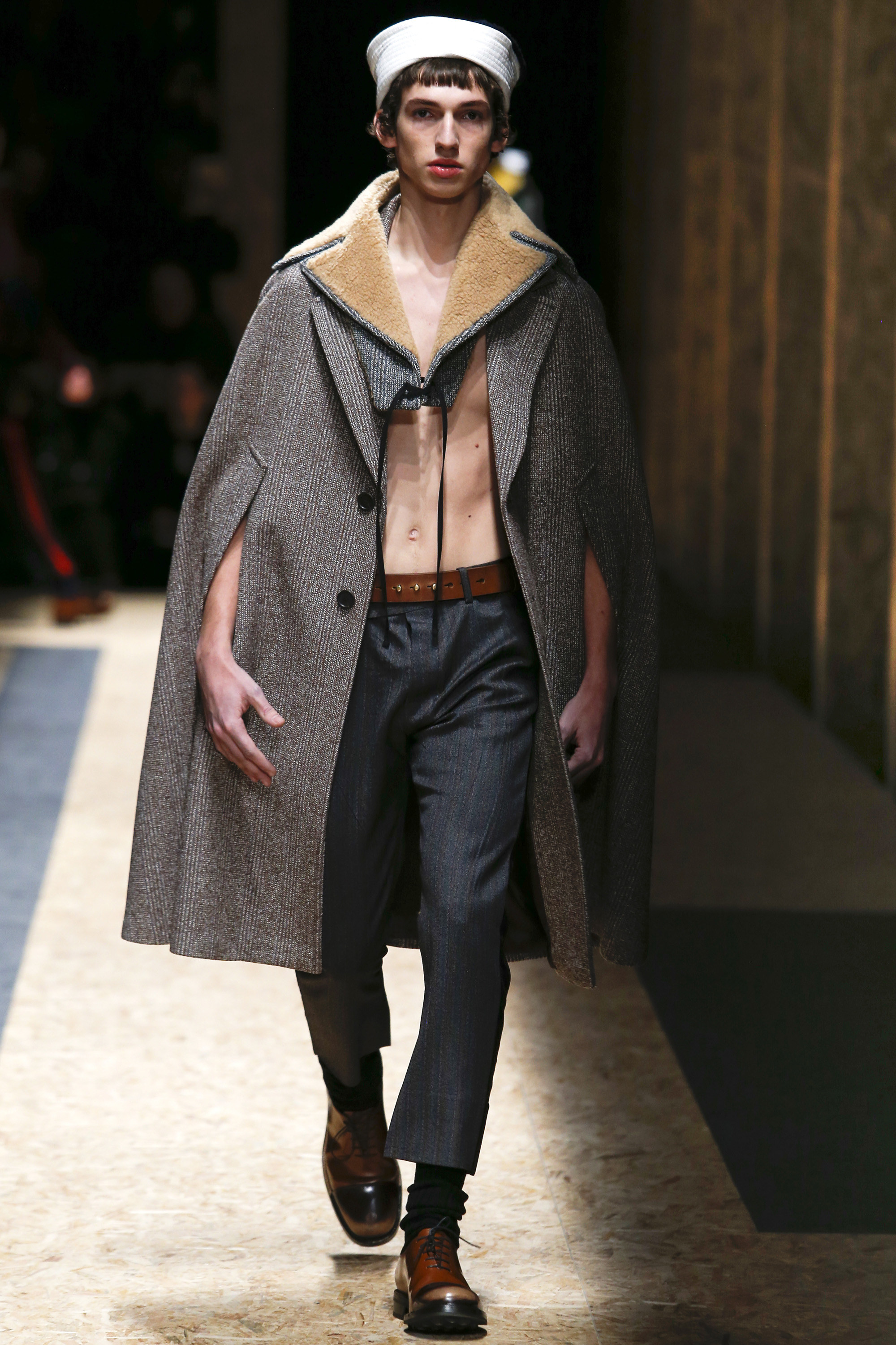 These densely layered images were echoed in the wealth of new shapes, combinations and details that filed through a multitiered set of wood particle board constructed to evoke a theater or public square. The men wore multiple variations on naval dress, from small, waist-cinched jackets to dramatic capes and handsome officer coats. The flyaway collars and hoods — in shirt fabrics, stiff leather or shearling-lined denim — look like the 2016 version of Prada’s hit fur tippets of yore.