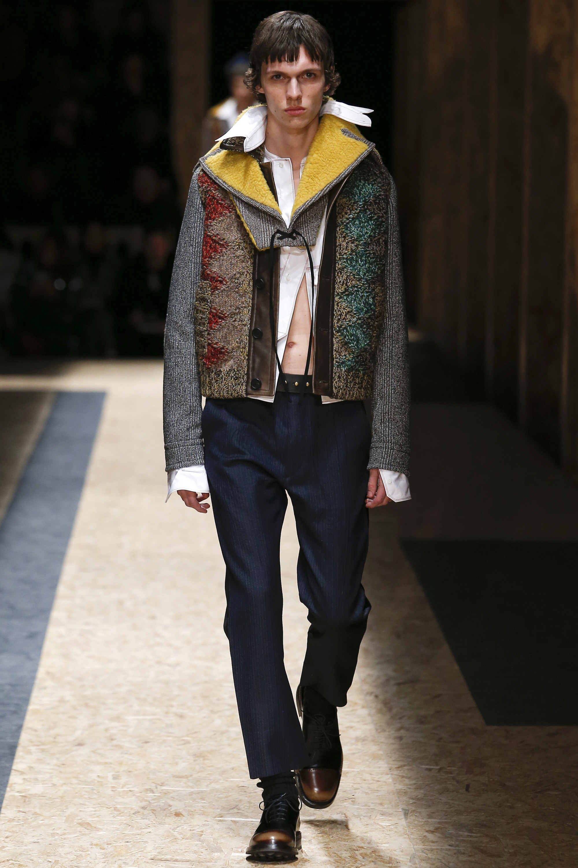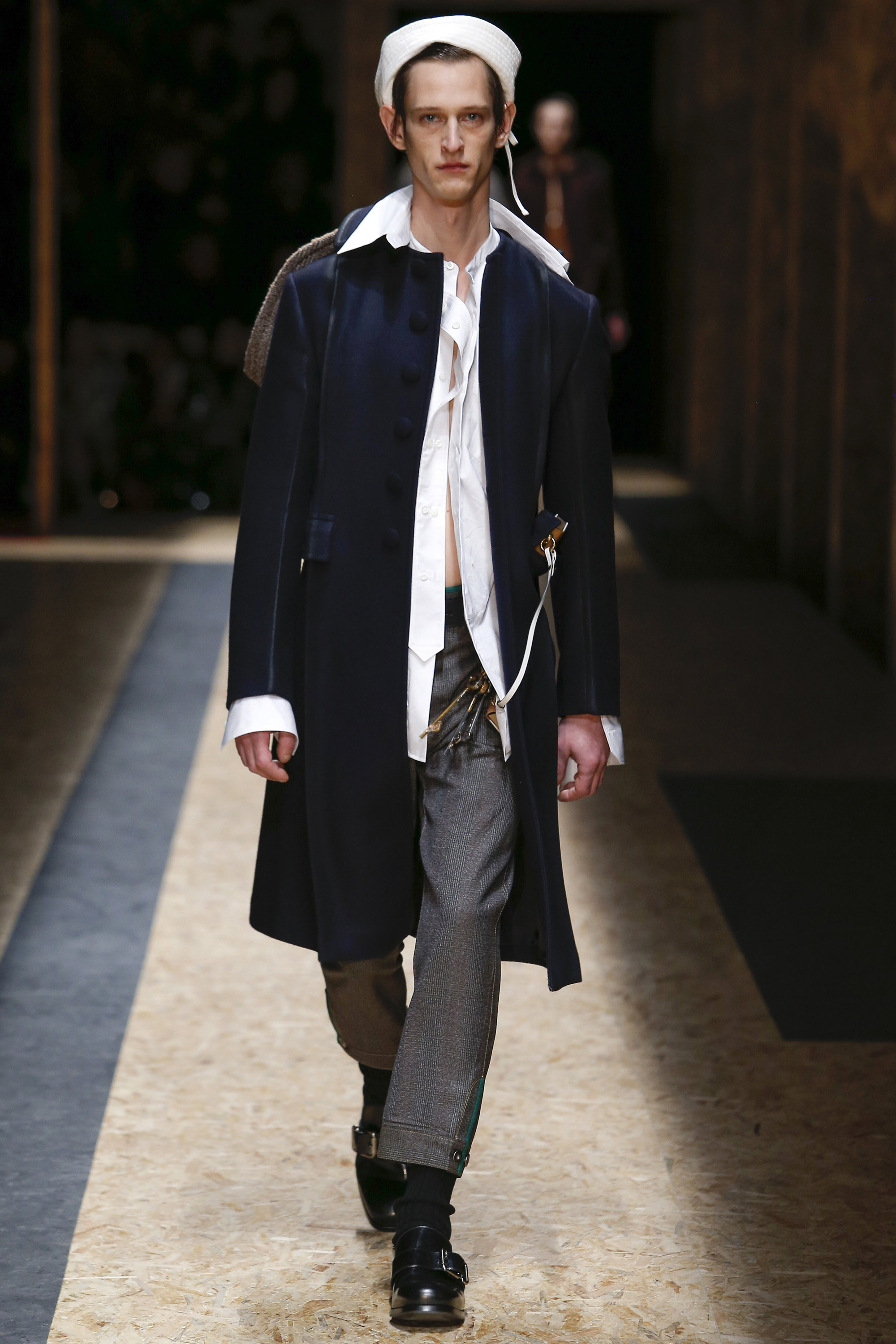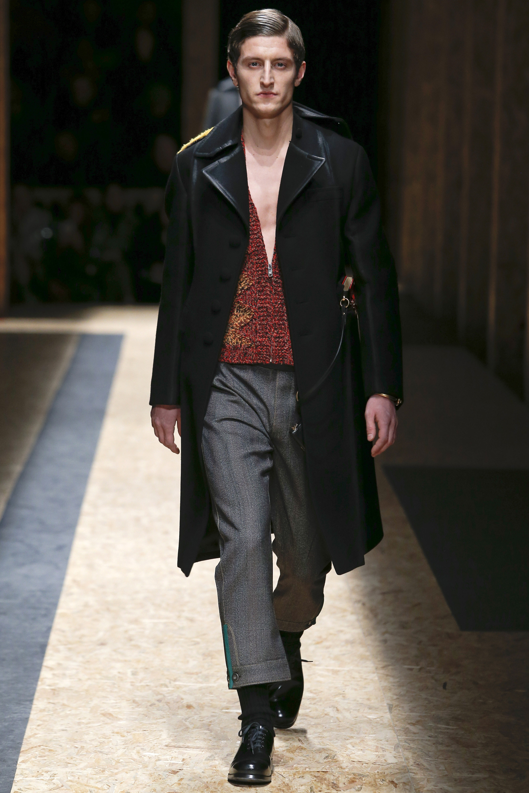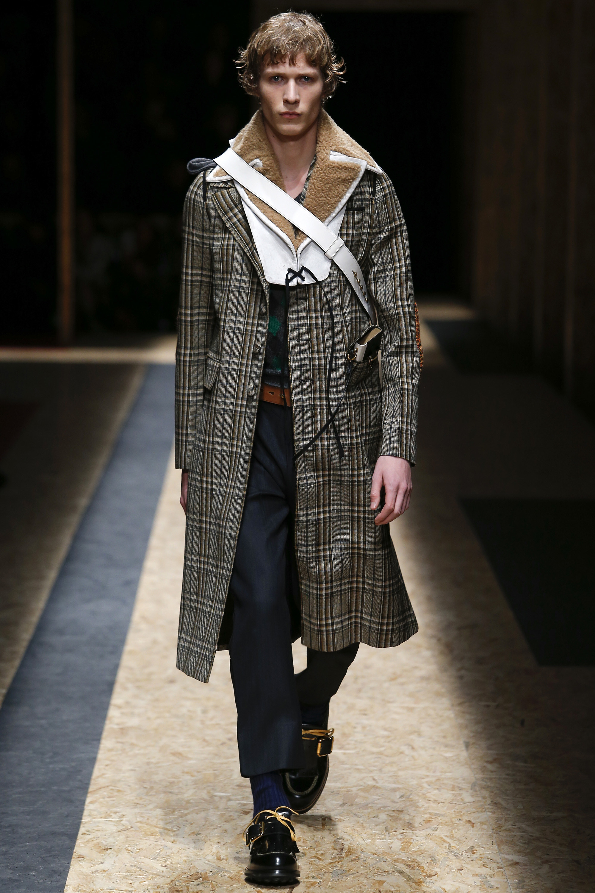 These densely layered images were echoed in the wealth of new shapes, combinations and details that filed through a multitiered set of wood particle board constructed to evoke a theater or public square. The men wore multiple variations on naval dress, from small, waist-cinched jackets to dramatic capes and handsome officer coats. The flyaway collars and hoods — in shirt fabrics, stiff leather or shearling-lined denim — look like the 2016 version of Prada’s hit fur tippets of yore.