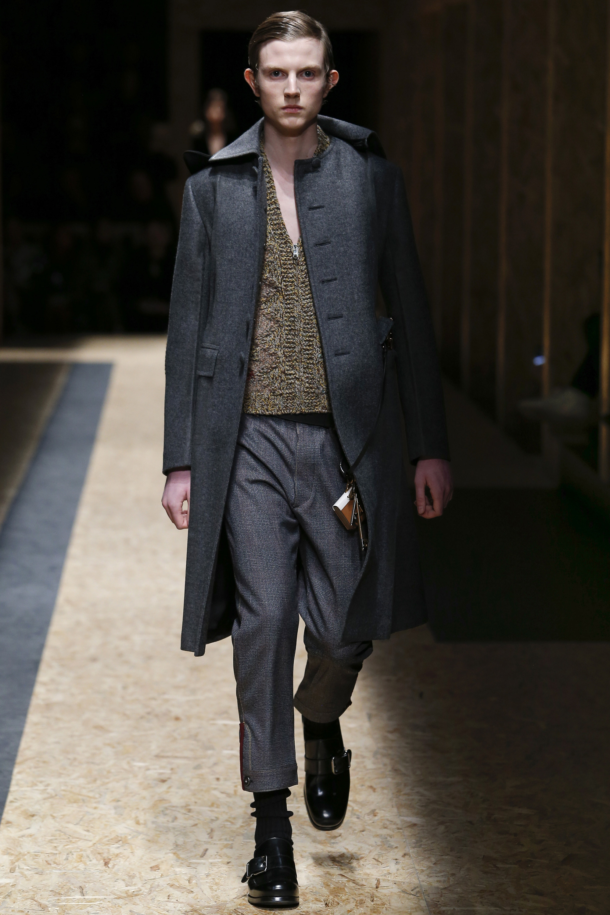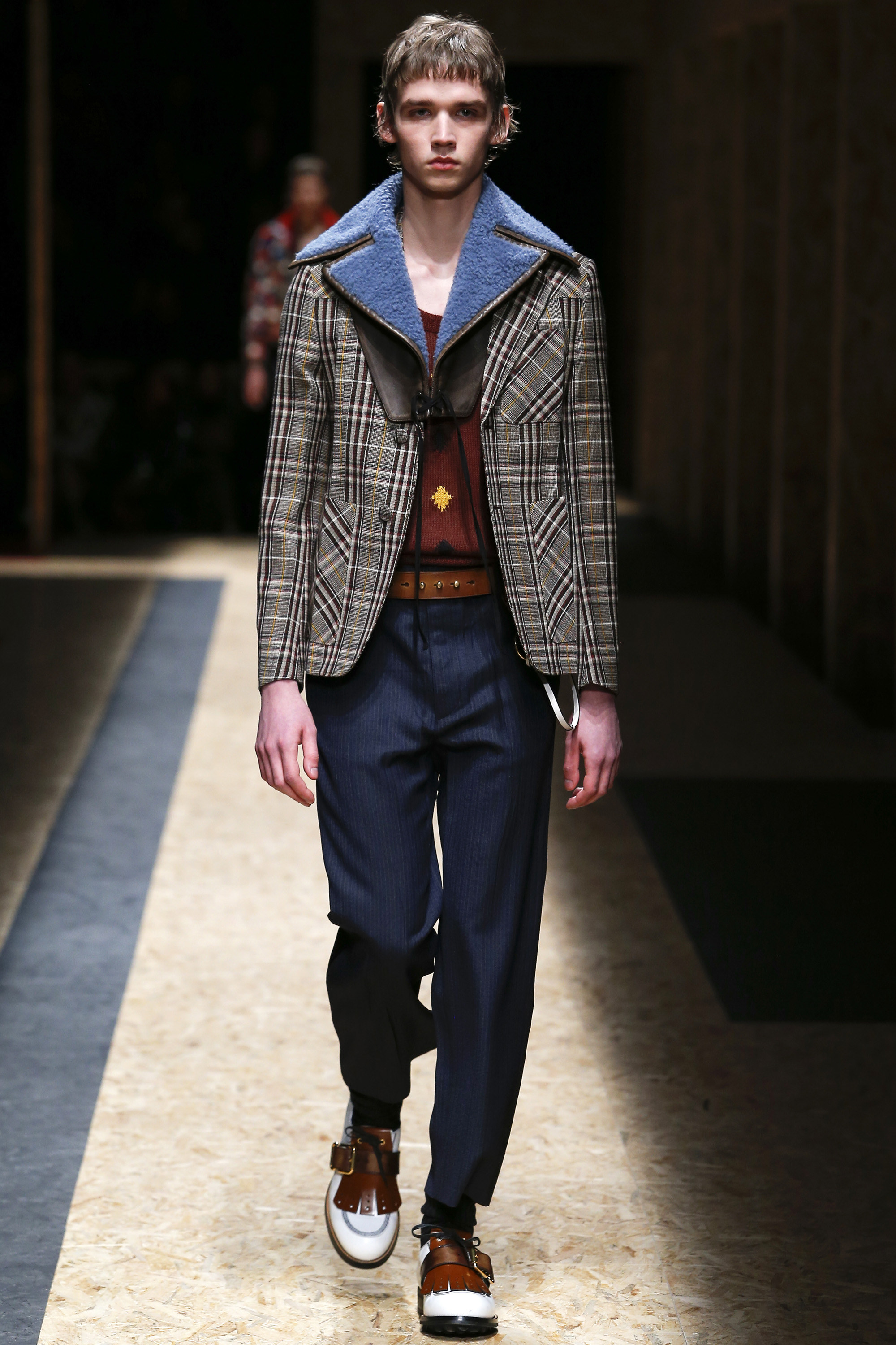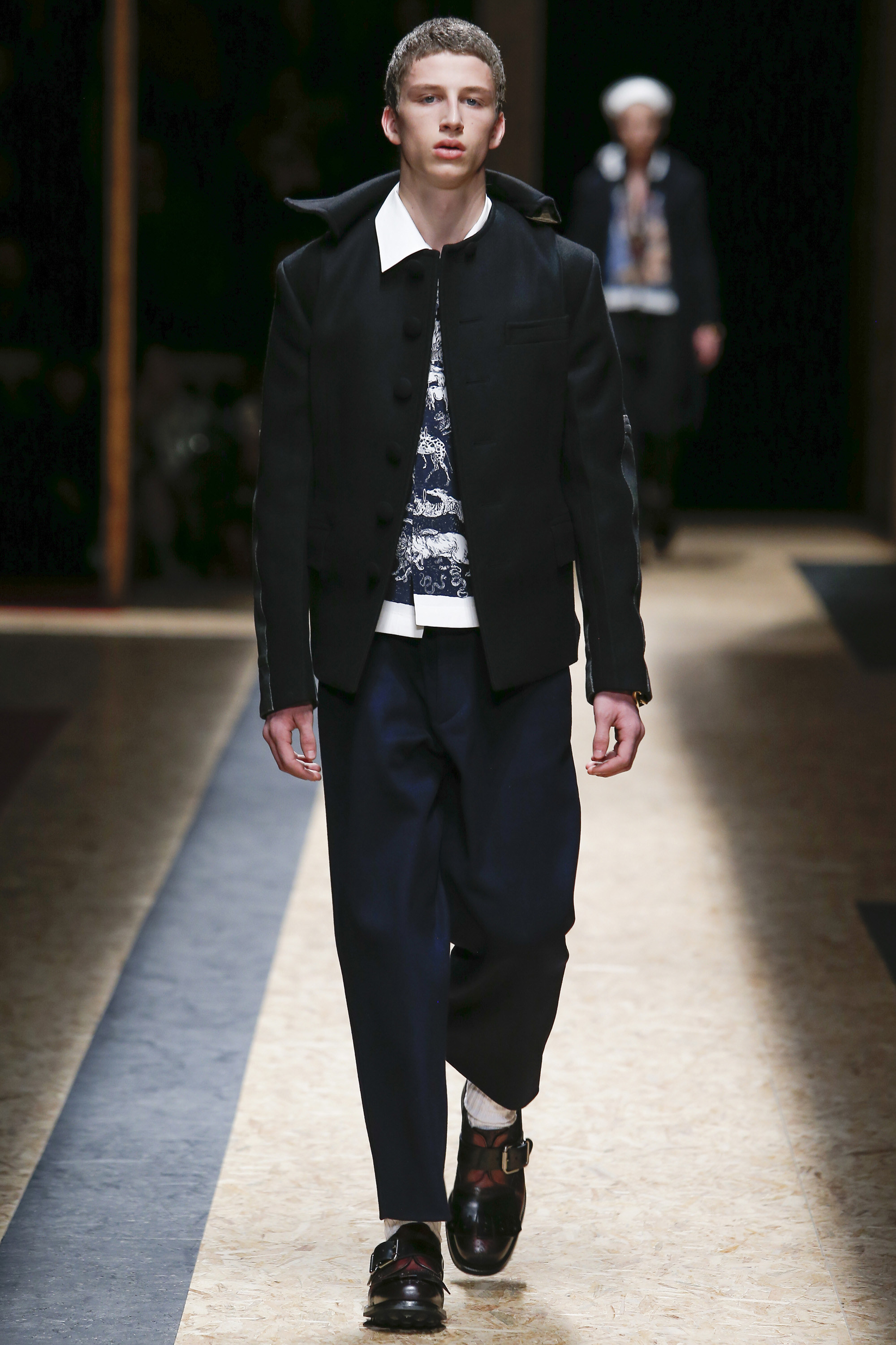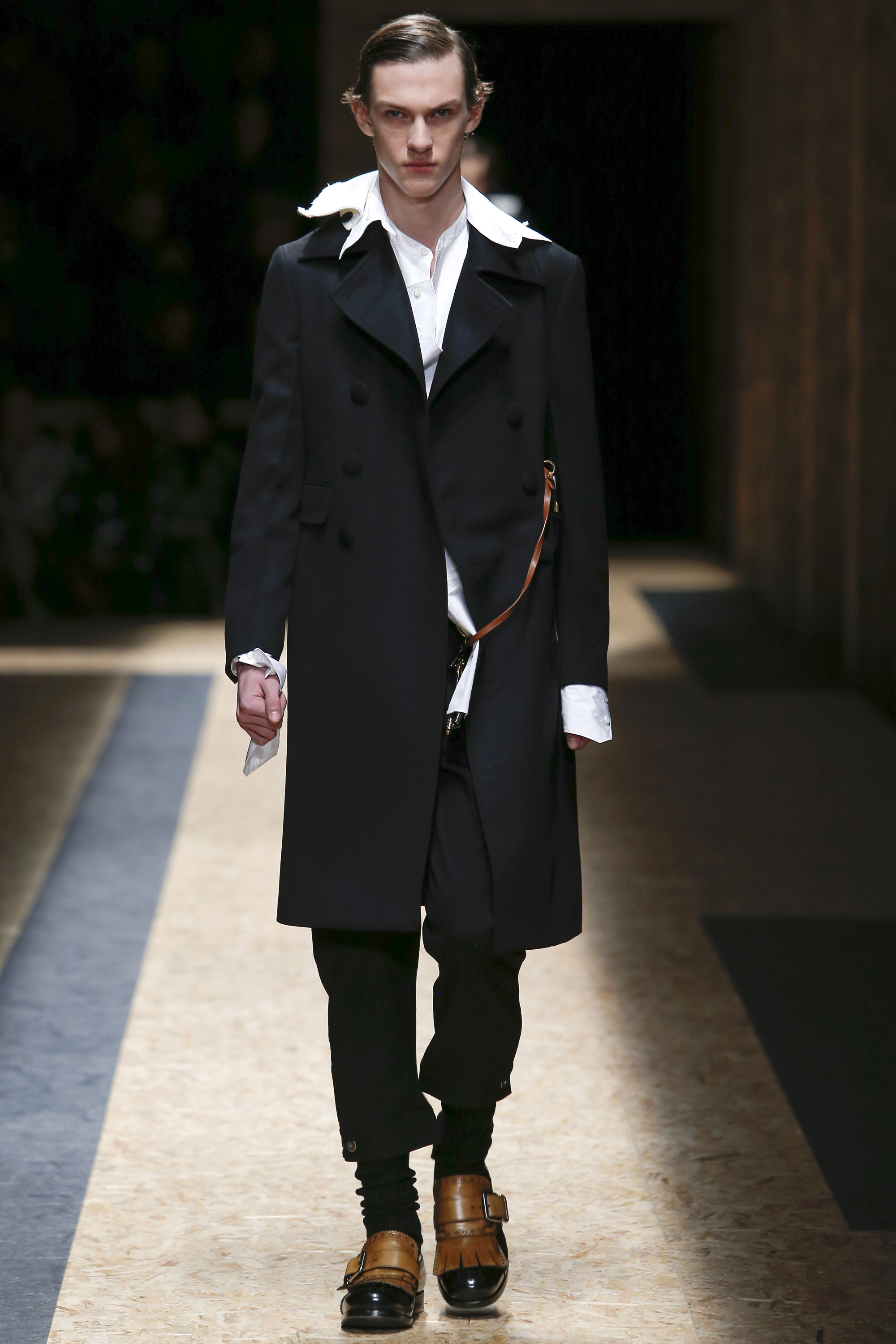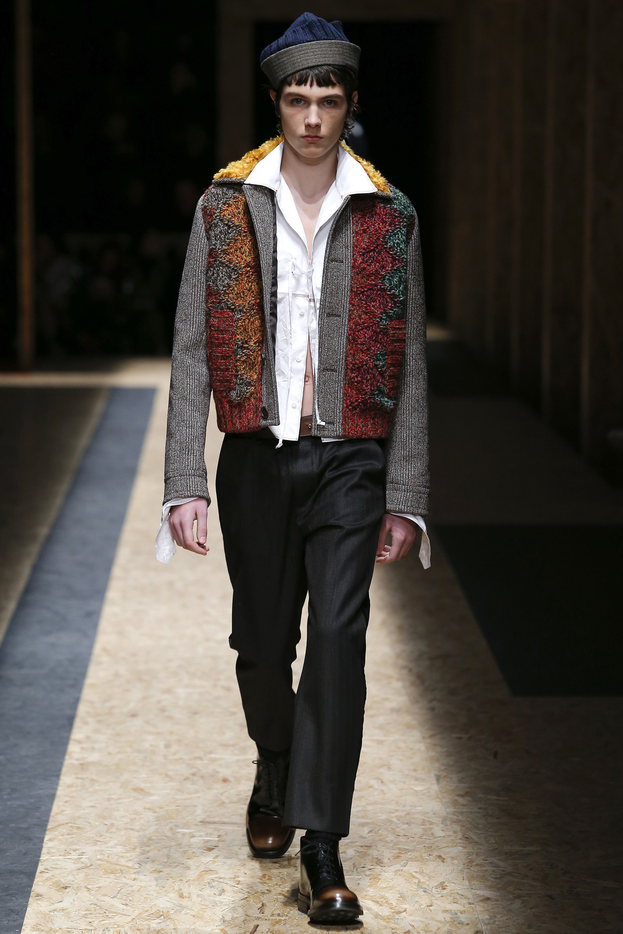 These densely layered images were echoed in the wealth of new shapes, combinations and details that filed through a multitiered set of wood particle board constructed to evoke a theater or public square. The men wore multiple variations on naval dress, from small, waist-cinched jackets to dramatic capes and handsome officer coats. The flyaway collars and hoods — in shirt fabrics, stiff leather or shearling-lined denim — look like the 2016 version of Prada’s hit fur tippets of yore.