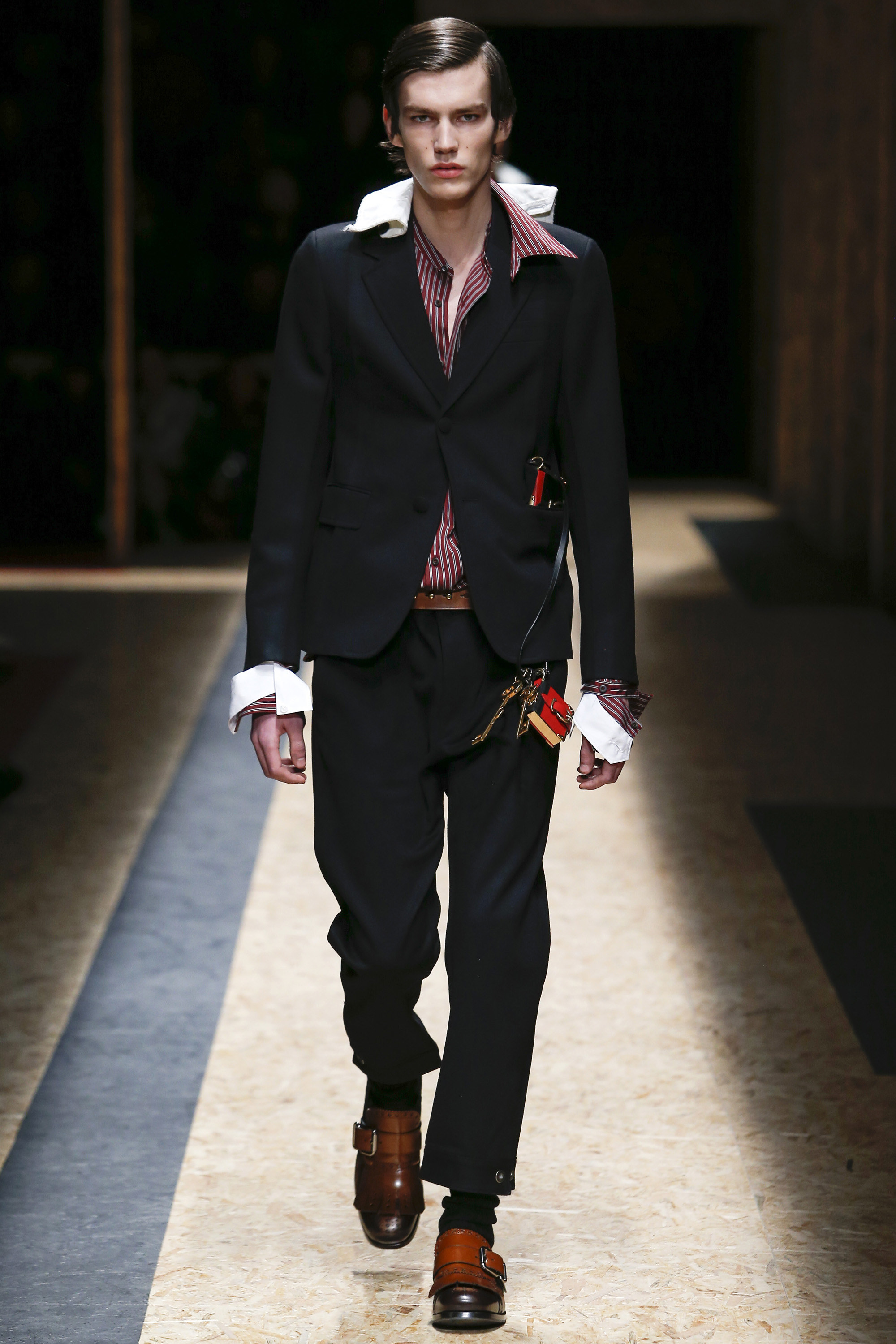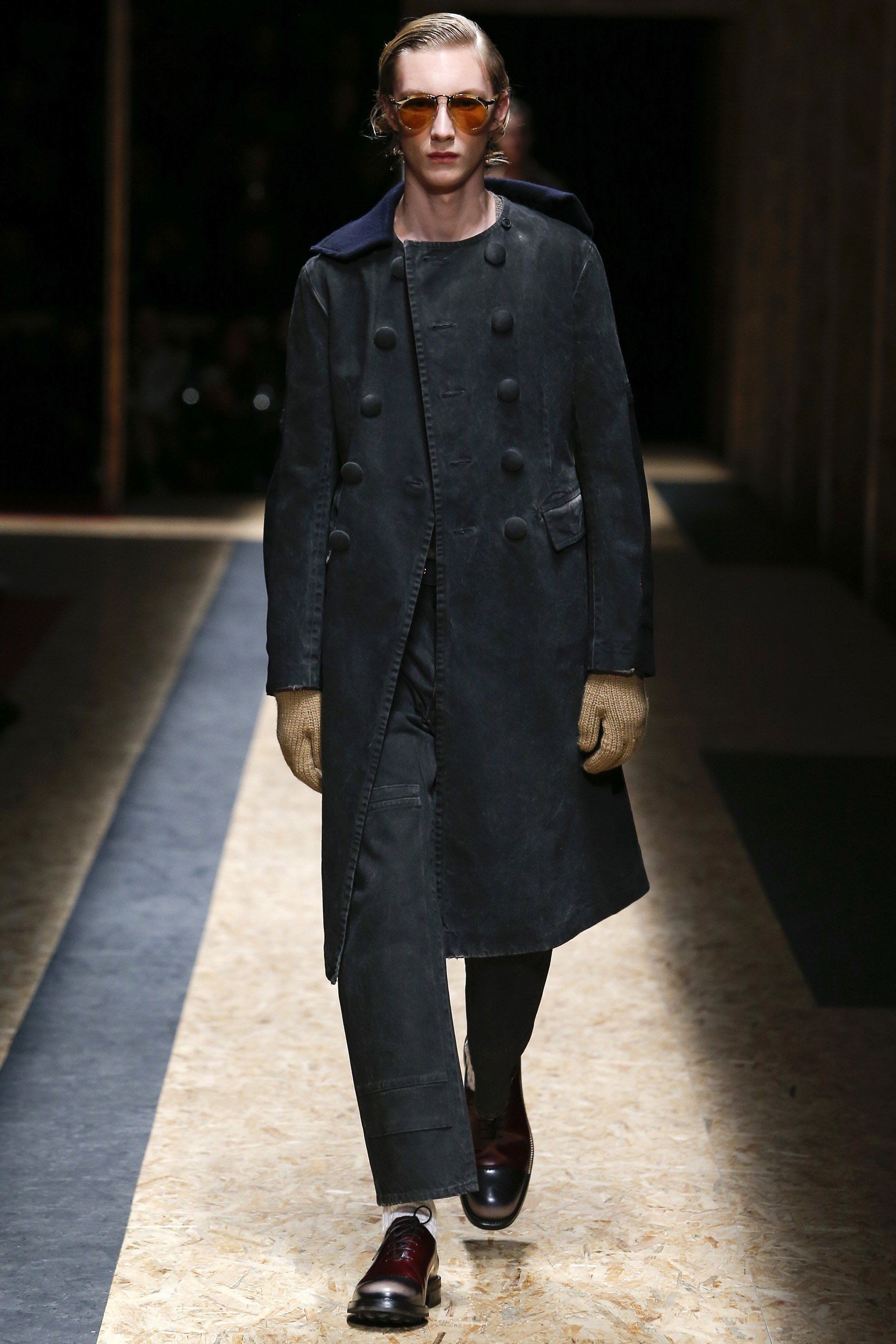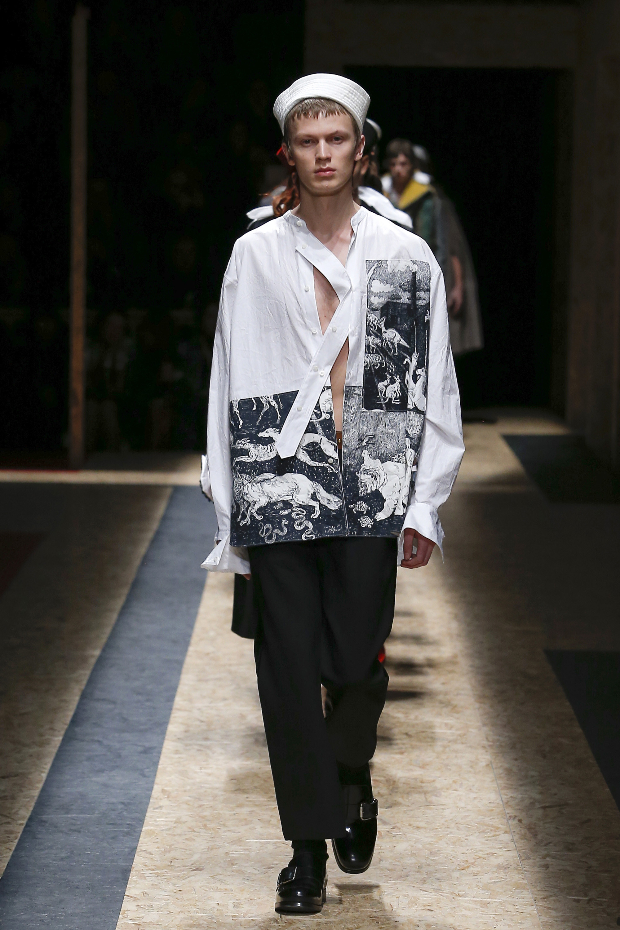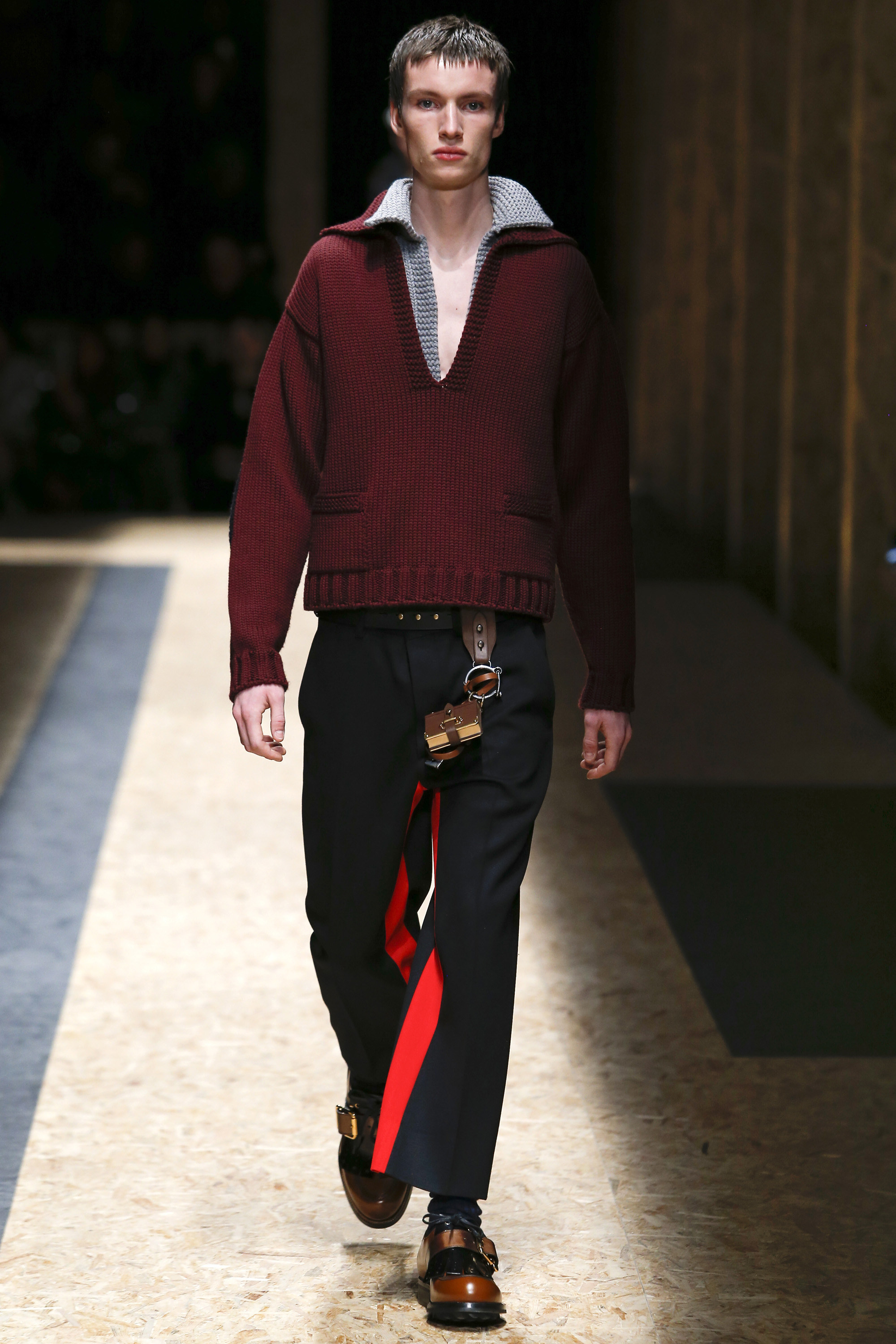 These densely layered images were echoed in the wealth of new shapes, combinations and details that filed through a multitiered set of wood particle board constructed to evoke a theater or public square. The men wore multiple variations on naval dress, from small, waist-cinched jackets to dramatic capes and handsome officer coats. The flyaway collars and hoods — in shirt fabrics, stiff leather or shearling-lined denim — look like the 2016 version of Prada’s hit fur tippets of yore.