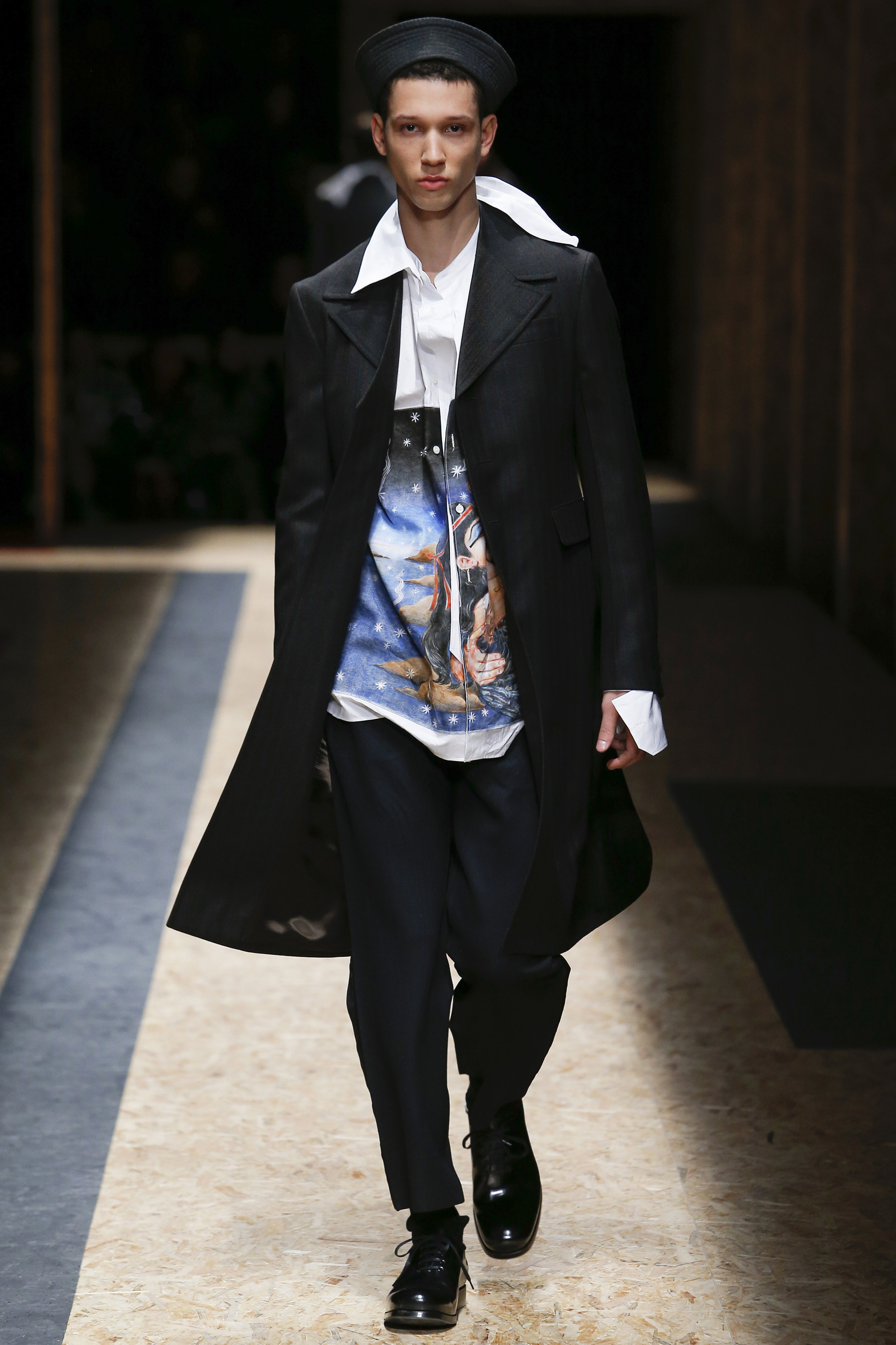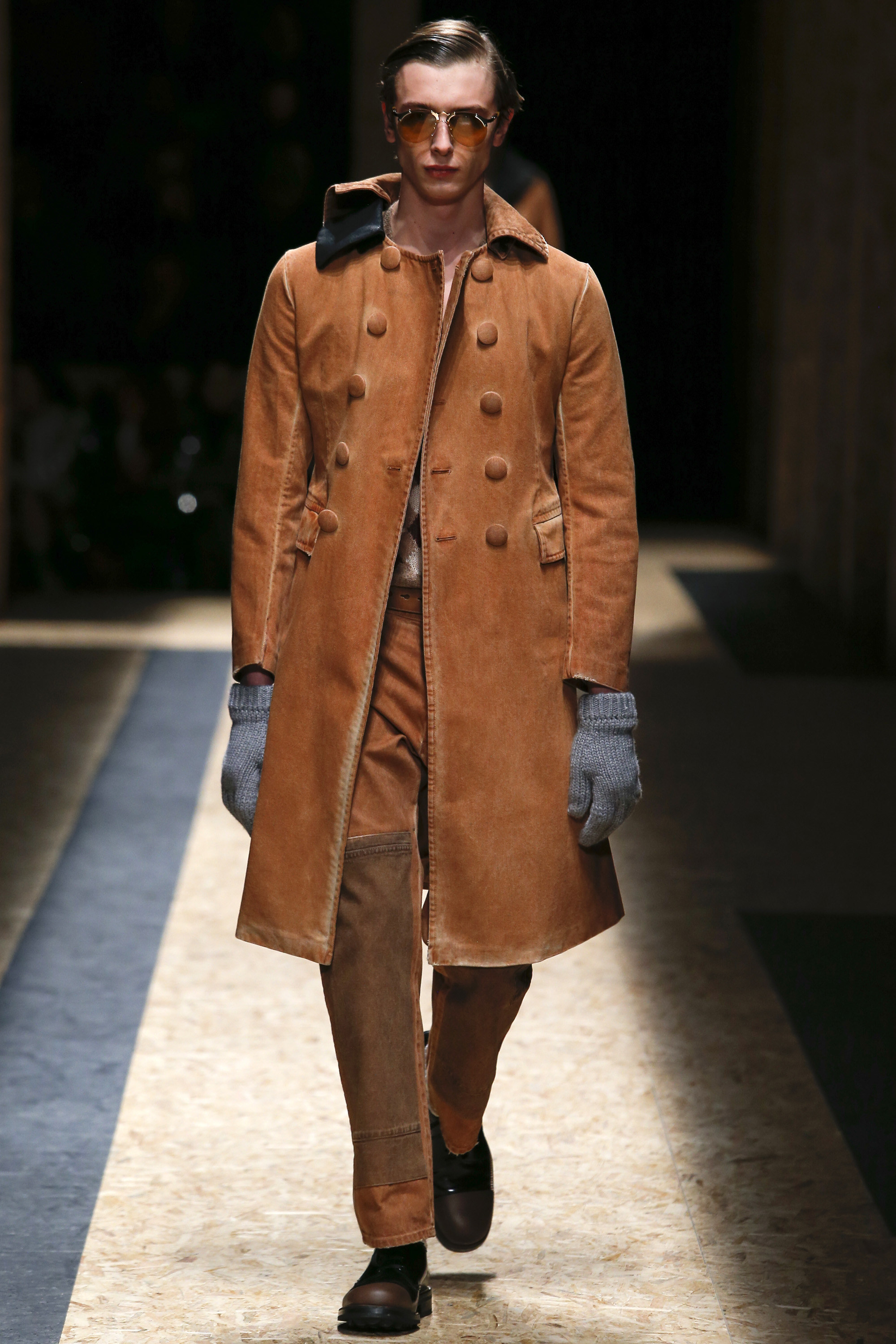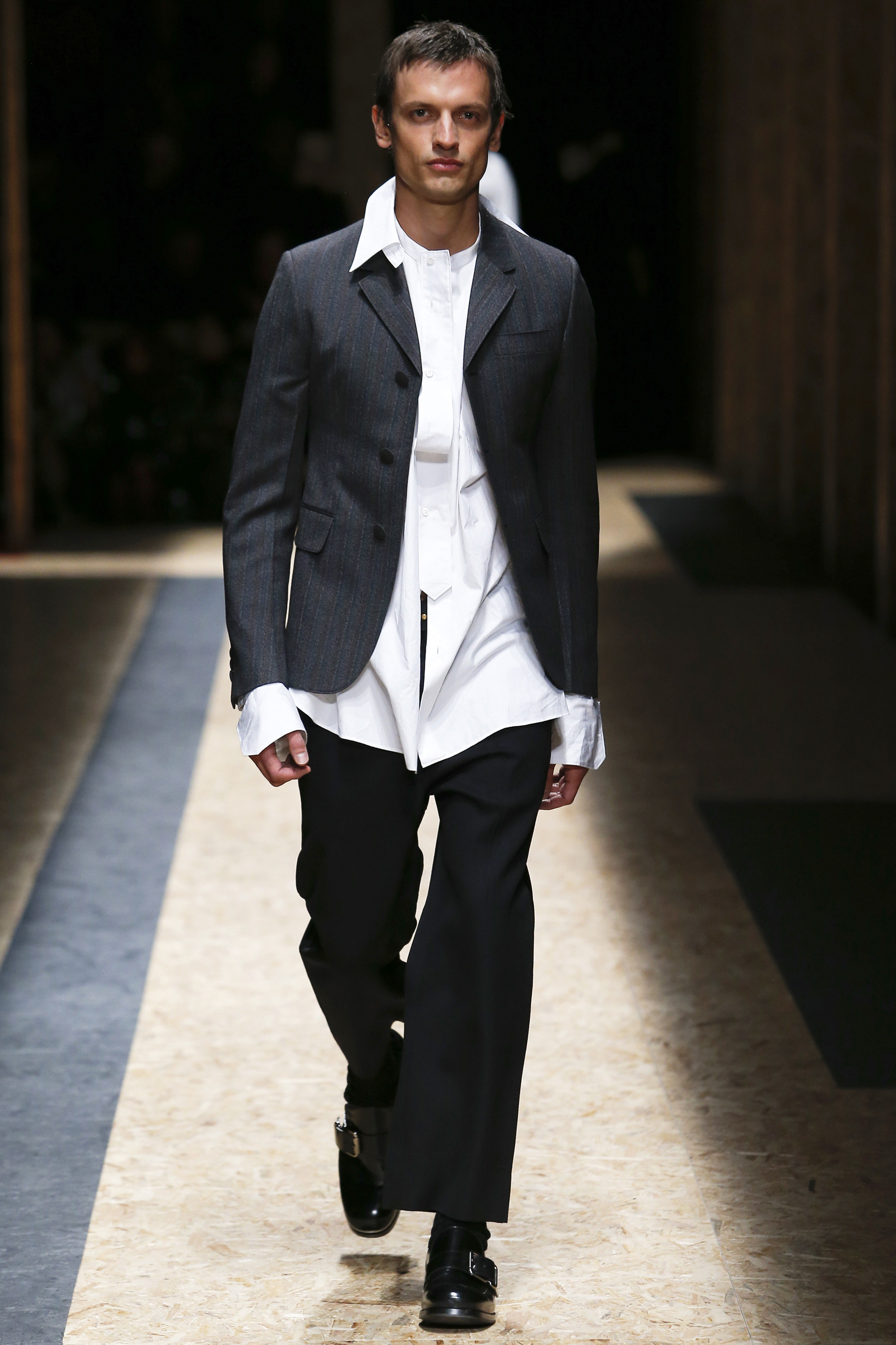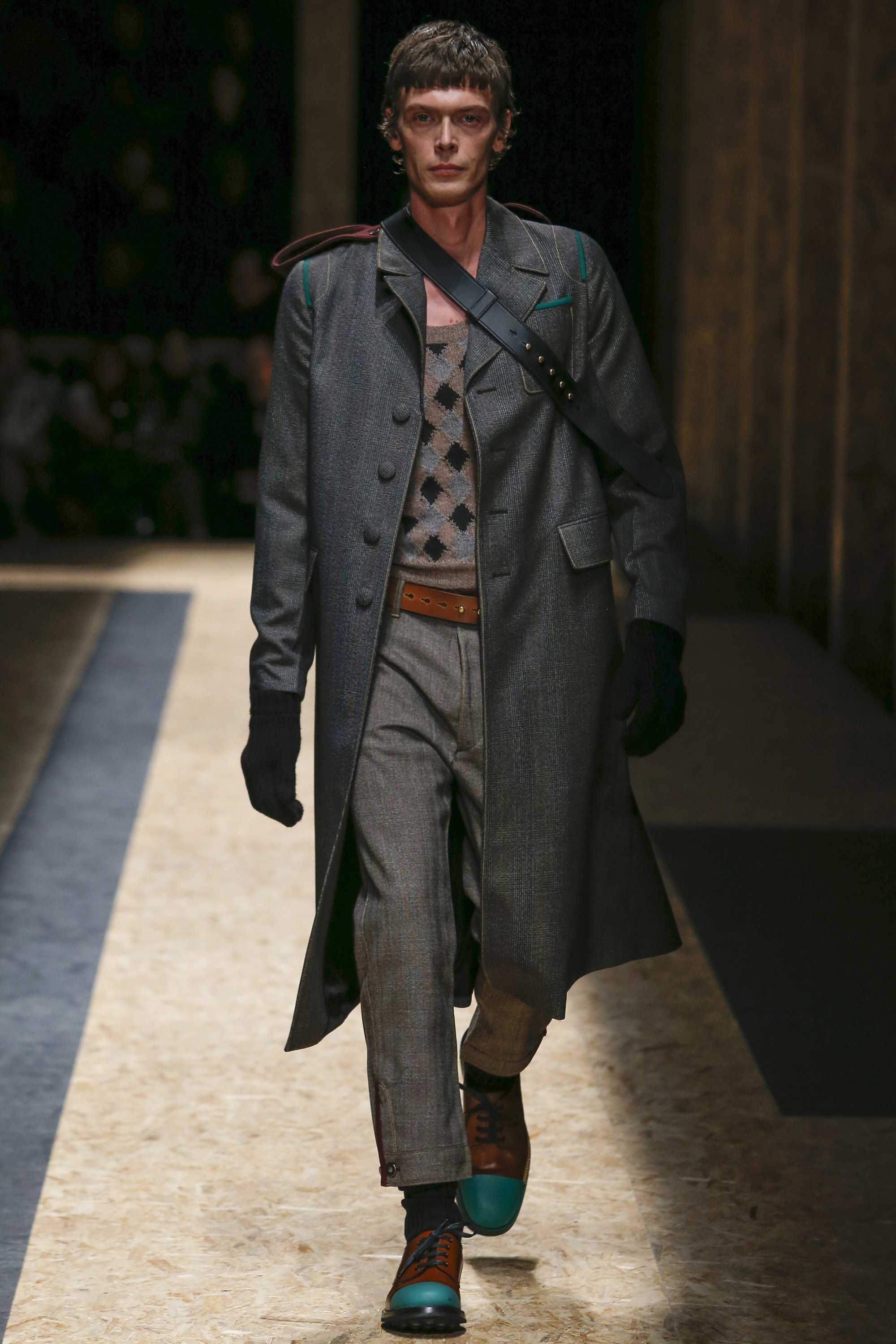 These densely layered images were echoed in the wealth of new shapes, combinations and details that filed through a multitiered set of wood particle board constructed to evoke a theater or public square. The men wore multiple variations on naval dress, from small, waist-cinched jackets to dramatic capes and handsome officer coats. The flyaway collars and hoods — in shirt fabrics, stiff leather or shearling-lined denim — look like the 2016 version of Prada’s hit fur tippets of yore.