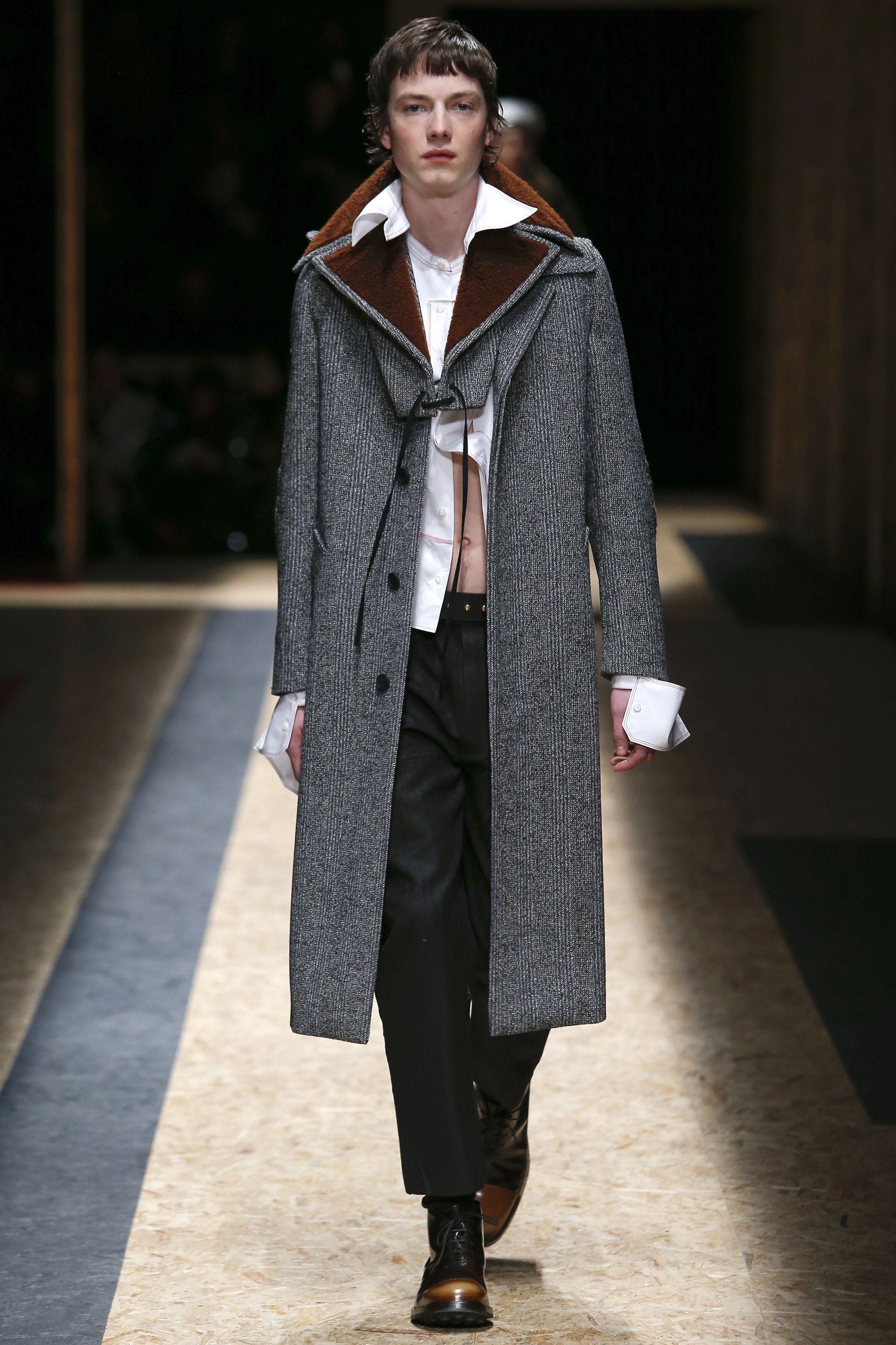 These densely layered images were echoed in the wealth of new shapes, combinations and details that filed through a multitiered set of wood particle board constructed to evoke a theater or public square. The men wore multiple variations on naval dress, from small, waist-cinched jackets to dramatic capes and handsome officer coats. The flyaway collars and hoods — in shirt fabrics, stiff leather or shearling-lined denim — look like the 2016 version of Prada’s hit fur tippets of yore.