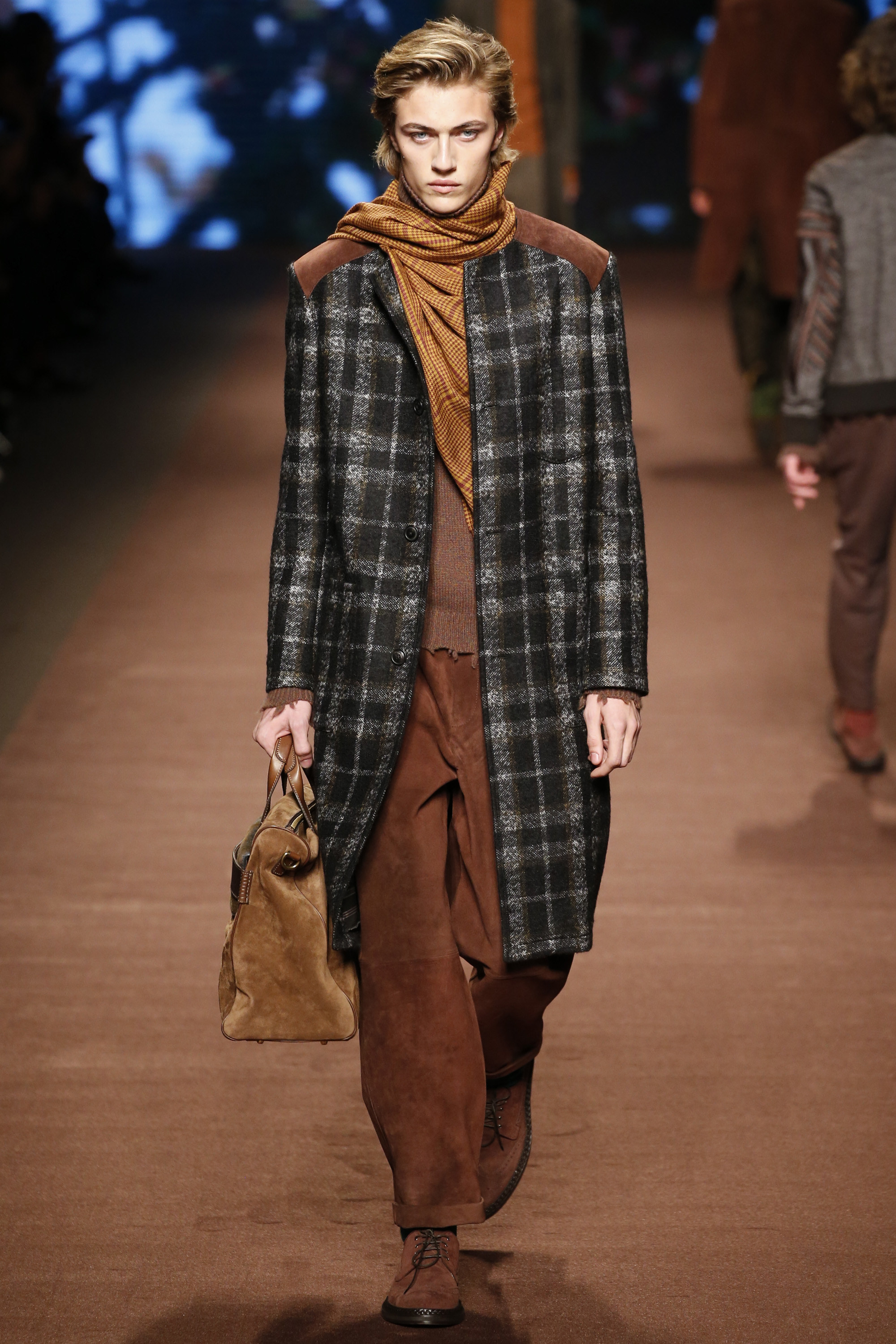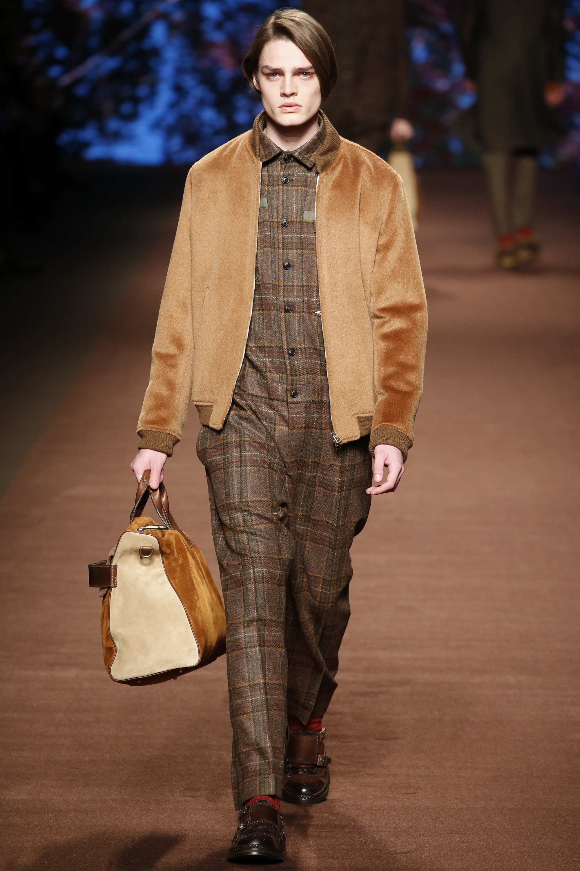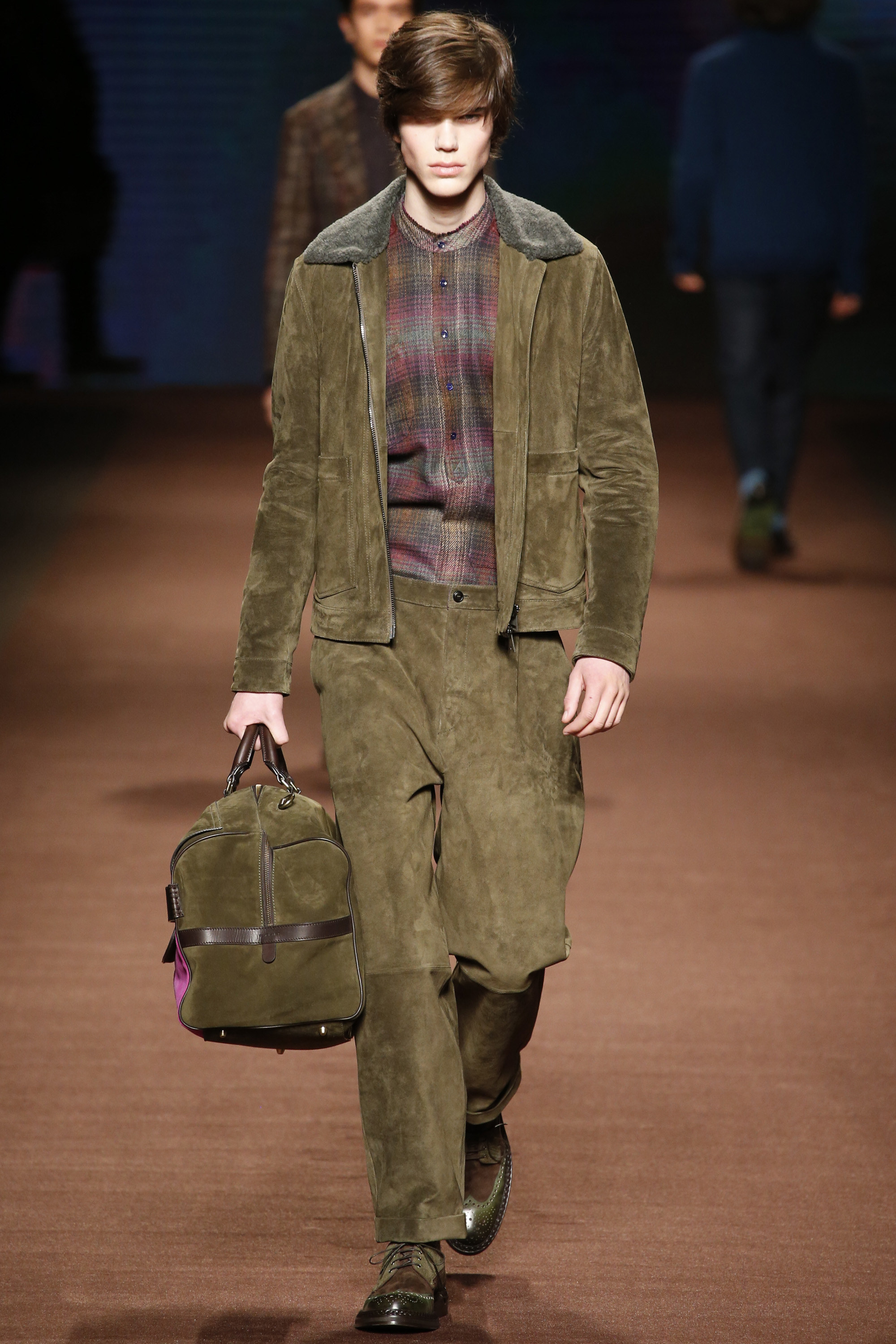 The day between these nights saw brighter moments—trousers in yellow or blue suede, some impressive woolen jacquard jackets in animal print that had a half-convincing protein fuzz—but within the meteorological system of Etro, it was wintry. These were elevated countryman’s clothes. Cheviot wools and brown-spectrum checks came patched with suede for the appearance of functionality. There were six overalls, some suede and some tweed. The shoes were brogues with panels of velvet or suede for upper interest welted to marginally elevated crepe soles. One check suit was overprinted with the shadow pattern of leaves, and Kean Etro’s 15-year-old son Gerolamo made his catwalk debut in a shrunken wool tailcoat. There was some paisley—there had to be—but this was as softly spoken as Etro gets. Why so quiet, Kean? “It’s just a feeling. Everything is more subdued. So you can listen to the wind and the whispers in nature.”