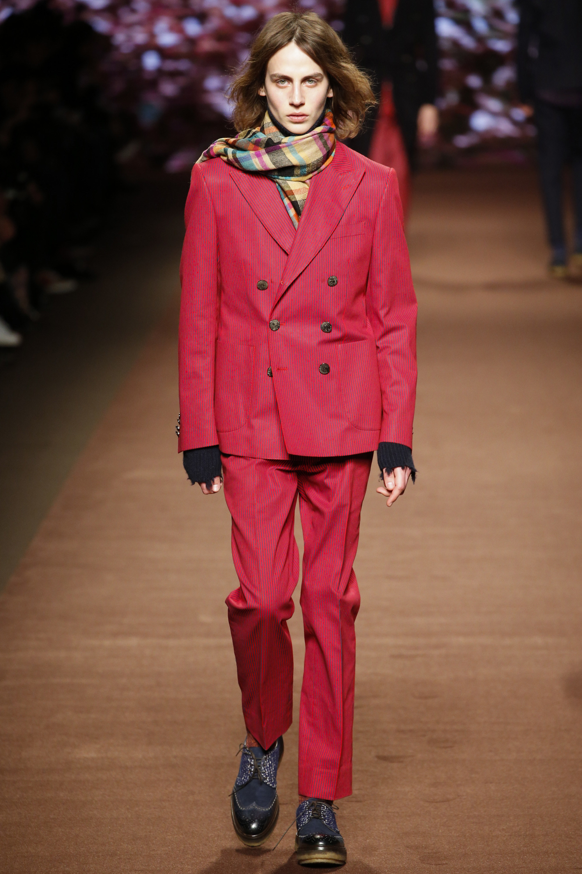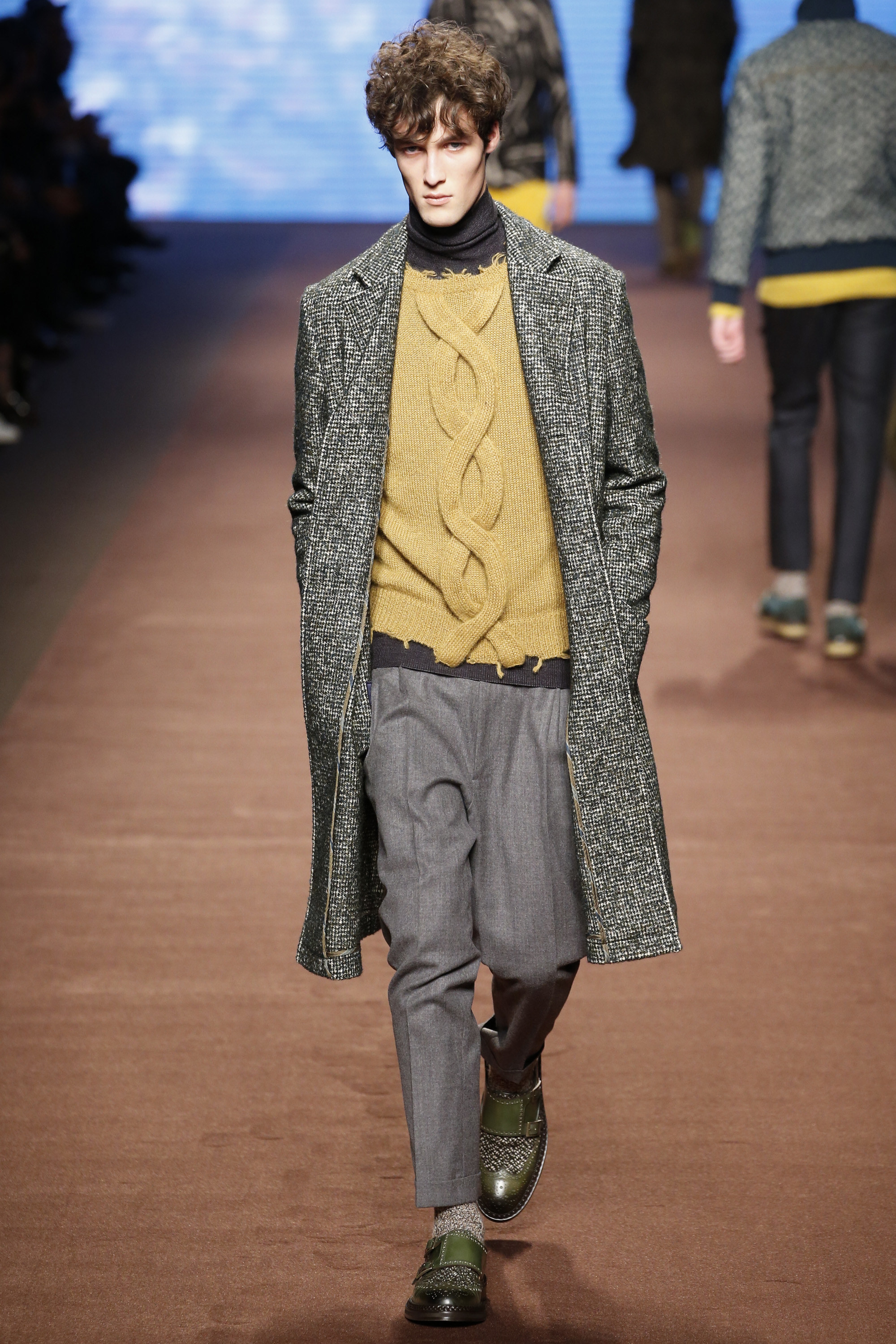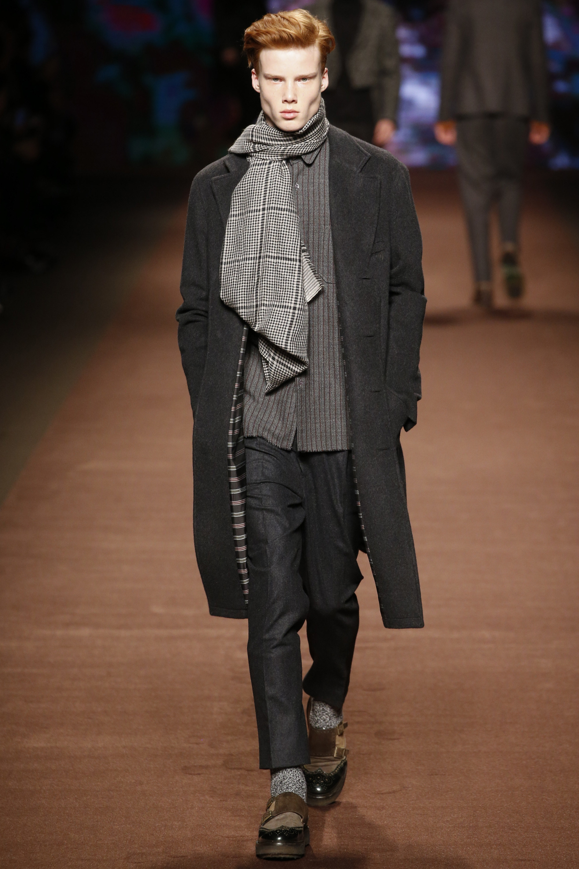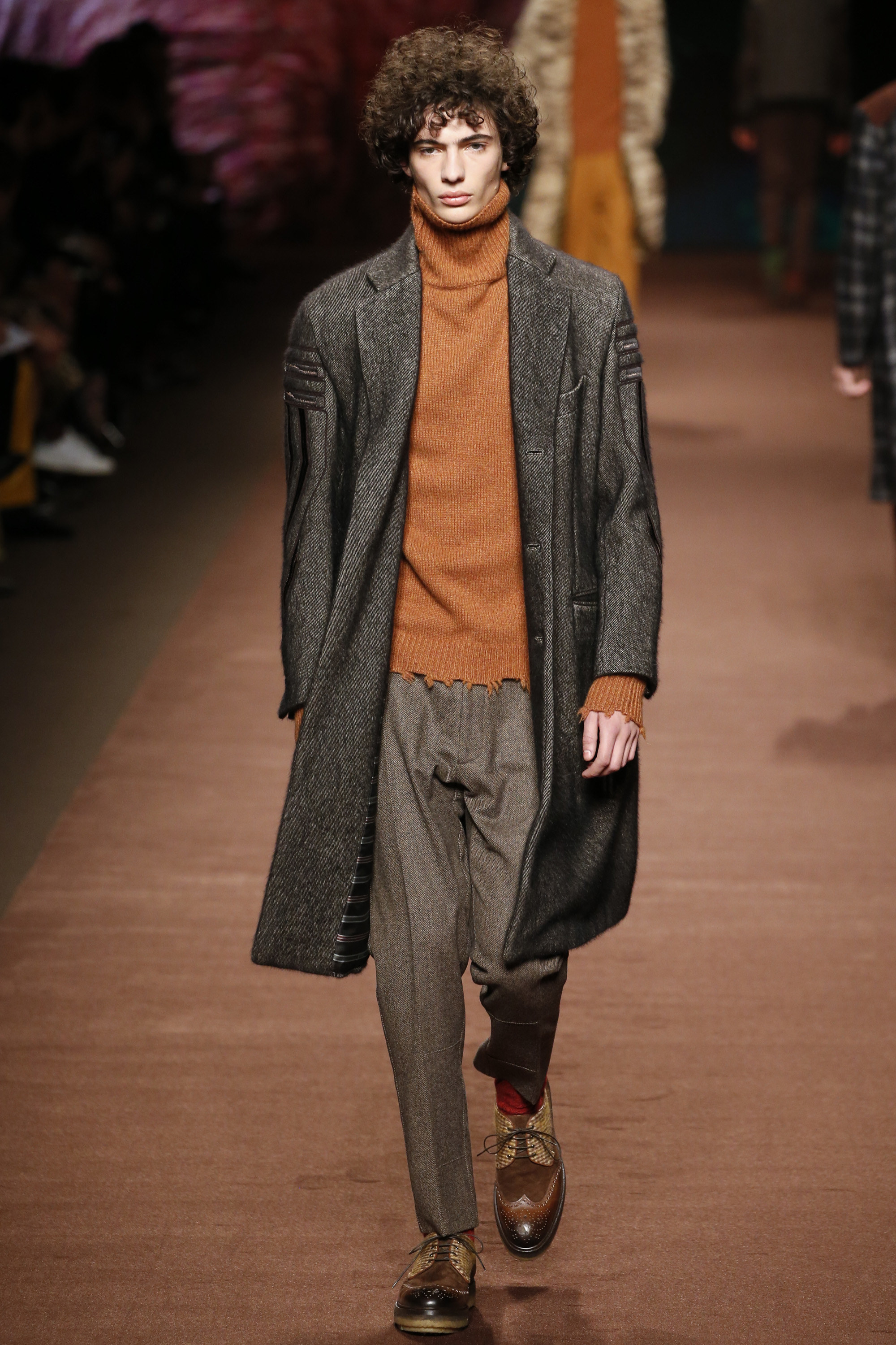 The day between these nights saw brighter moments—trousers in yellow or blue suede, some impressive woolen jacquard jackets in animal print that had a half-convincing protein fuzz—but within the meteorological system of Etro, it was wintry. These were elevated countryman’s clothes. Cheviot wools and brown-spectrum checks came patched with suede for the appearance of functionality. There were six overalls, some suede and some tweed. The shoes were brogues with panels of velvet or suede for upper interest welted to marginally elevated crepe soles. One check suit was overprinted with the shadow pattern of leaves, and Kean Etro’s 15-year-old son Gerolamo made his catwalk debut in a shrunken wool tailcoat. There was some paisley—there had to be—but this was as softly spoken as Etro gets. Why so quiet, Kean? “It’s just a feeling. Everything is more subdued. So you can listen to the wind and the whispers in nature.”