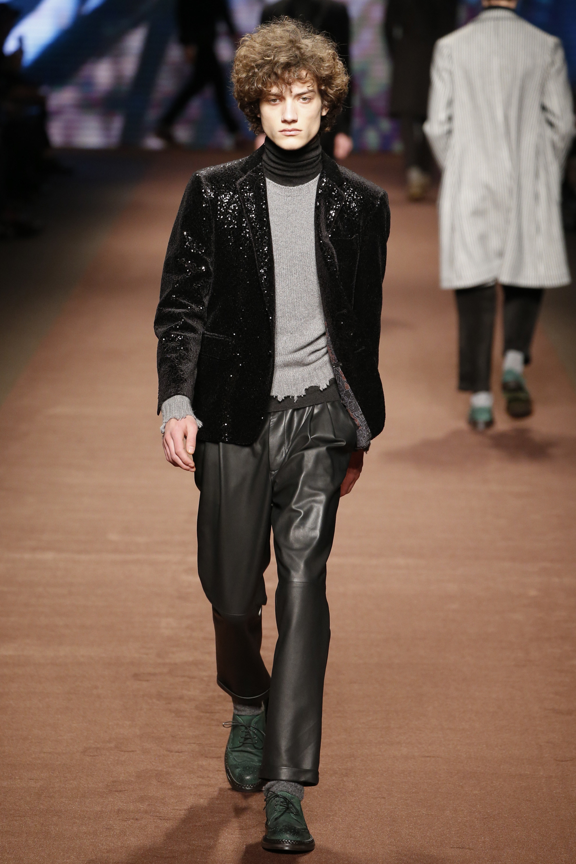 The day between these nights saw brighter moments—trousers in yellow or blue suede, some impressive woolen jacquard jackets in animal print that had a half-convincing protein fuzz—but within the meteorological system of Etro, it was wintry. These were elevated countryman’s clothes. Cheviot wools and brown-spectrum checks came patched with suede for the appearance of functionality. There were six overalls, some suede and some tweed. The shoes were brogues with panels of velvet or suede for upper interest welted to marginally elevated crepe soles. One check suit was overprinted with the shadow pattern of leaves, and Kean Etro’s 15-year-old son Gerolamo made his catwalk debut in a shrunken wool tailcoat. There was some paisley—there had to be—but this was as softly spoken as Etro gets. Why so quiet, Kean? “It’s just a feeling. Everything is more subdued. So you can listen to the wind and the whispers in nature.”