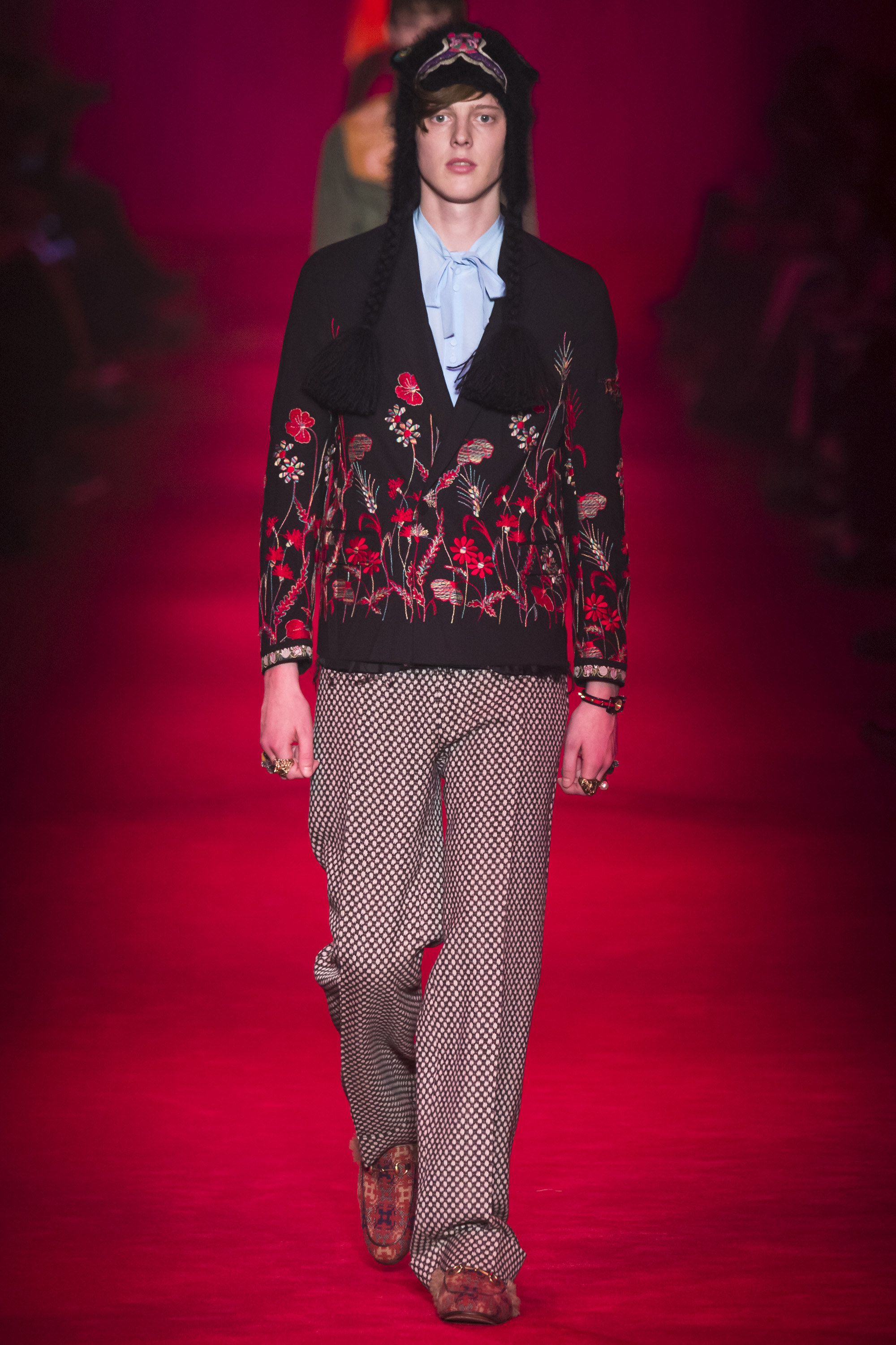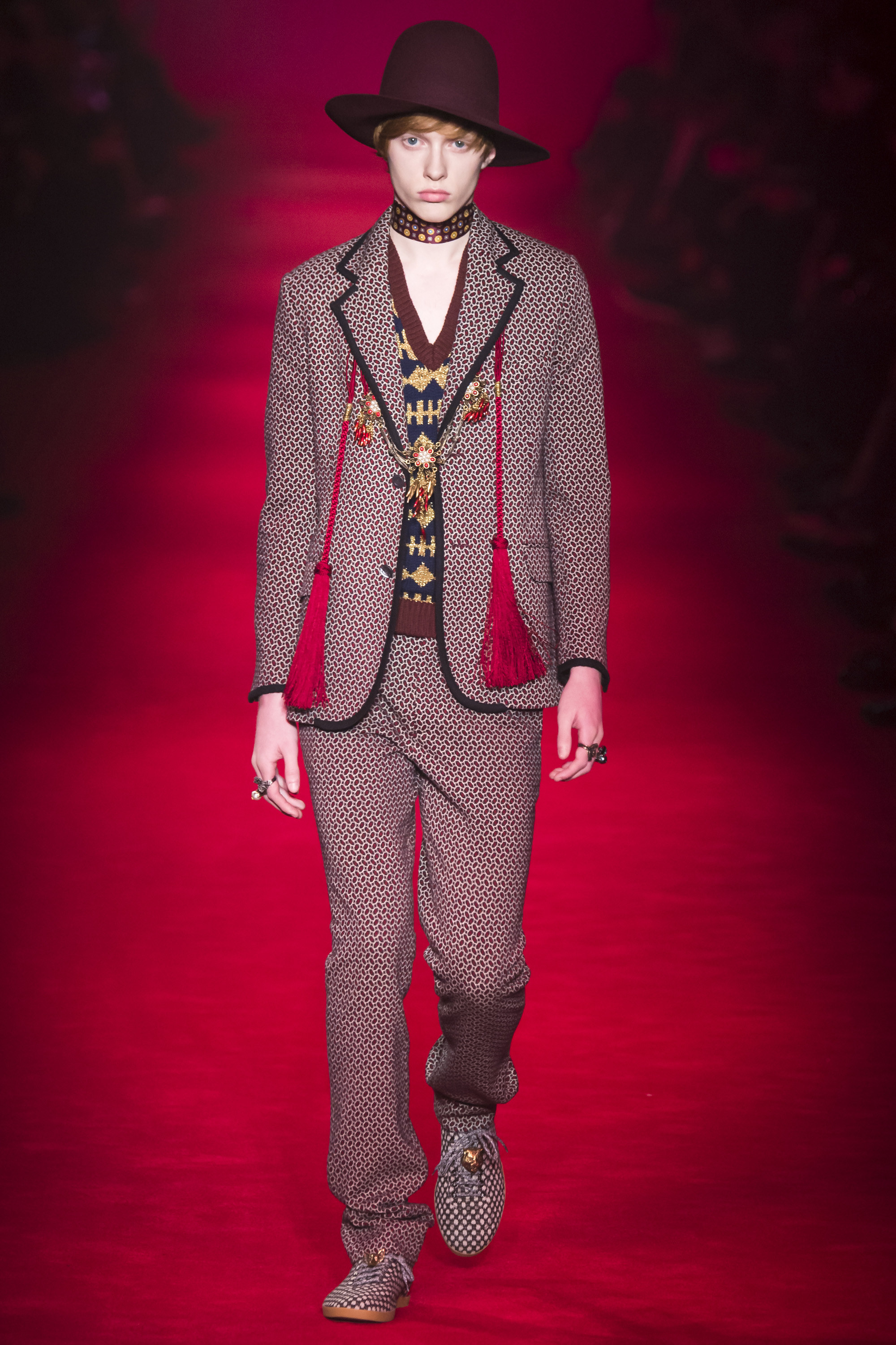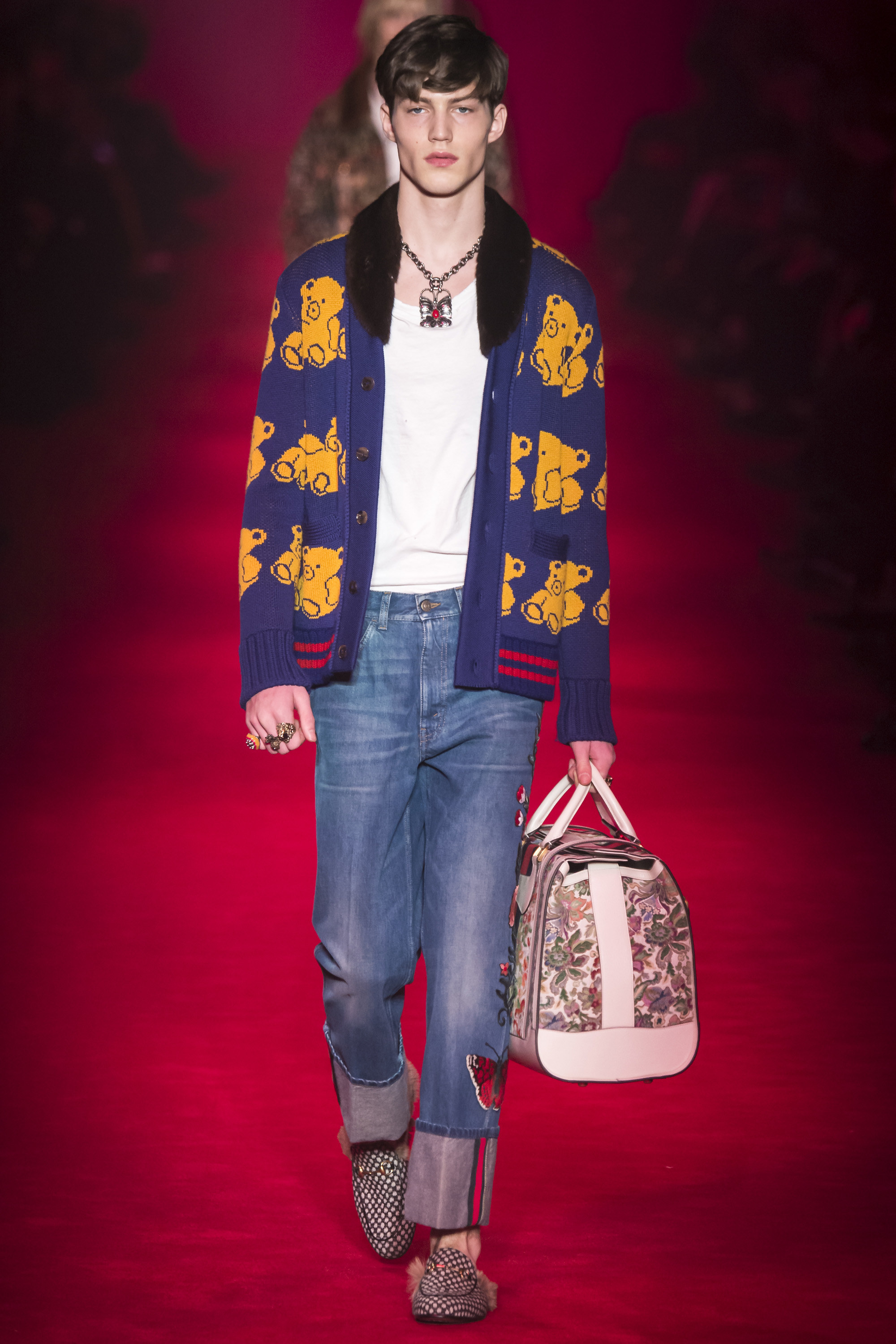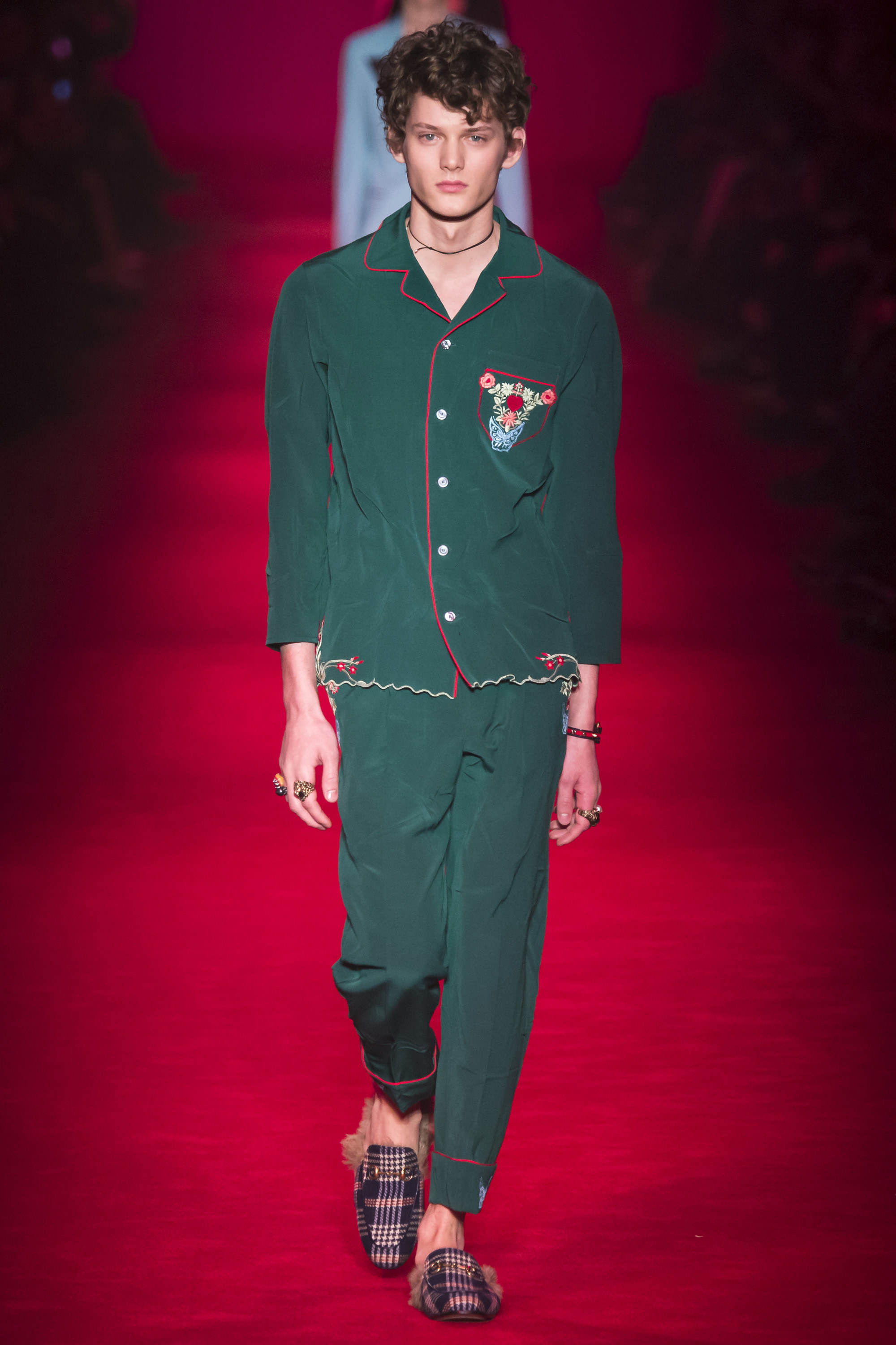What the Fall 2016 men’s Gucci collection did was retread ground Michele’s been covering for the past year. It evolved it, a little, but it was about reaffirming the new creative direction of the house. Which, if we’re honest, isn’t that new. It’s just a new edit of an existing script. It’s new in the sense that fashion frequently is—reviving a moment that contrasts with that which immediately preceded it. Baudrillard once cited it as a dynamism of amalgamation and recycling. He hasn’t been quoted by Gucci, yet.