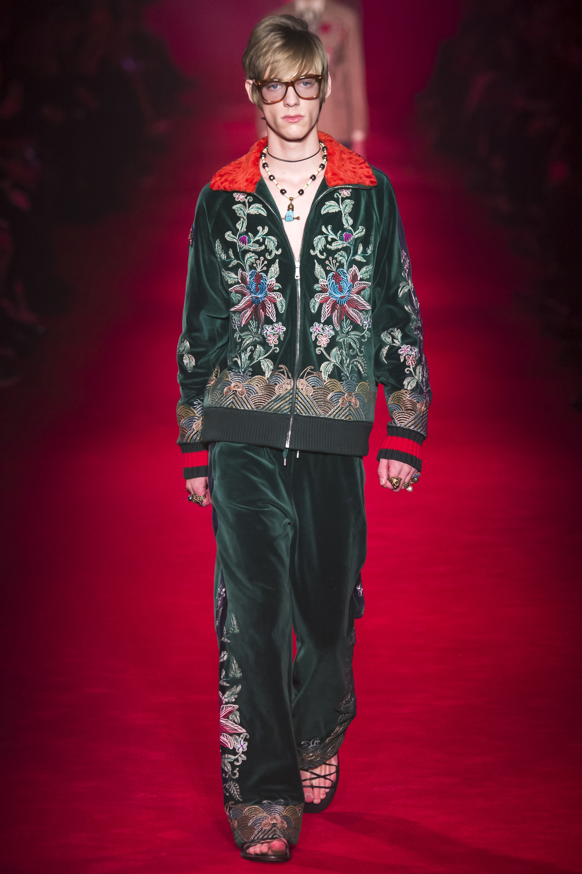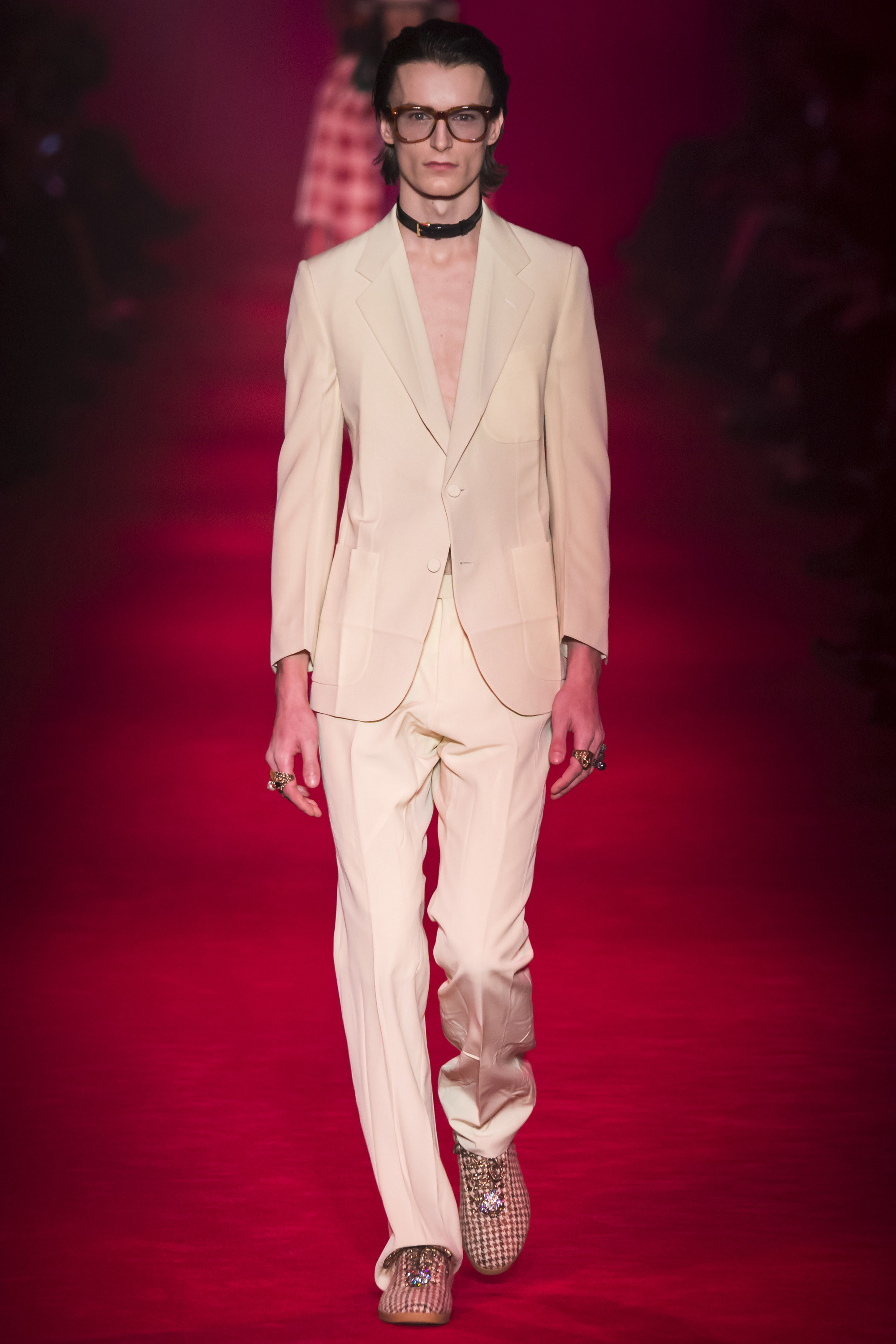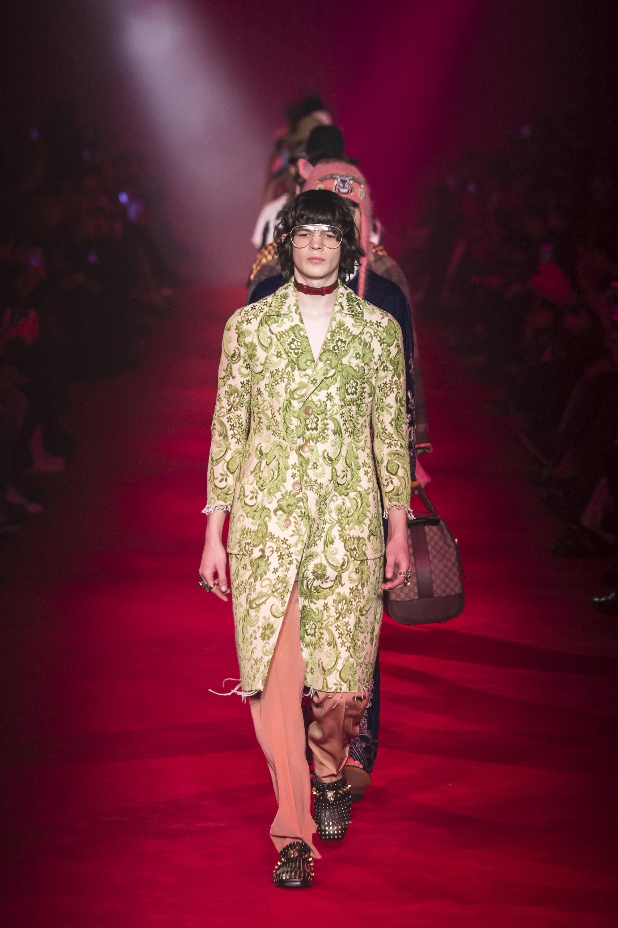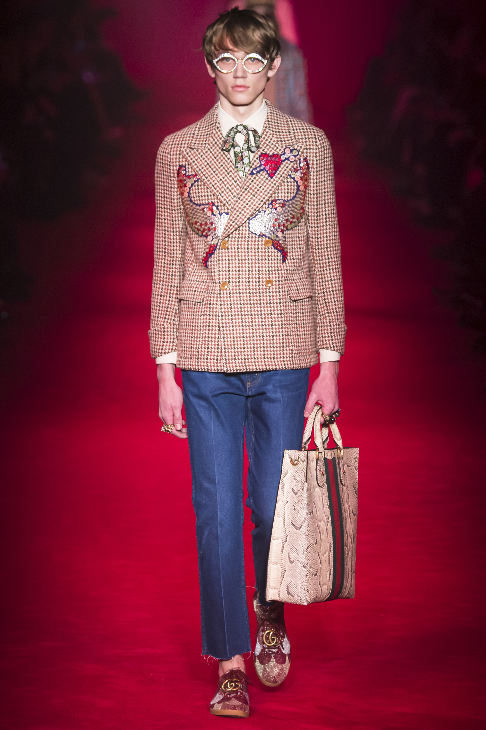 They are, of course, only one fragment of these complex, complicated Gucci collections—shown alongside Lurex knits, snakeskin suits, heels embedded with pearls, and sunglasses encrusted with crystal. An overload of decoration that sends you scribbling to record it all. No one will wear it—at least, not in that overwhelming entirety. But everyone can engage and relate with it. These collections are designed to be pulled apart by consumers, fashion shows as an engaging proposition of pieces rather than dictatorial, identikit aesthetic. There’s nothing wrong with the latter, of course. But then, there’s also nothing wrong with Gucci’s approach. It’s simply different. A different philosophy, a new way of looking at things.
