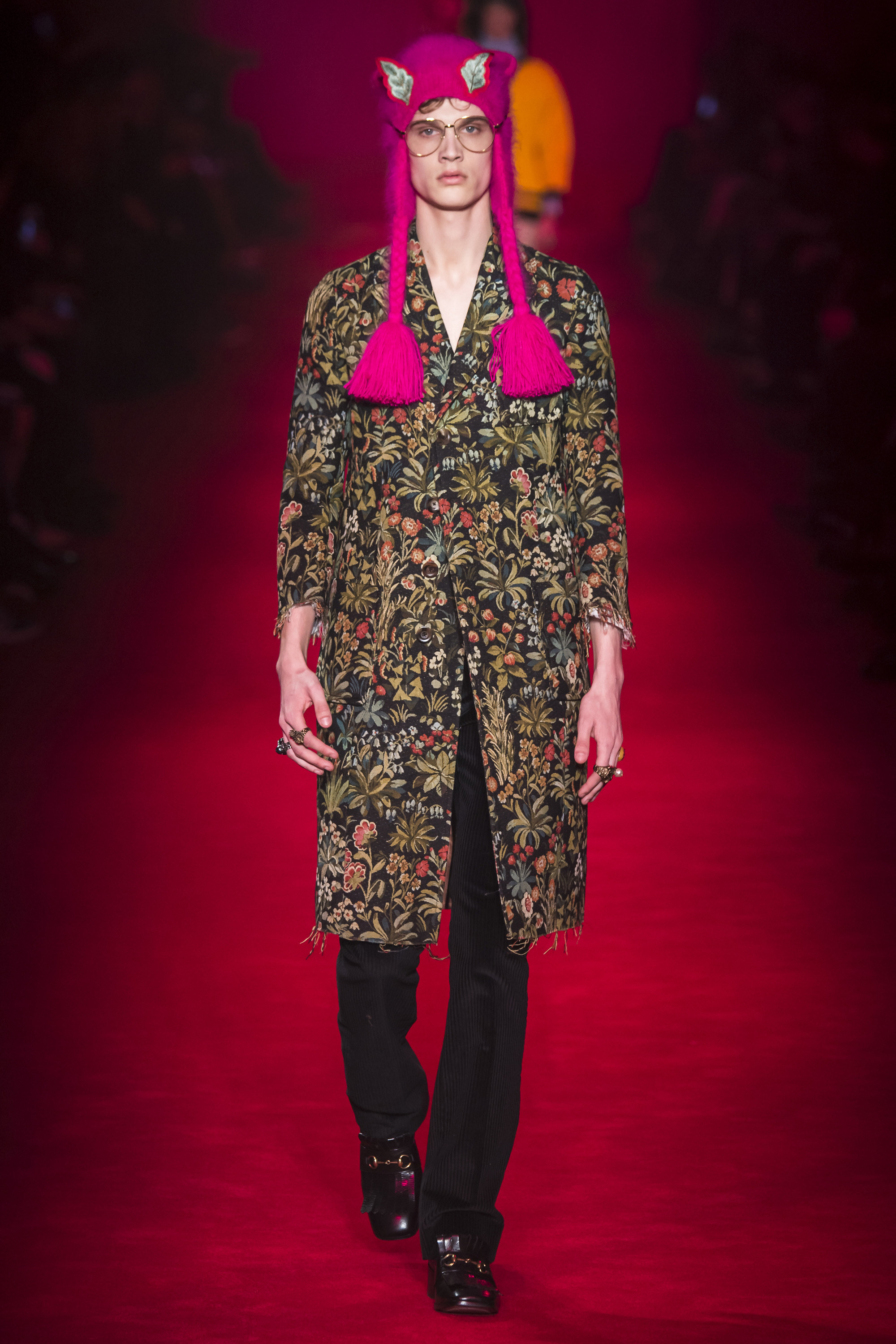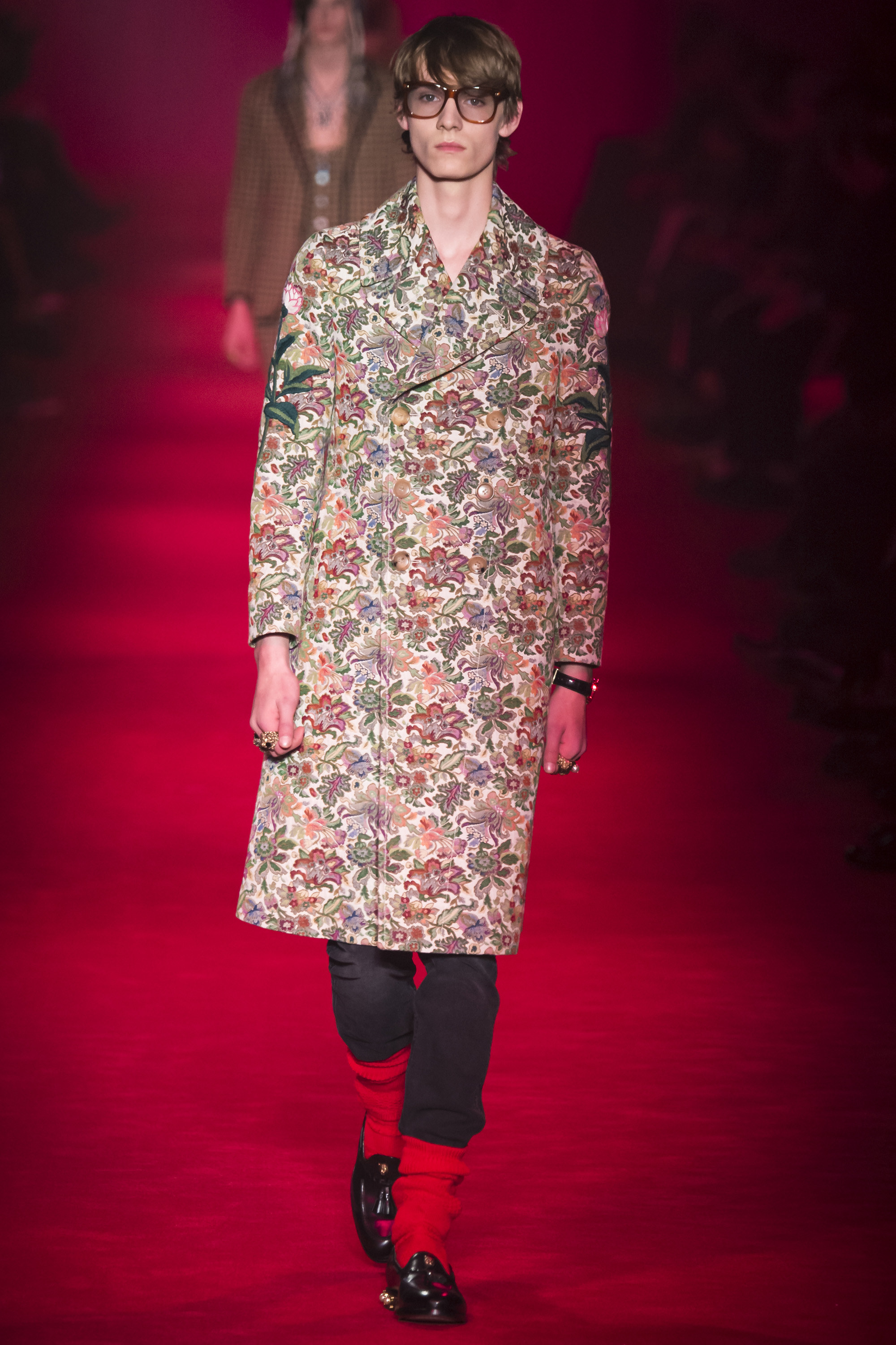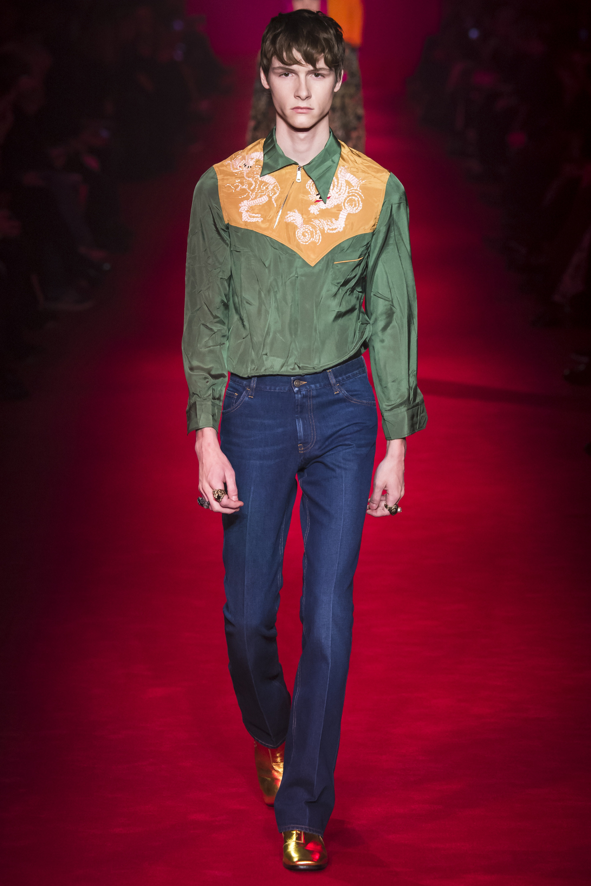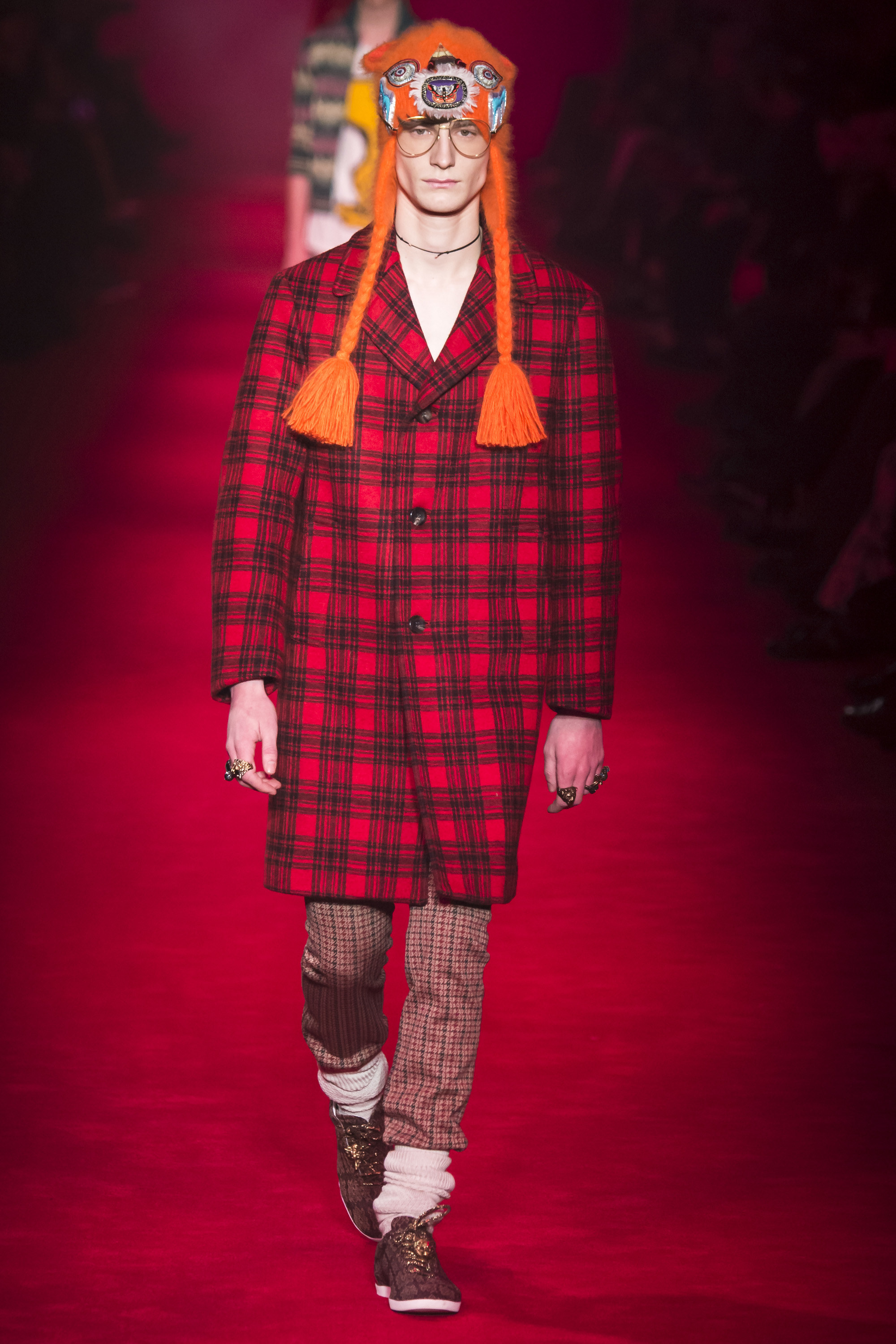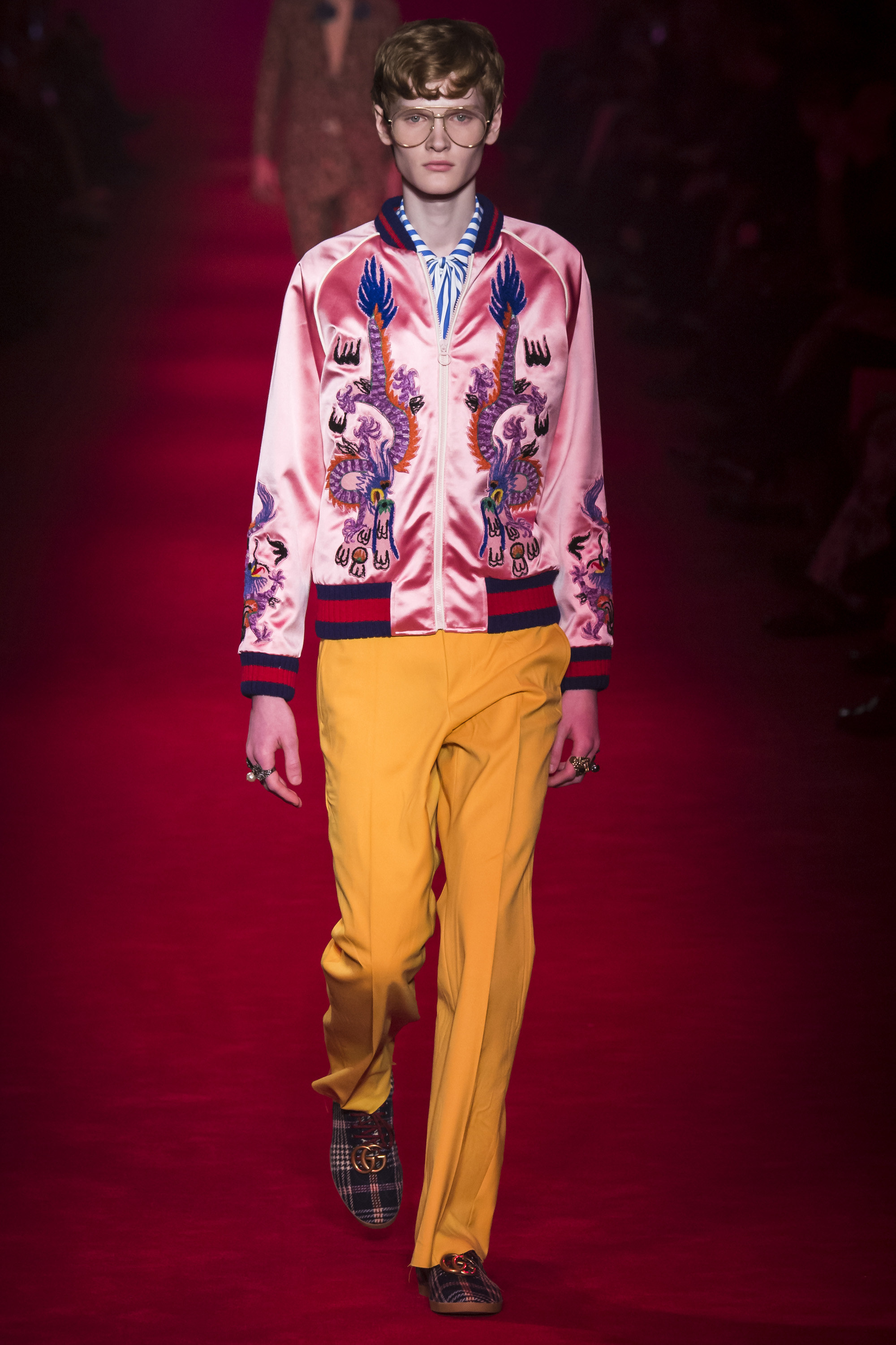 They are, of course, only one fragment of these complex, complicated Gucci collections—shown alongside Lurex knits, snakeskin suits, heels embedded with pearls, and sunglasses encrusted with crystal. An overload of decoration that sends you scribbling to record it all. No one will wear it—at least, not in that overwhelming entirety. But everyone can engage and relate with it. These collections are designed to be pulled apart by consumers, fashion shows as an engaging proposition of pieces rather than dictatorial, identikit aesthetic. There’s nothing wrong with the latter, of course. But then, there’s also nothing wrong with Gucci’s approach. It’s simply different. A different philosophy, a new way of looking at things.