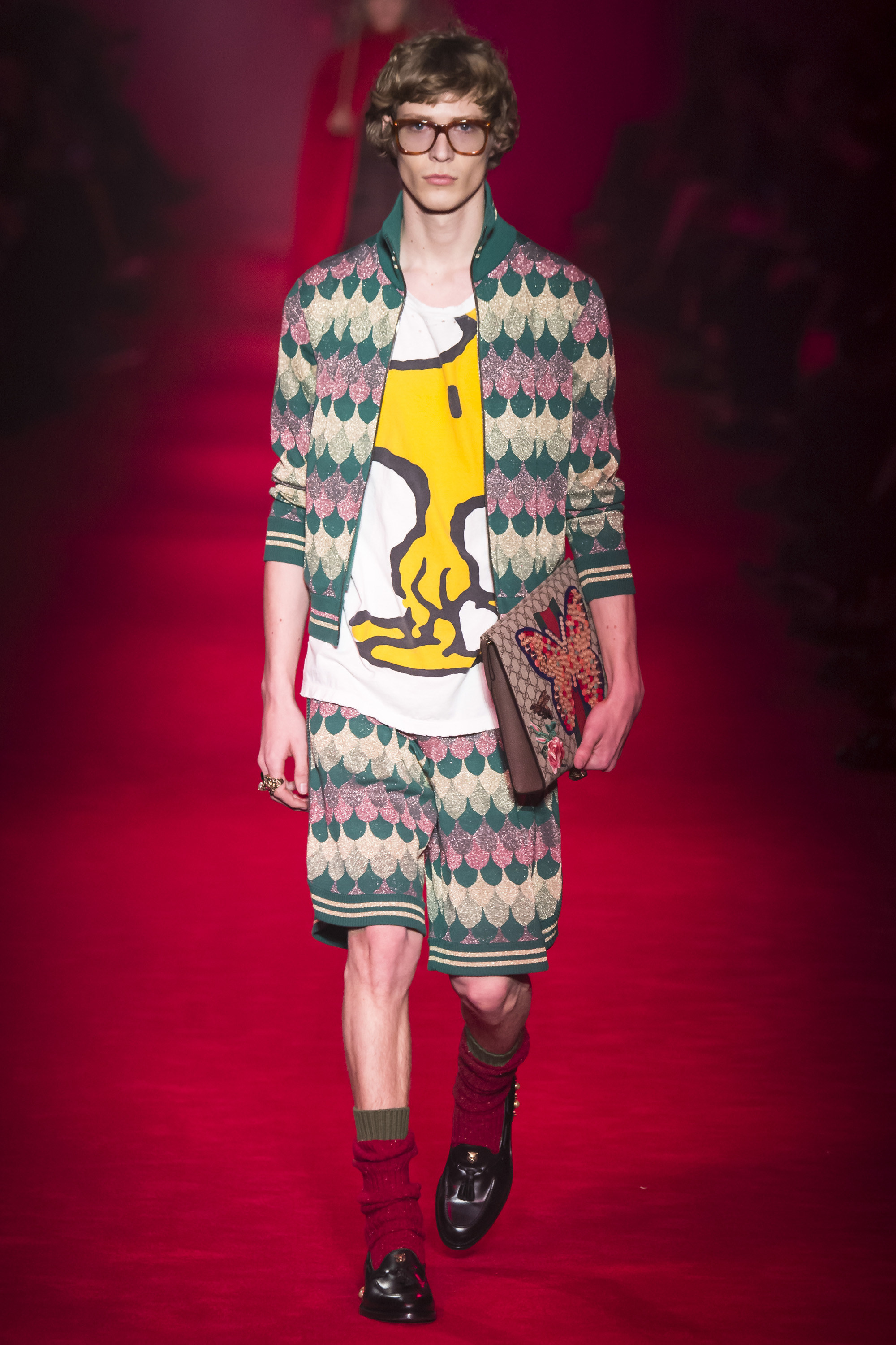 Gucci’s fashion philosophy—as with most everything in the Gucci universe—has been upheaved in the past 12 months, since the appointment of creative director Alessandro Michele. Basta to sexy, to the slick hangover of the Tom Ford glory years. Gucci’s clothes look different, so the thinking behind them must be different too. Gucci today earnestly references philosophers like the Marxist theorist Walter Benjamin, cross-referenced like a well-pulled-together essay. Backstage, Alessandro Michele tugged at an Aertex vest, bearing a portrait of Snoopy. “You know,” he mused, “Snoopy is like a philosopher.” He was smiling.