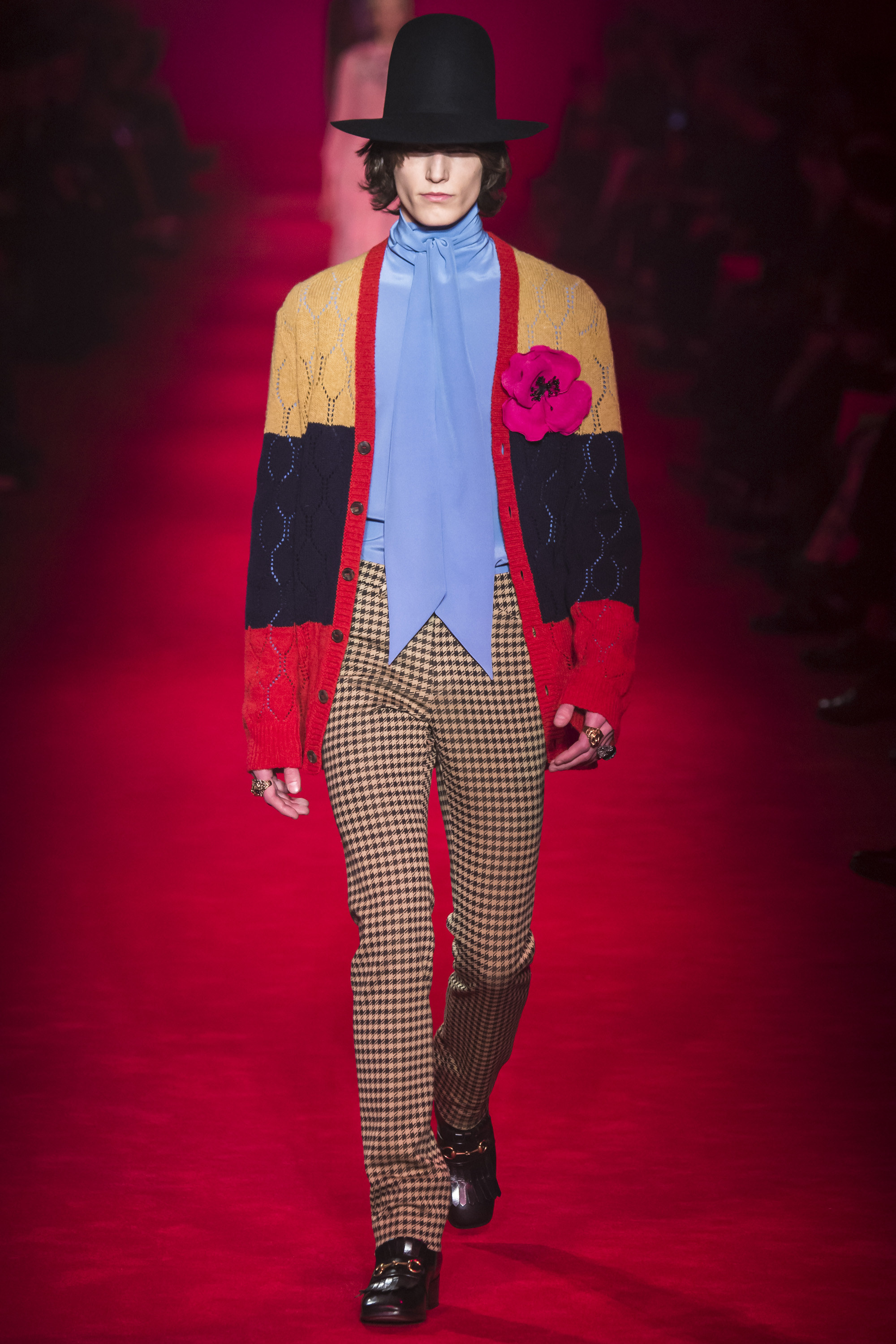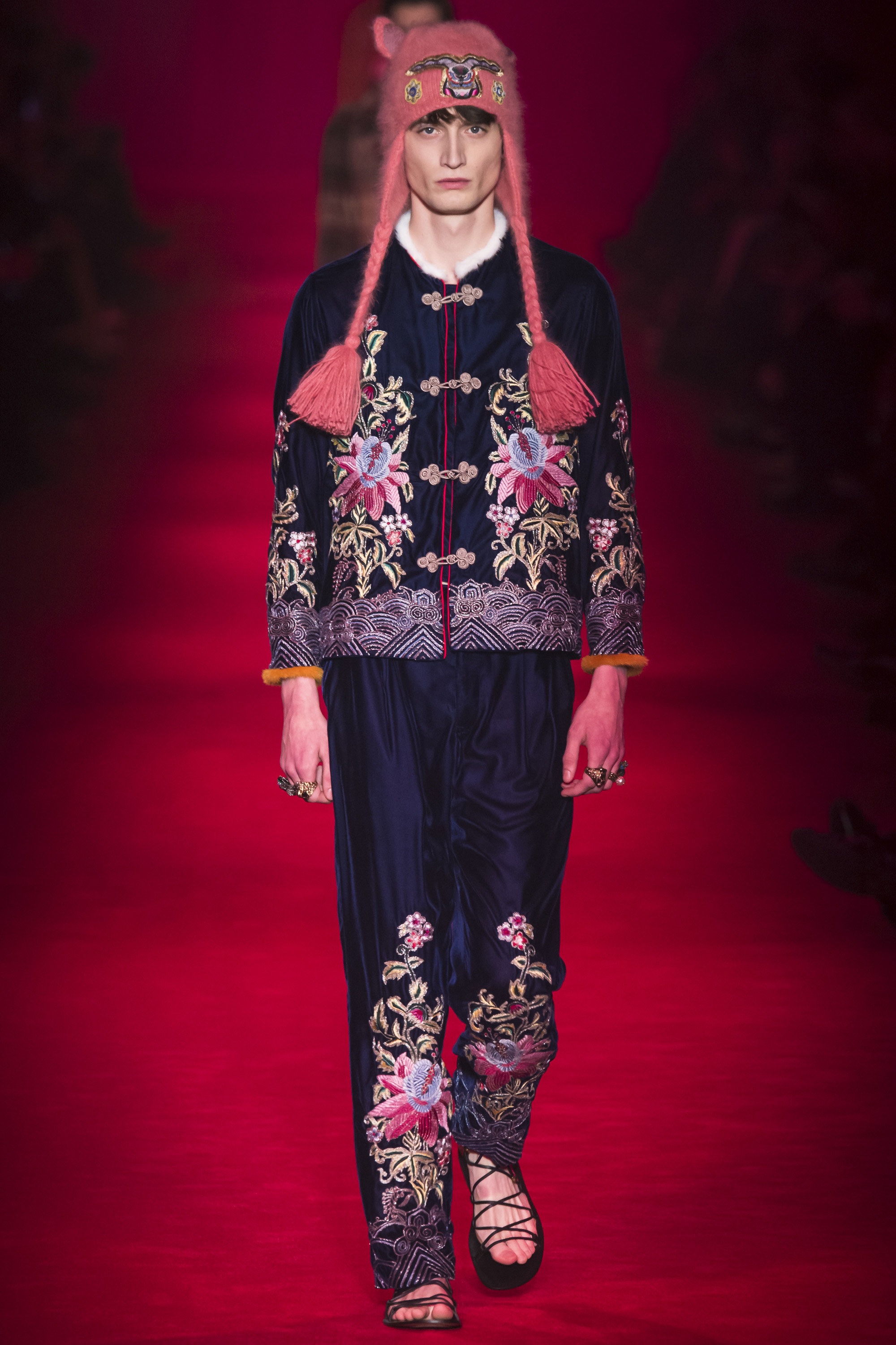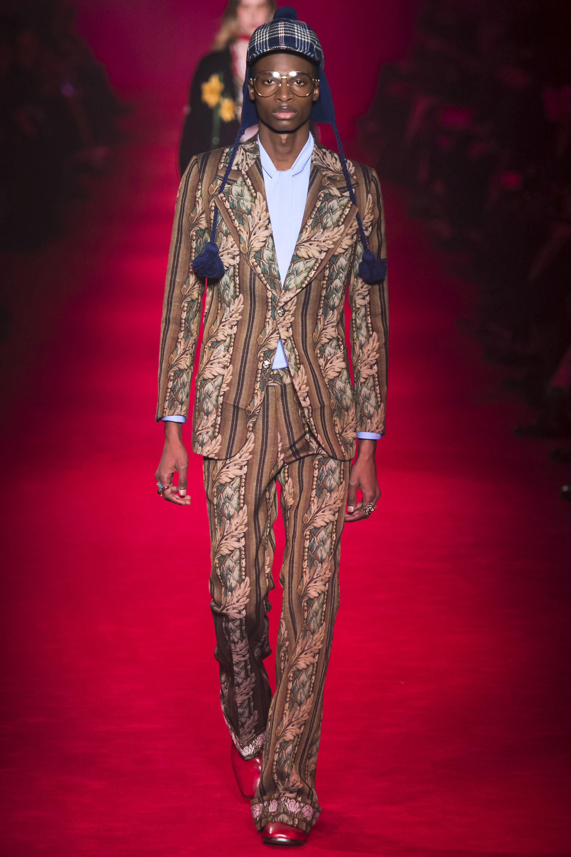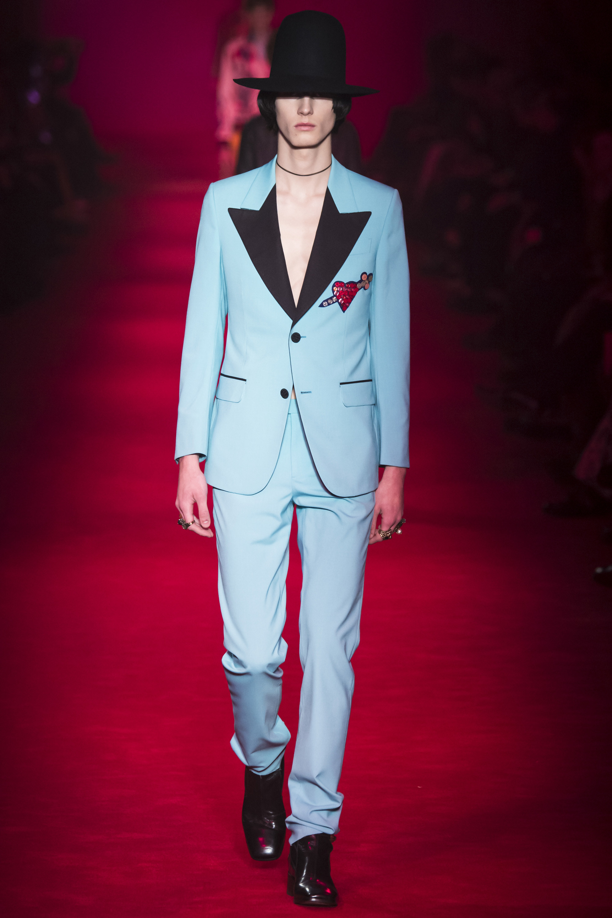 It is, however, terribly Gucci, and remarkably Italian. “A little Schiaparelli,” murmured Michele, fingering an embroidered crystal eye on one piece. “I was thinking of Walter Albini,” he said of another. Neither are the Italian designers that immediately leap to mind. “There is a stereotype of Italian fashion, of houses like Gucci,” said Michele thoughtfully. “We have more than people think. I have a lot of things in my mind from the archive, but I don’t want to be a prisoner of the archive. It’s always the ‘idea’ that I have of the archive . . .” The idea of memory, rather than the actuality of history. And Gucci these days has no walls—genderless, seasonless, formal and casual mixed. It’s about a freedom. And that is, I think, why so many people find it invigorating, and ignore perhaps the fact that, as individual garments, Michele is offering not invention but reinvention, revival, and rehash.
