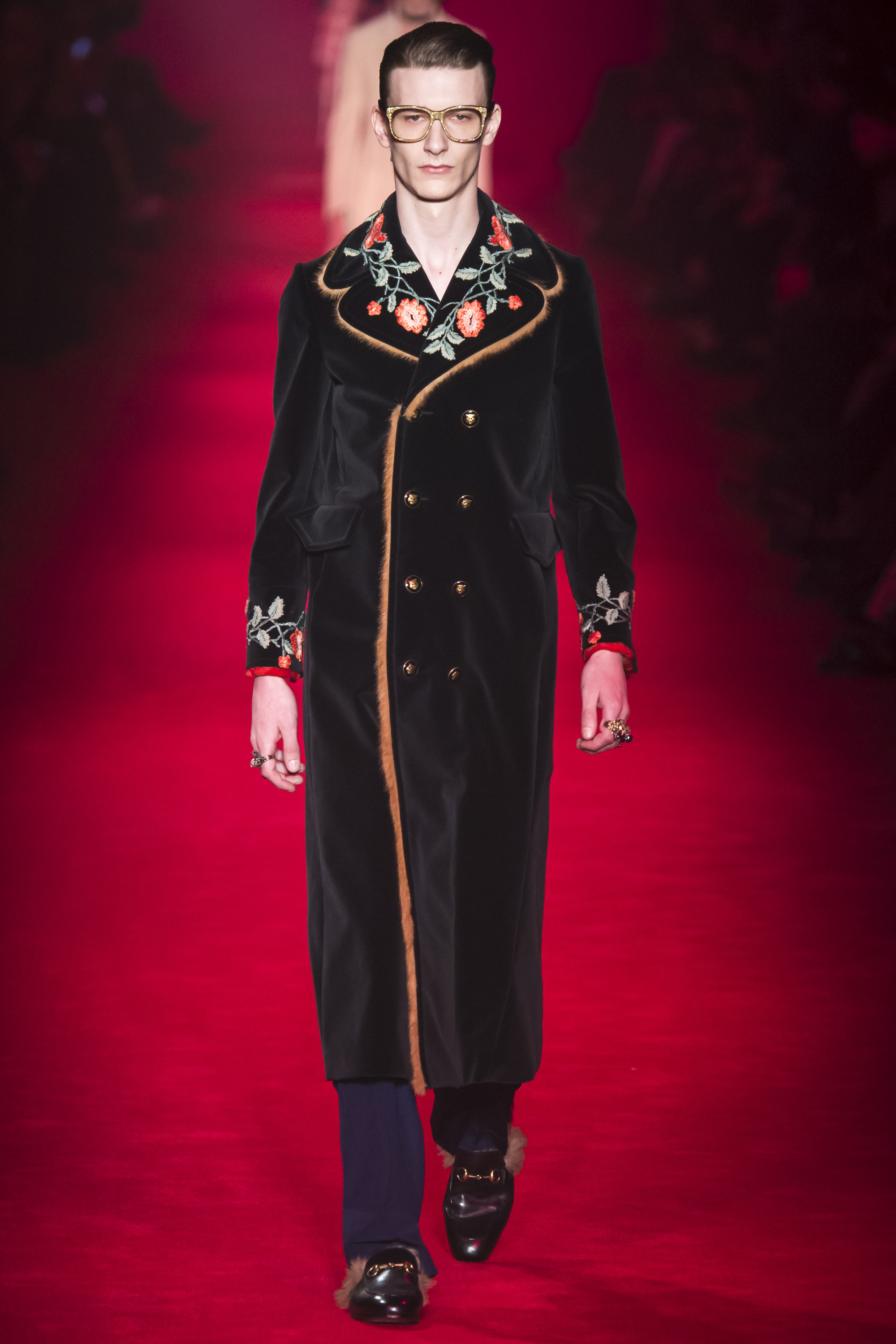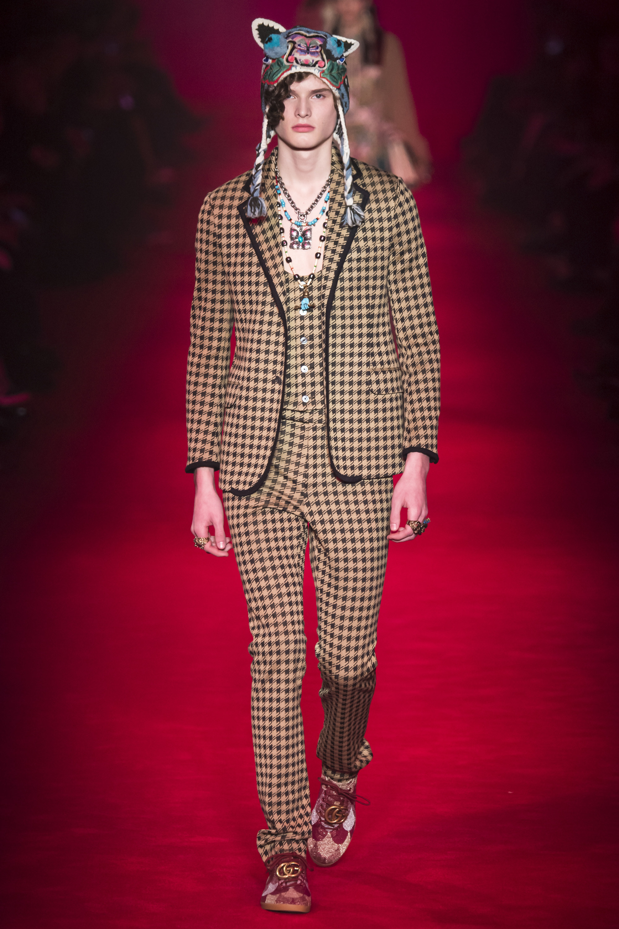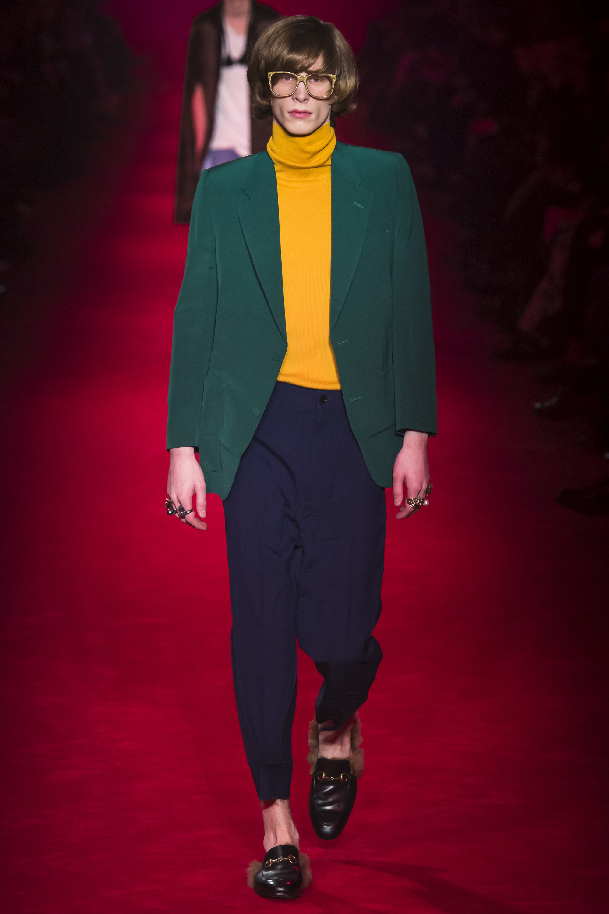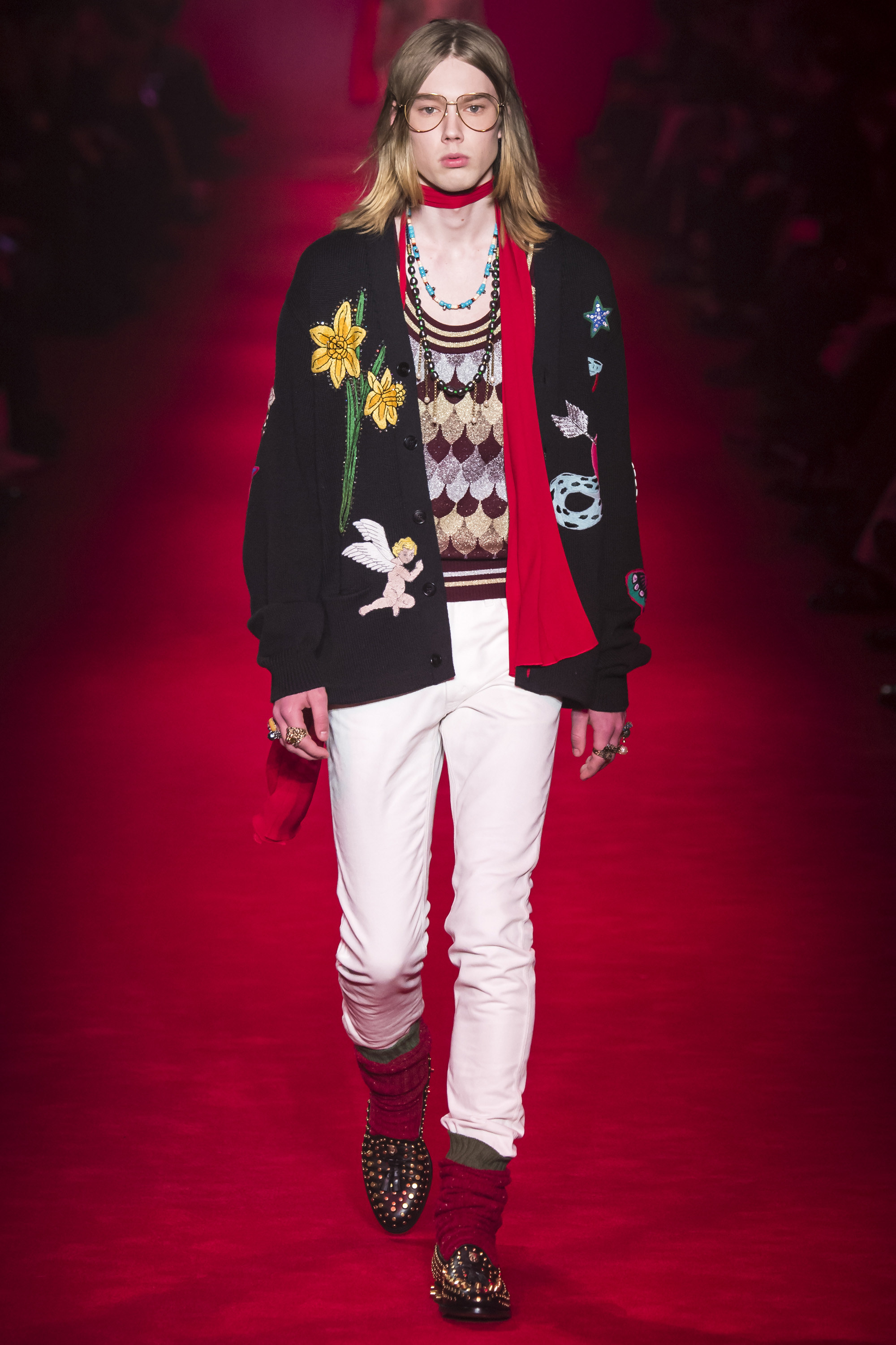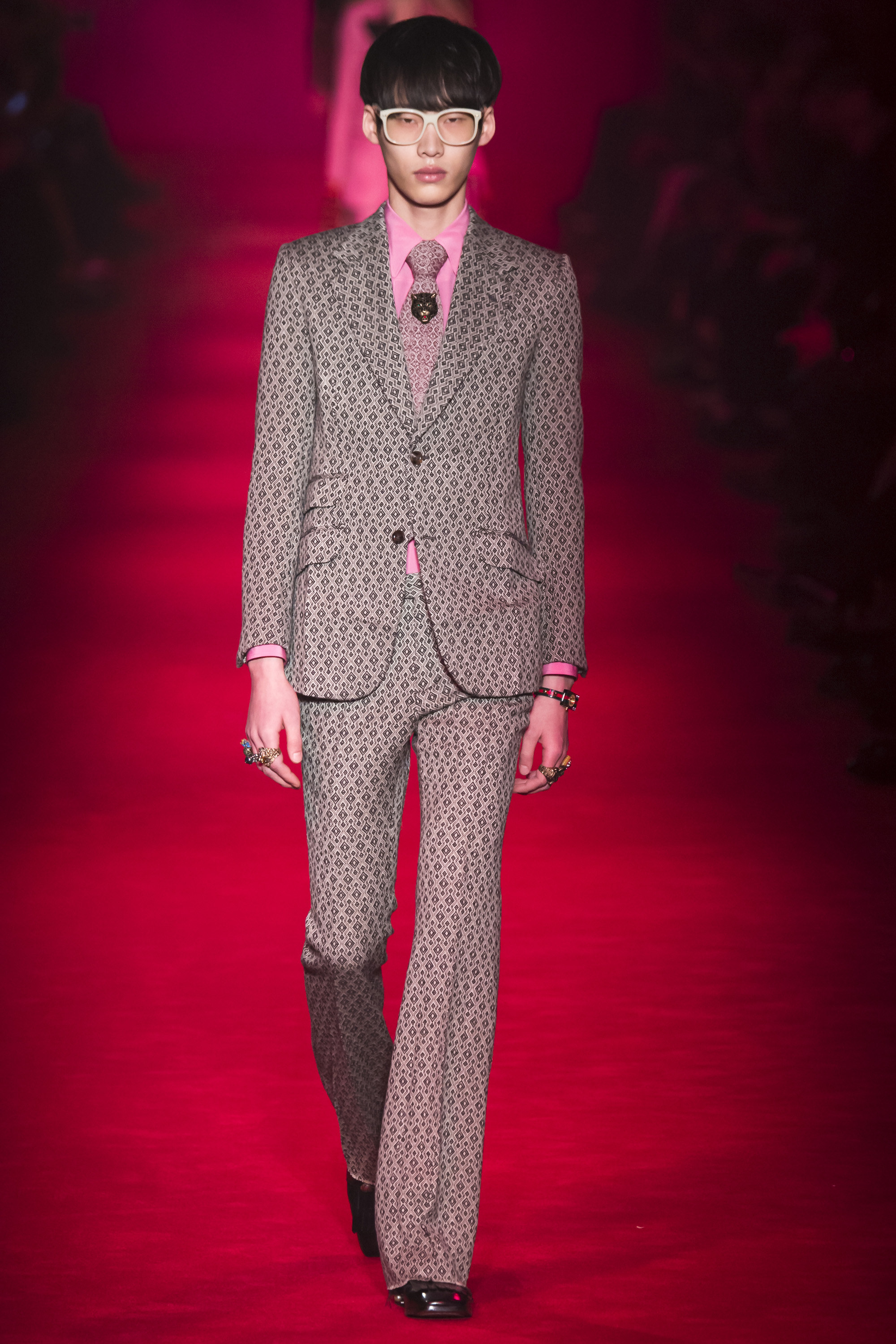 They are, of course, only one fragment of these complex, complicated Gucci collections—shown alongside Lurex knits, snakeskin suits, heels embedded with pearls, and sunglasses encrusted with crystal. An overload of decoration that sends you scribbling to record it all. No one will wear it—at least, not in that overwhelming entirety. But everyone can engage and relate with it. These collections are designed to be pulled apart by consumers, fashion shows as an engaging proposition of pieces rather than dictatorial, identikit aesthetic. There’s nothing wrong with the latter, of course. But then, there’s also nothing wrong with Gucci’s approach. It’s simply different. A different philosophy, a new way of looking at things.