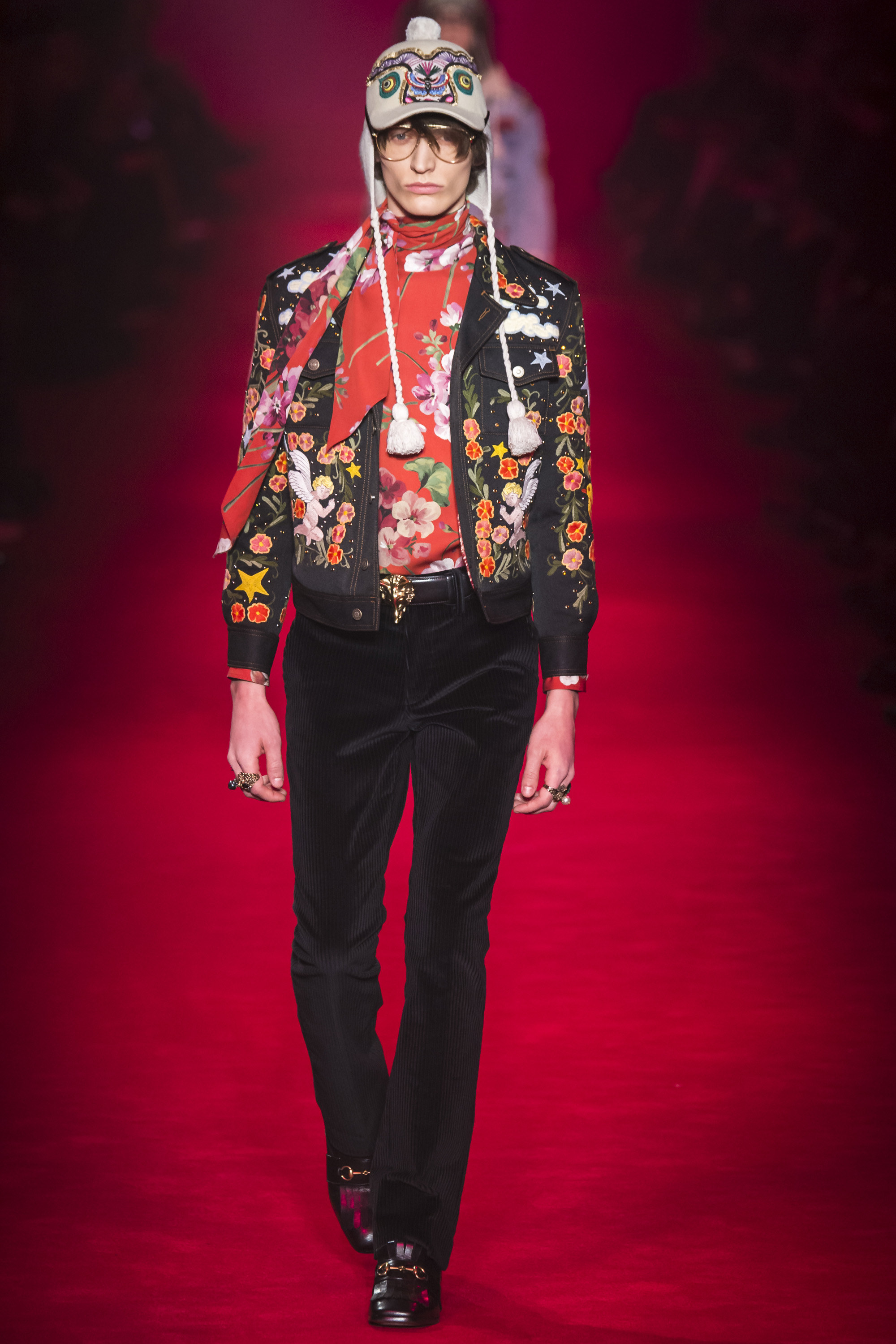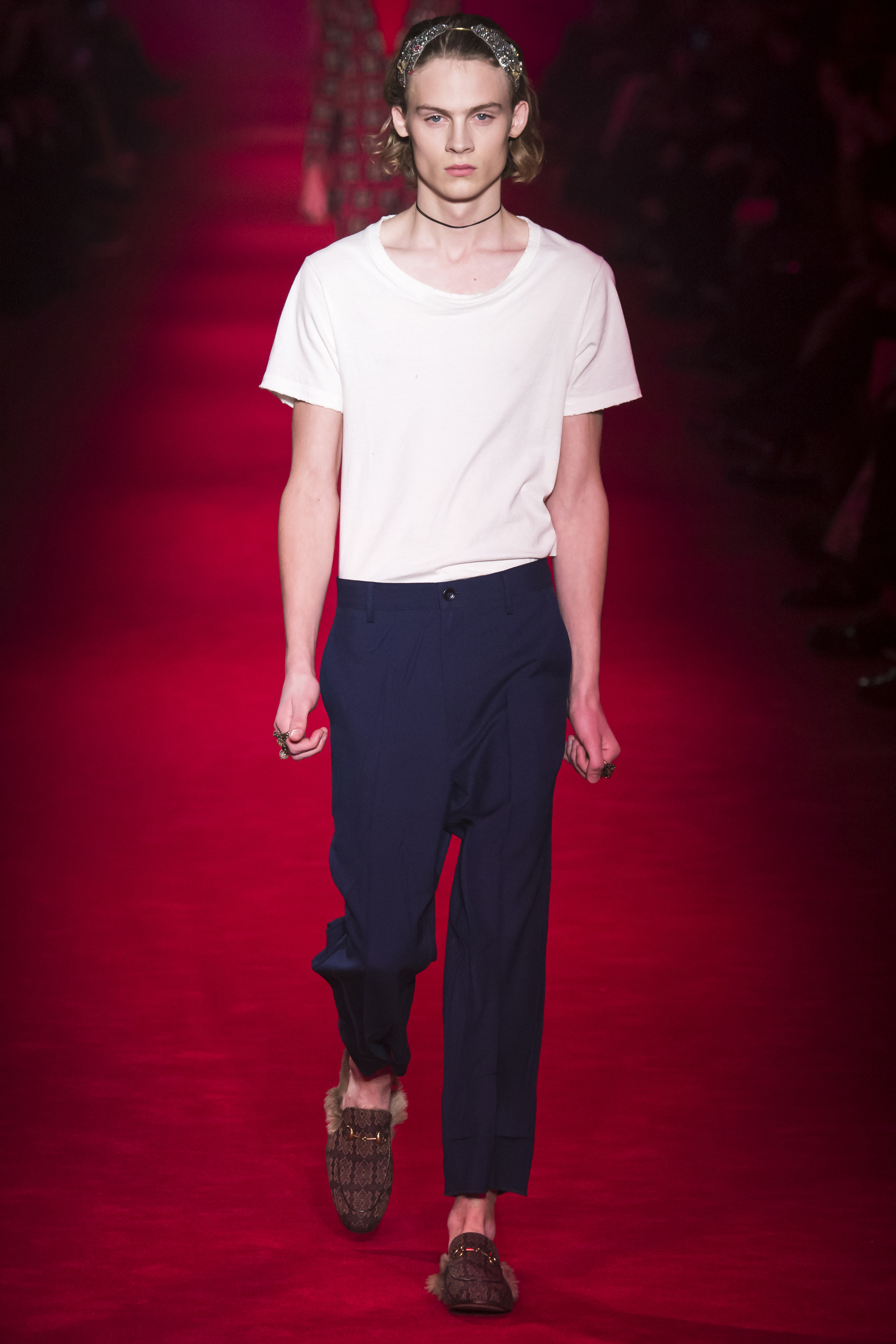 What the Fall 2016 men’s Gucci collection did was retread ground Michele’s been covering for the past year. It evolved it, a little, but it was about reaffirming the new creative direction of the house. Which, if we’re honest, isn’t that new. It’s just a new edit of an existing script. It’s new in the sense that fashion frequently is—reviving a moment that contrasts with that which immediately preceded it. Baudrillard once cited it as a dynamism of amalgamation and recycling. He hasn’t been quoted by Gucci, yet.
