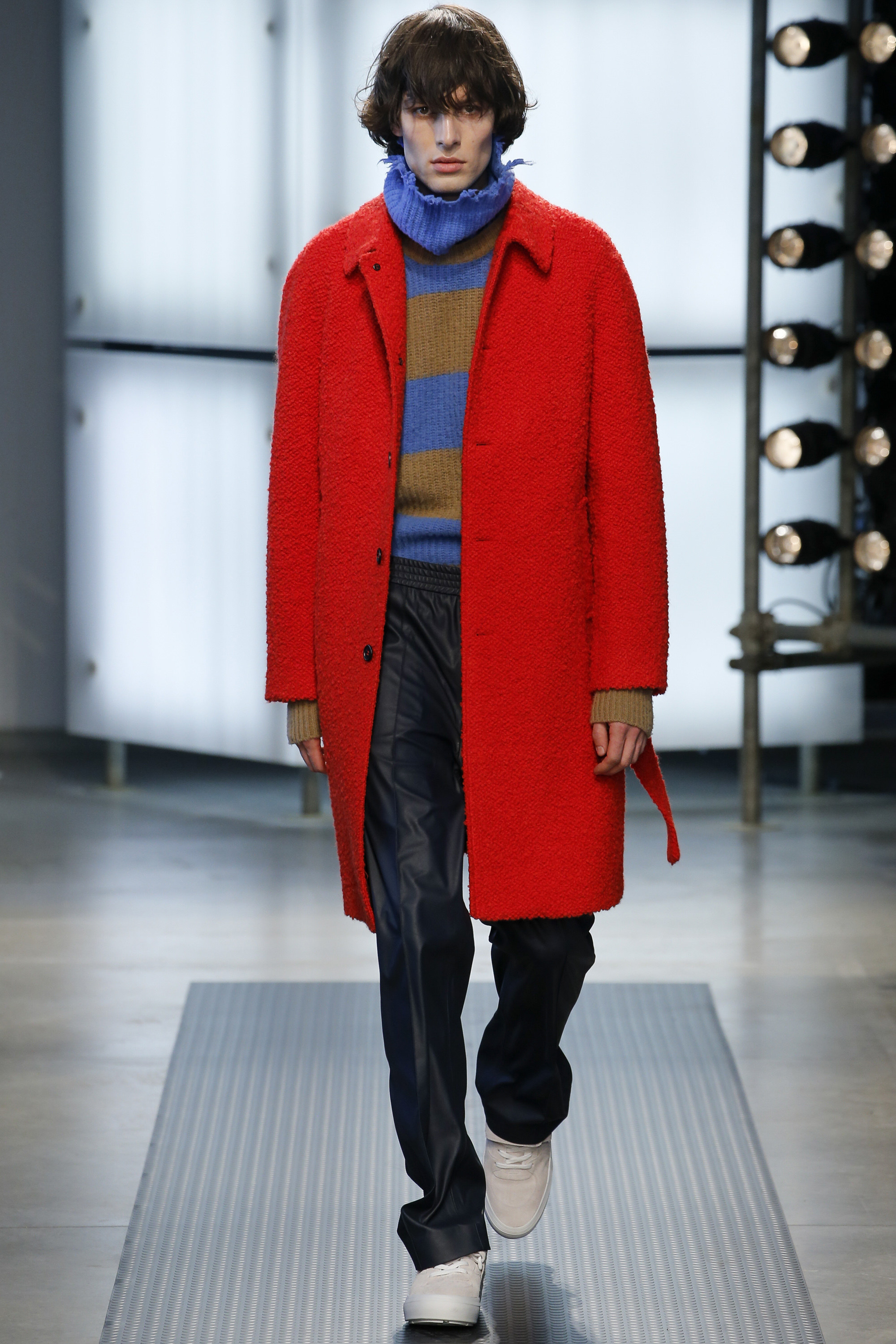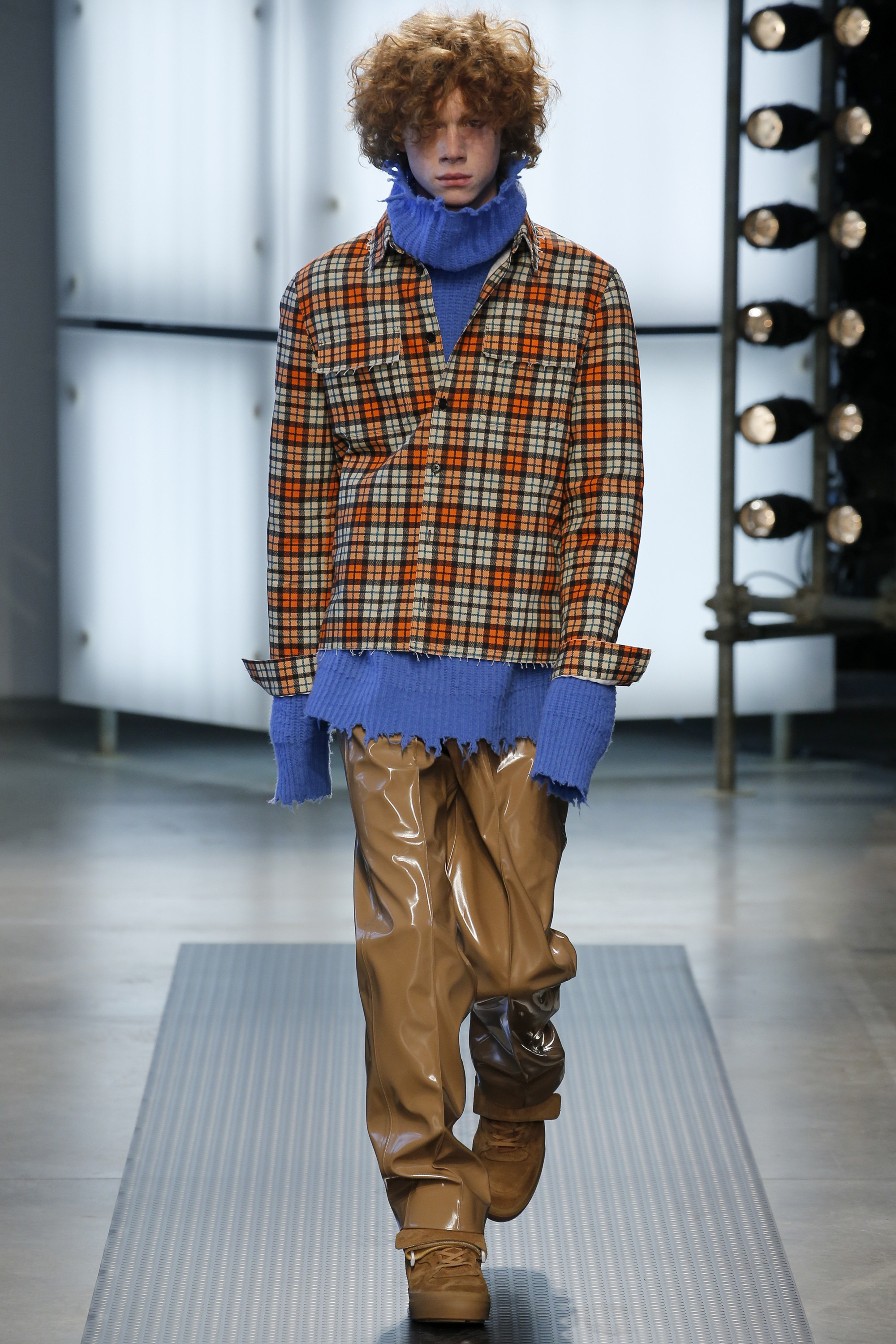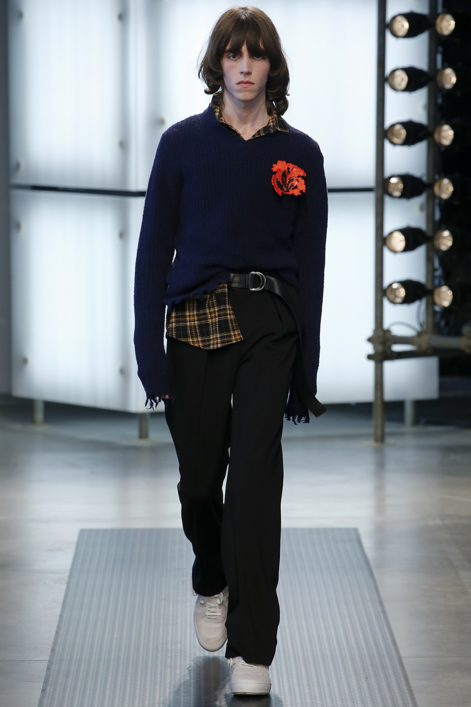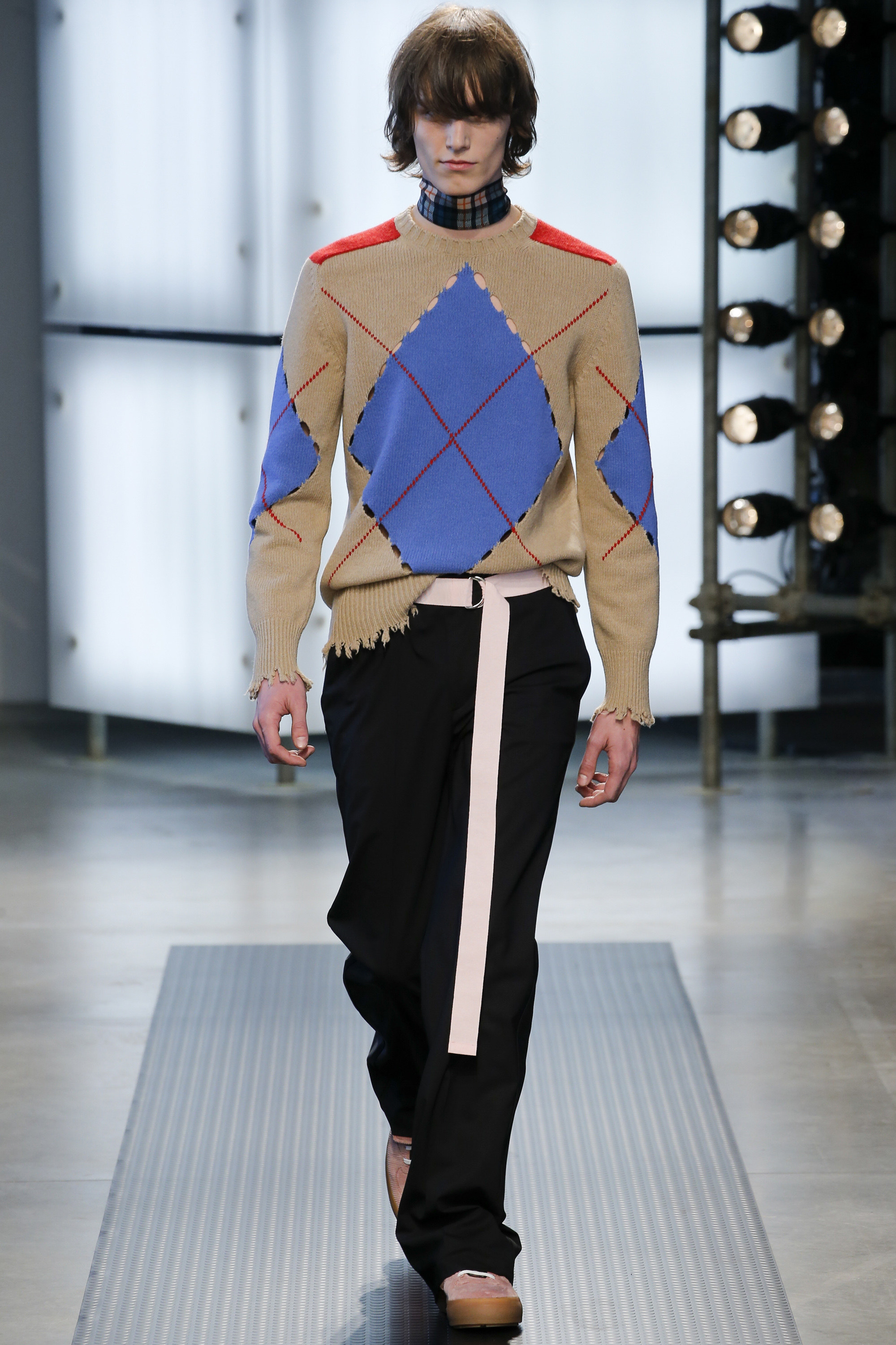 The influence of Peyton’s work in today’s collection was fairly concrete: the sense of the spontaneous, the immediate, something dashed off quickly, capturing a moment. Giorgetti said he liked that, and there was a hurried sense to the outfits he showed, topped with tousled hair and bottomed with sneakers, the in-between bits of tailoring and sports mashed and mangled together. A sweater, say, with a chomped-up hem, as if knitters were interrupted before they got a chance to rib it; argyles were perforated with holes, and colors—hazmat orange, Hockney blue, a virulent geranium—zinged. It felt as if they hit your retina faster than others. Twisted about the body, the clothes seemed as if they were pulled on in a hurry, or in the dark.