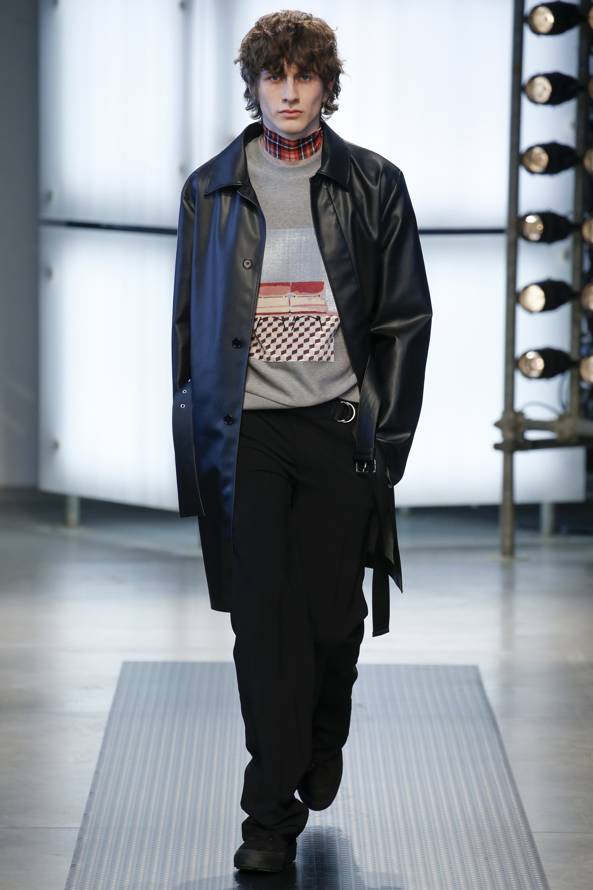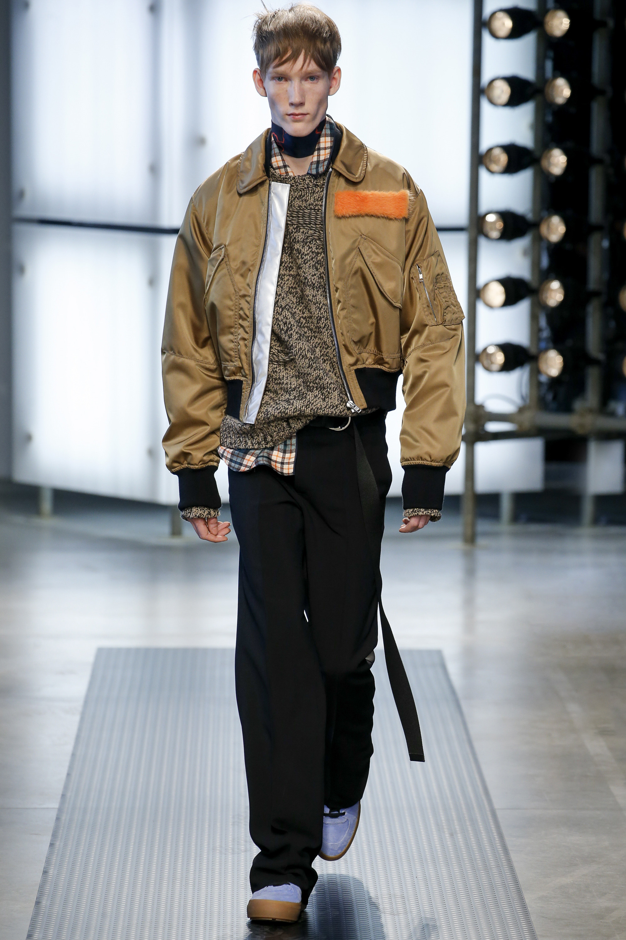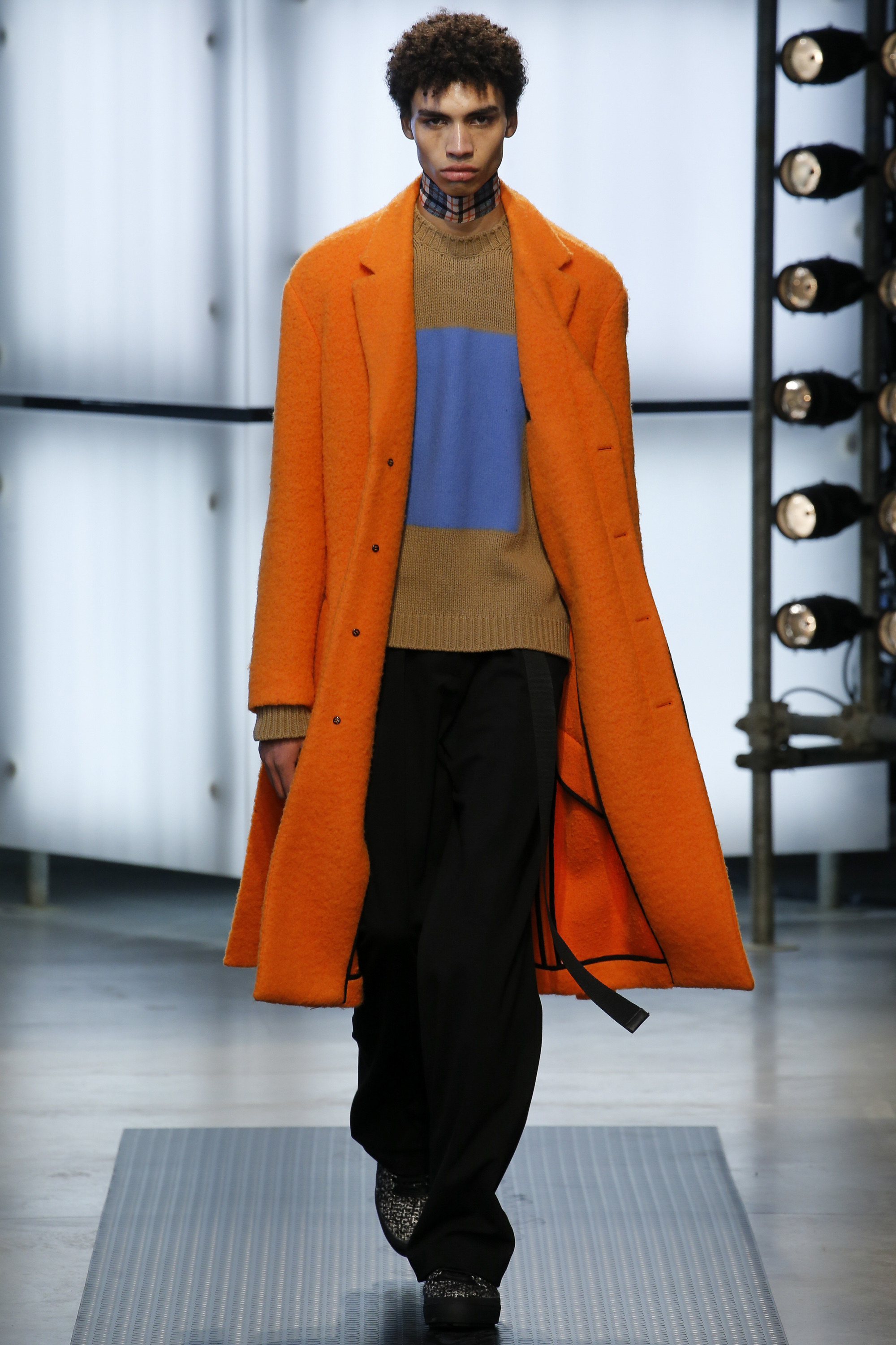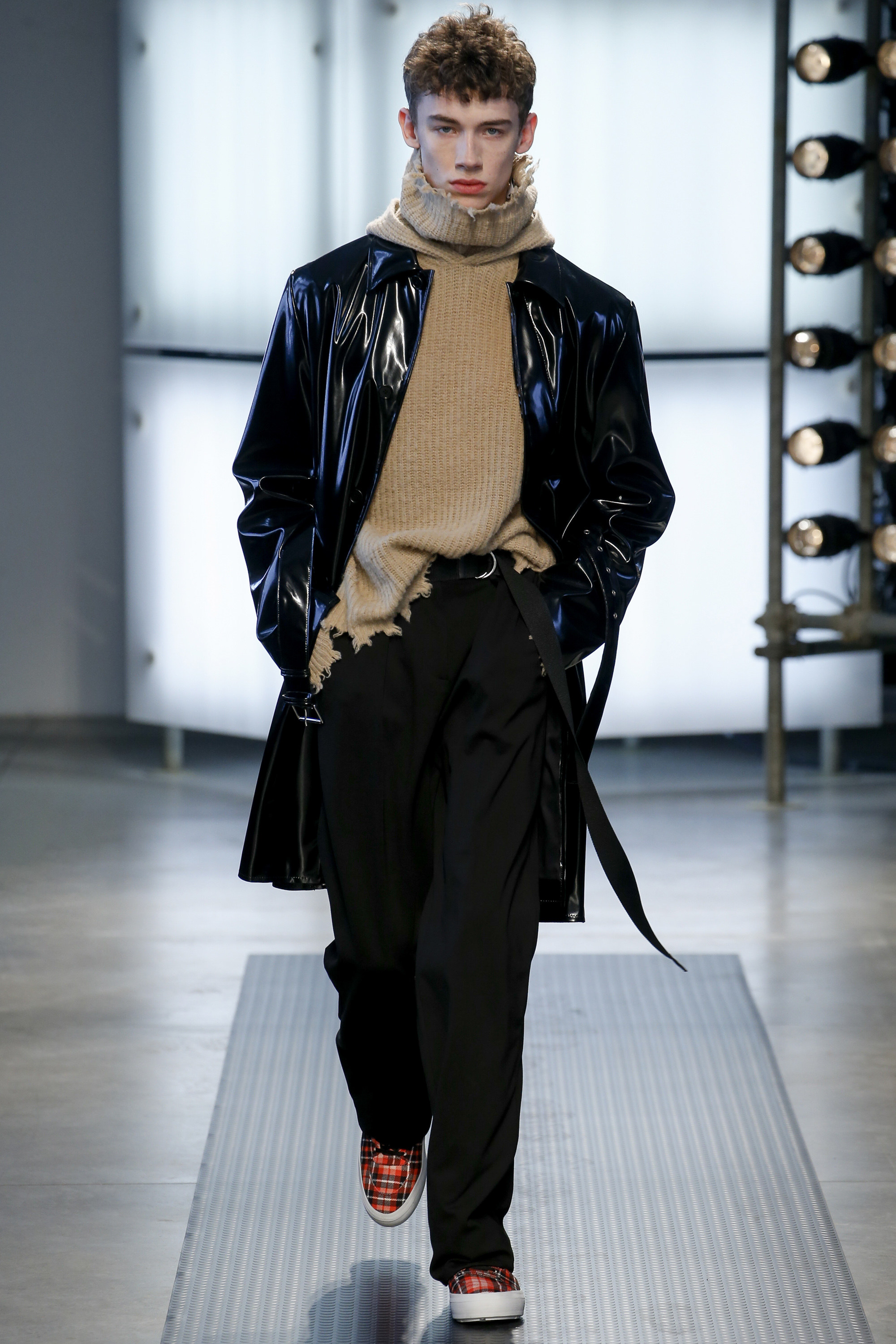 The influence of Peyton’s work in today’s collection was fairly concrete: the sense of the spontaneous, the immediate, something dashed off quickly, capturing a moment. Giorgetti said he liked that, and there was a hurried sense to the outfits he showed, topped with tousled hair and bottomed with sneakers, the in-between bits of tailoring and sports mashed and mangled together. A sweater, say, with a chomped-up hem, as if knitters were interrupted before they got a chance to rib it; argyles were perforated with holes, and colors—hazmat orange, Hockney blue, a virulent geranium—zinged. It felt as if they hit your retina faster than others. Twisted about the body, the clothes seemed as if they were pulled on in a hurry, or in the dark.