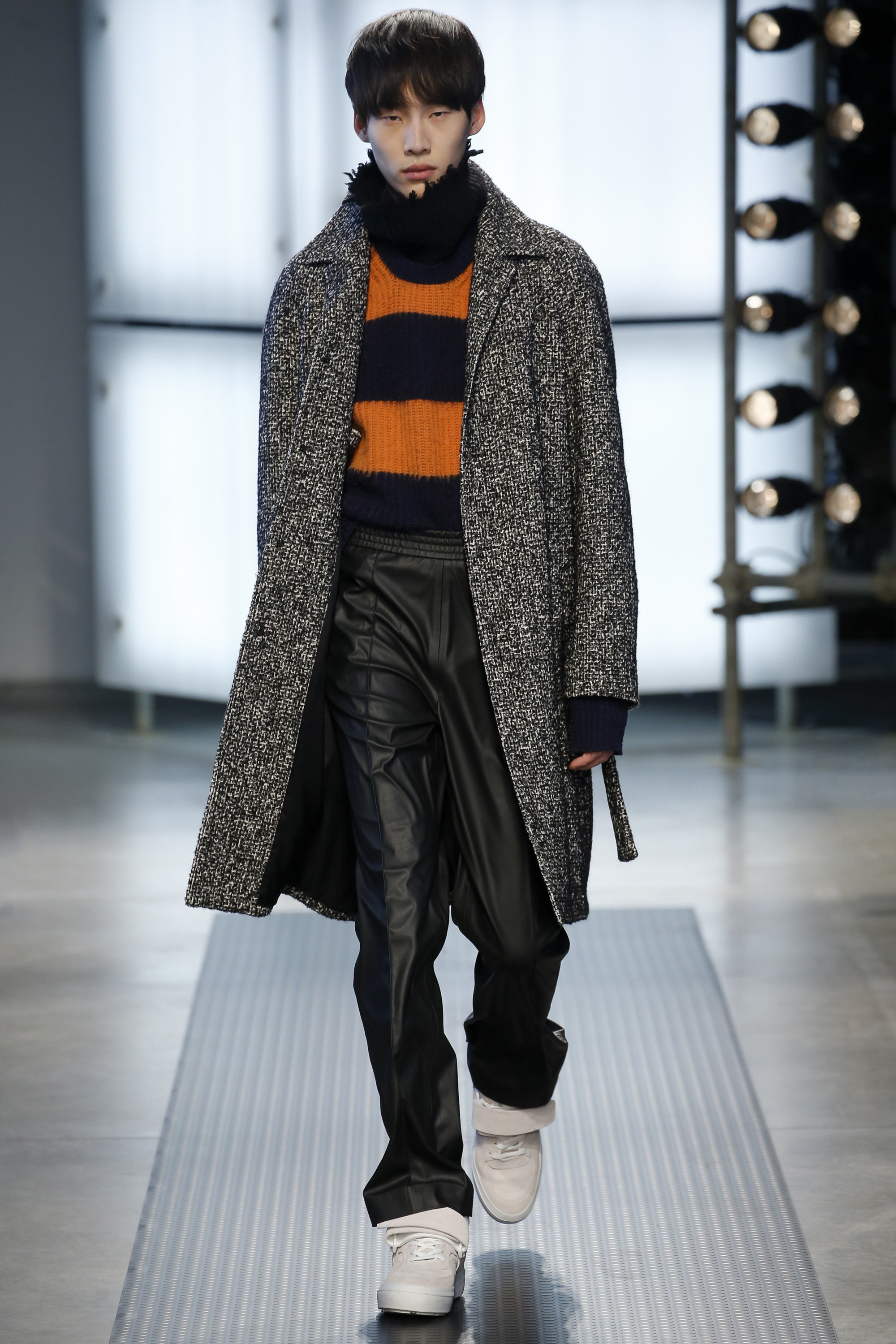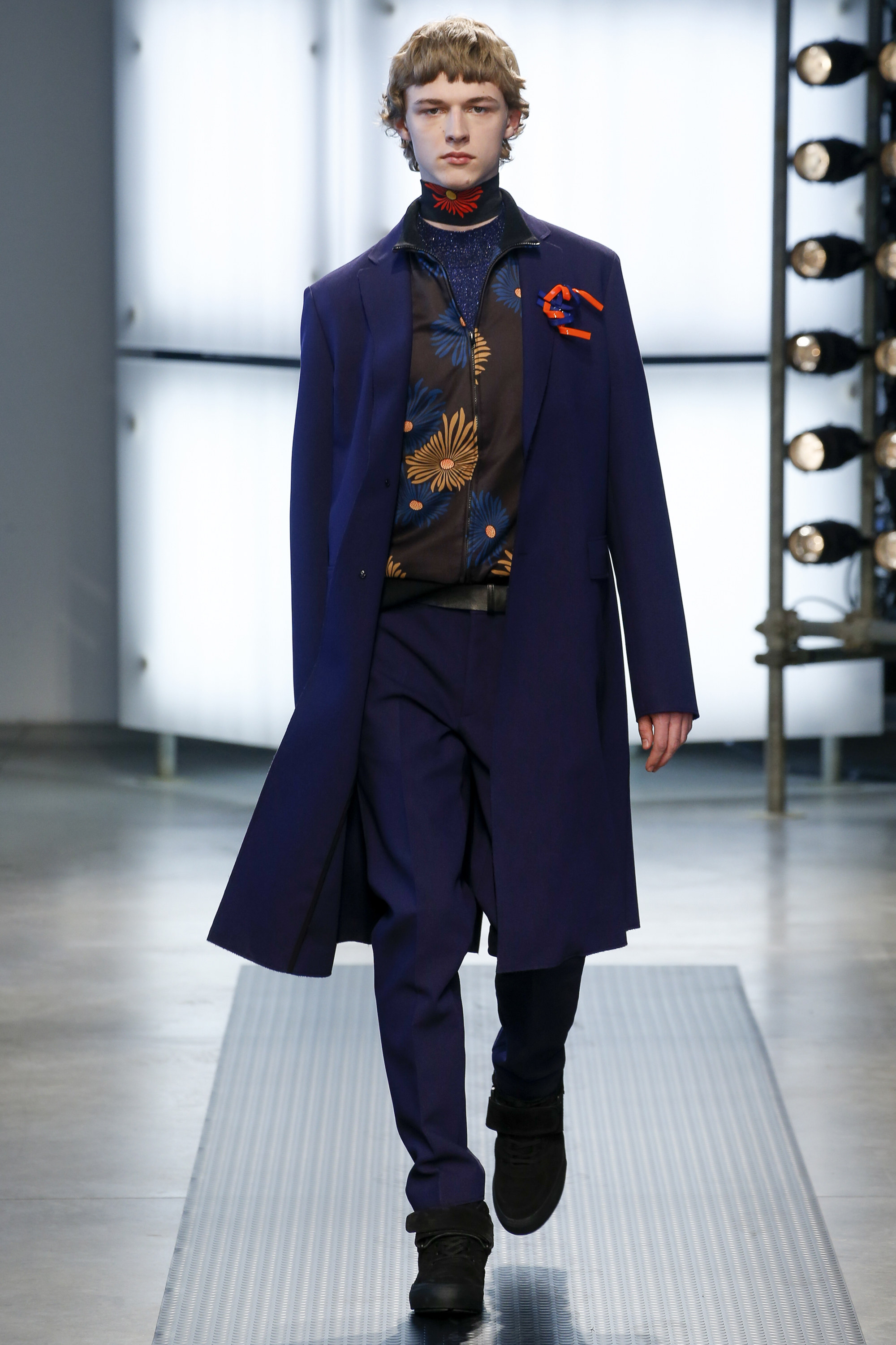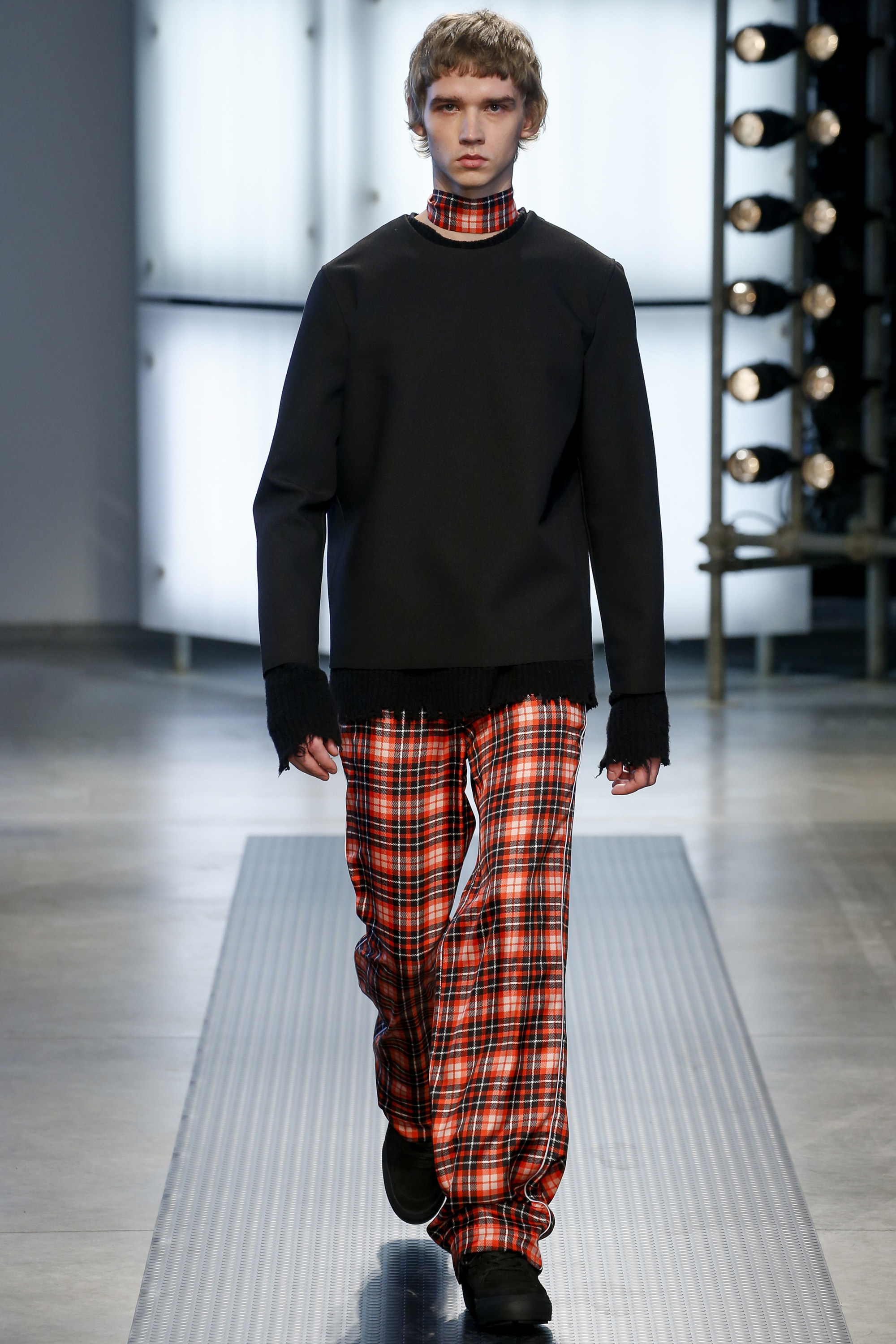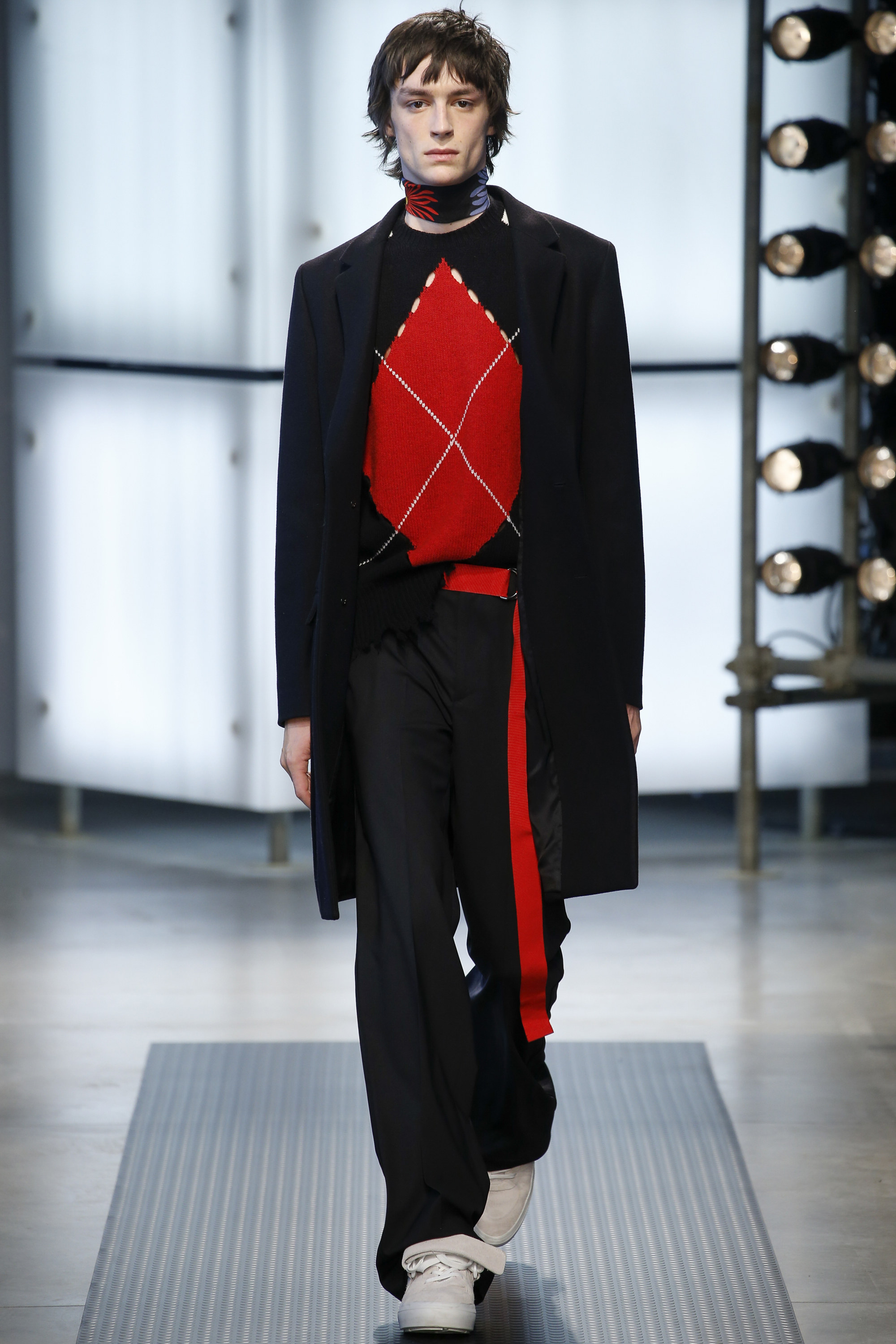 The influence of Peyton’s work in today’s collection was fairly concrete: the sense of the spontaneous, the immediate, something dashed off quickly, capturing a moment. Giorgetti said he liked that, and there was a hurried sense to the outfits he showed, topped with tousled hair and bottomed with sneakers, the in-between bits of tailoring and sports mashed and mangled together. A sweater, say, with a chomped-up hem, as if knitters were interrupted before they got a chance to rib it; argyles were perforated with holes, and colors—hazmat orange, Hockney blue, a virulent geranium—zinged. It felt as if they hit your retina faster than others. Twisted about the body, the clothes seemed as if they were pulled on in a hurry, or in the dark.