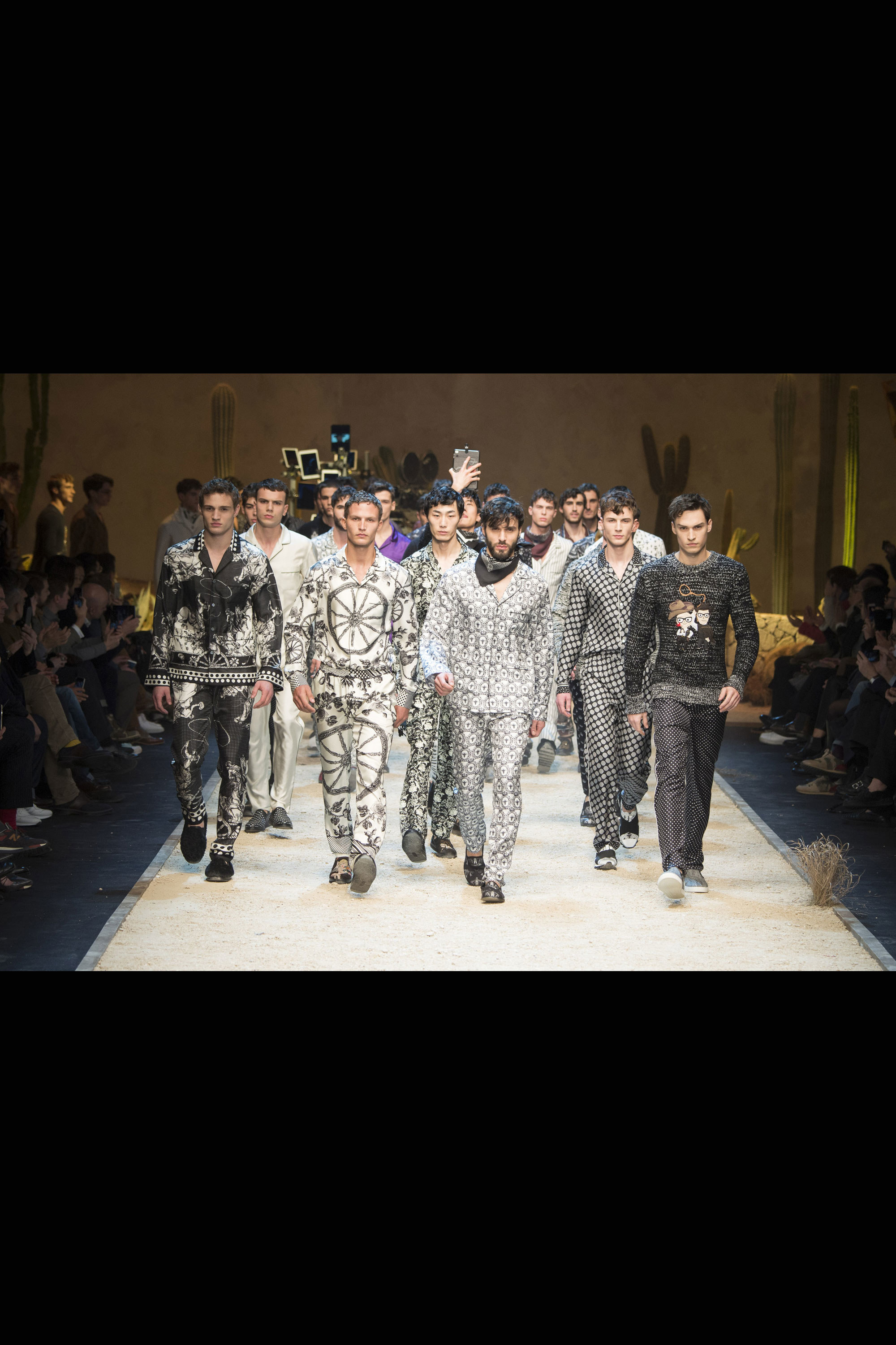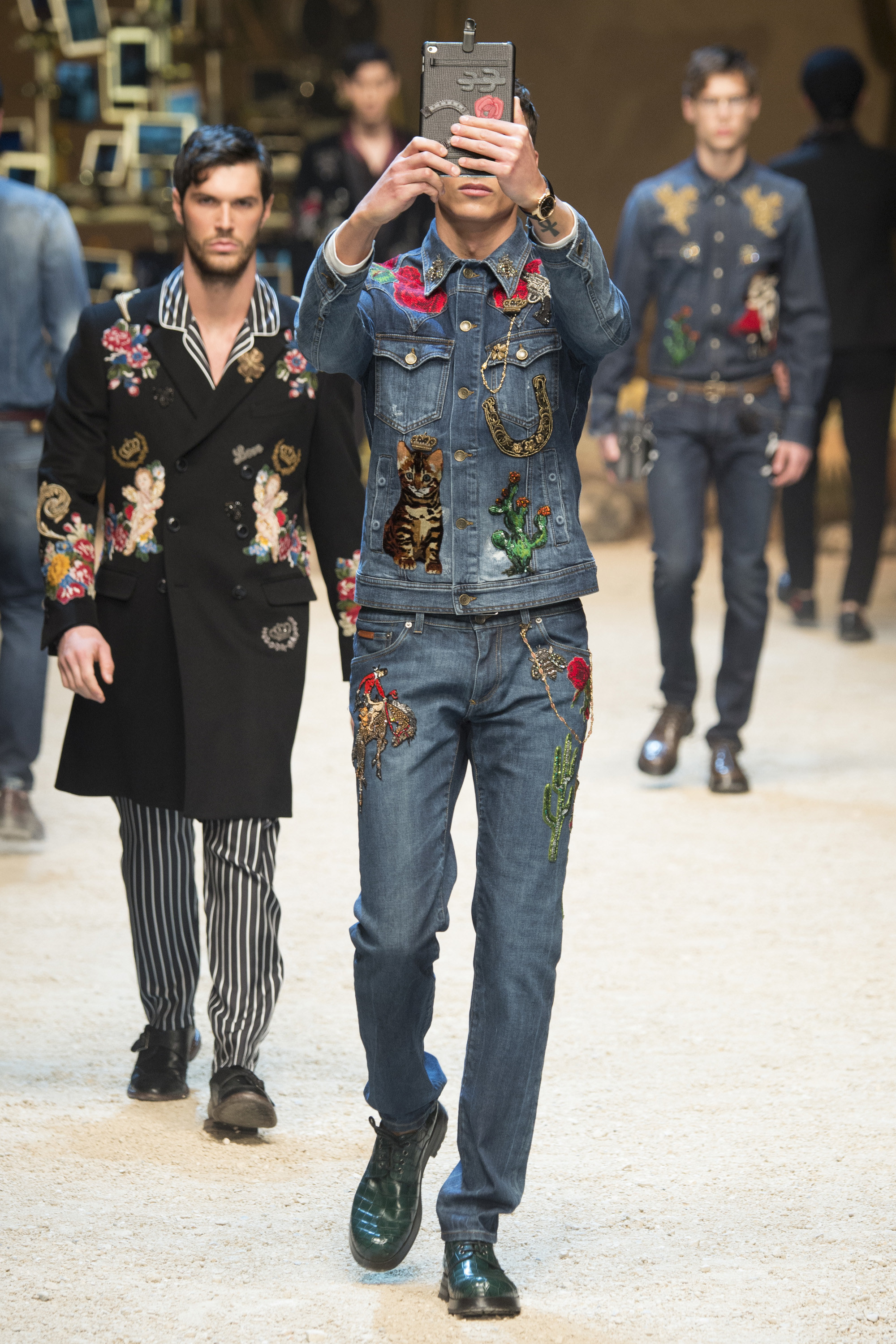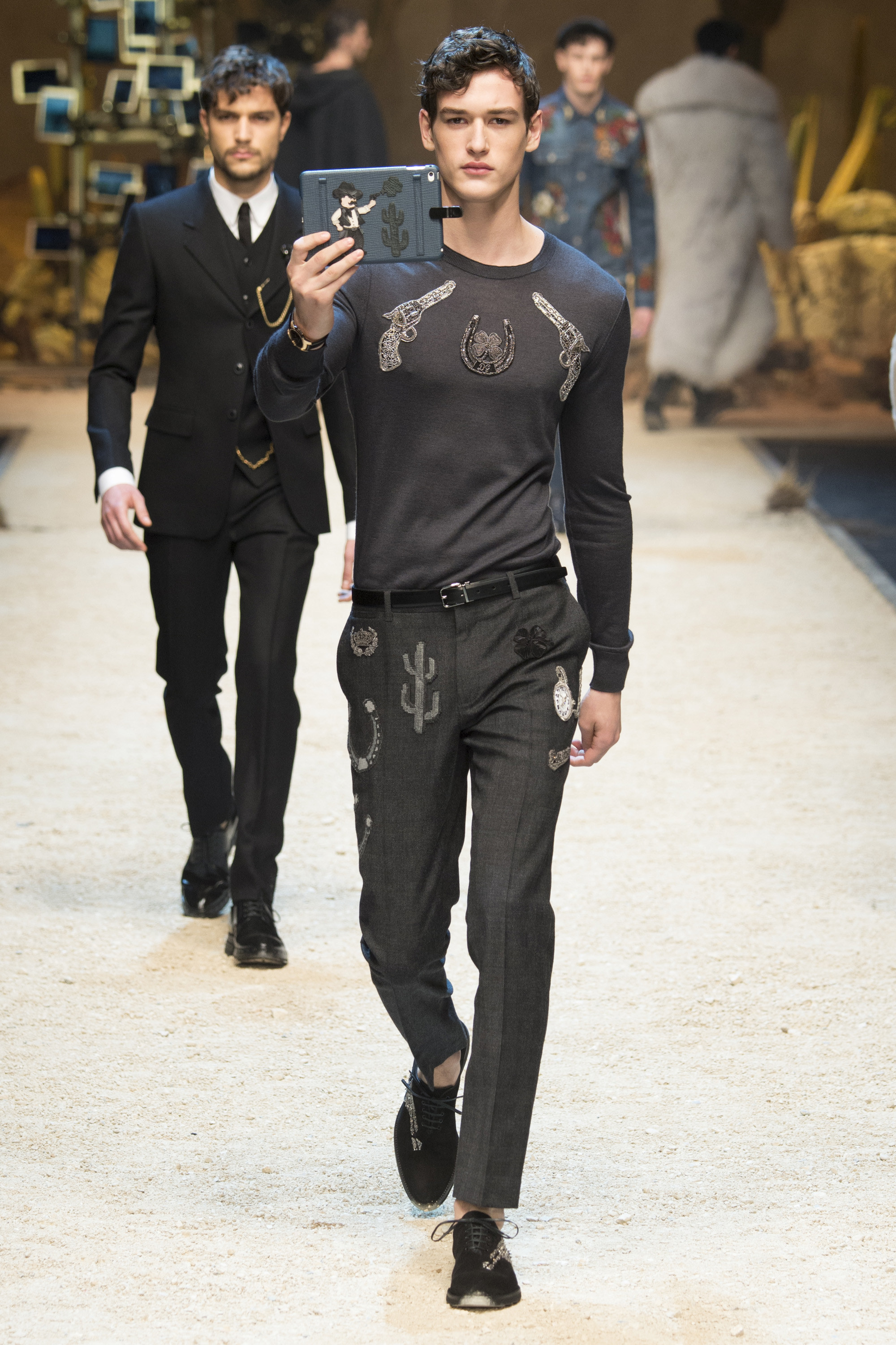 Westernalia was not the only seasoning sprinkled over this collection. Embroideries heaped upon topcoats and trucker jackets—the denim section was one to linger over—included tapestried roses and putti. Buzzing anew was the little bee symbol on gold chains, patches, and pajamas. There were Westernized versions of the same faux-naif illustrations from the designers’ recent mamma-themed womenswear show—one, on a sweatshirt, depicted Domenico and Stefano—and even some meme-tastic illustrations of Zambia, Stefano’s cat. There was so much going on here—the models were using tablets to live-stream point-of-view runway video to the screens above us, too—that through the dust it all sometimes felt like a peyote-fueled menswear mirage. Pull it all apart, though, and what you have is some of the finest top-of-the-line tailoring and extrovert outerwear in the business—plus those D&G-pioneered pajamas (which are now becoming a category all their own).