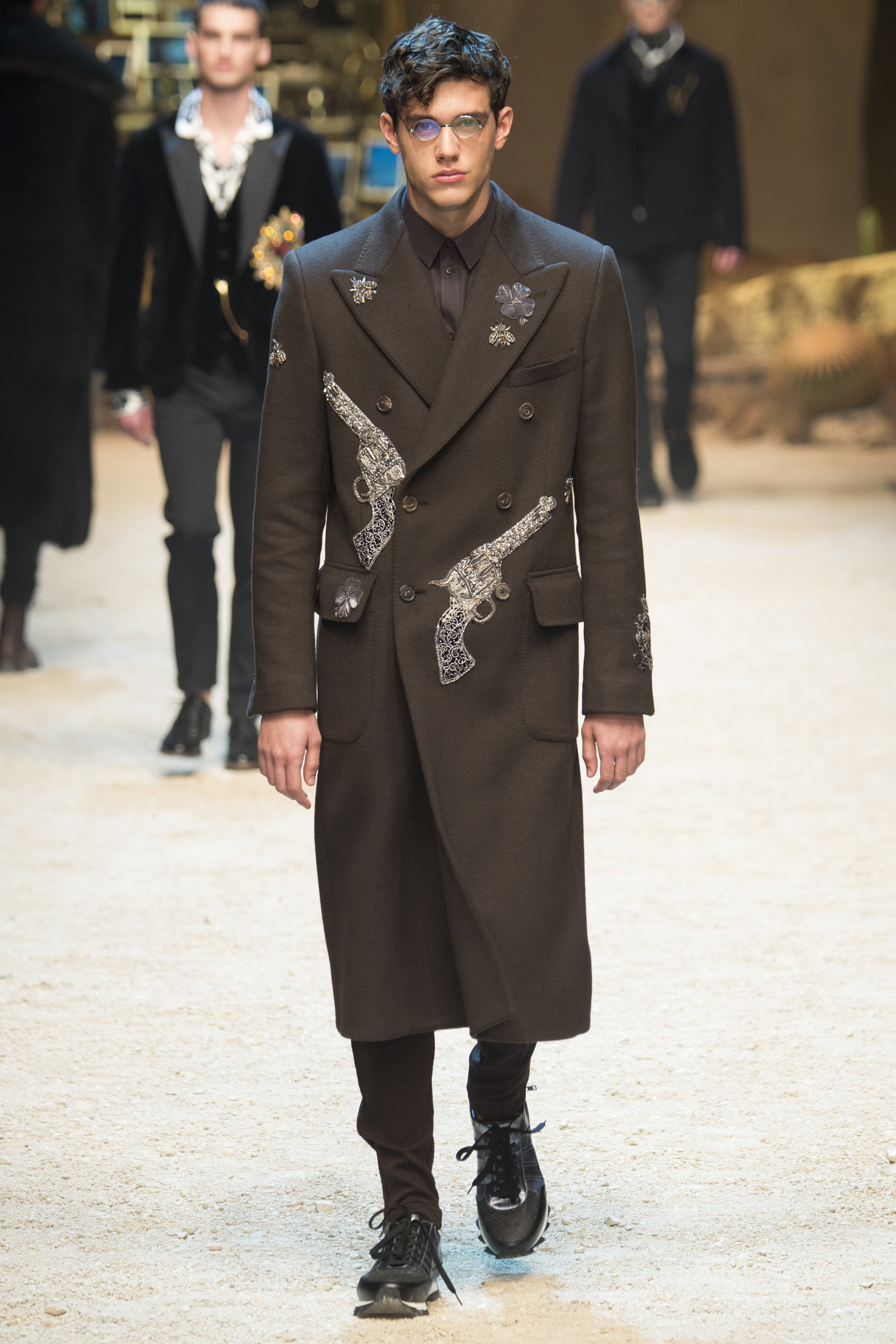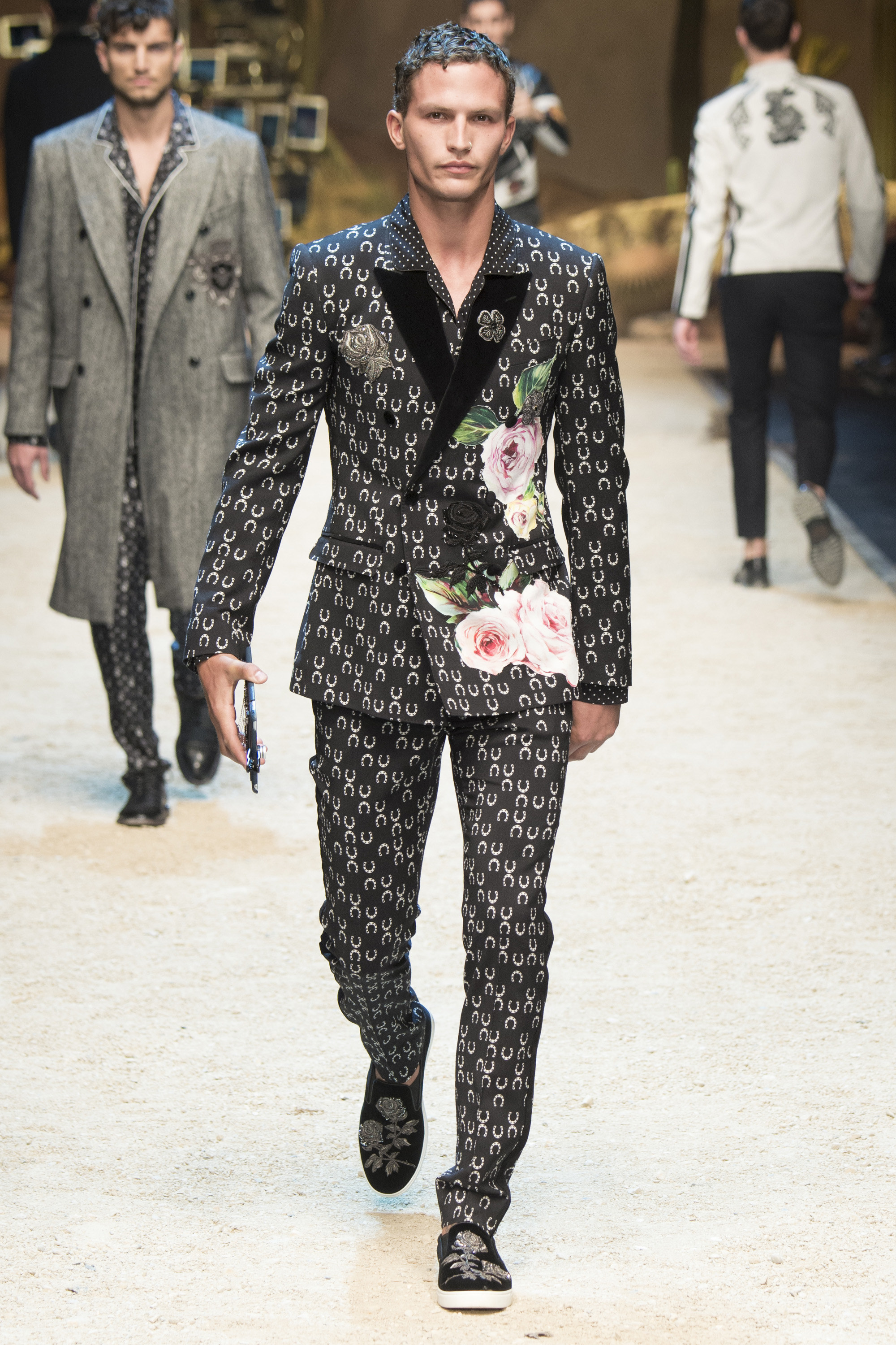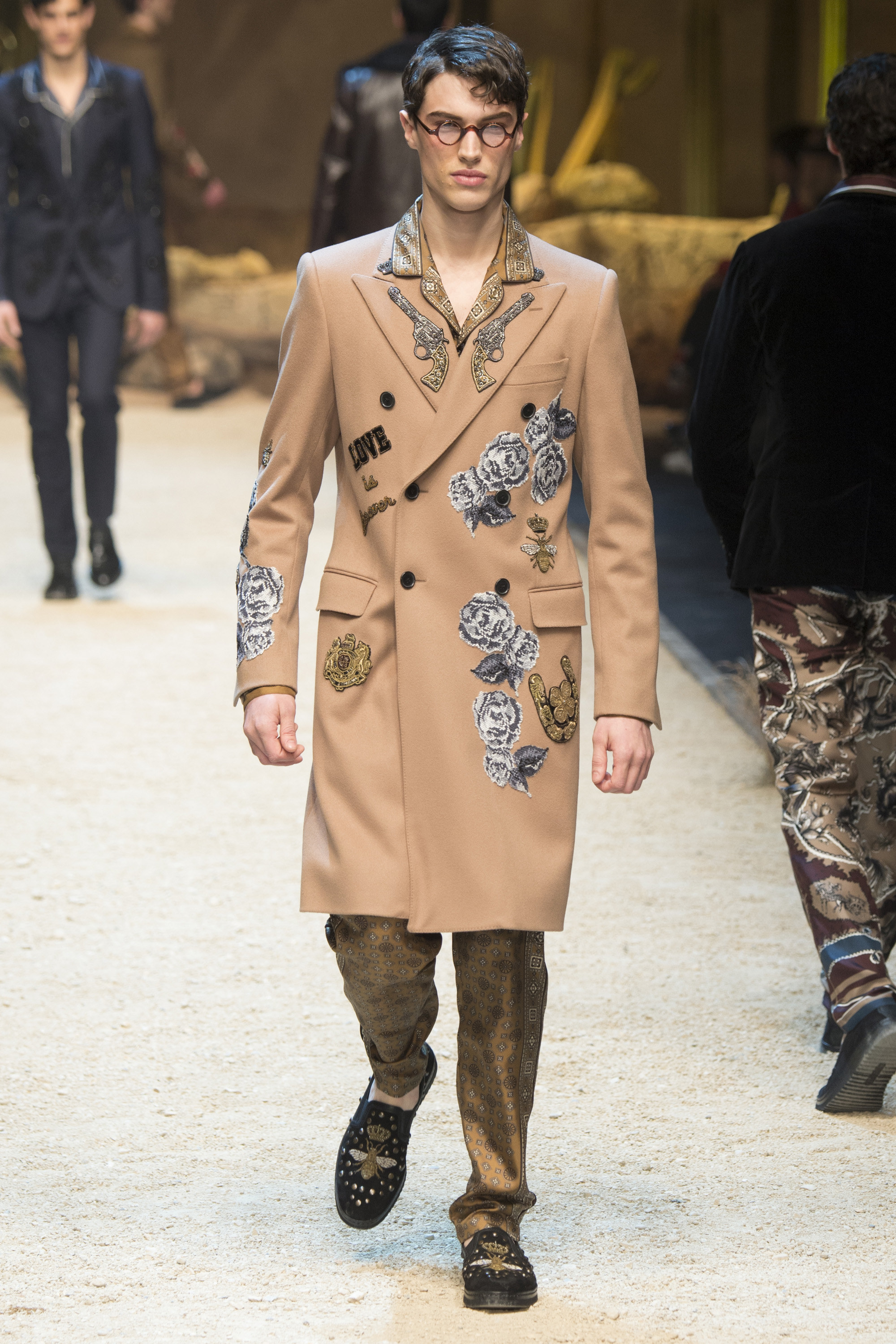Westernalia was not the only seasoning sprinkled over this collection. Embroideries heaped upon topcoats and trucker jackets—the denim section was one to linger over—included tapestried roses and putti. Buzzing anew was the little bee symbol on gold chains, patches, and pajamas. There were Westernized versions of the same faux-naif illustrations from the designers’ recent mamma-themed womenswear show—one, on a sweatshirt, depicted Domenico and Stefano—and even some meme-tastic illustrations of Zambia, Stefano’s cat. There was so much going on here—the models were using tablets to live-stream point-of-view runway video to the screens above us, too—that through the dust it all sometimes felt like a peyote-fueled menswear mirage. Pull it all apart, though, and what you have is some of the finest top-of-the-line tailoring and extrovert outerwear in the business—plus those D&G-pioneered pajamas (which are now becoming a category all their own).