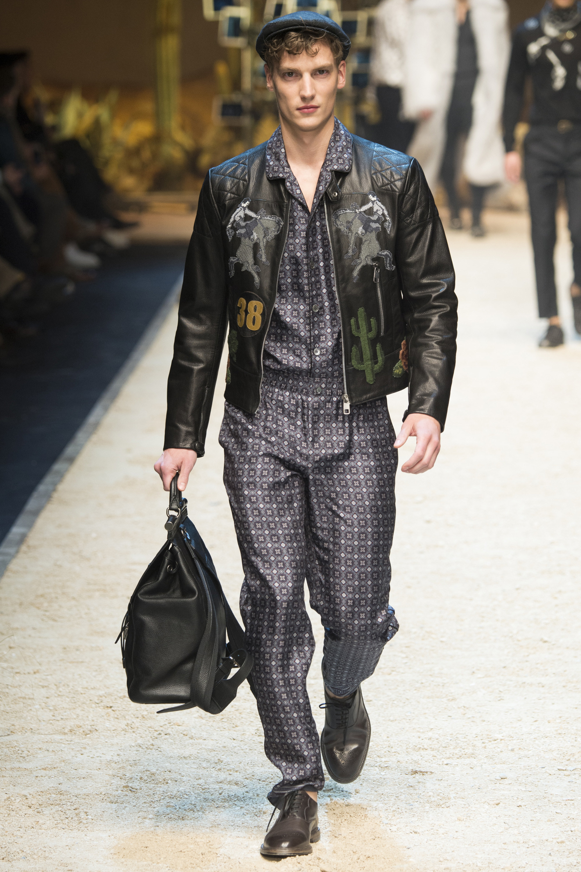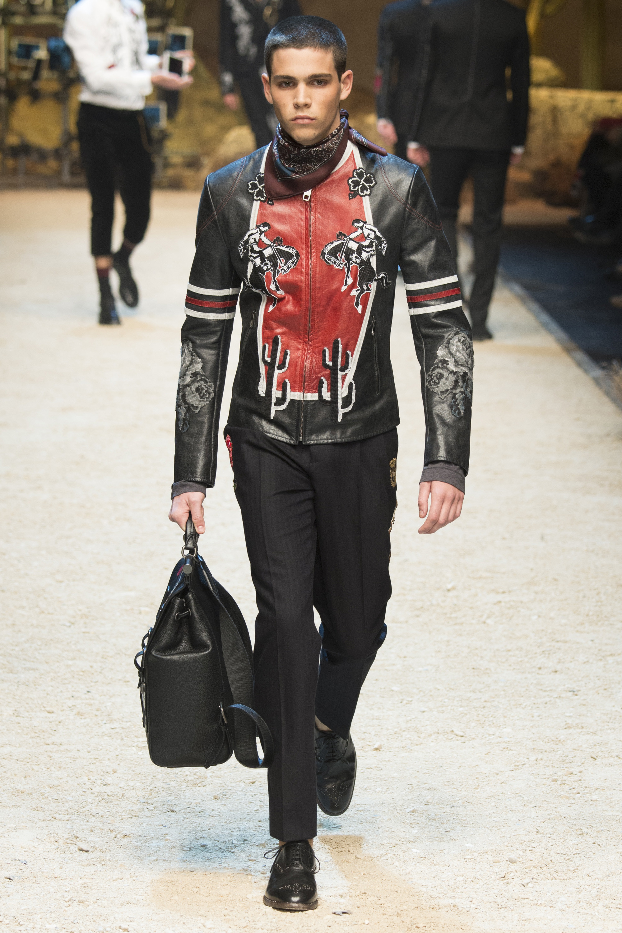 The midsummer landscape in Sicily so ripples with dust and heat that it resembles the epic, parched vistas of Sergio Leone’s spaghetti Westerns. This observation—made, Stefano Gabbana said, somewhere deep between Palermo and Catania—was the catalyst for a collection that today incorporated a whole gulch of Western motifs. But while six-shooters, cacti, wagons, cowboy hats, horsemen, and lassos were everywhere on the clothes, they were not in them. That mighty opening shearling poncho apart, there was none of the Wild West–literal—chaps and hats—that we saw the last time this house turned to the prairie, in the turn-of-the-century womenswear collection worn by Madonna in her “Don’t Tell Me” video.