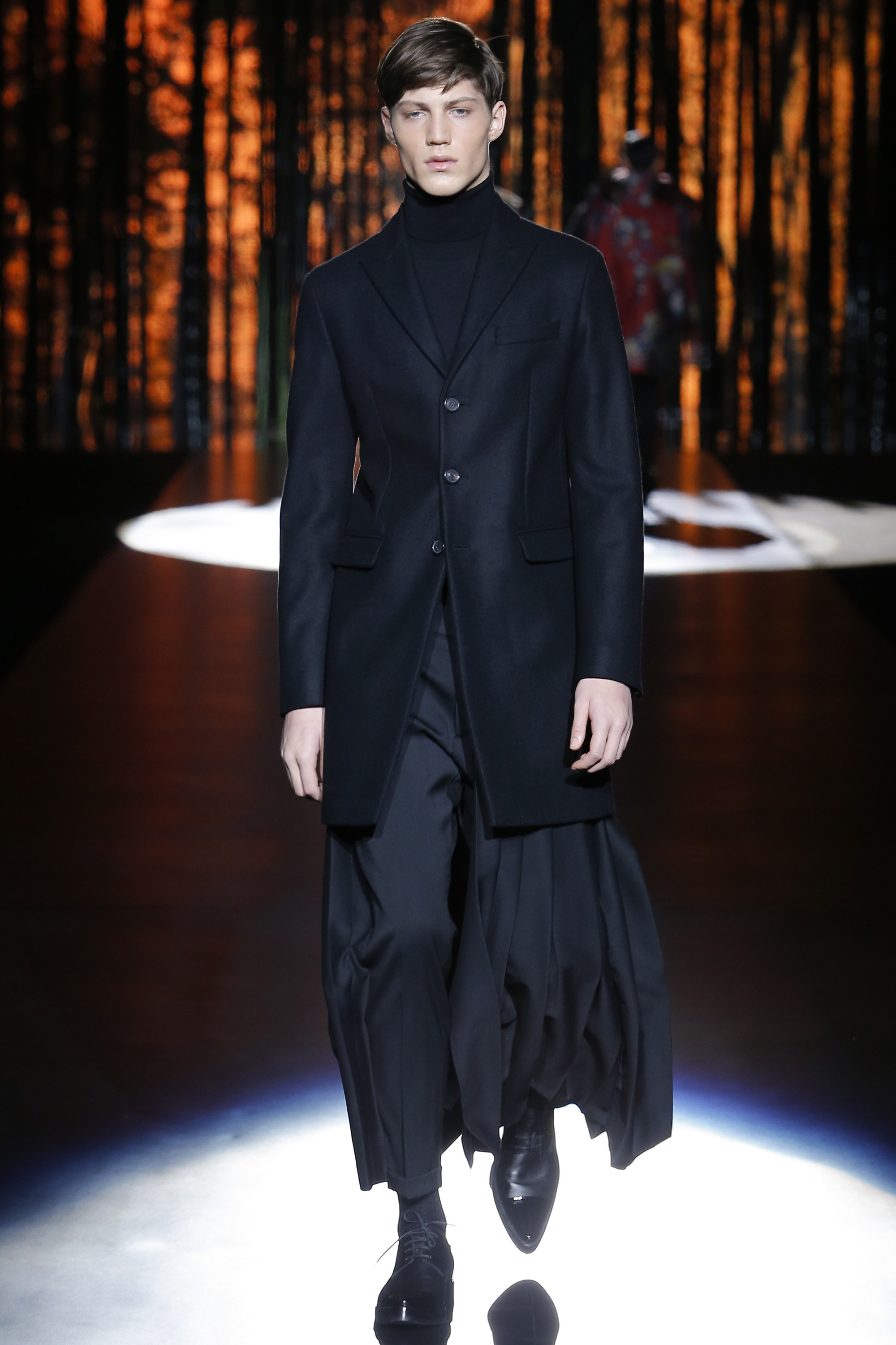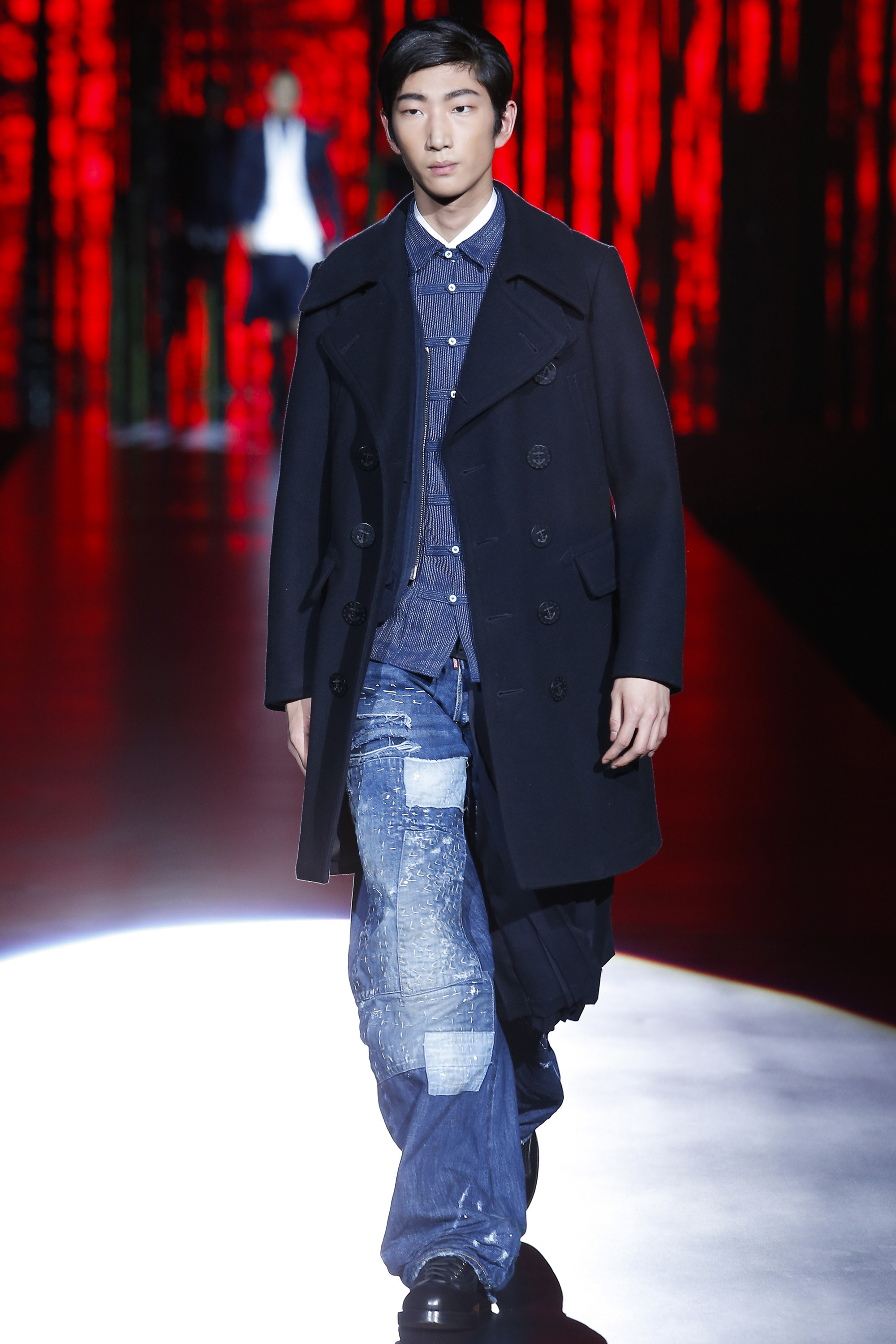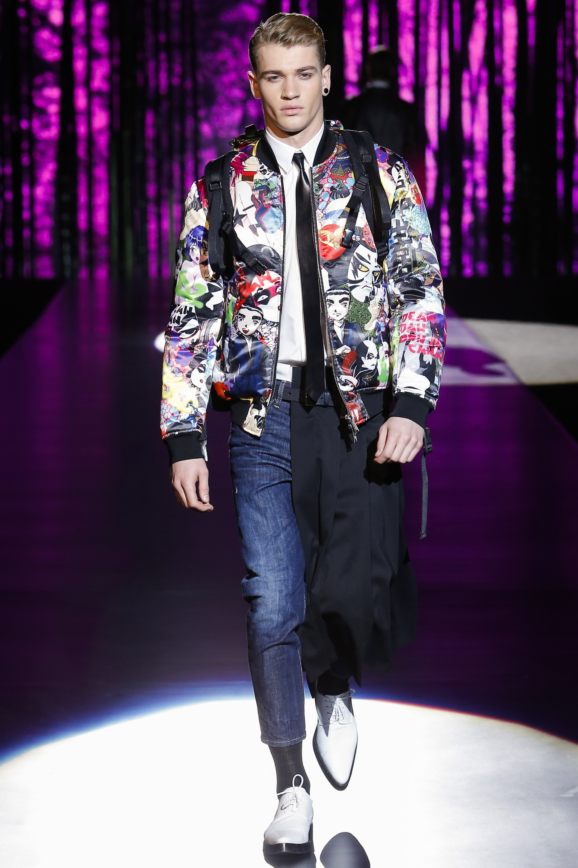 Where do the U.K. and Japan meet? “In a pleat,” rhymed Dean and Dan Caten, deadpan. “The samurai had these big skirts, with these big volumes; and then there’s the kilt and its pleated volume, and we’re matching the two worlds.” To the epic chorals of Akira, the models emerged through a bamboo forest in hybrid clothes that grafted bomber sleeves onto tailored torsos onto half-kilt-pleated skirts. To intensify the Japanese flavor, there were shortened judo jackets and pants under an embroidered topcoat. Queen’s “Another One Bites the Dust” played as panels of greenish tartan, a bit Black Watch, dropped into the mix. There were bombers and a suspender-crossed denim trucker patched with schlocky, poppy Asian graphics.