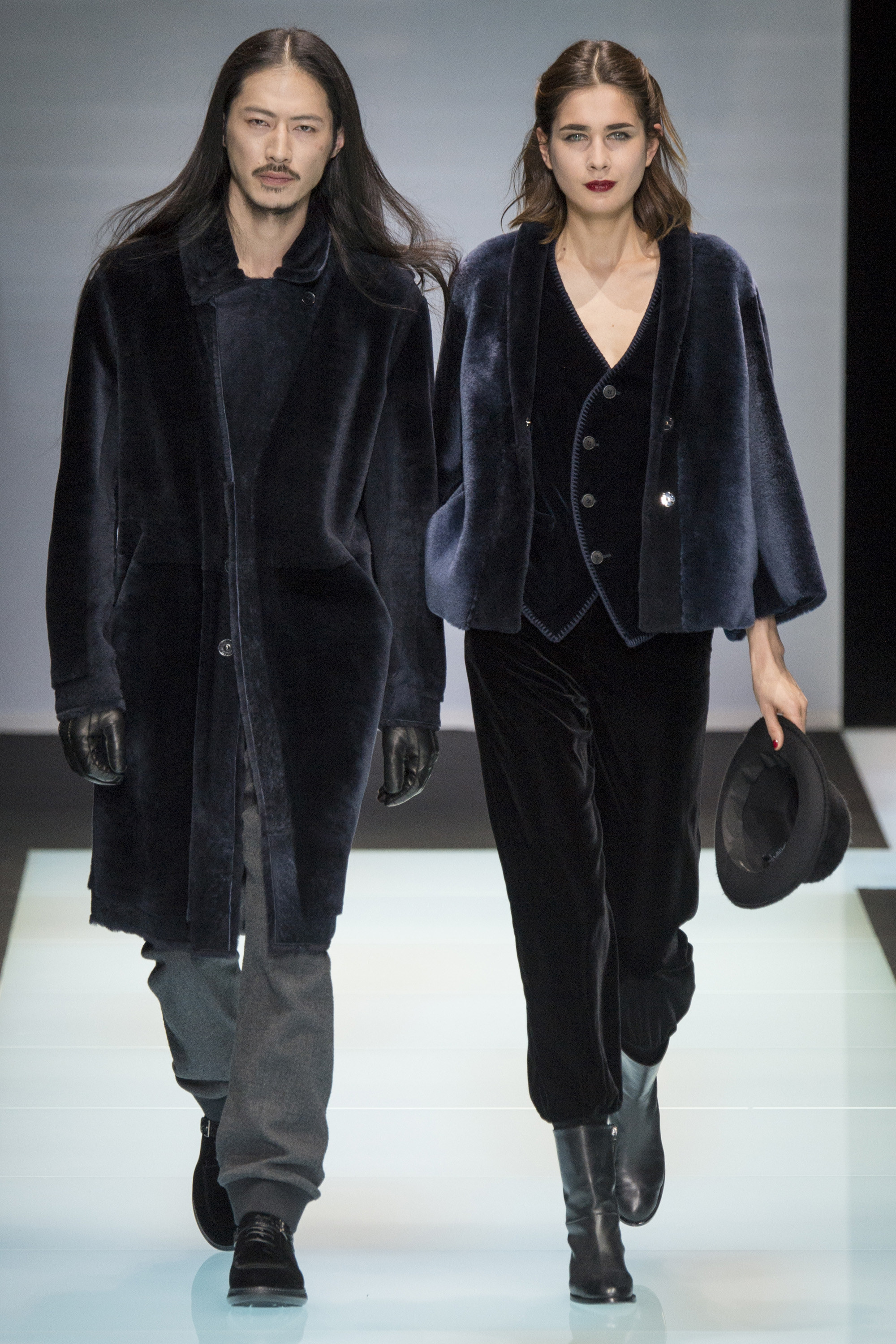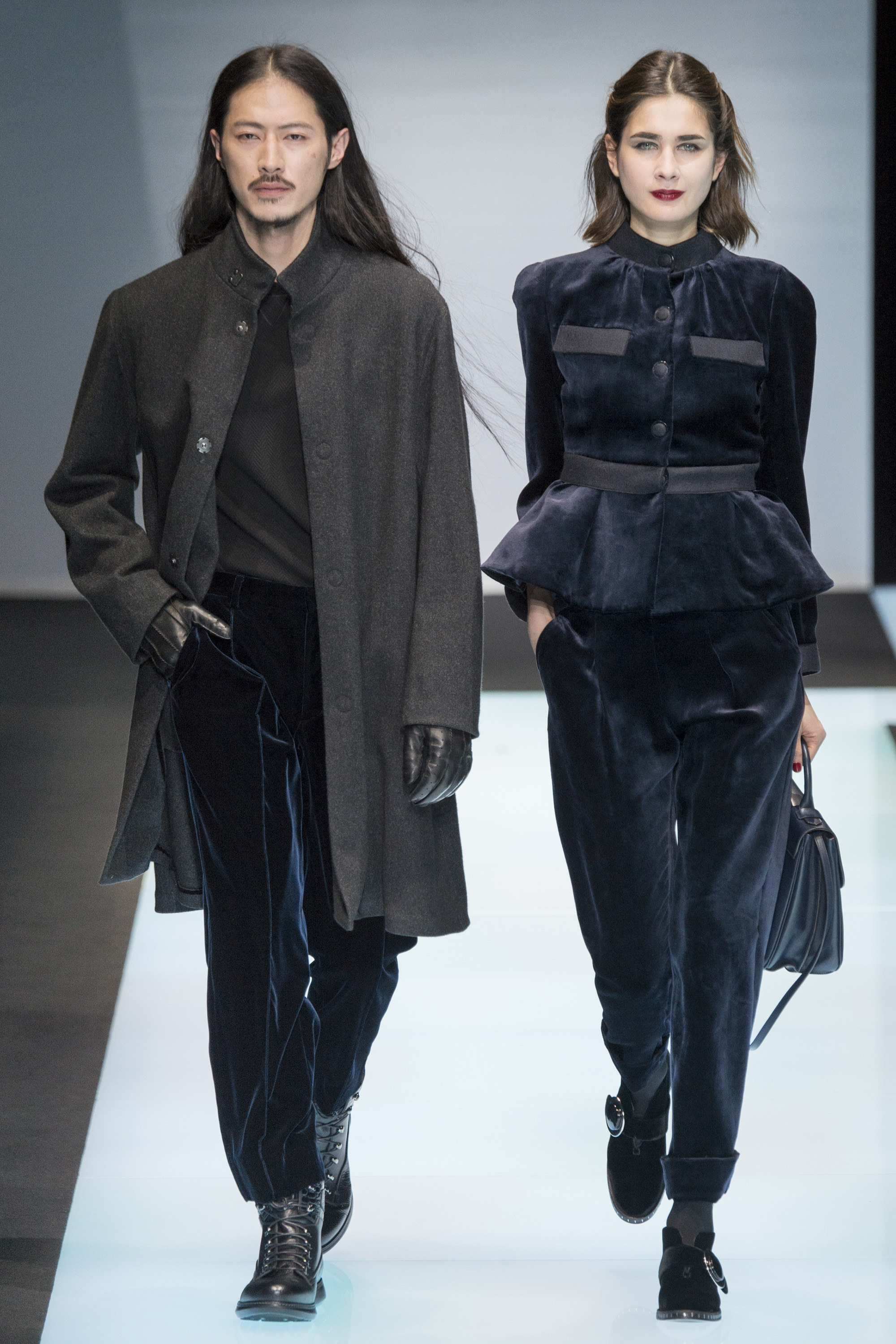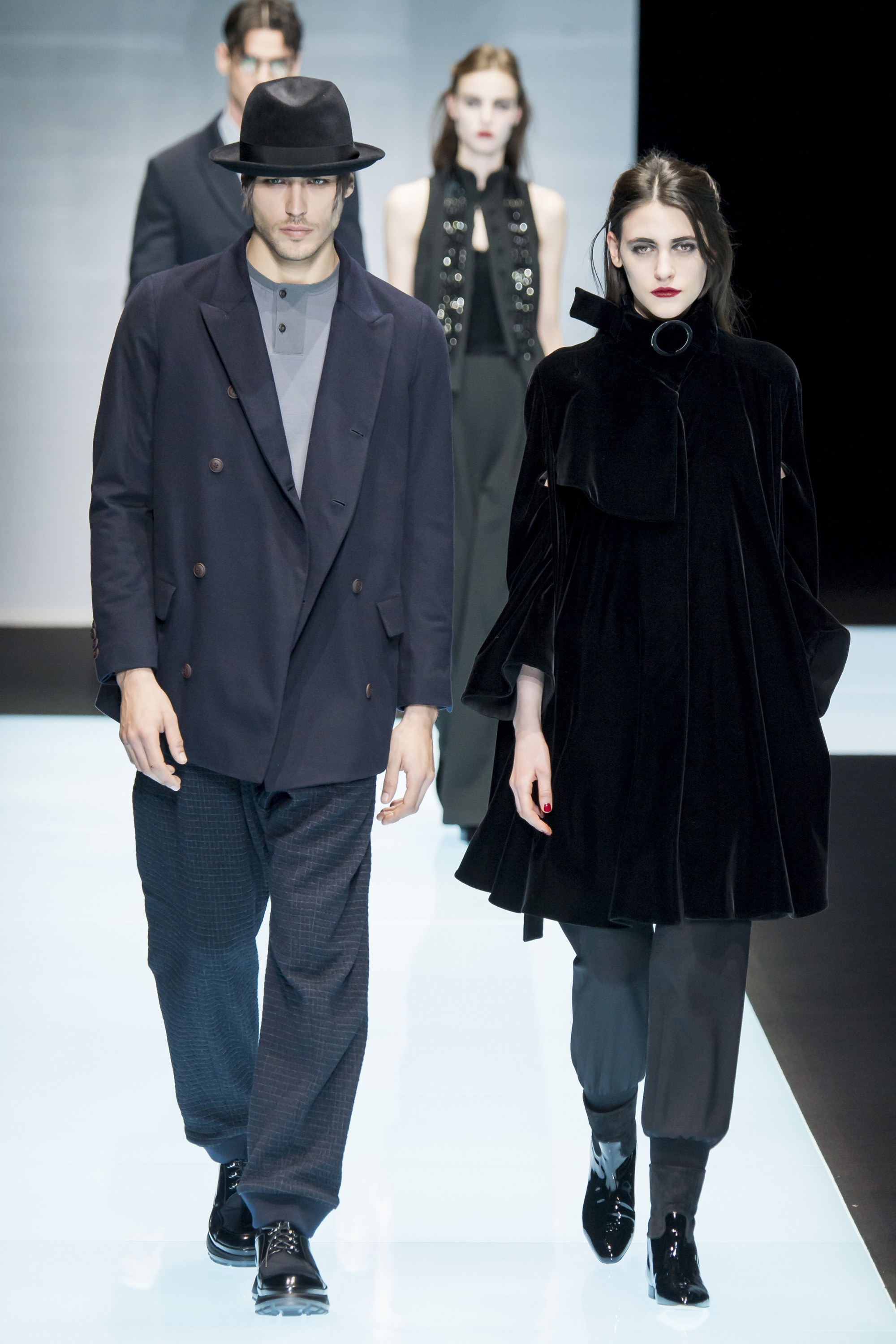 Time has little meaning for Signor Armani. As the Western world revolves around a Gregorian calendar, climates rising and falling, Armani operates on his own. He’s the rare designer with the power to do so; let’s call it the Giorg-orian calendar, which apparently moves at a much slower pace, standing outside of fashion. This show was once again an expression of Armani’s absolute singularity: He interspersed his male models with female, perfectly matching couples where, perhaps, velvet faced his lapels and was stroked in a thick lobe across a cocktail dress for her. It gave the impression of an Armani universe, one that runs parallel to our own, but entirely separate.