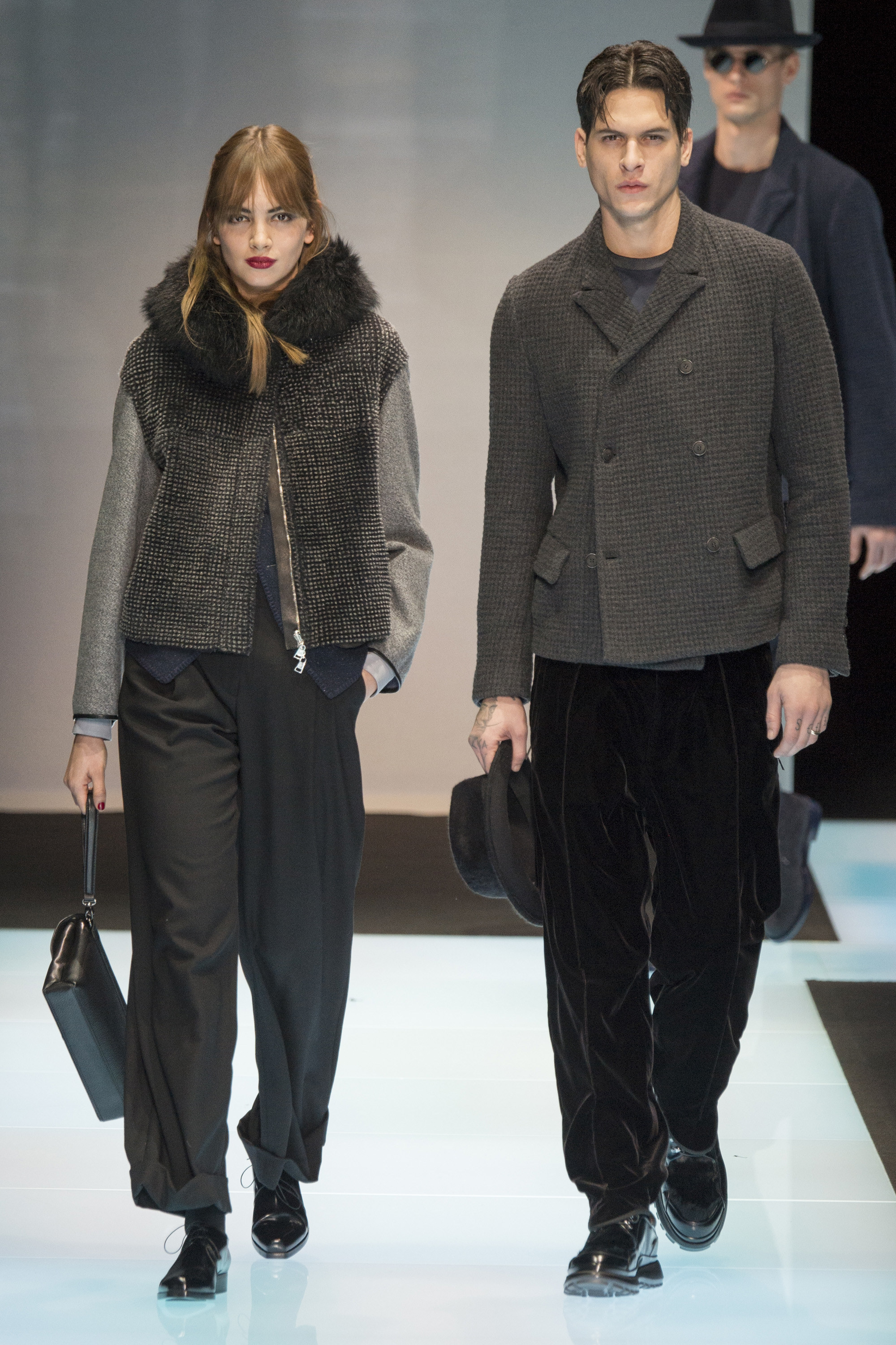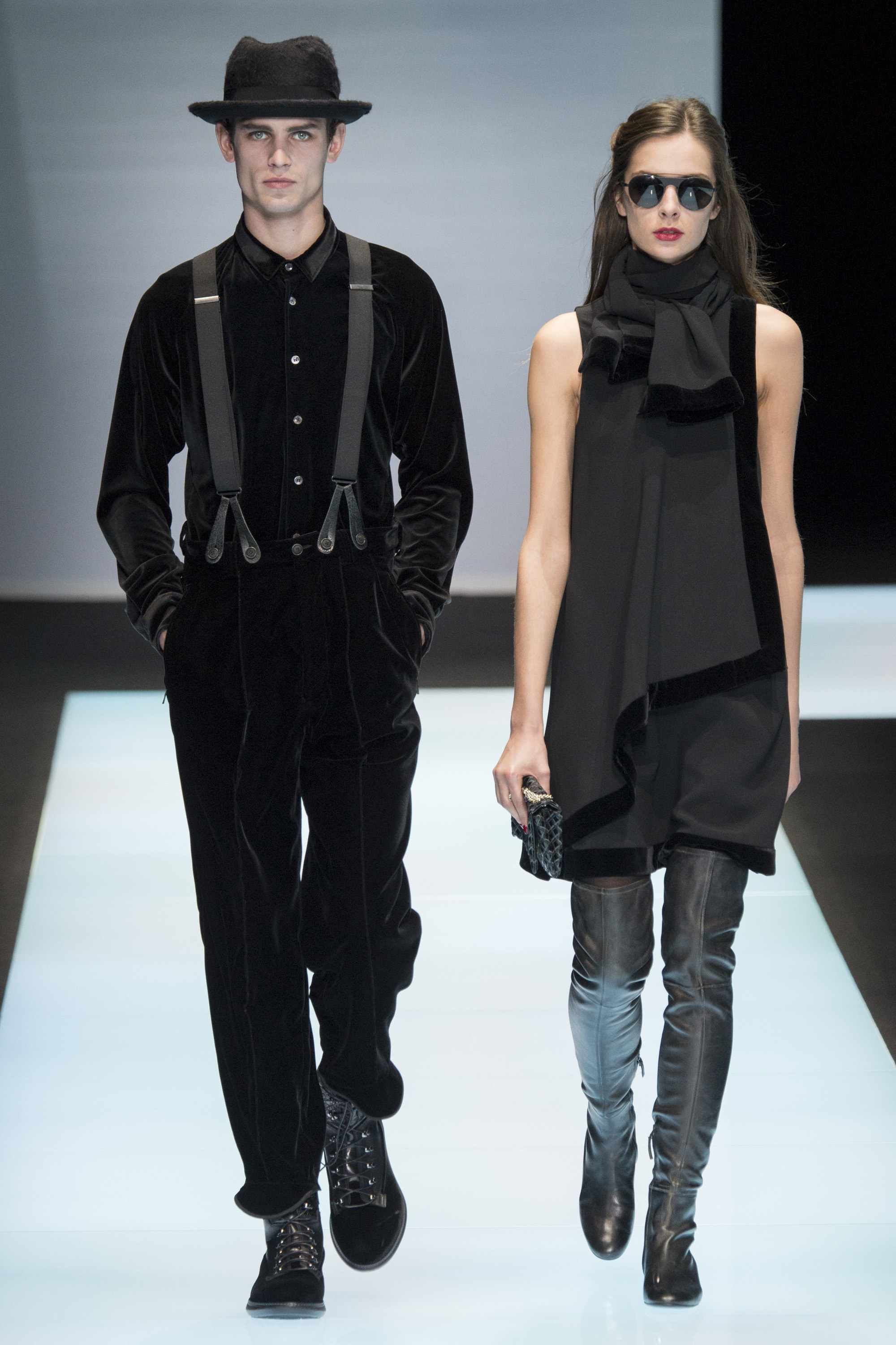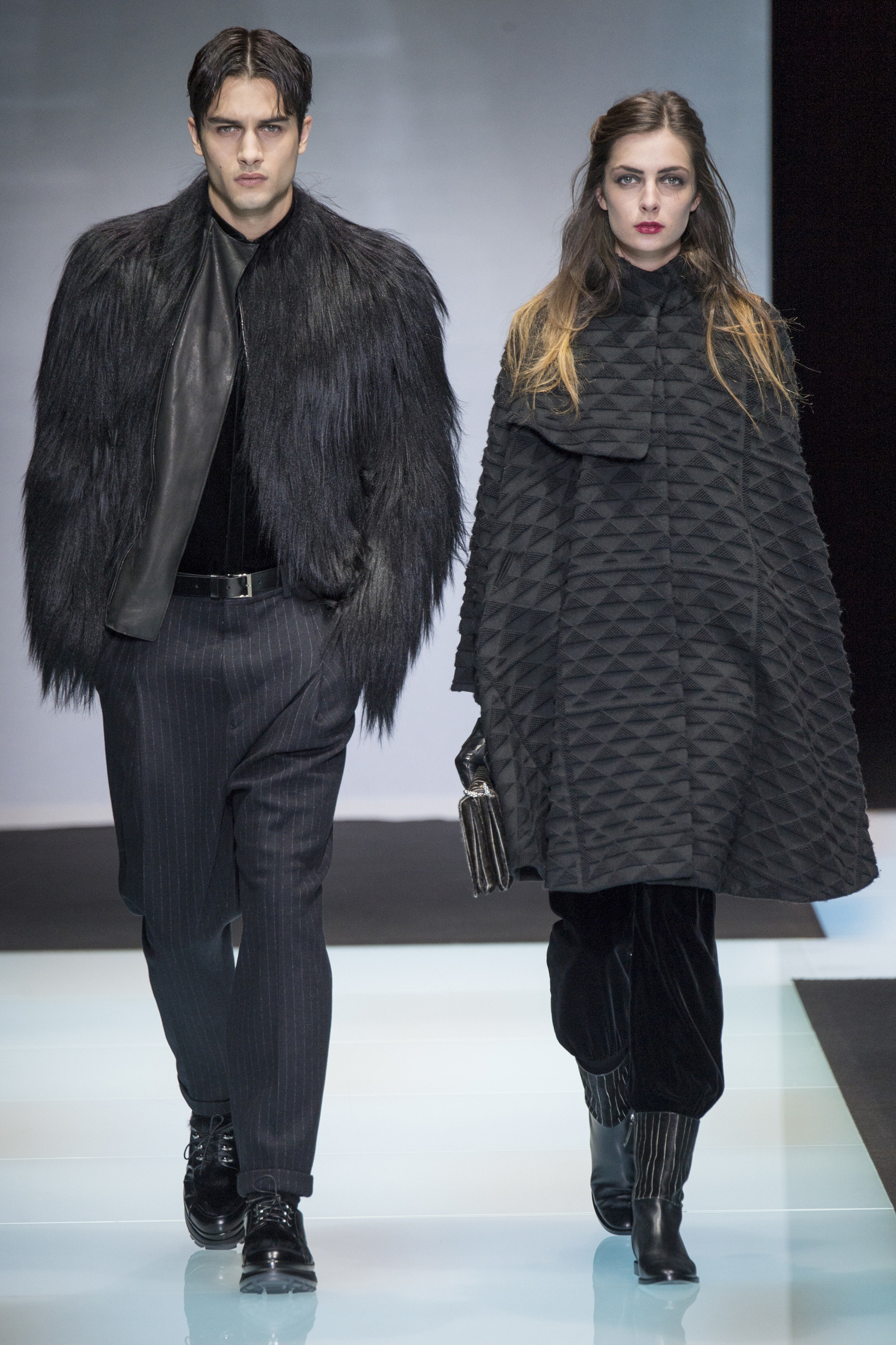 Time has little meaning for Signor Armani. As the Western world revolves around a Gregorian calendar, climates rising and falling, Armani operates on his own. He’s the rare designer with the power to do so; let’s call it the Giorg-orian calendar, which apparently moves at a much slower pace, standing outside of fashion. This show was once again an expression of Armani’s absolute singularity: He interspersed his male models with female, perfectly matching couples where, perhaps, velvet faced his lapels and was stroked in a thick lobe across a cocktail dress for her. It gave the impression of an Armani universe, one that runs parallel to our own, but entirely separate.