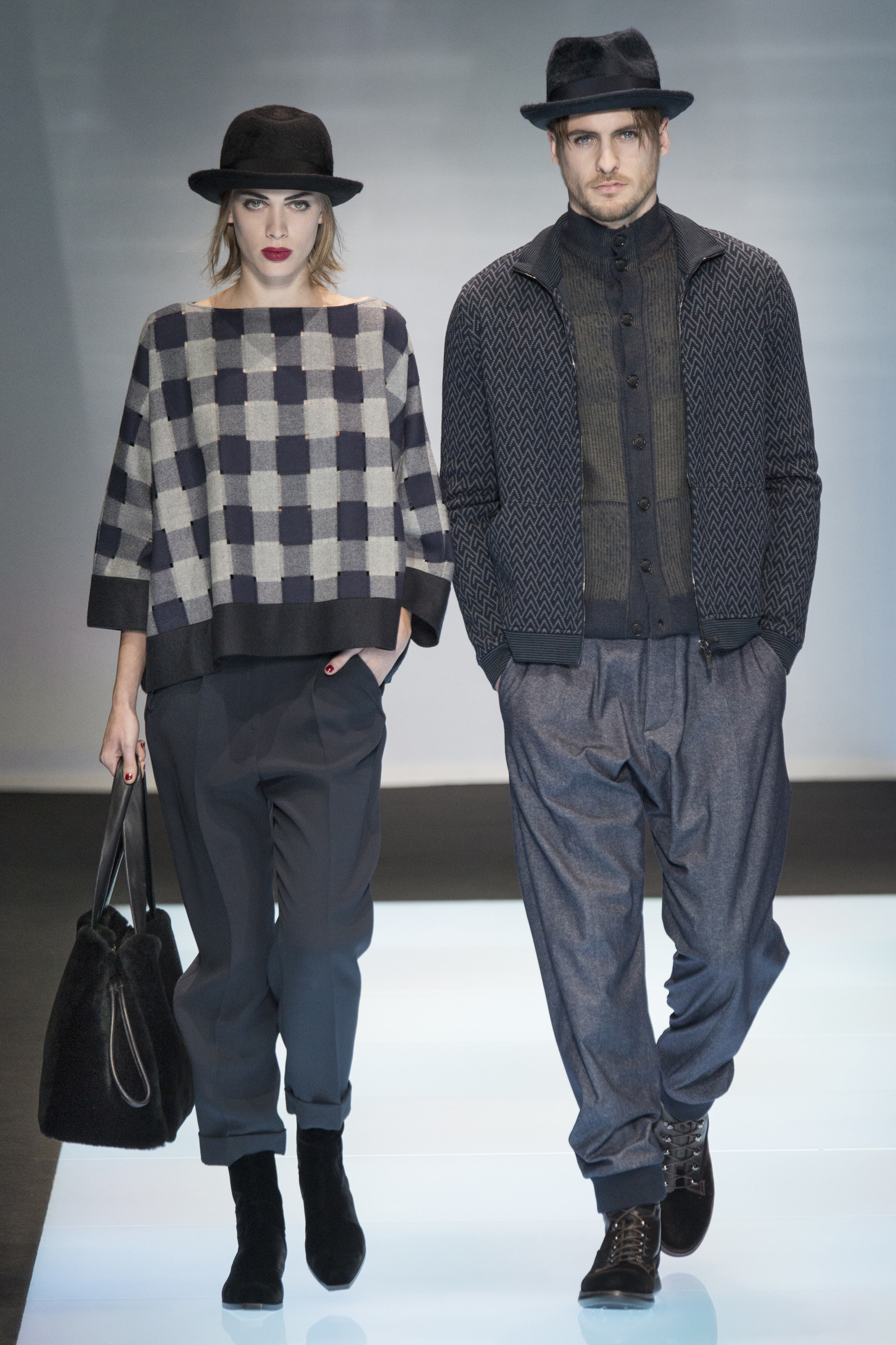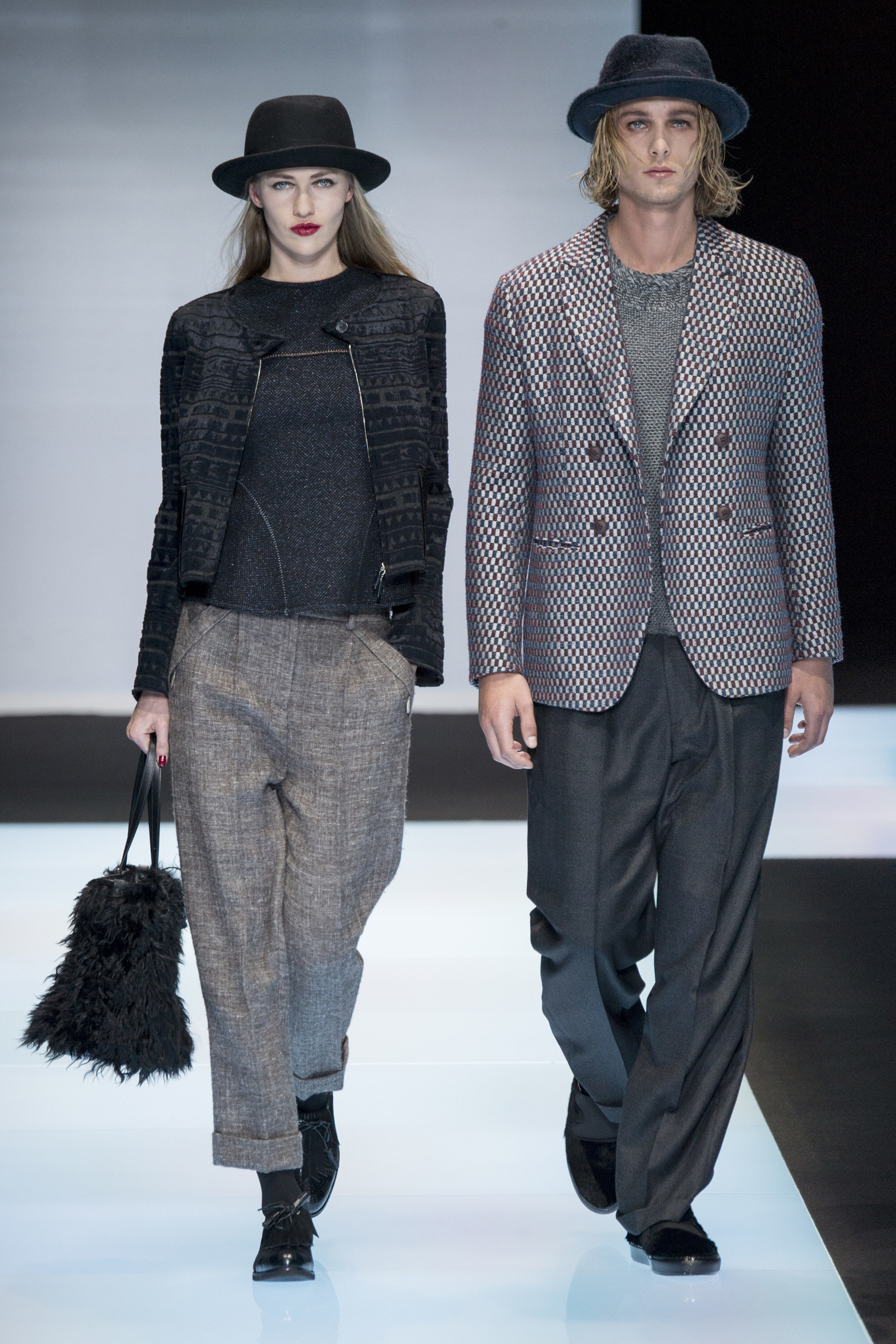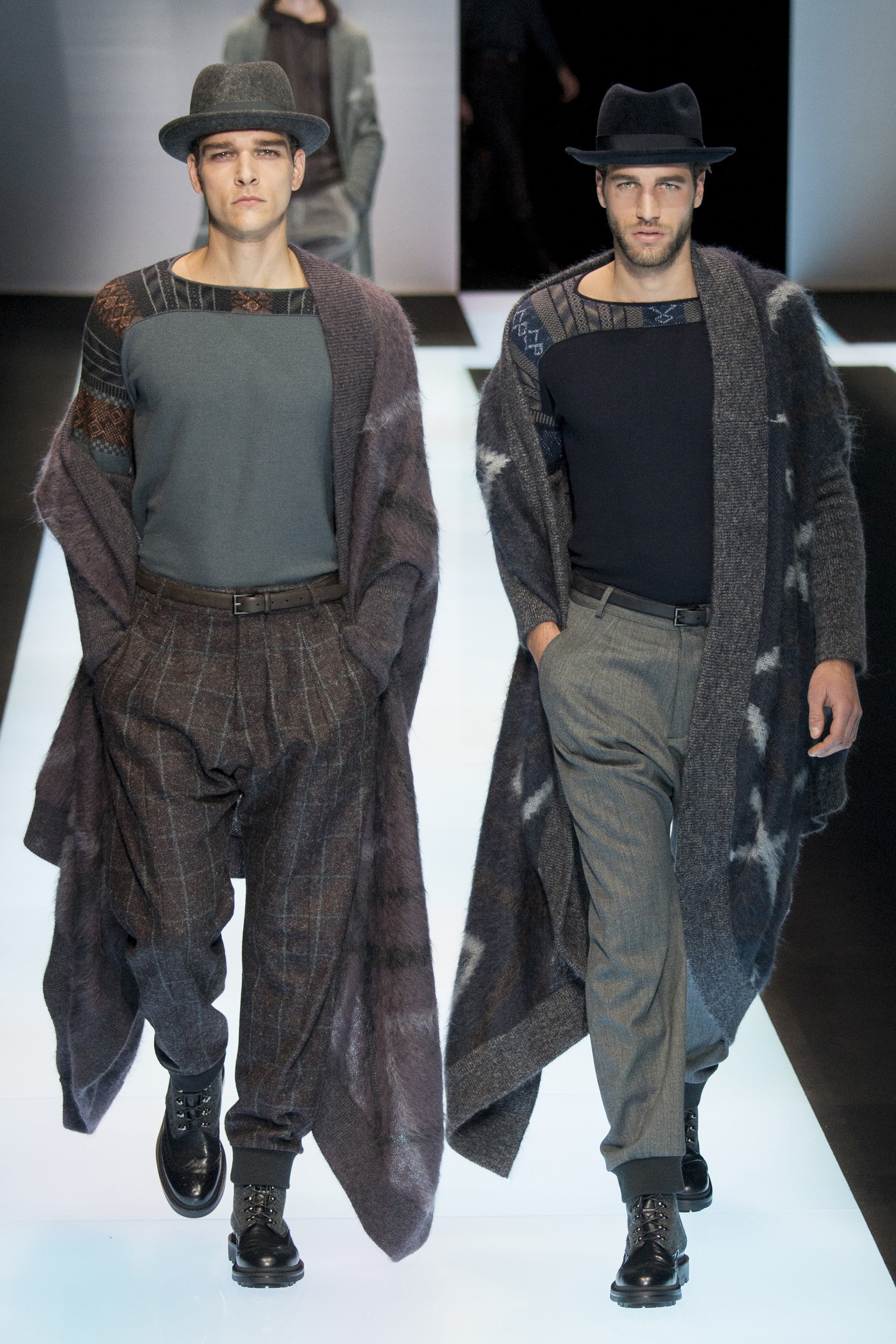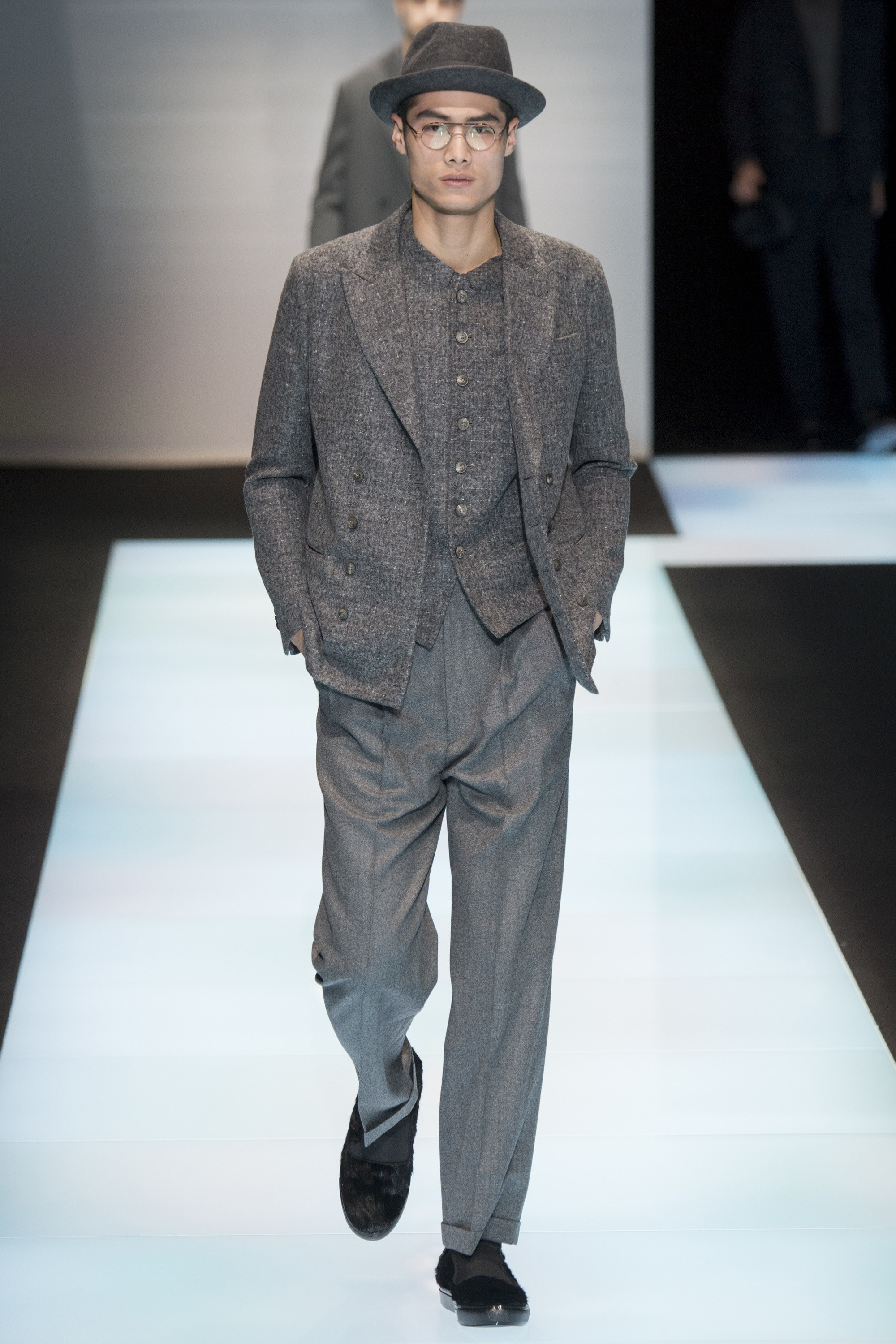 Of course, the clothes weren’t from a different planet. They were Armani classics, ideas that have gestated long and transformed slowly over time. So the cashmere, vicuña, and alpaca Armani showed today, seemingly similar to those from 20 years ago, revealed infinitesimal variations, subtly indicating the passage of the seasons other designers adhere to so rigidly. They were cut wider, shorter in the body, frequently double-breasted, and subjected to washing processes that broke down the surface of the fabrics, softening the whole. Another expression of time.