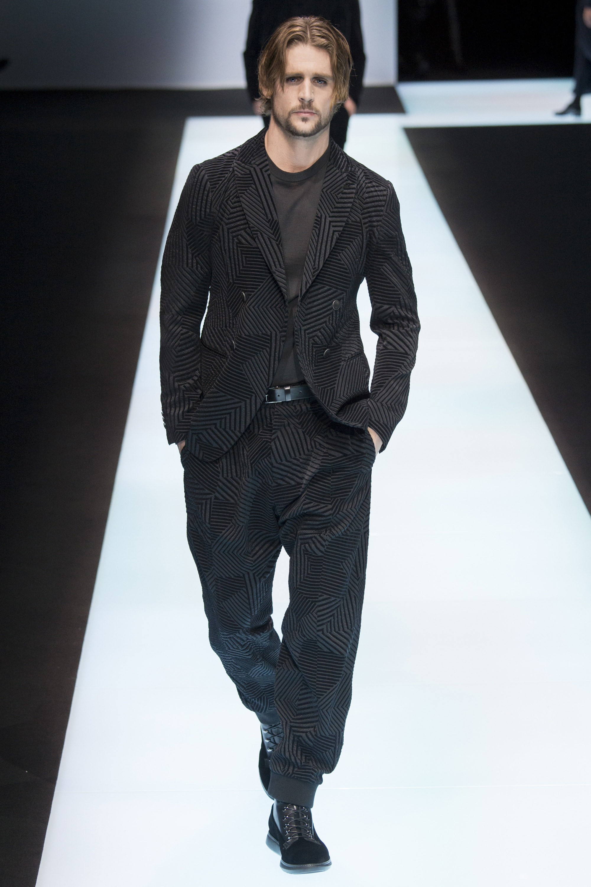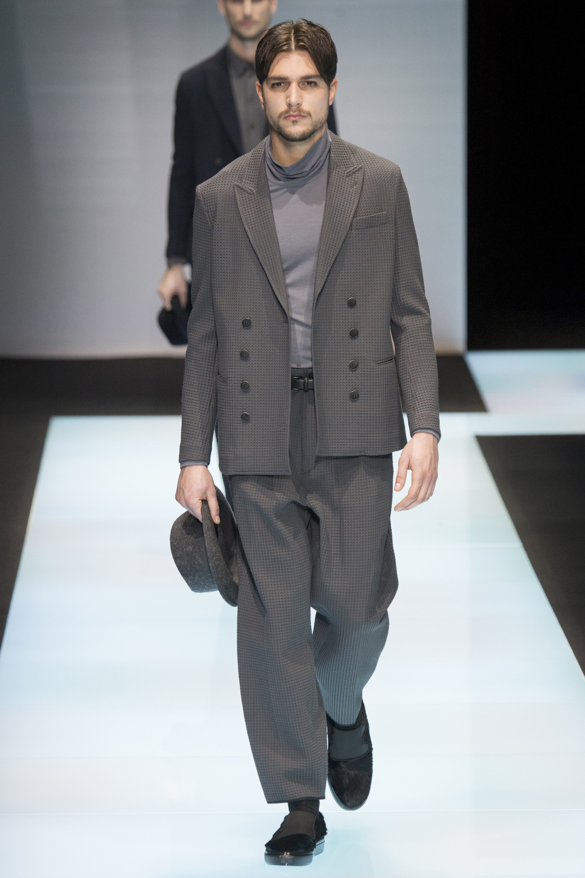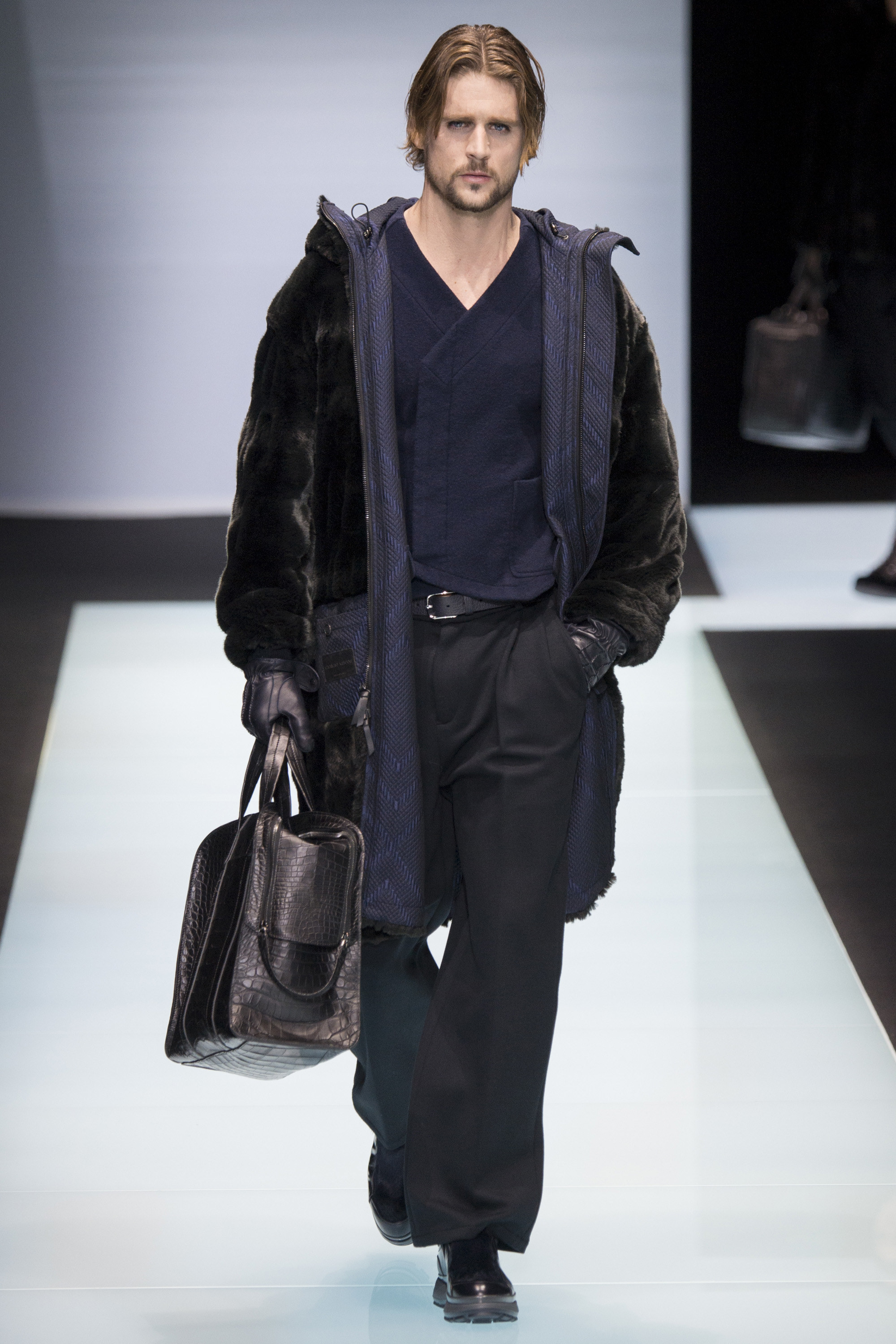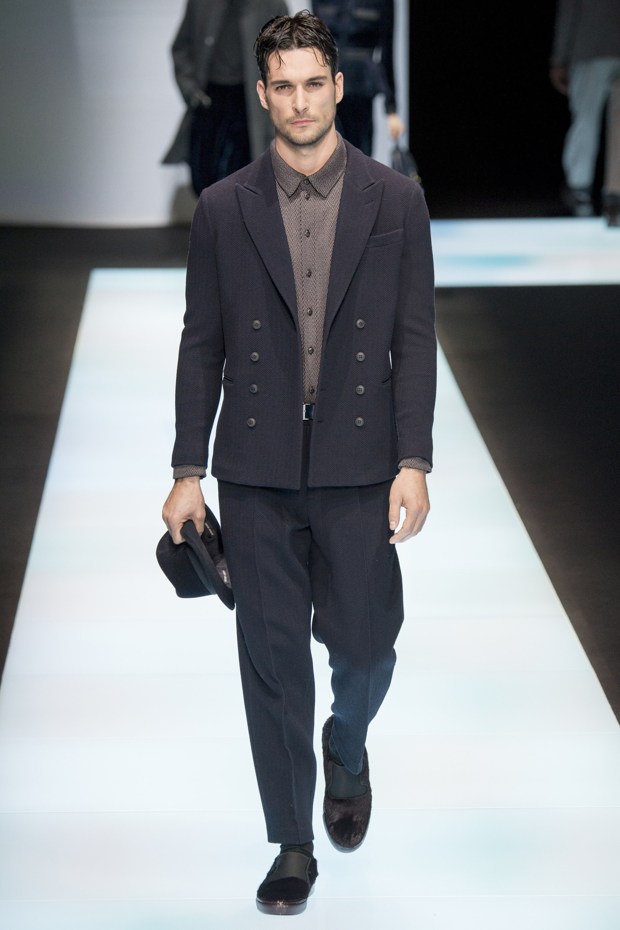 Is Armani interested in time? In 2015 he celebrated 40 years in the business, the year after his 80th birthday. As other designers discuss the reworking of historical styles to create modern garments, Armani essentially rediscovers his own history, season after season, refining his classics, creating the future from his own past. Armani stated that this collection, interspersed with motifs culled from northern Africa and the Mediterranean, and inspired by imagery of William S. Burroughs in a crumpled suit somewhere in Tangier, was about a journey. A voyage into Armani—a slow trek, a midnight (blue) train to Giorgio.