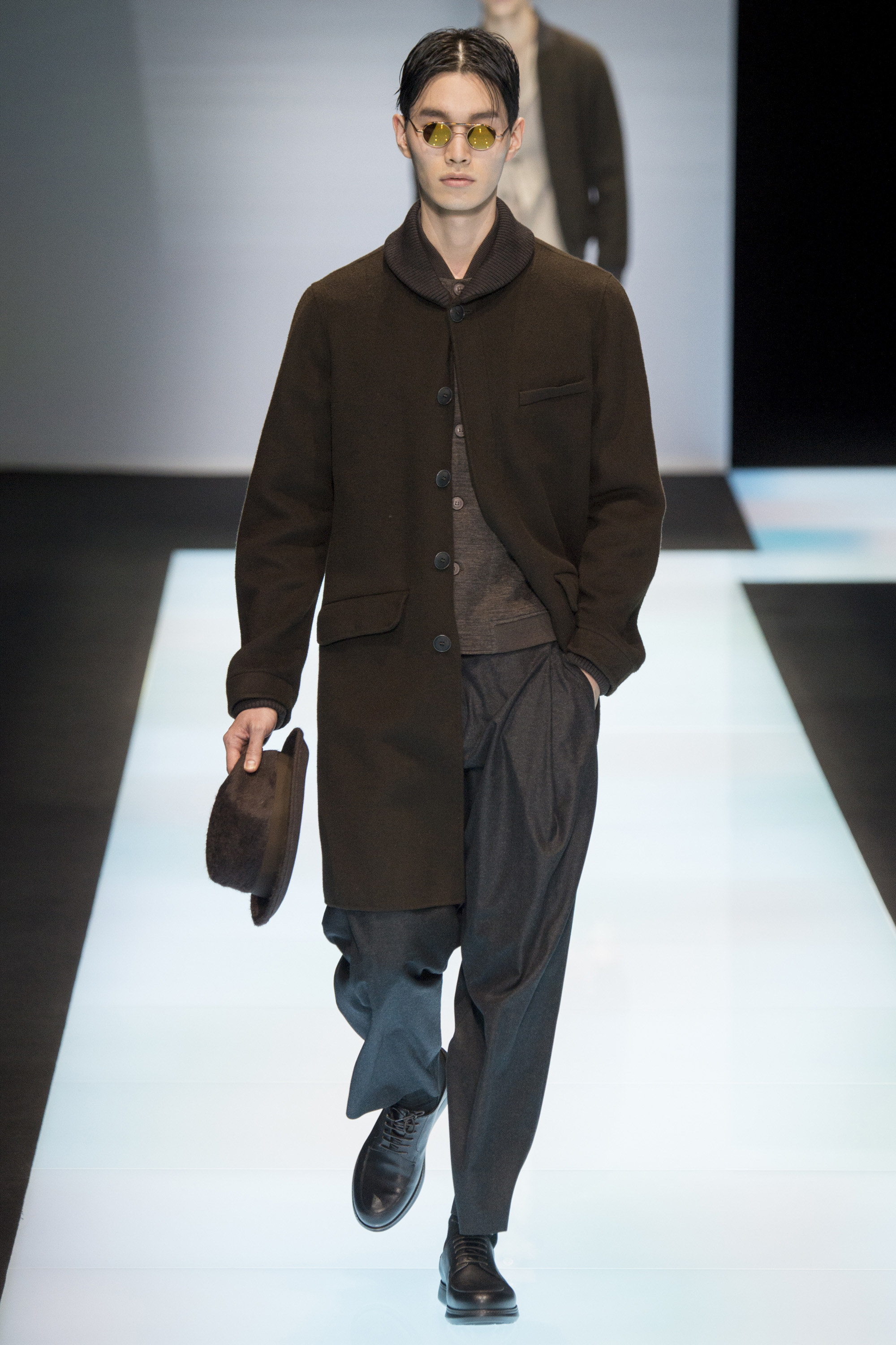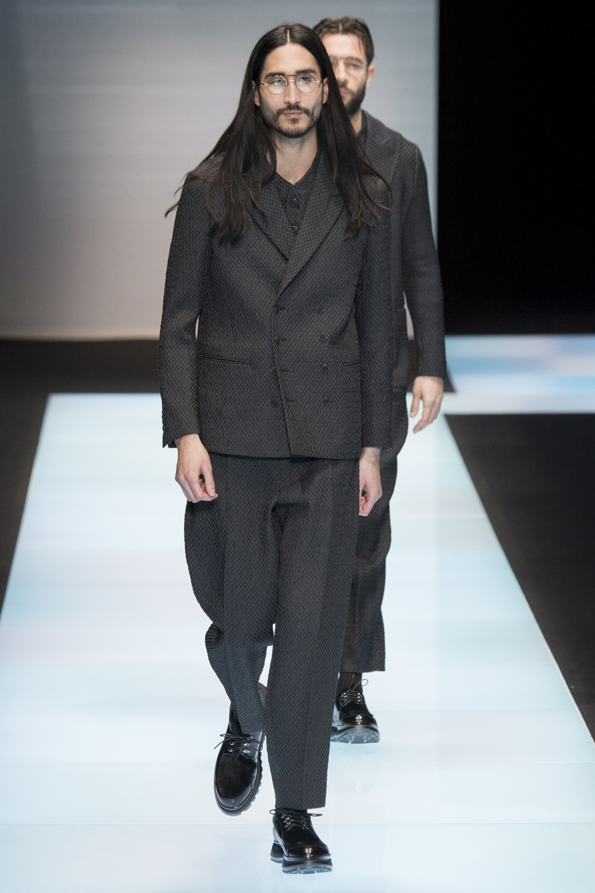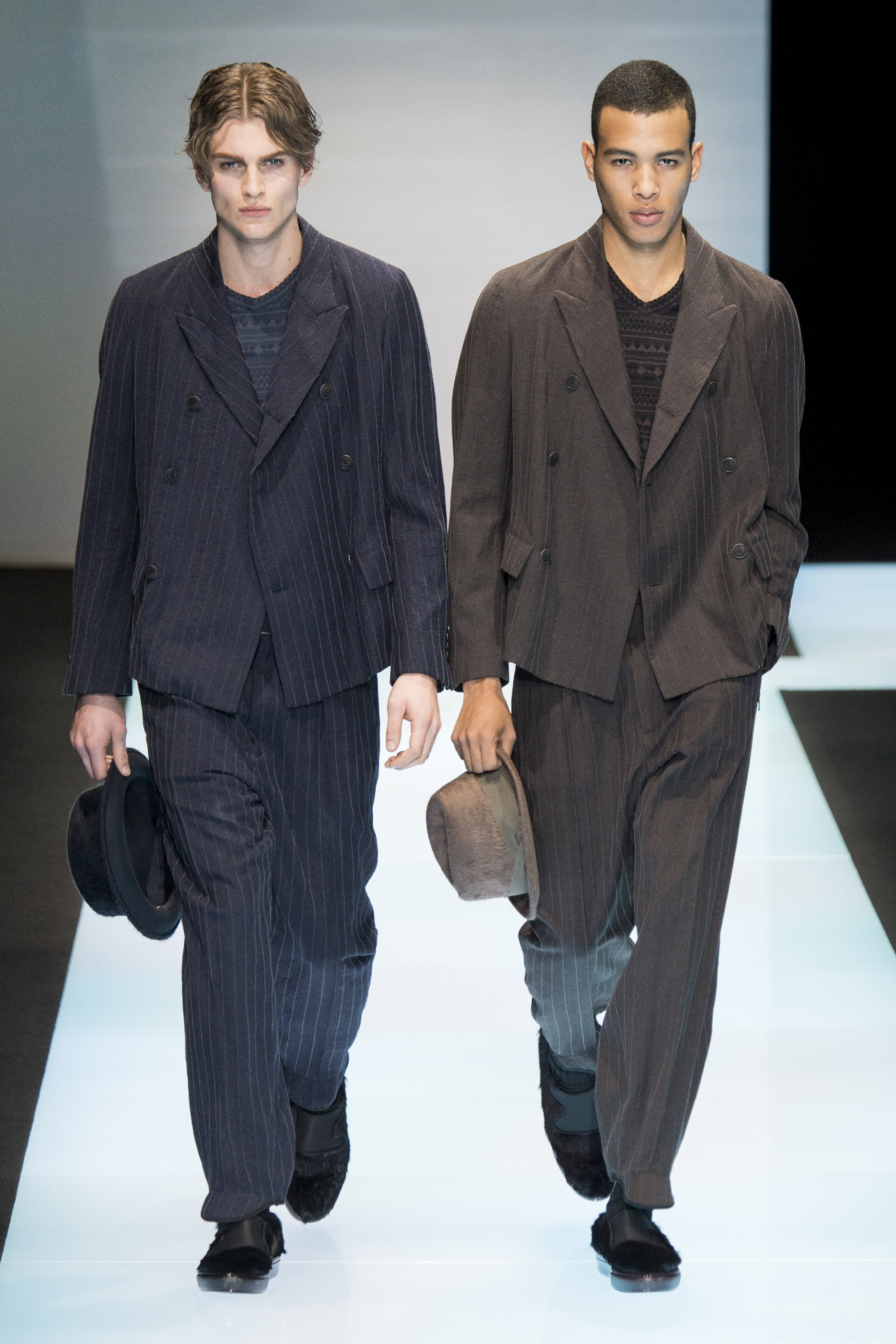 Is Armani interested in time? In 2015 he celebrated 40 years in the business, the year after his 80th birthday. As other designers discuss the reworking of historical styles to create modern garments, Armani essentially rediscovers his own history, season after season, refining his classics, creating the future from his own past. Armani stated that this collection, interspersed with motifs culled from northern Africa and the Mediterranean, and inspired by imagery of William S. Burroughs in a crumpled suit somewhere in Tangier, was about a journey. A voyage into Armani—a slow trek, a midnight (blue) train to Giorgio.