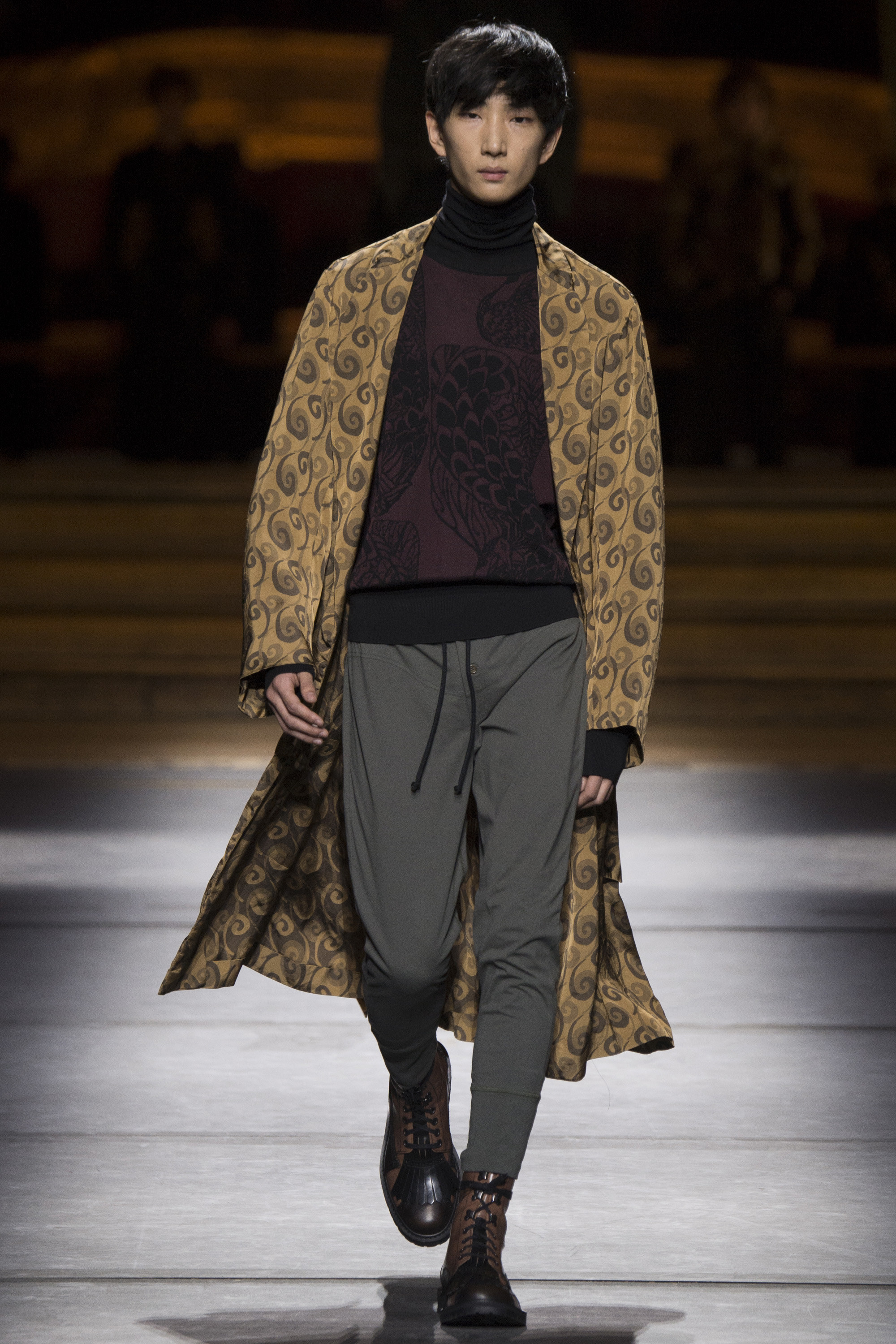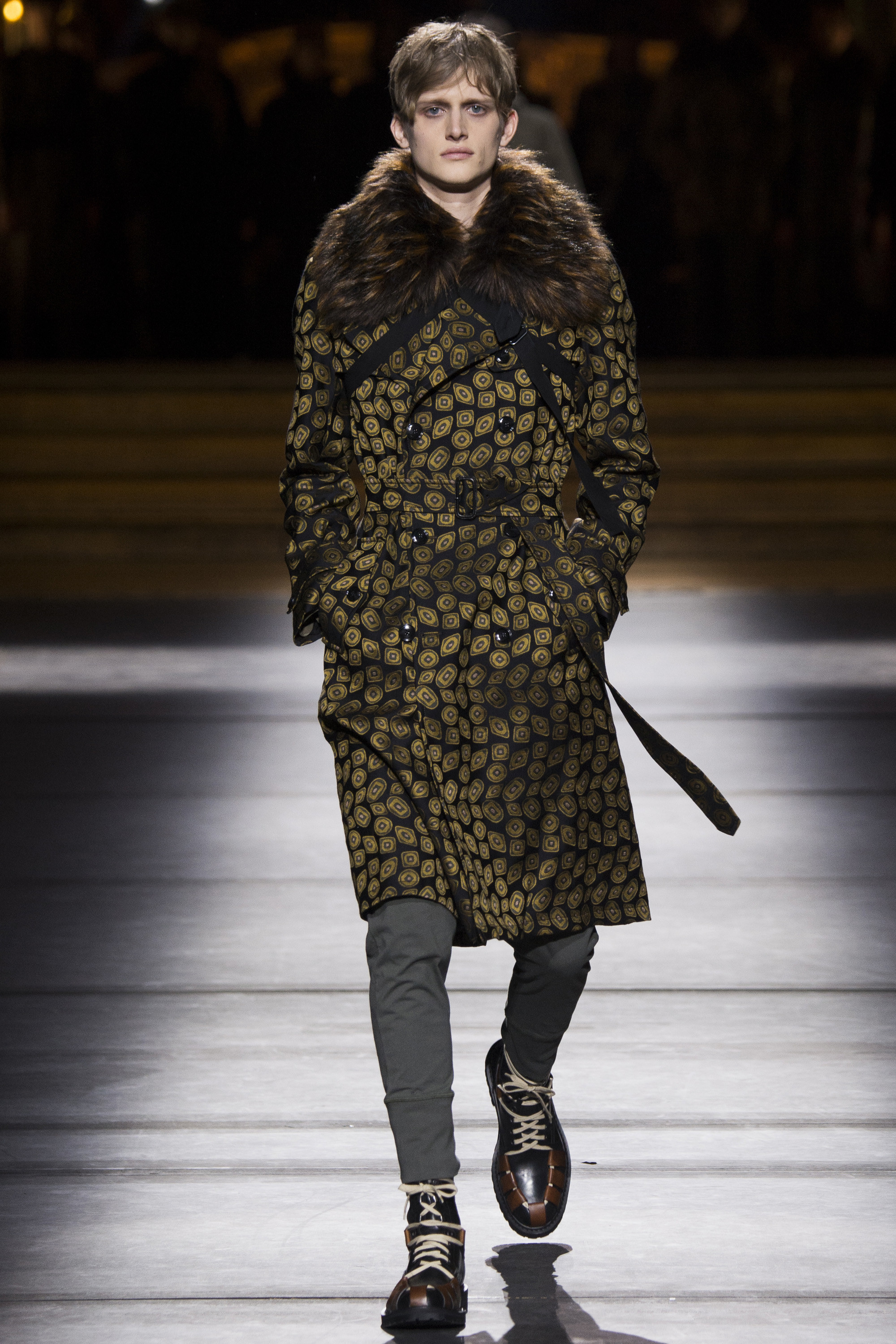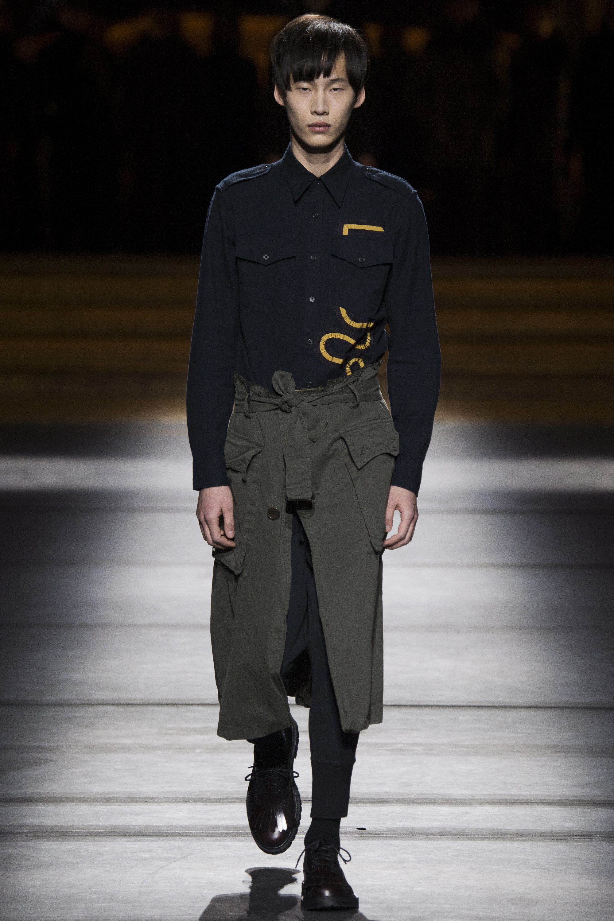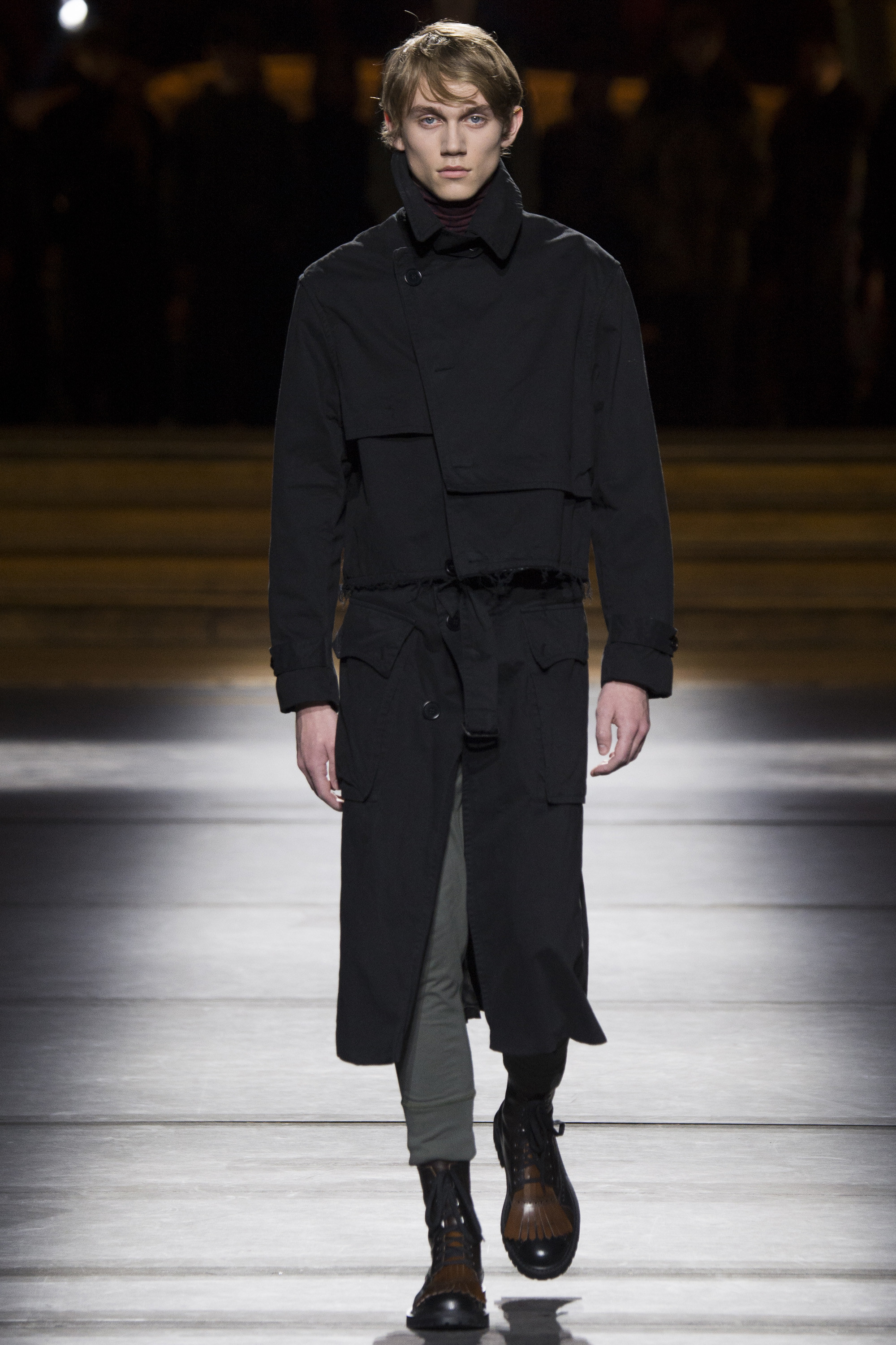 Van Noten made it clear from the start that his new model army was in no combative mood, but rather comprised of suave and placid fellas, lovingly referred to as “peaceniks” by the designer. They marched in crinkled trenchcoats with maxipockets and deconstructed military parkas that were sliced at the waist, their bottom parts reappearing as wraps over skinny track pants.