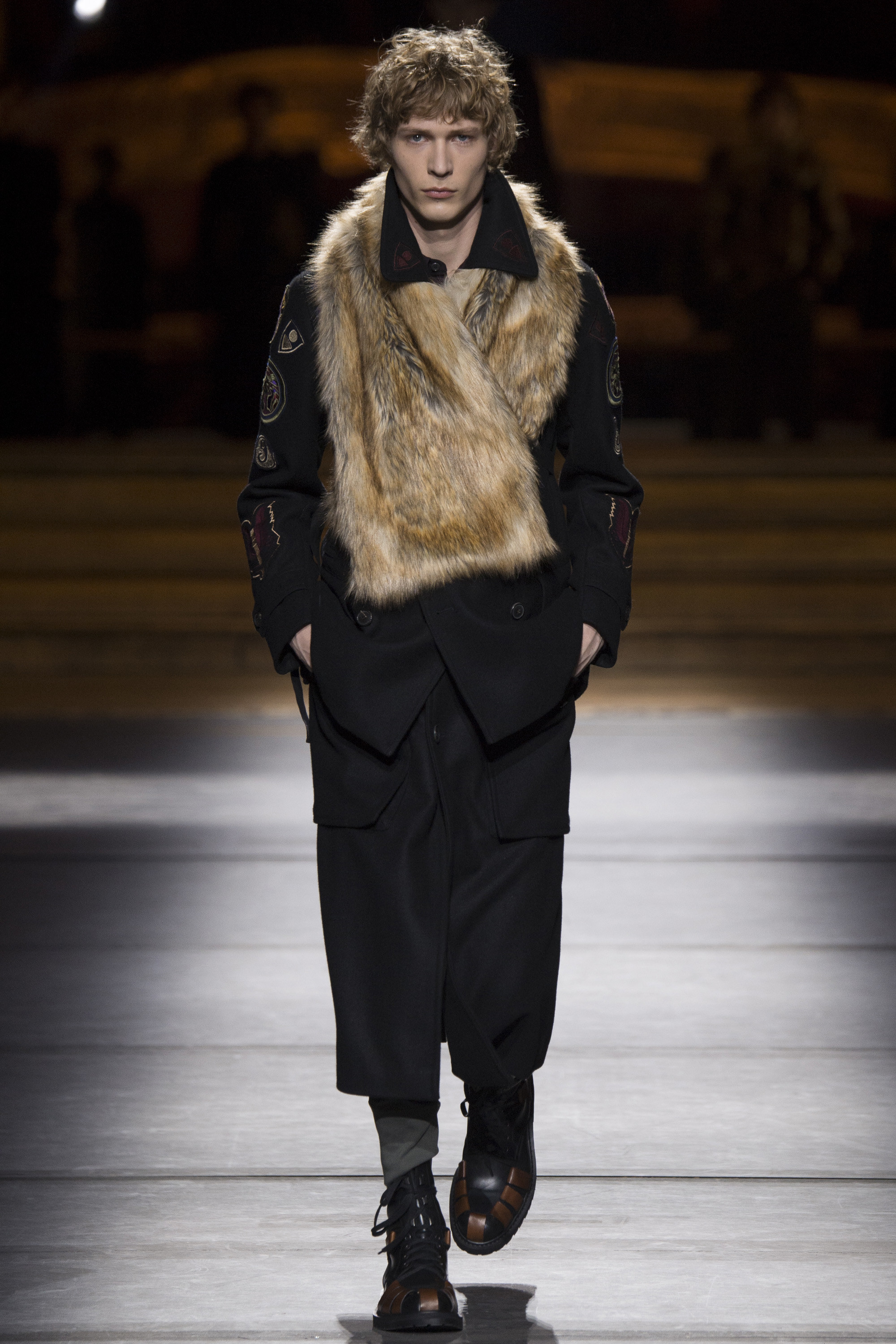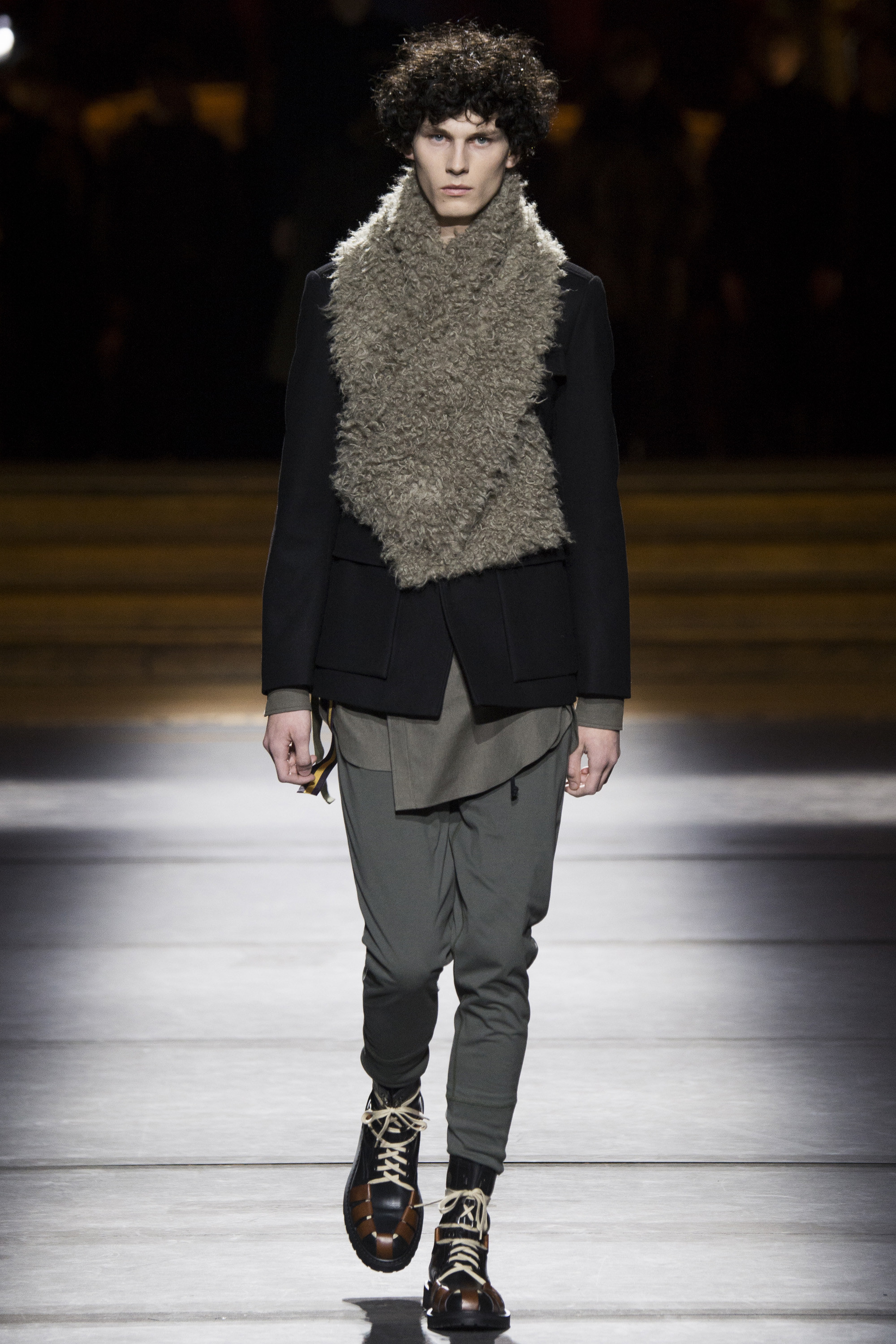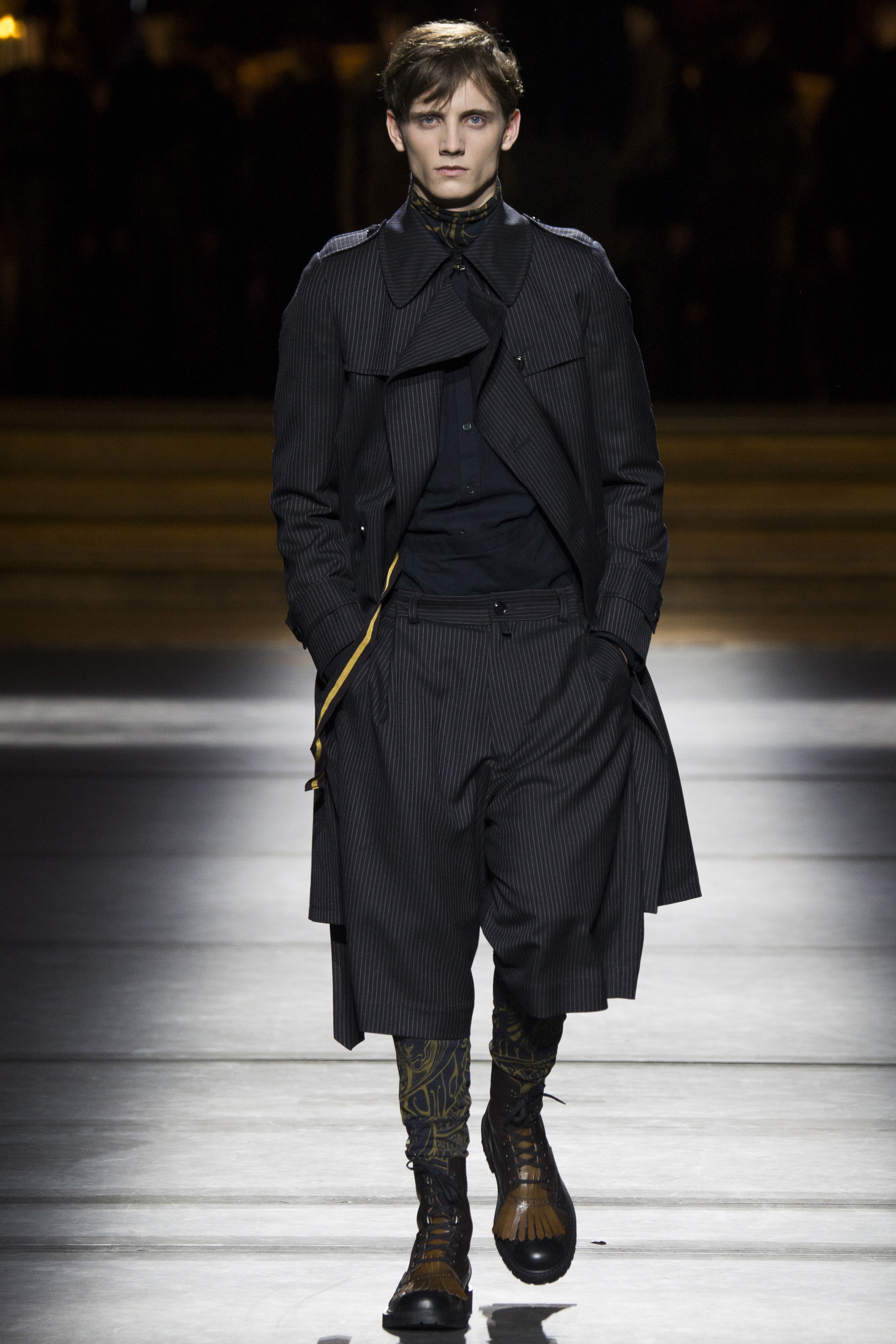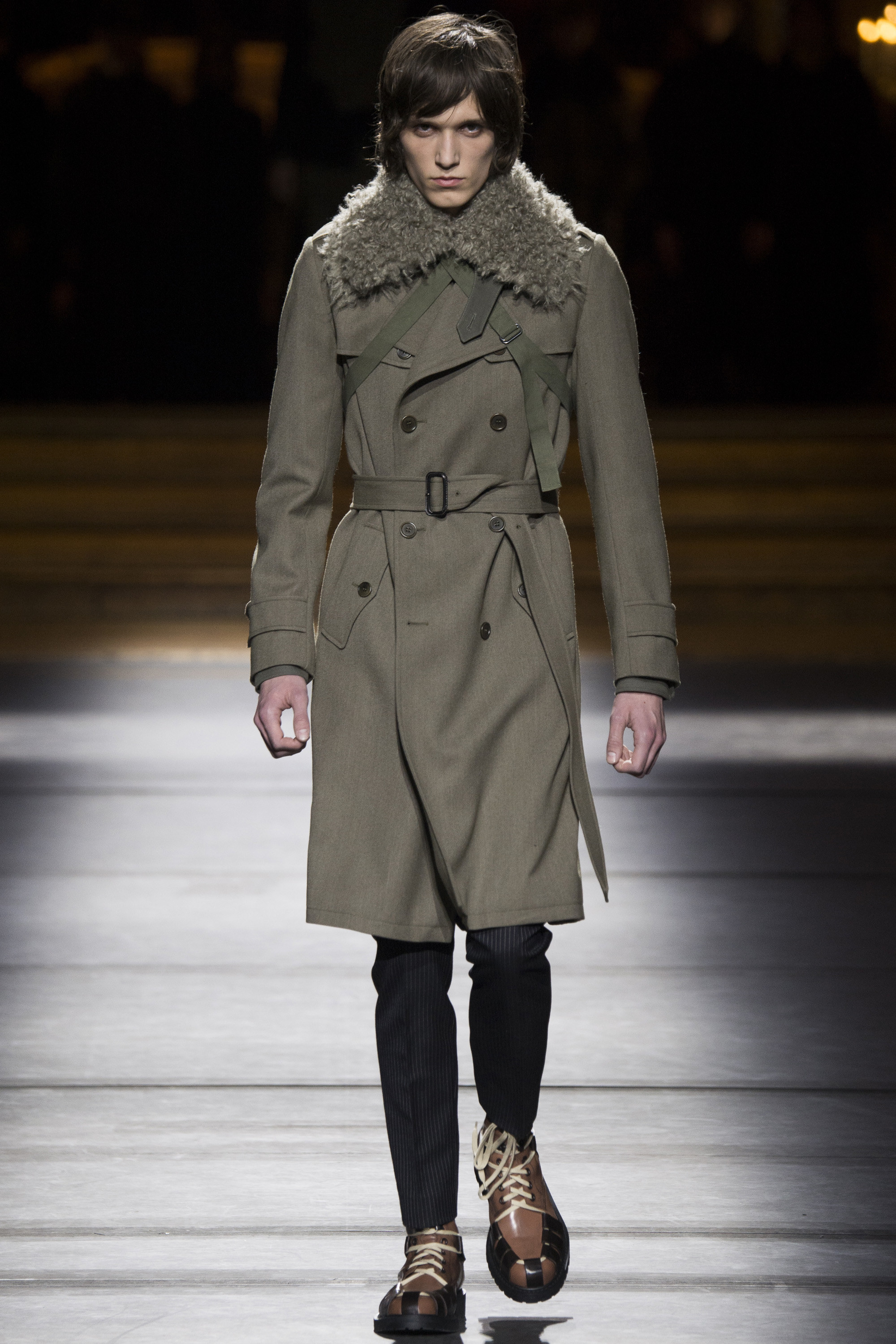 Van Noten made it clear from the start that his new model army was in no combative mood, but rather comprised of suave and placid fellas, lovingly referred to as “peaceniks” by the designer. They marched in crinkled trenchcoats with maxipockets and deconstructed military parkas that were sliced at the waist, their bottom parts reappearing as wraps over skinny track pants.