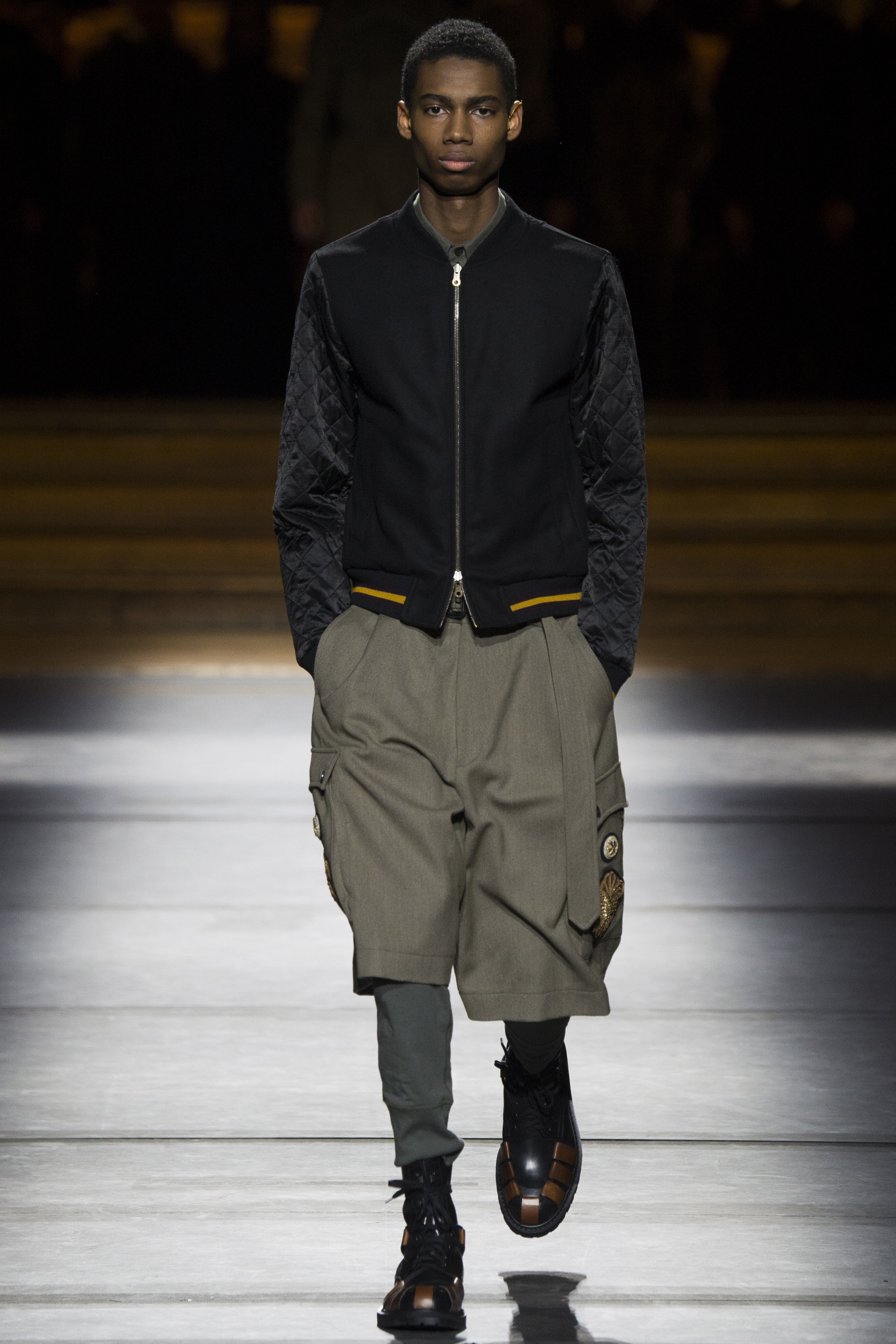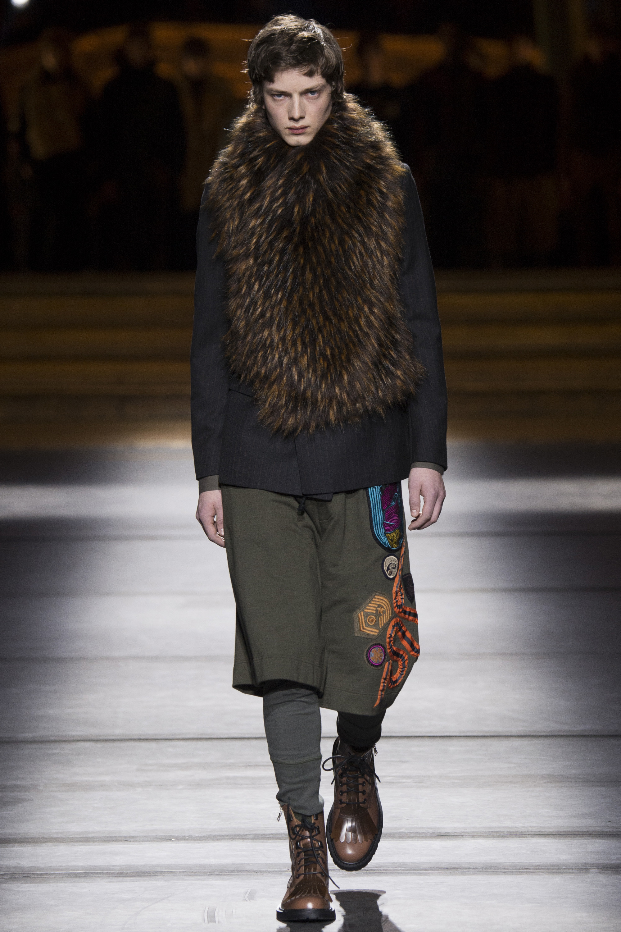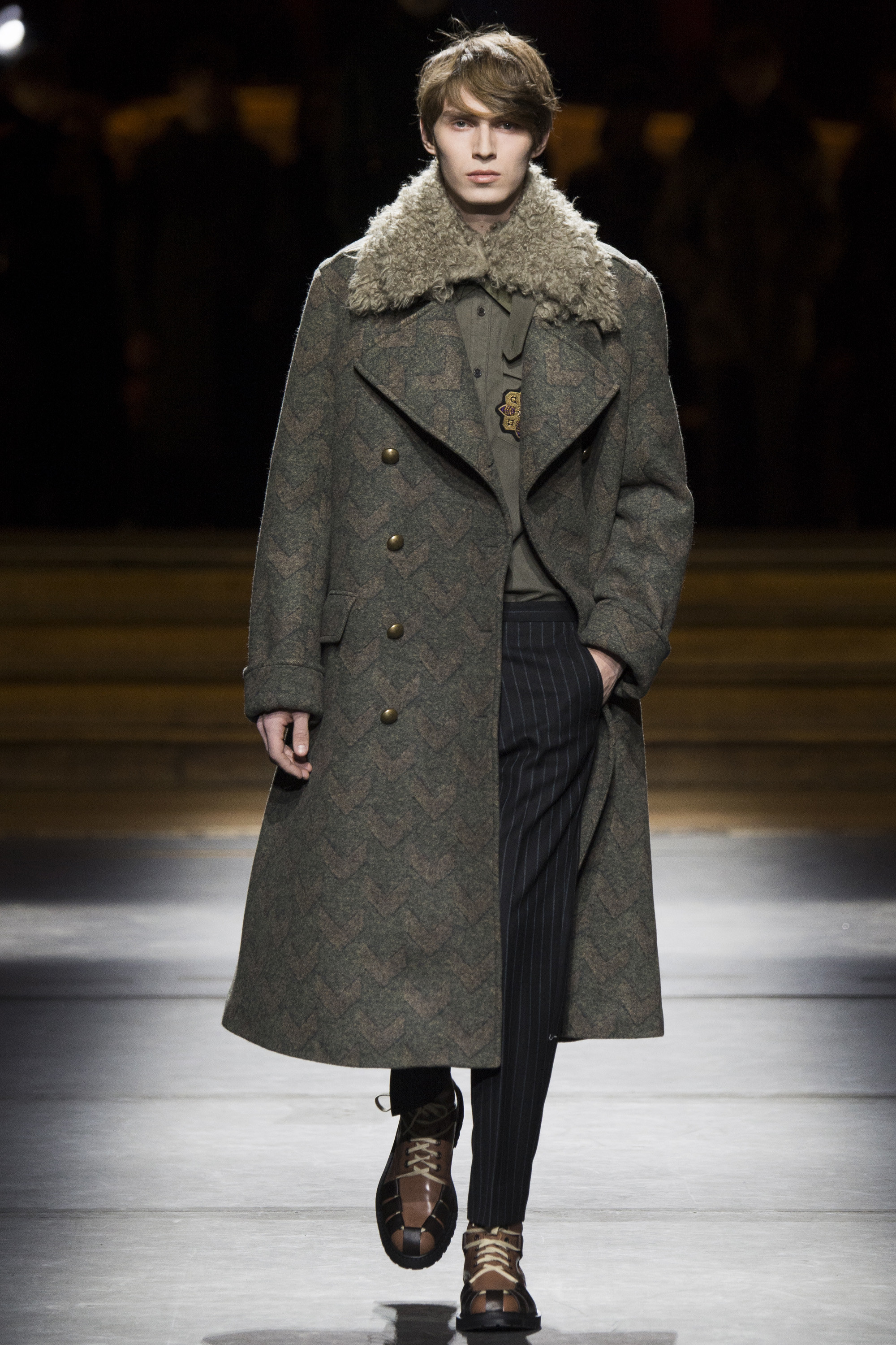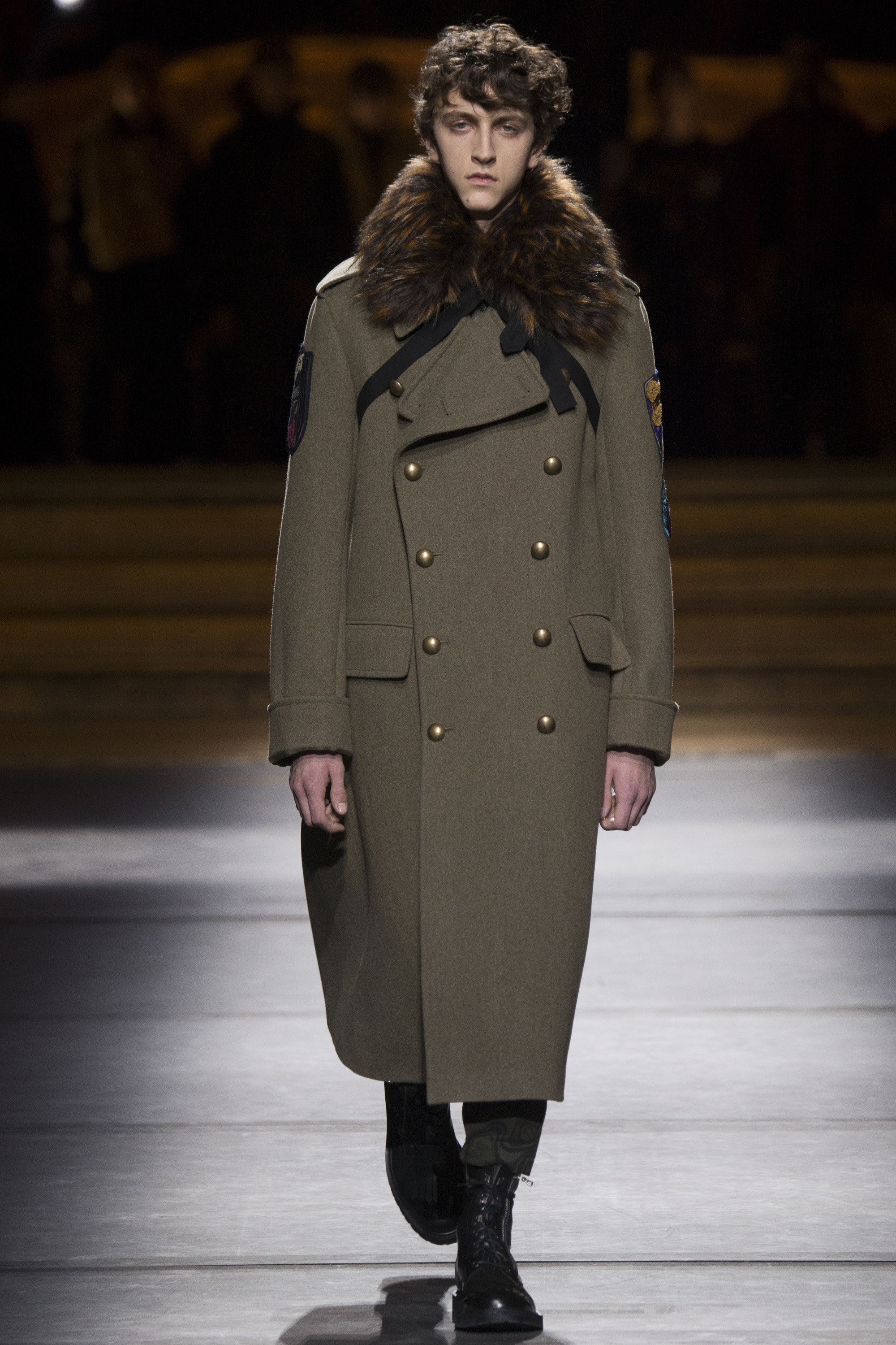 Military boots? Check. Camouflage prints? Check. But not without a psychedelic experience à la Wes Wilson. The acid prints Van Noten employed for fall looked decadent on a high-rank military jacket, while golden badges stitched to teddies and sweaters lived up to the Belgian’s knack for embellishment.