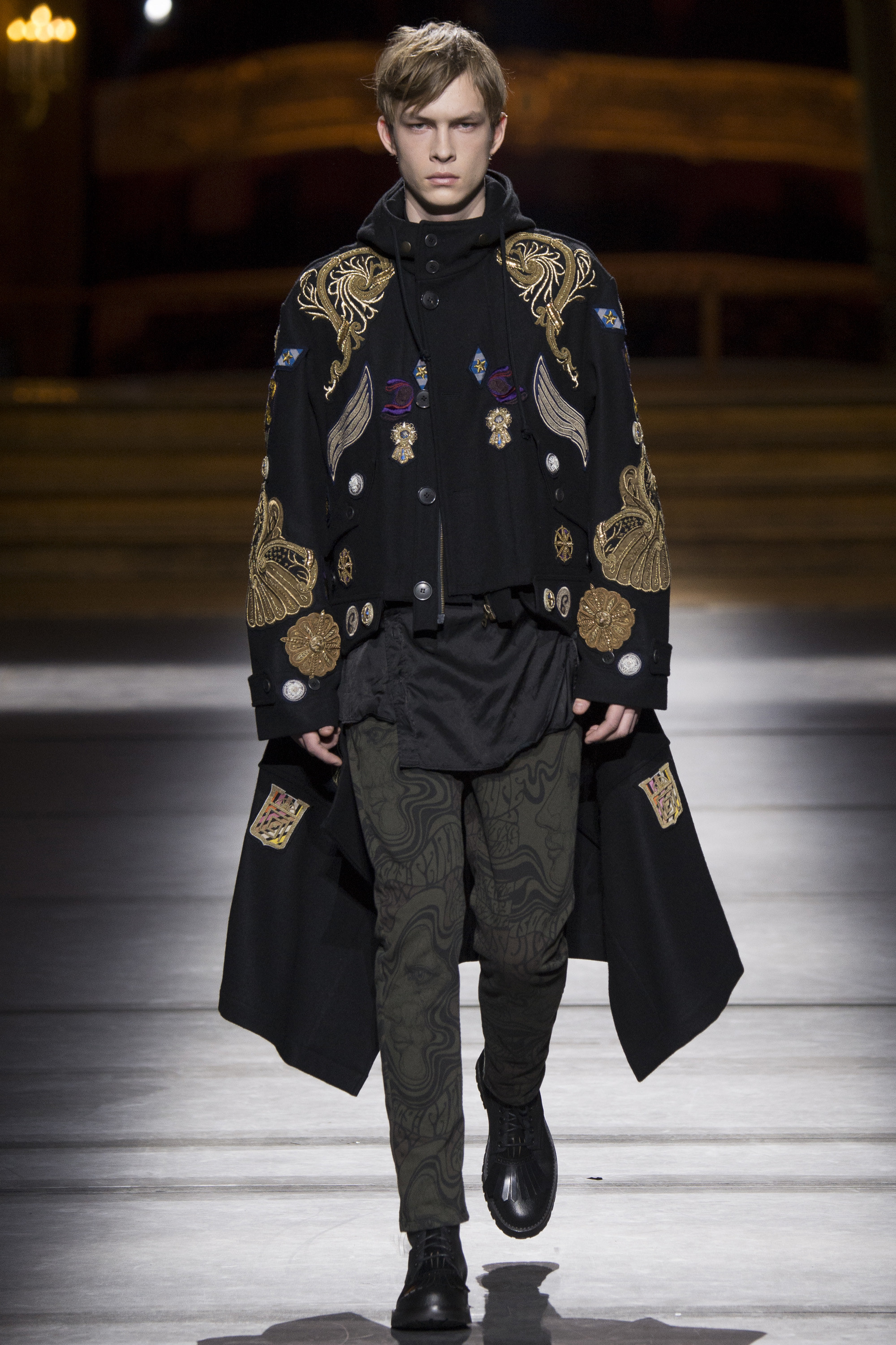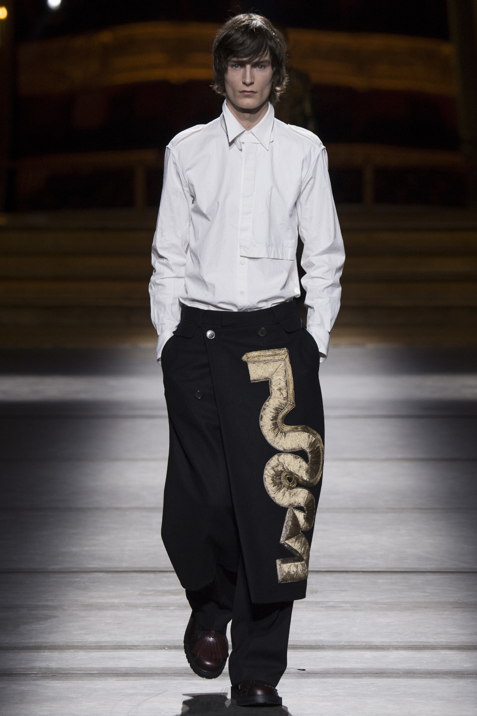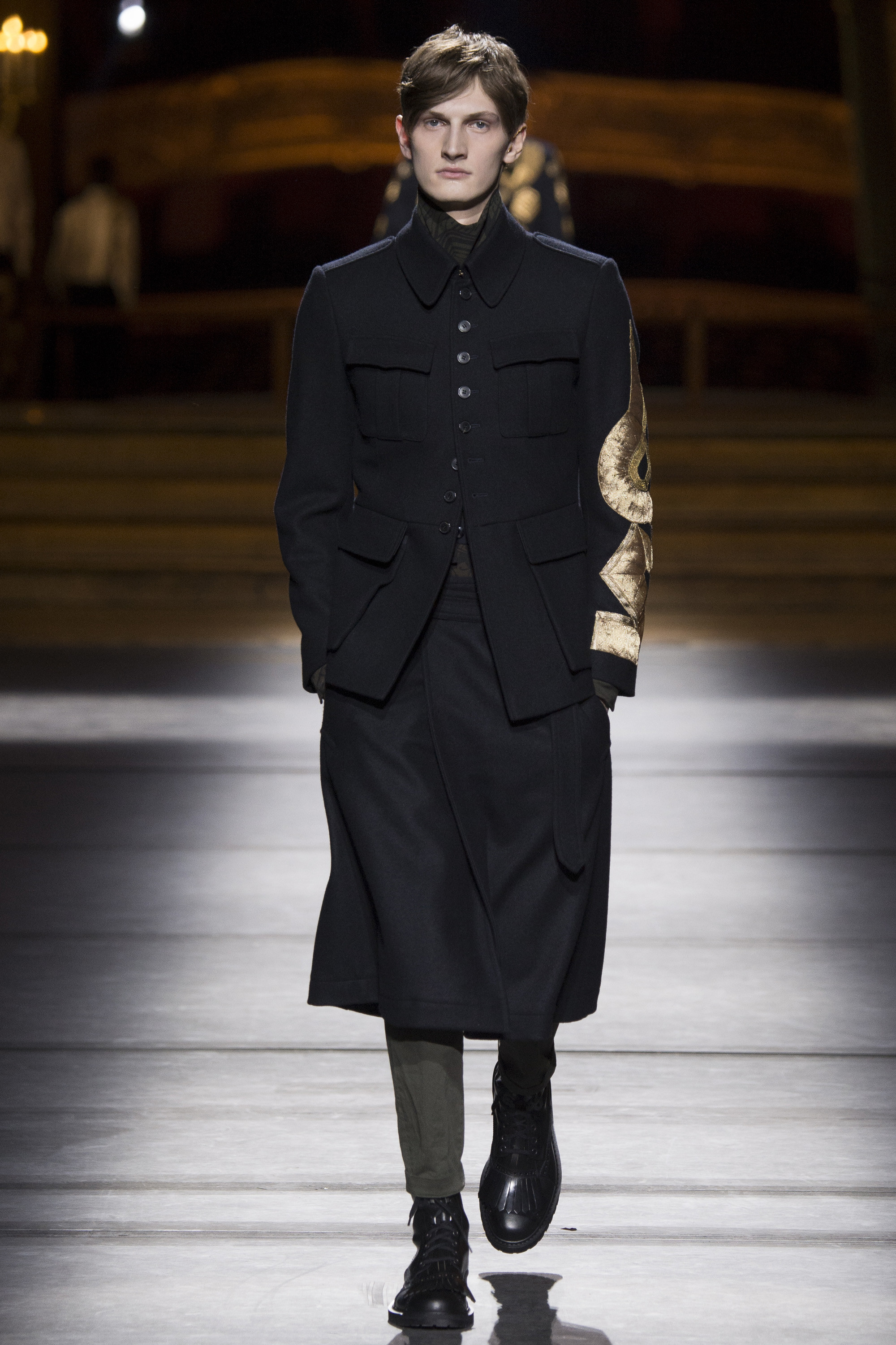 Everybody got a backstage pass to Dries Van Noten’s military-themed show, staged behind the scenes of the Opera Garnier, with its inclined floors and imposing collection of set screens looming from the ceiling as backdrop. Golden props were on the house, reflecting the collection’s decorative character.