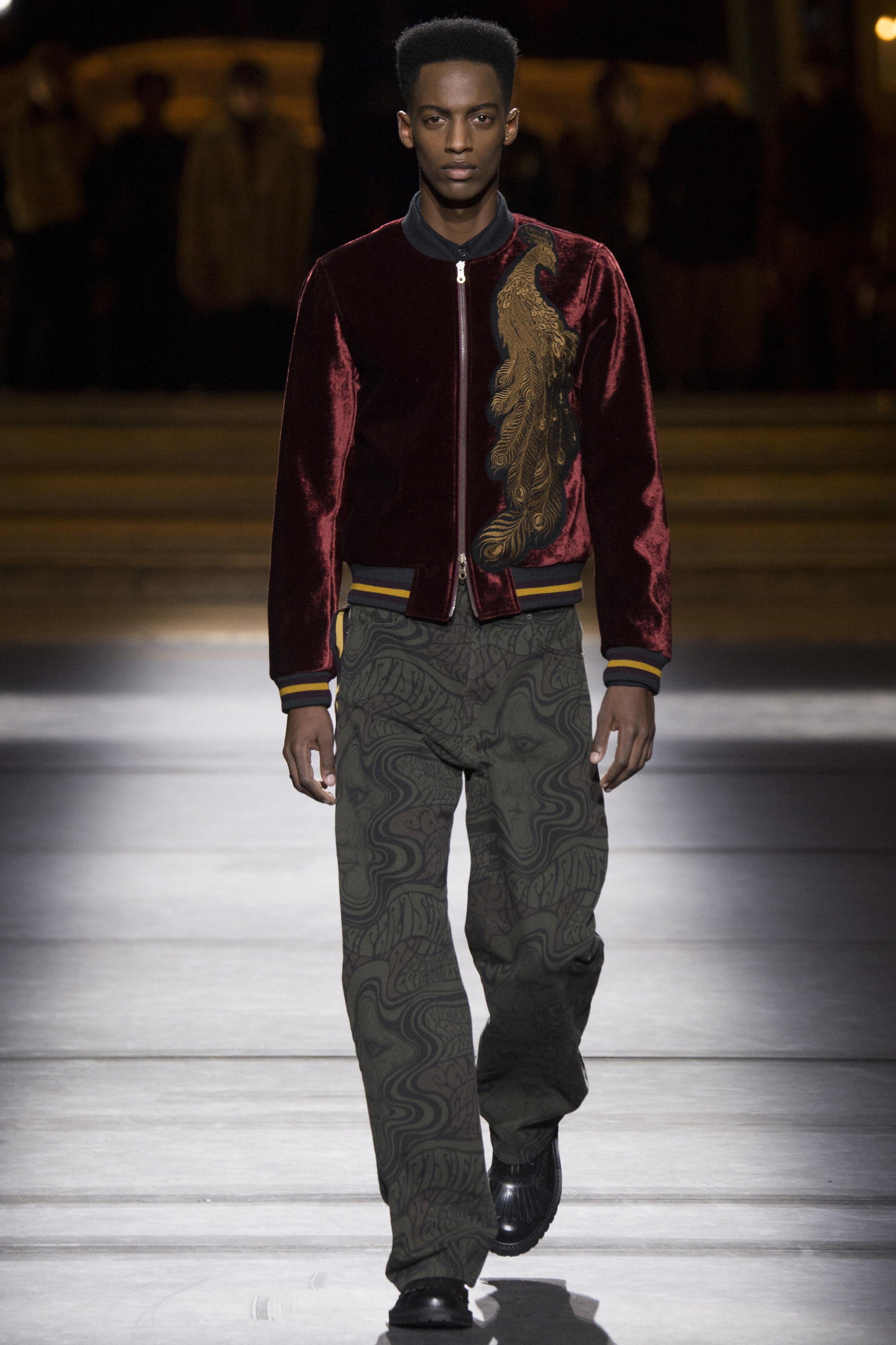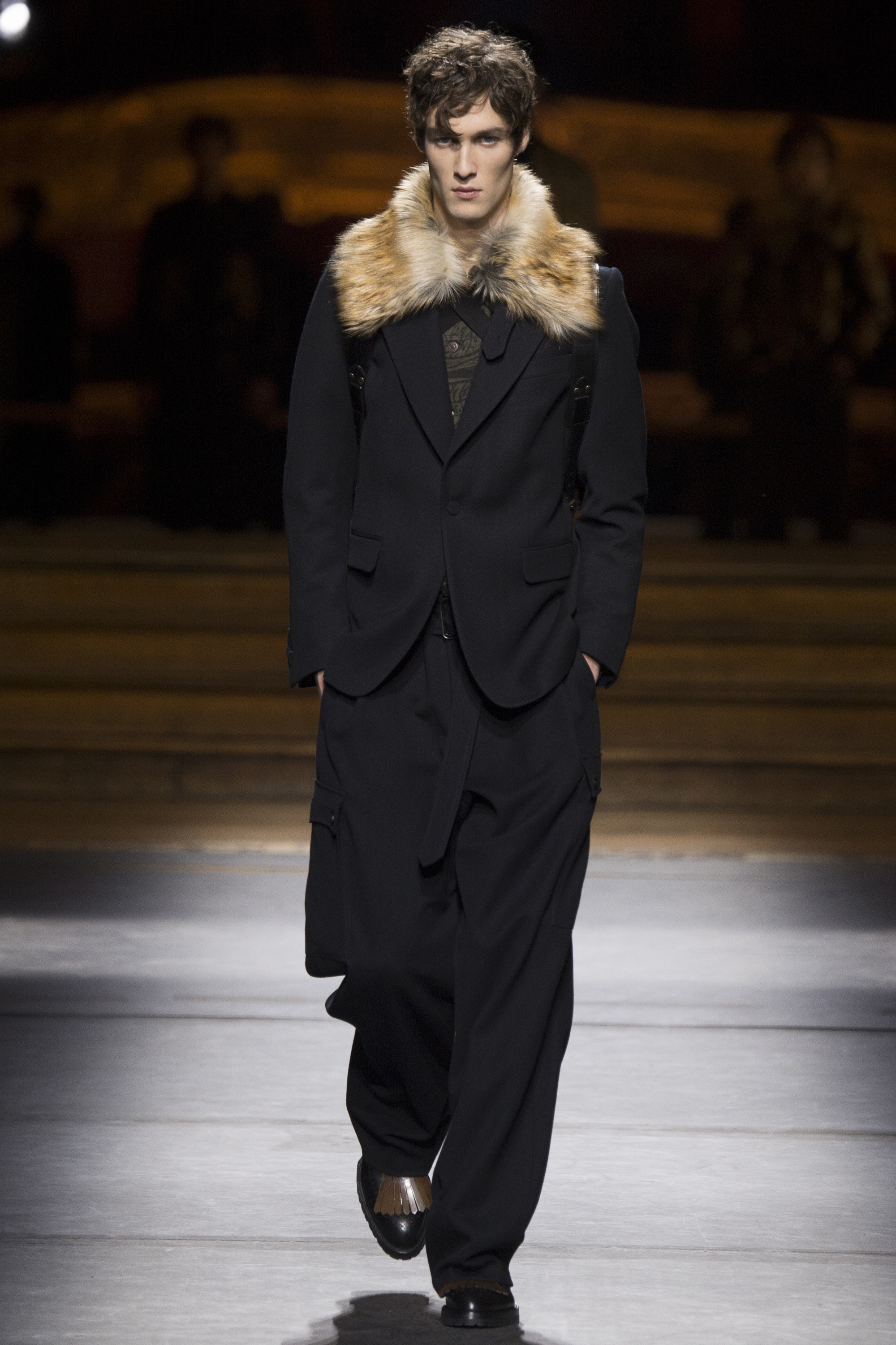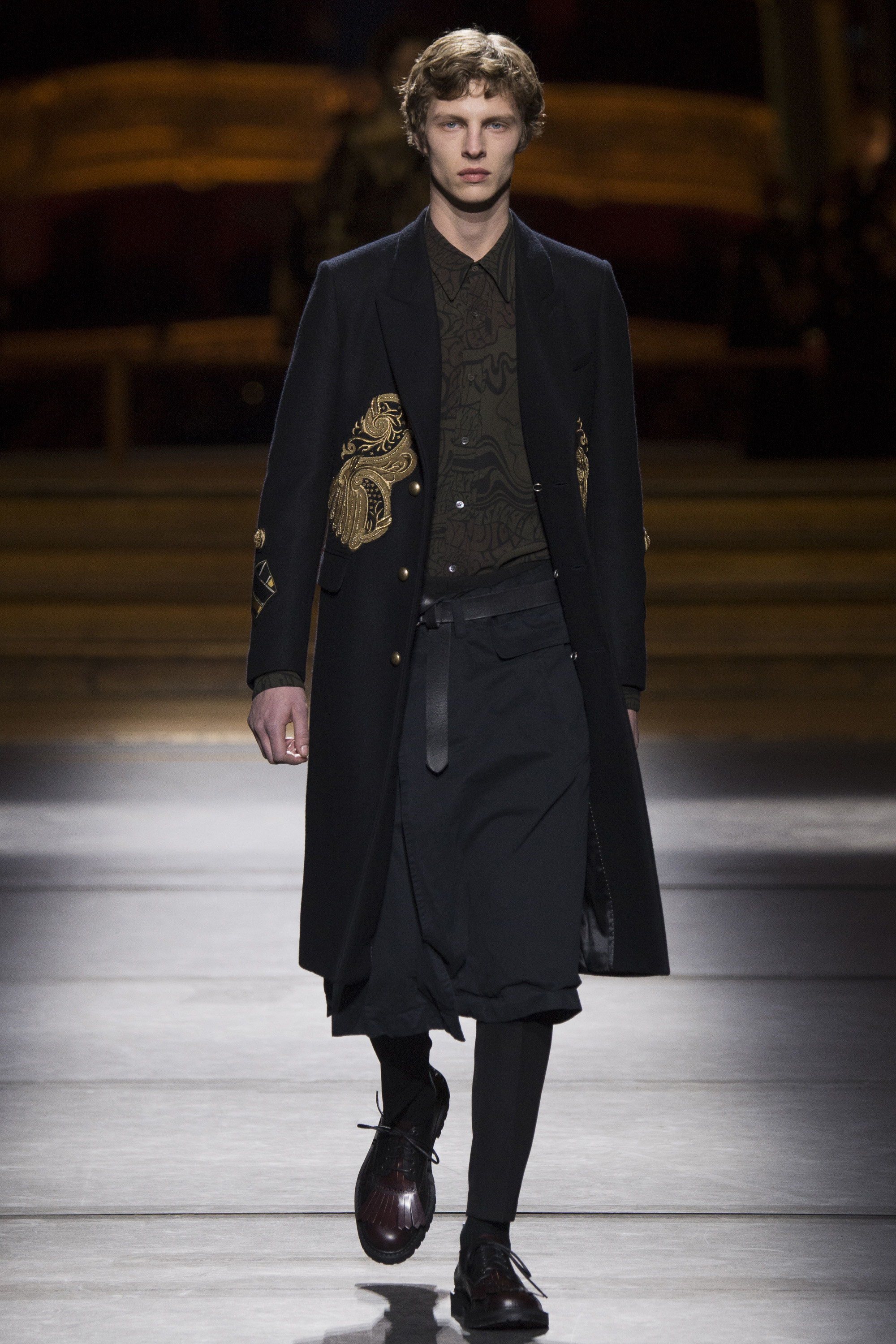 Everybody got a backstage pass to Dries Van Noten’s military-themed show, staged behind the scenes of the Opera Garnier, with its inclined floors and imposing collection of set screens looming from the ceiling as backdrop. Golden props were on the house, reflecting the collection’s decorative character.