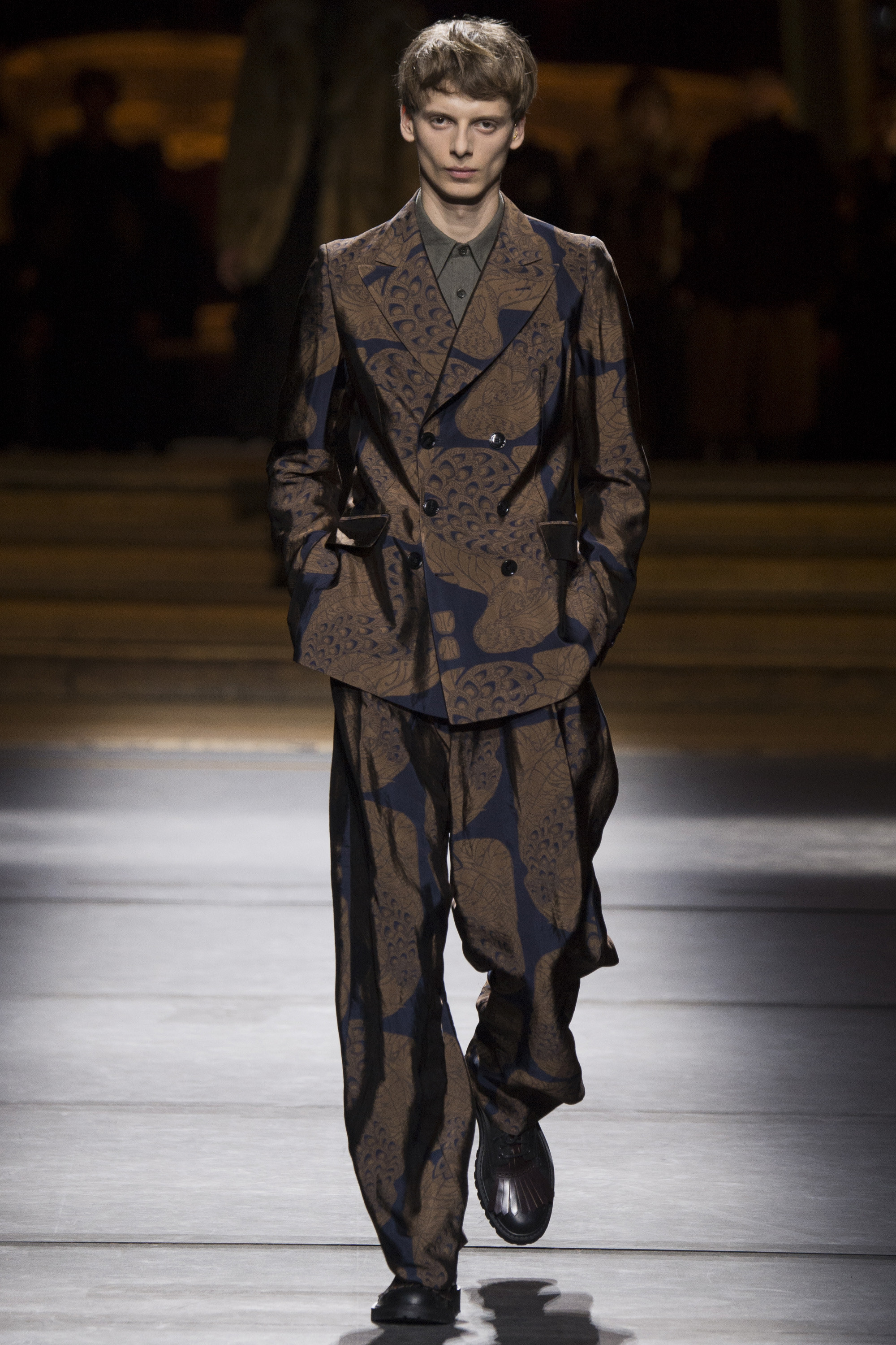 Van Noten left no stone unturned to communicate this gentle soldiers’ nonconformist nature. Crushed velvet bathrobes and boxy pajama suits rounded off the accomplished show.