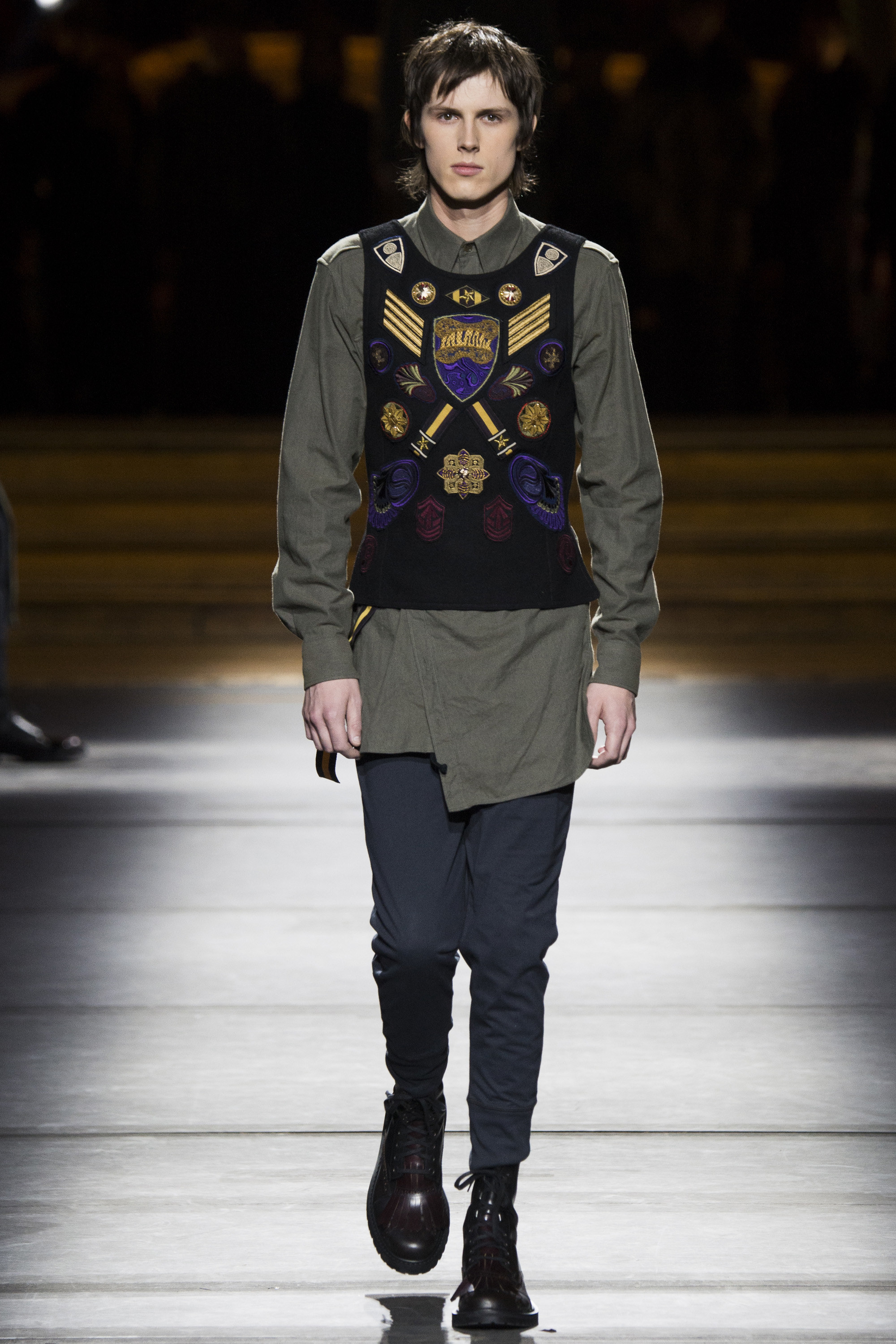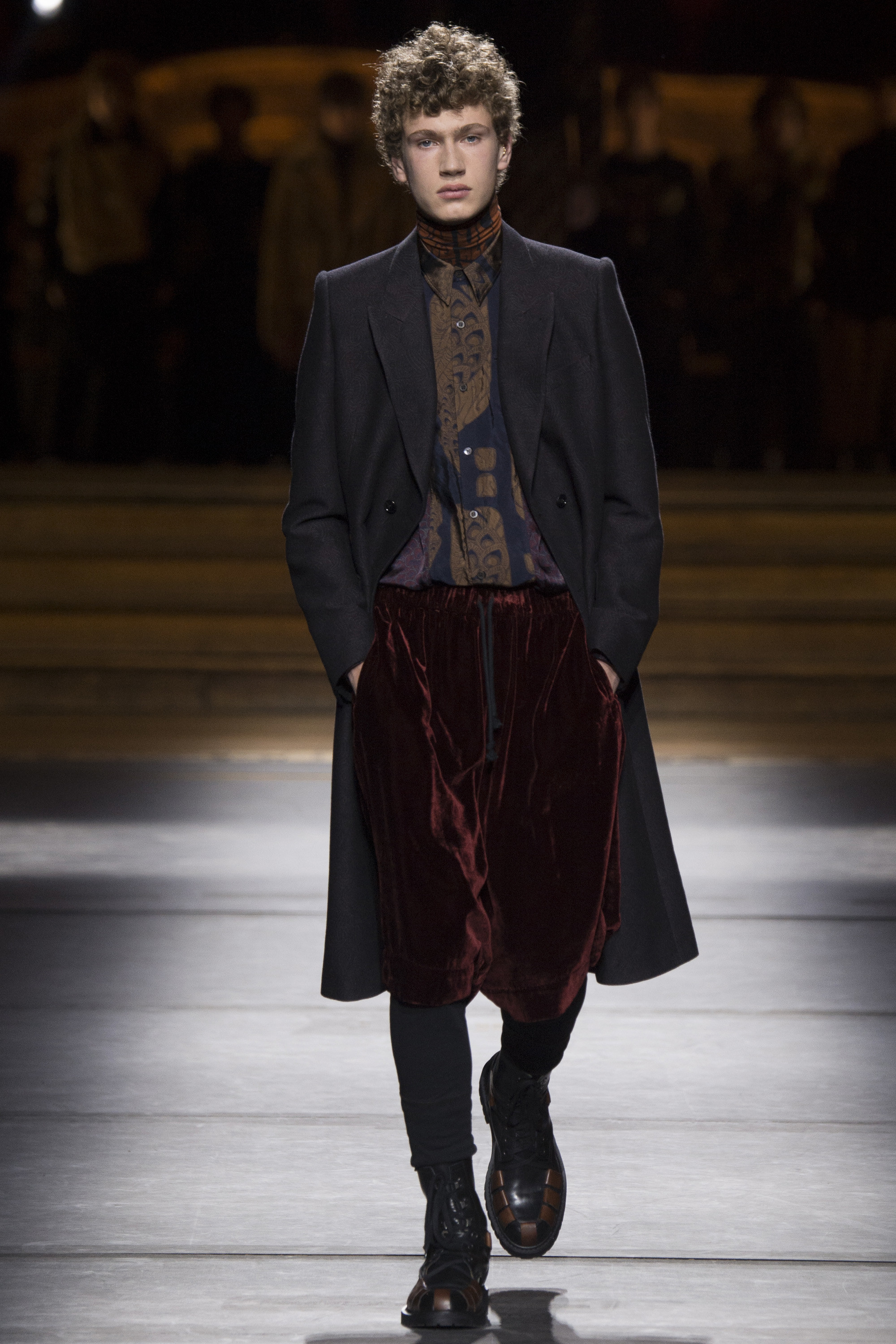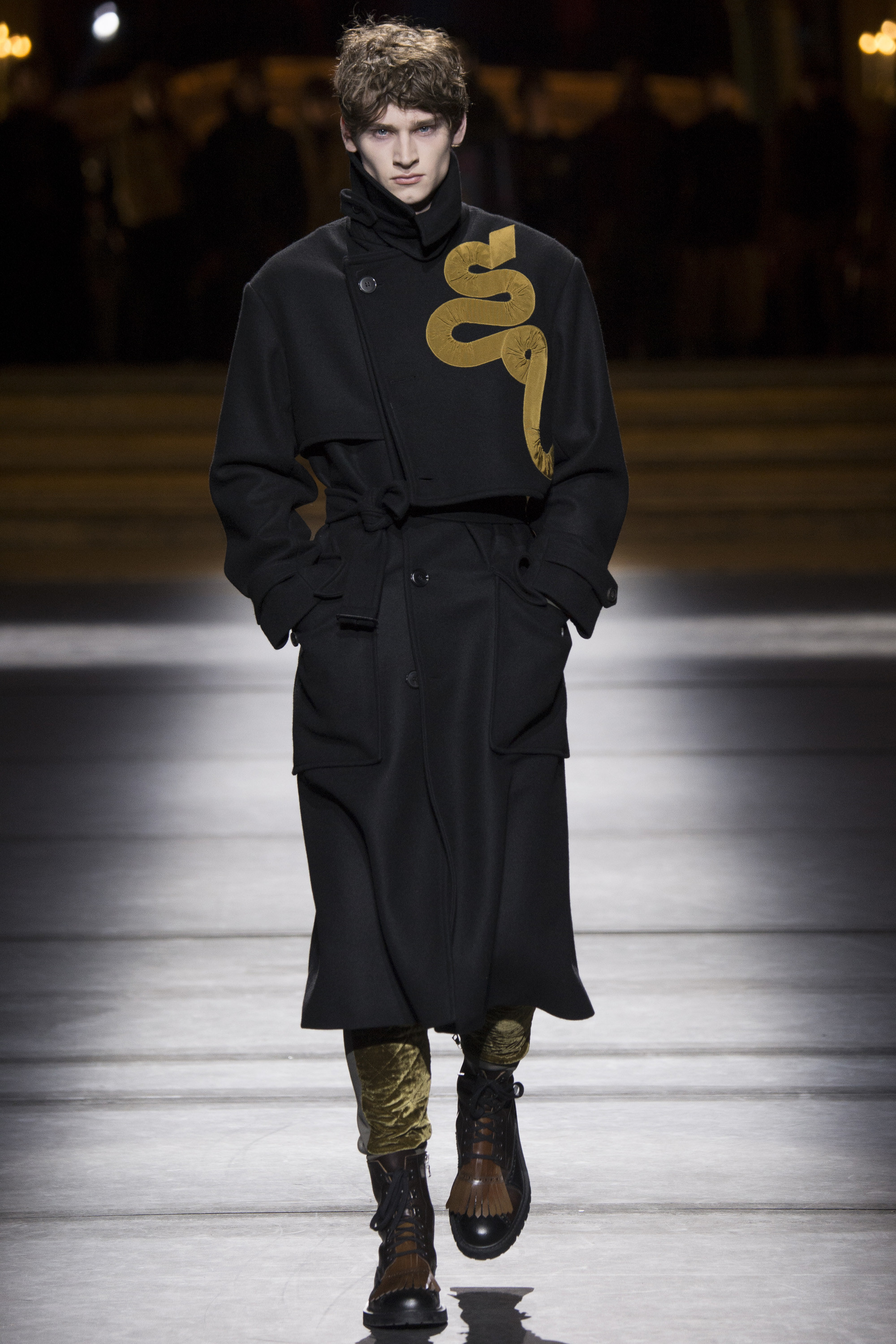 Van Noten made it clear from the start that his new model army was in no combative mood, but rather comprised of suave and placid fellas, lovingly referred to as “peaceniks” by the designer. They marched in crinkled trenchcoats with maxipockets and deconstructed military parkas that were sliced at the waist, their bottom parts reappearing as wraps over skinny track pants.