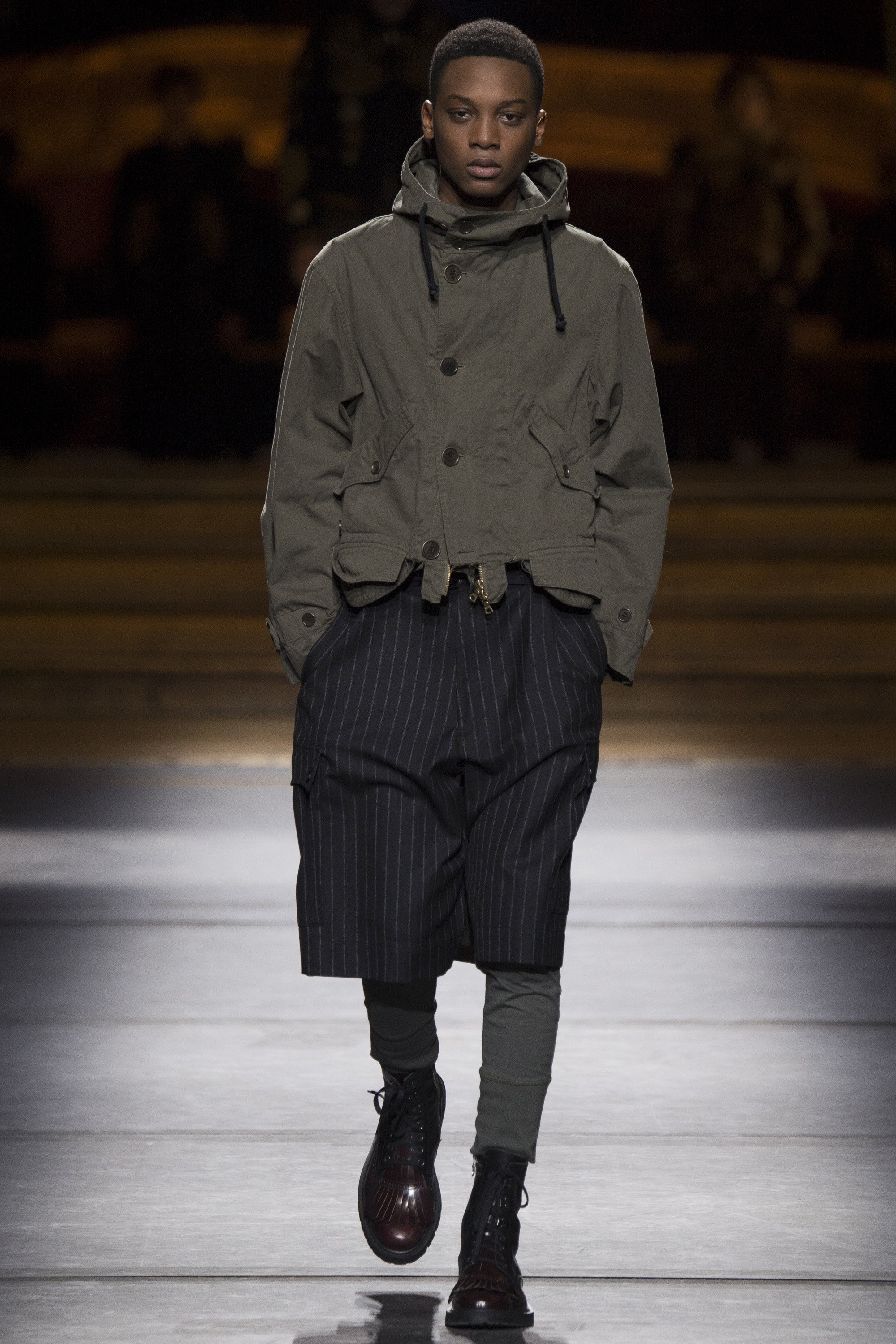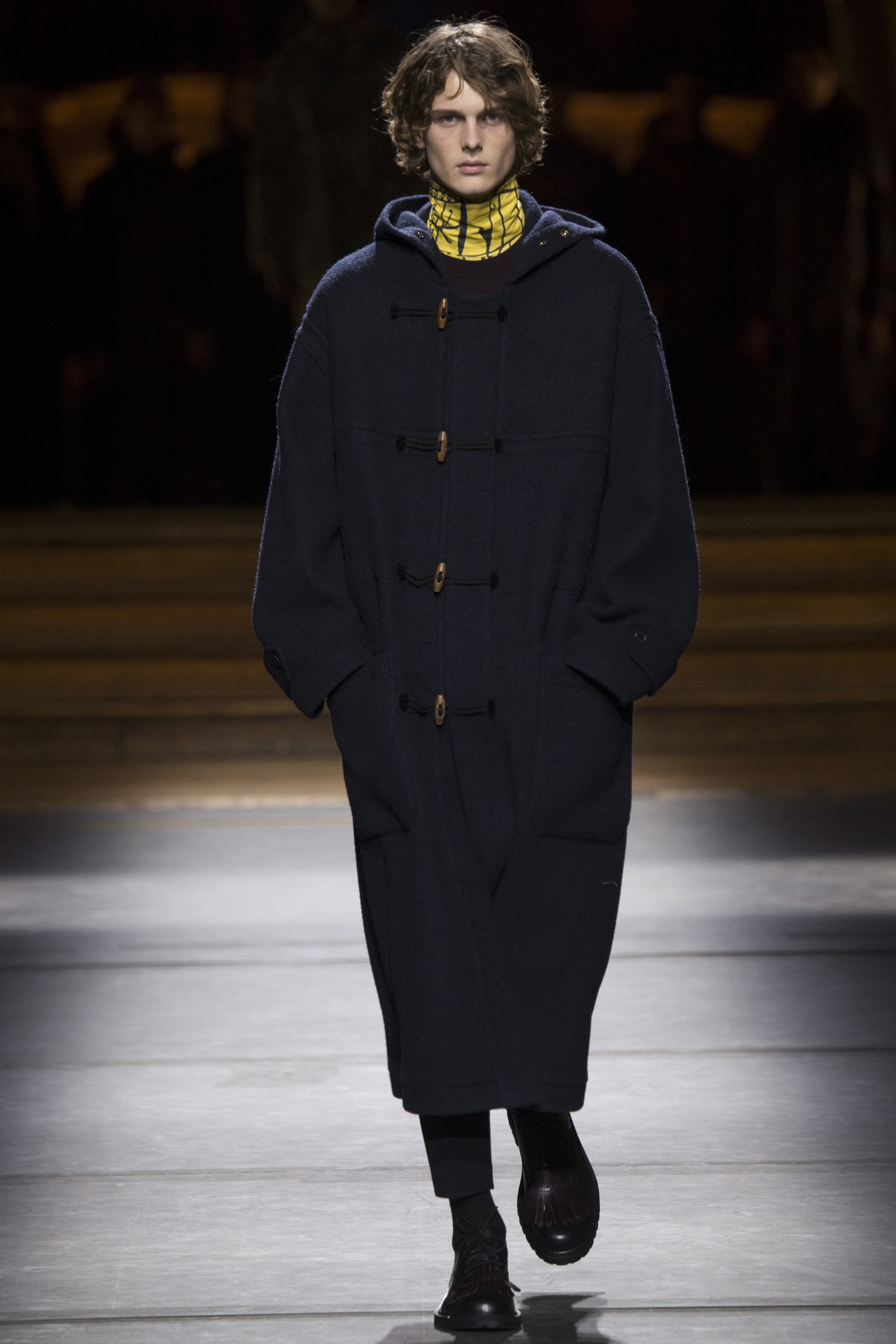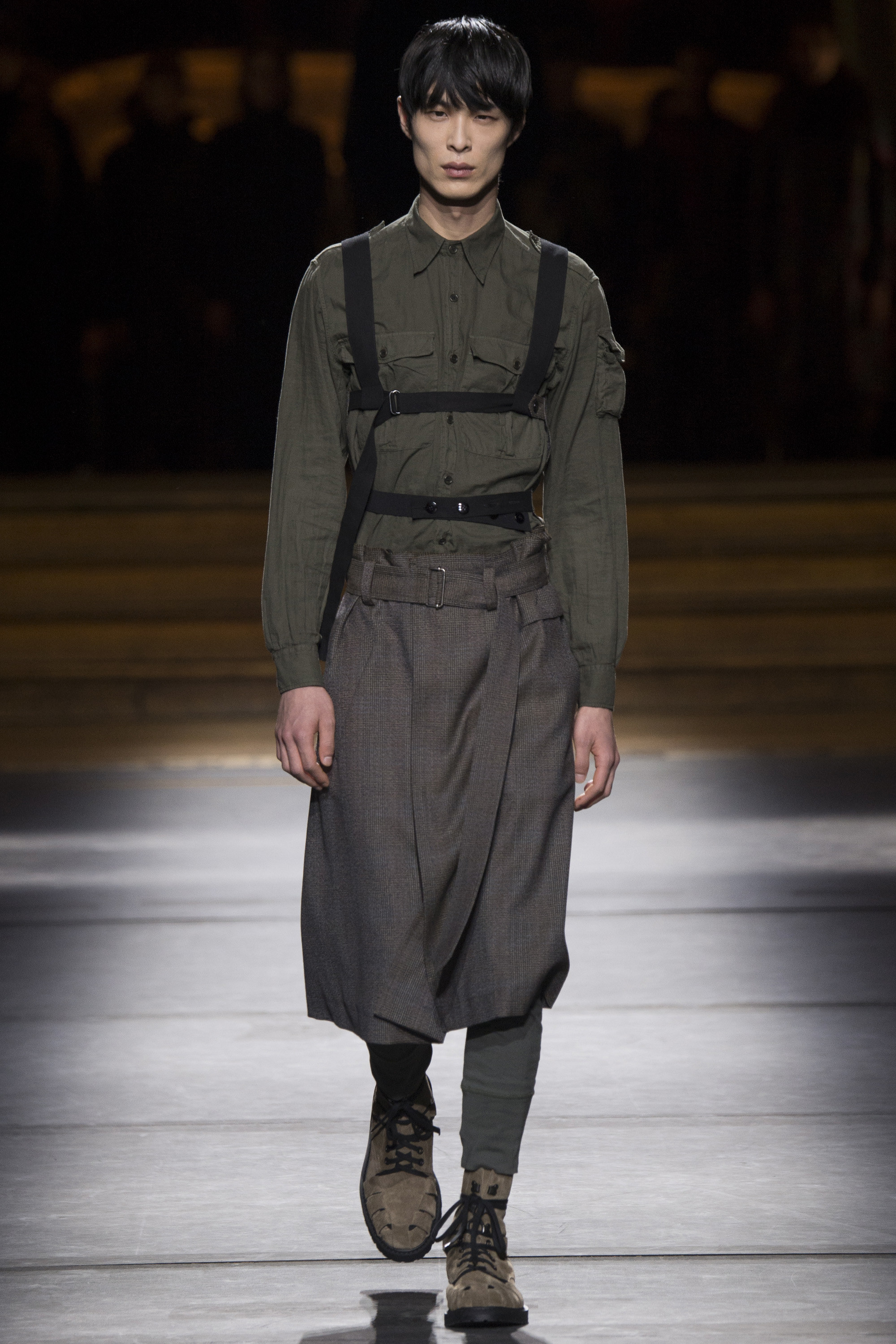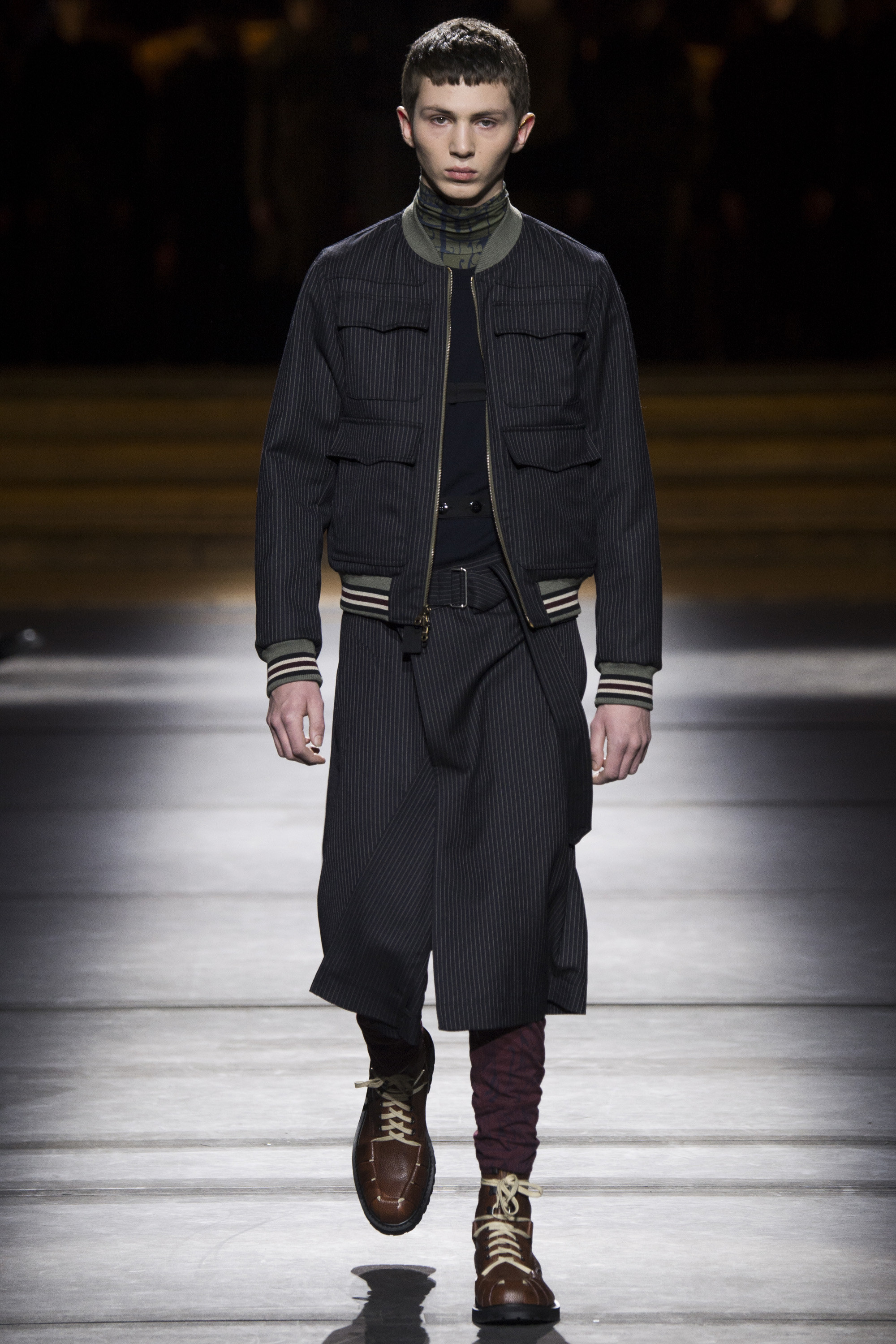 Van Noten made it clear from the start that his new model army was in no combative mood, but rather comprised of suave and placid fellas, lovingly referred to as “peaceniks” by the designer. They marched in crinkled trenchcoats with maxipockets and deconstructed military parkas that were sliced at the waist, their bottom parts reappearing as wraps over skinny track pants.