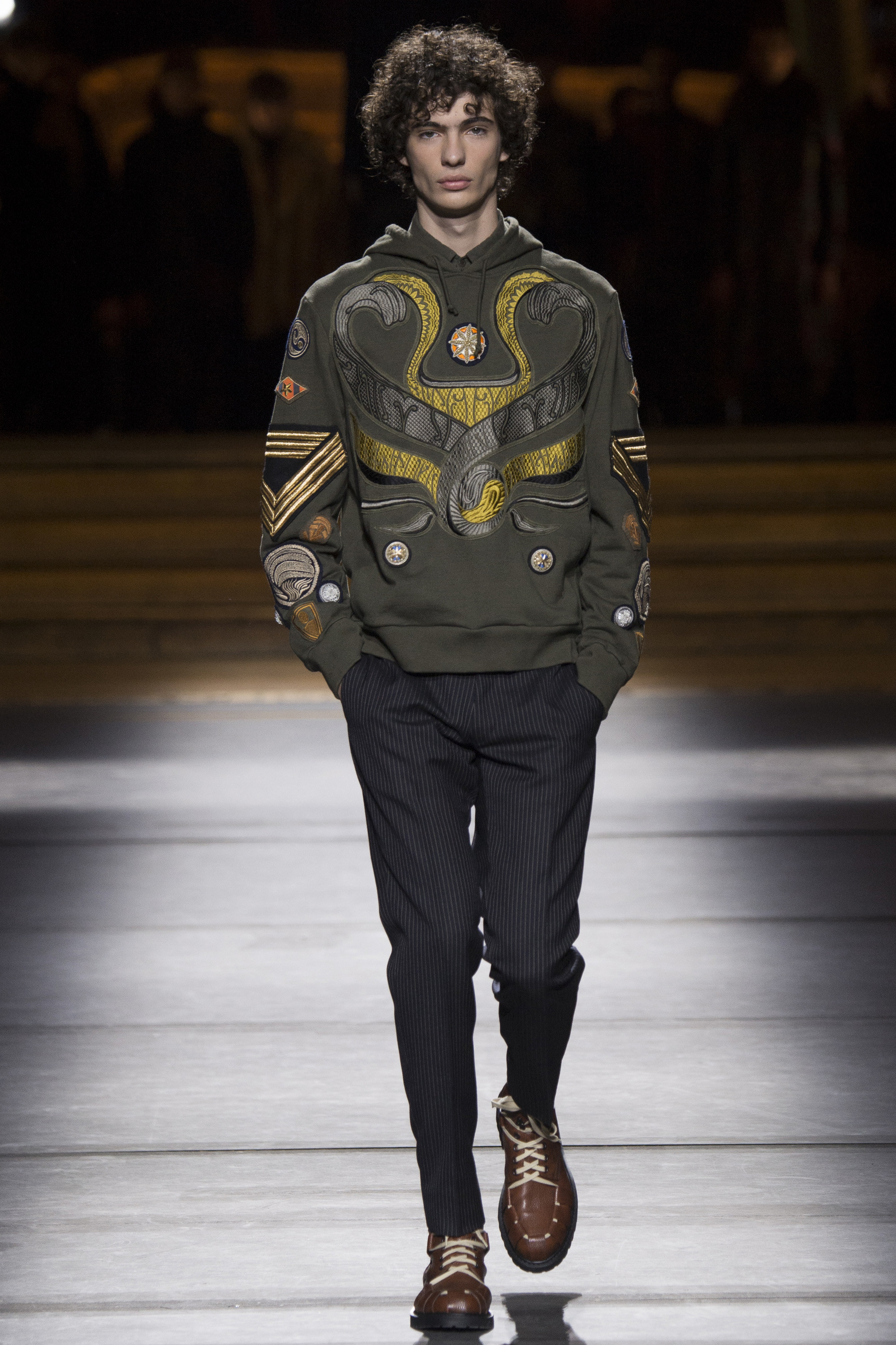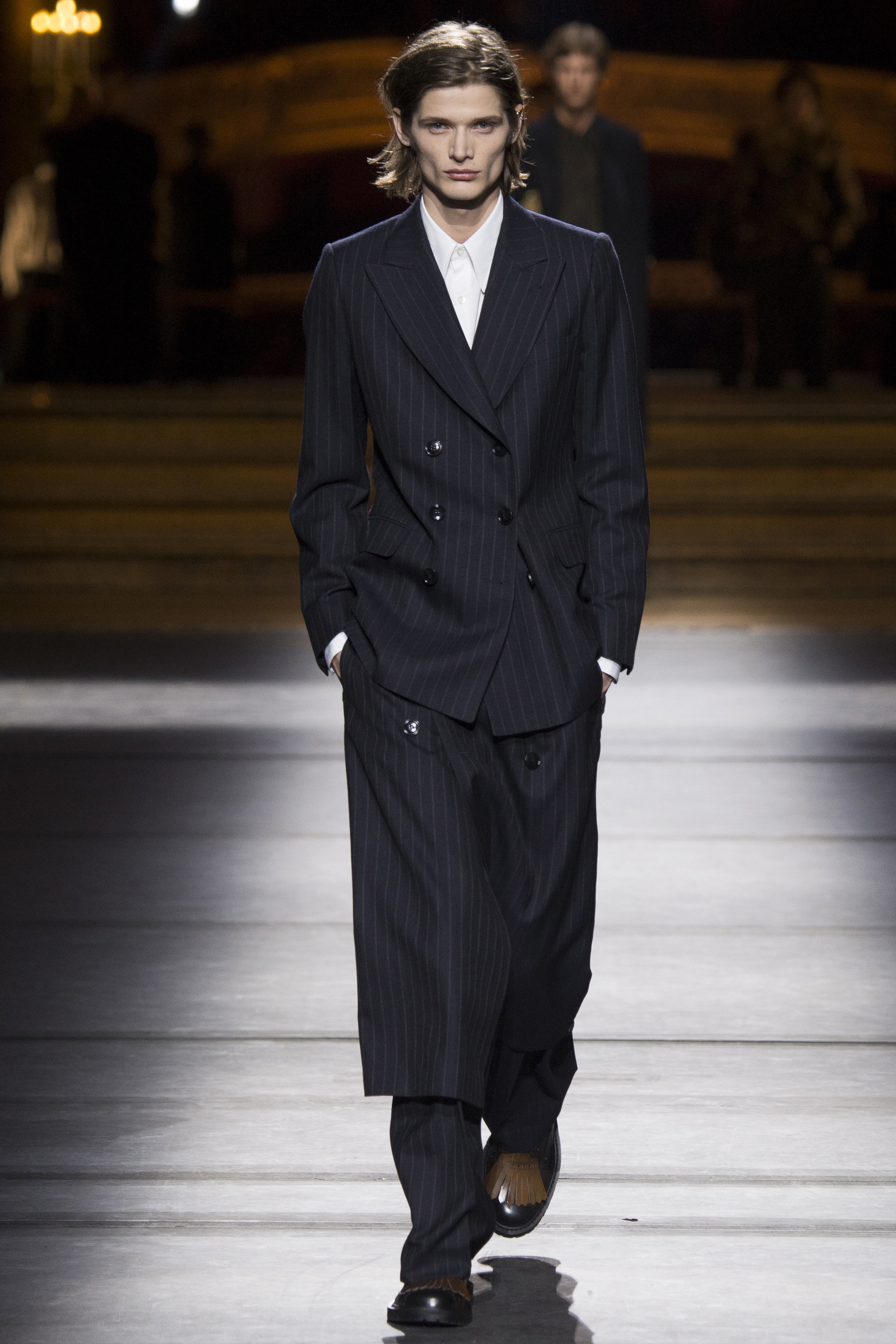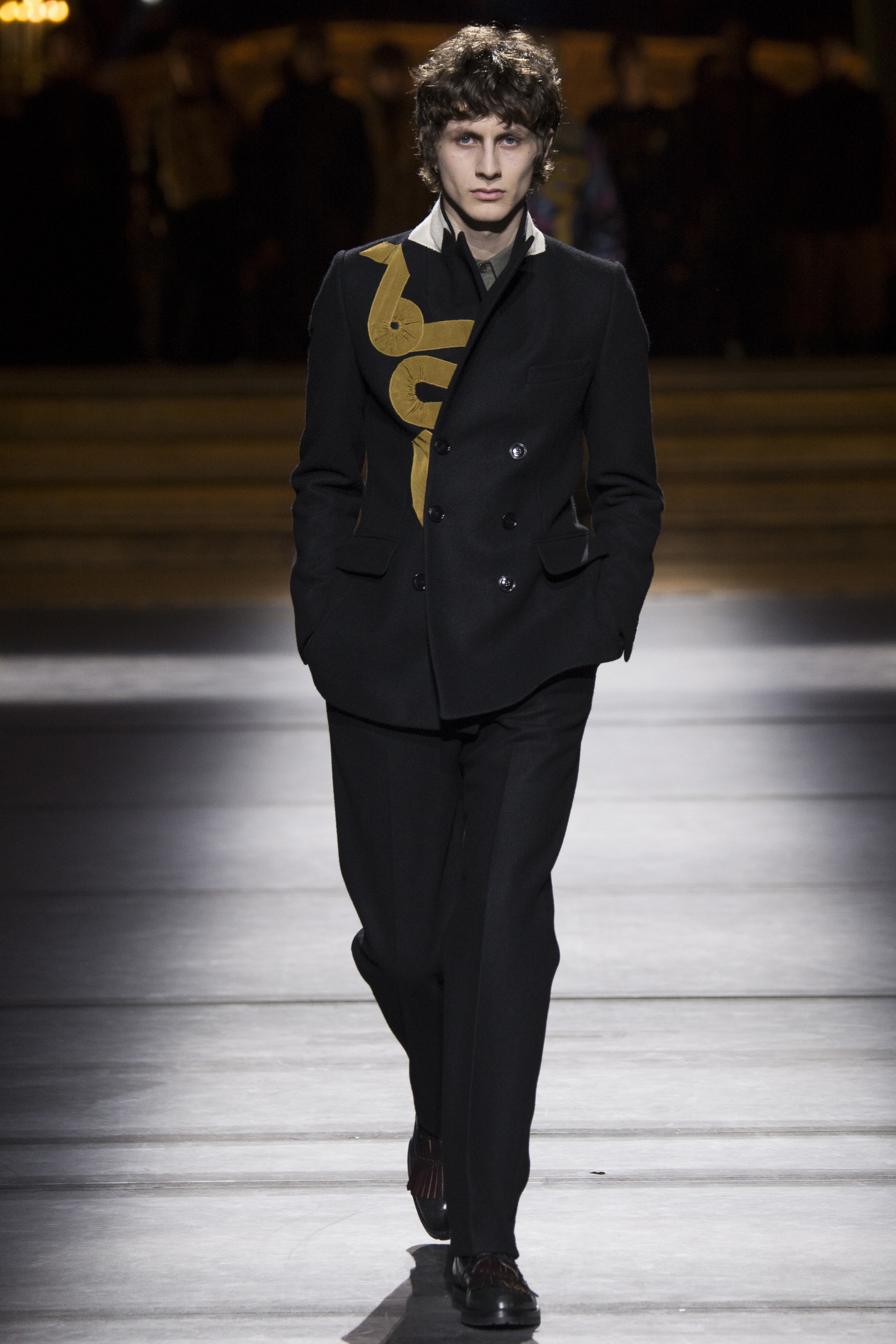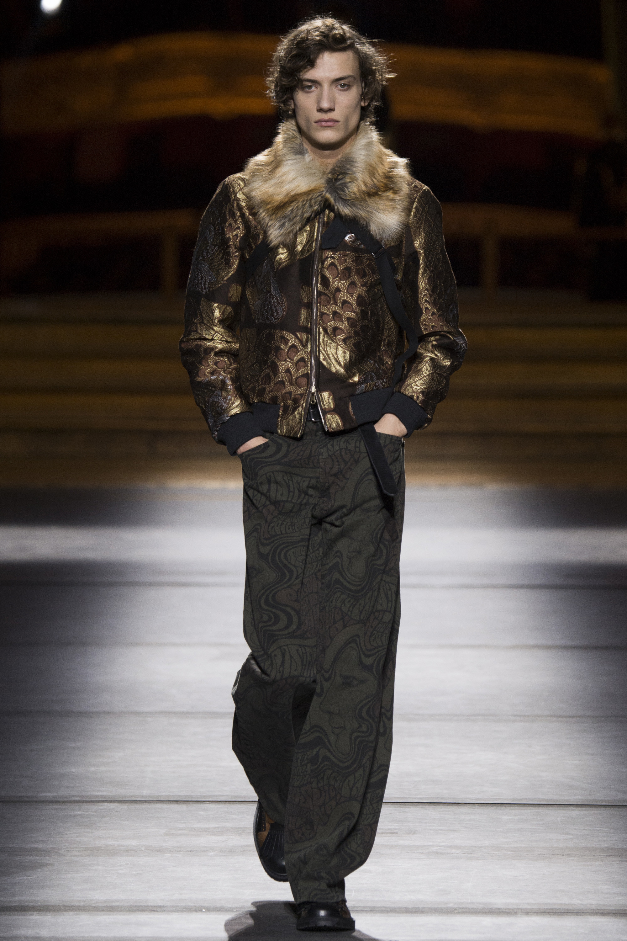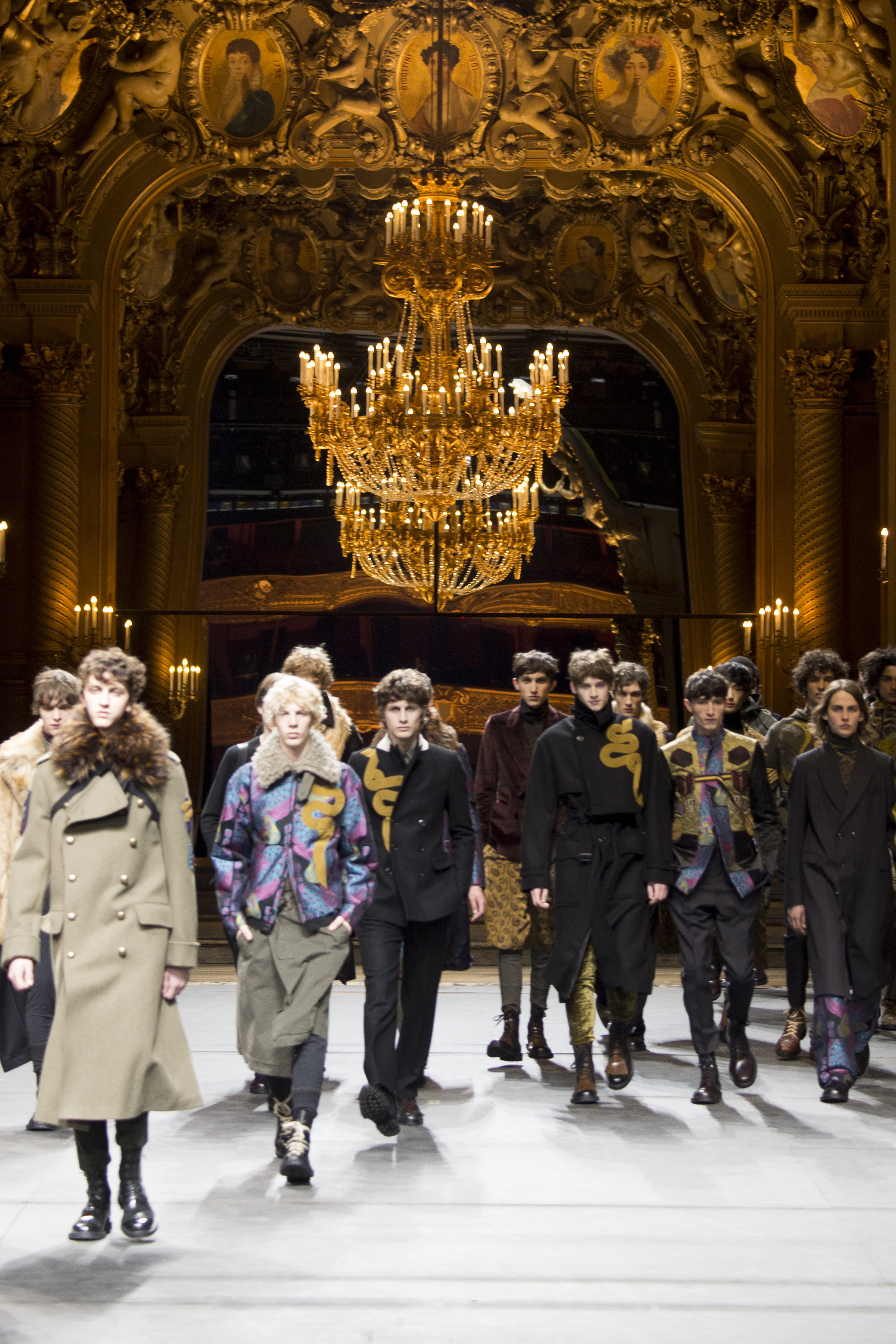 Everybody got a backstage pass to Dries Van Noten’s military-themed show, staged behind the scenes of the Opera Garnier, with its inclined floors and imposing collection of set screens looming from the ceiling as backdrop. Golden props were on the house, reflecting the collection’s decorative character.