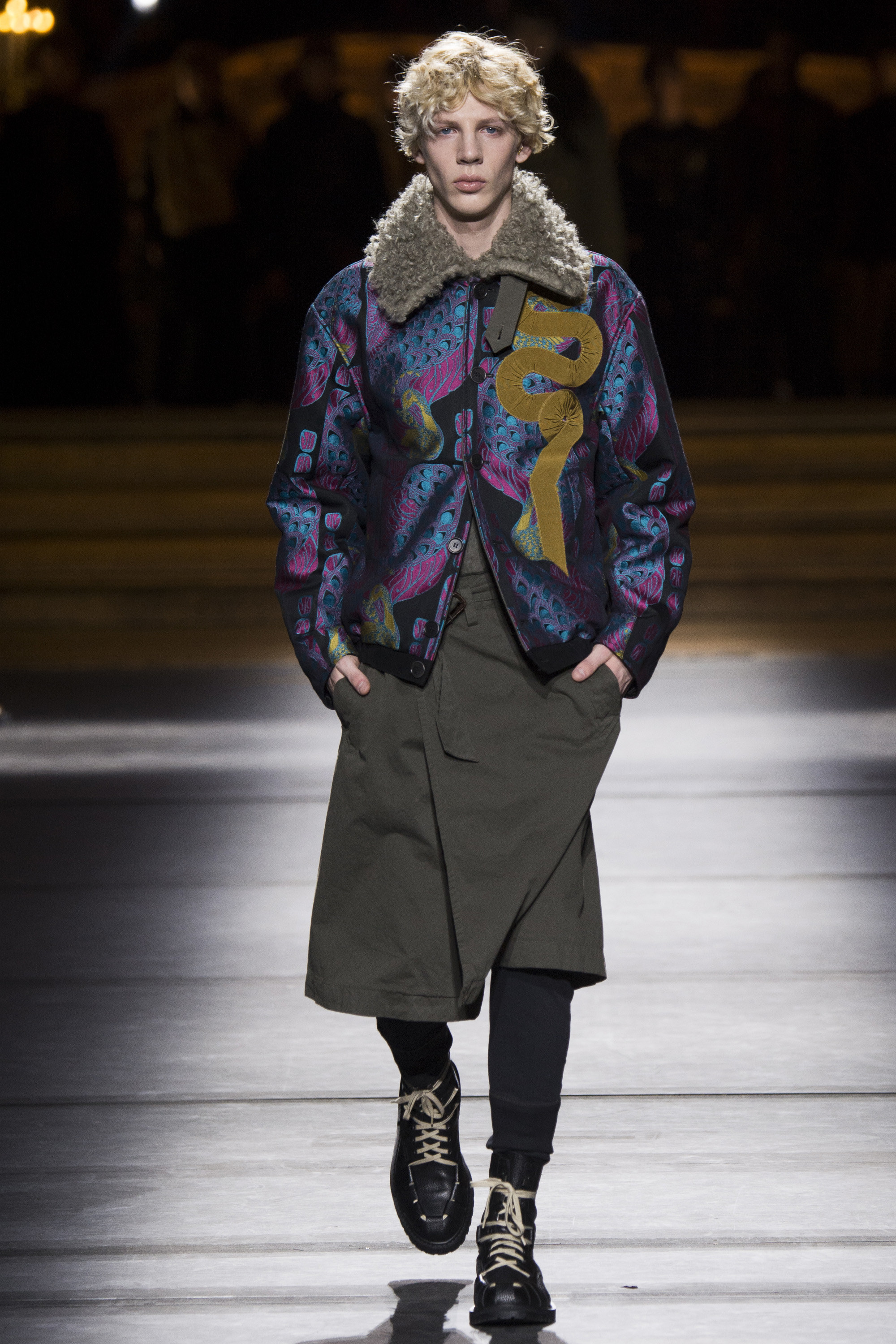 Military boots? Check. Camouflage prints? Check. But not without a psychedelic experience à la Wes Wilson. The acid prints Van Noten employed for fall looked decadent on a high-rank military jacket, while golden badges stitched to teddies and sweaters lived up to the Belgian’s knack for embellishment.