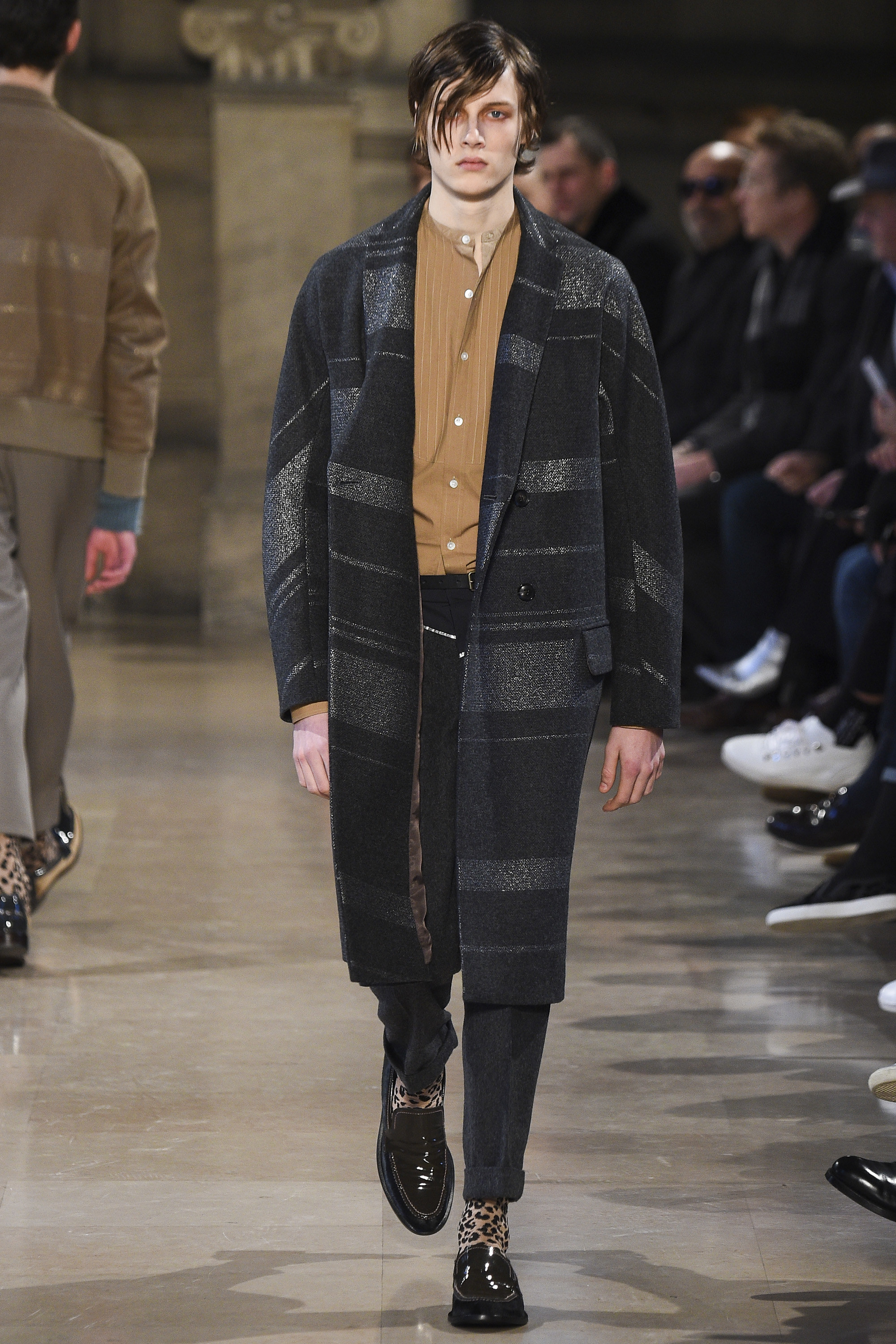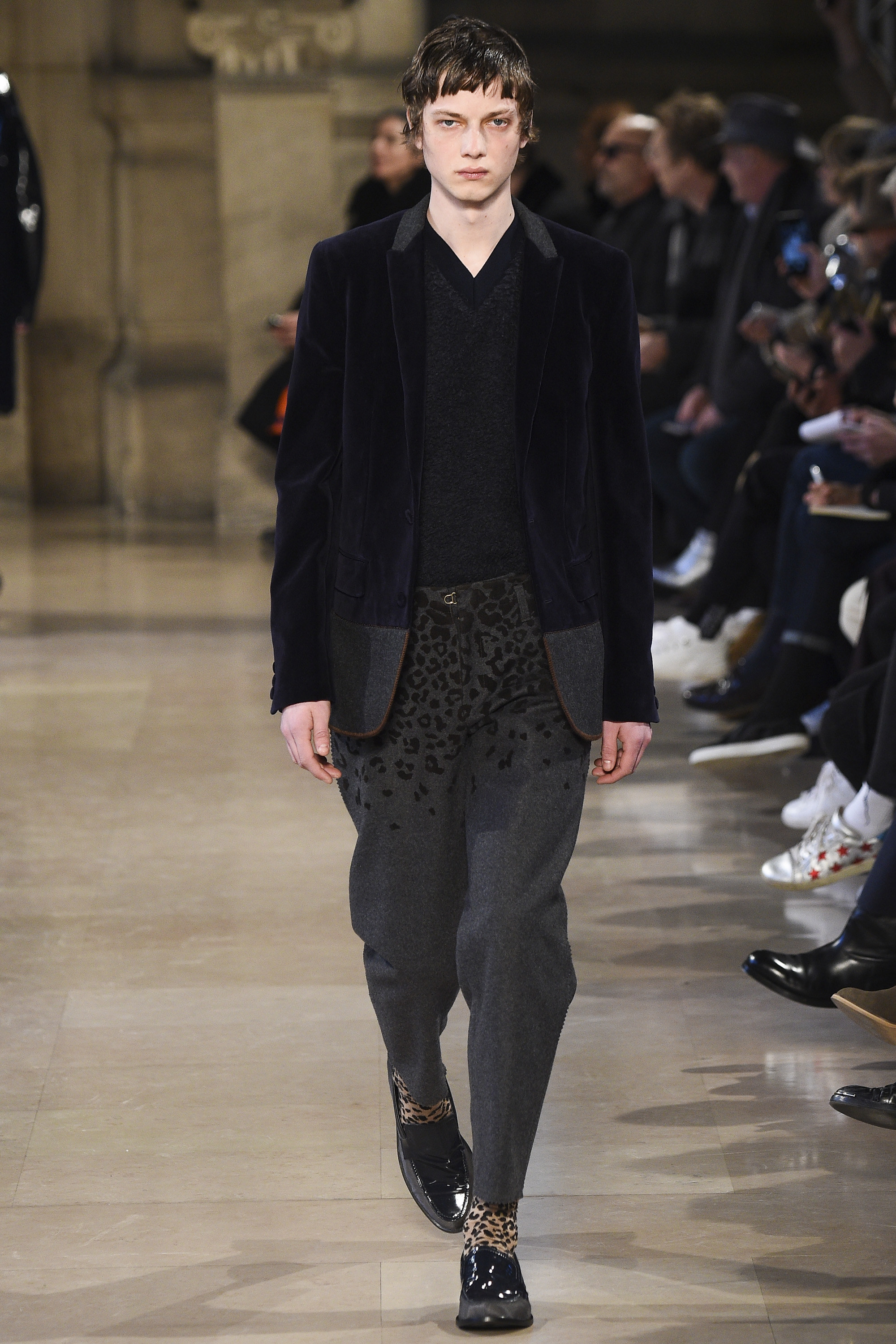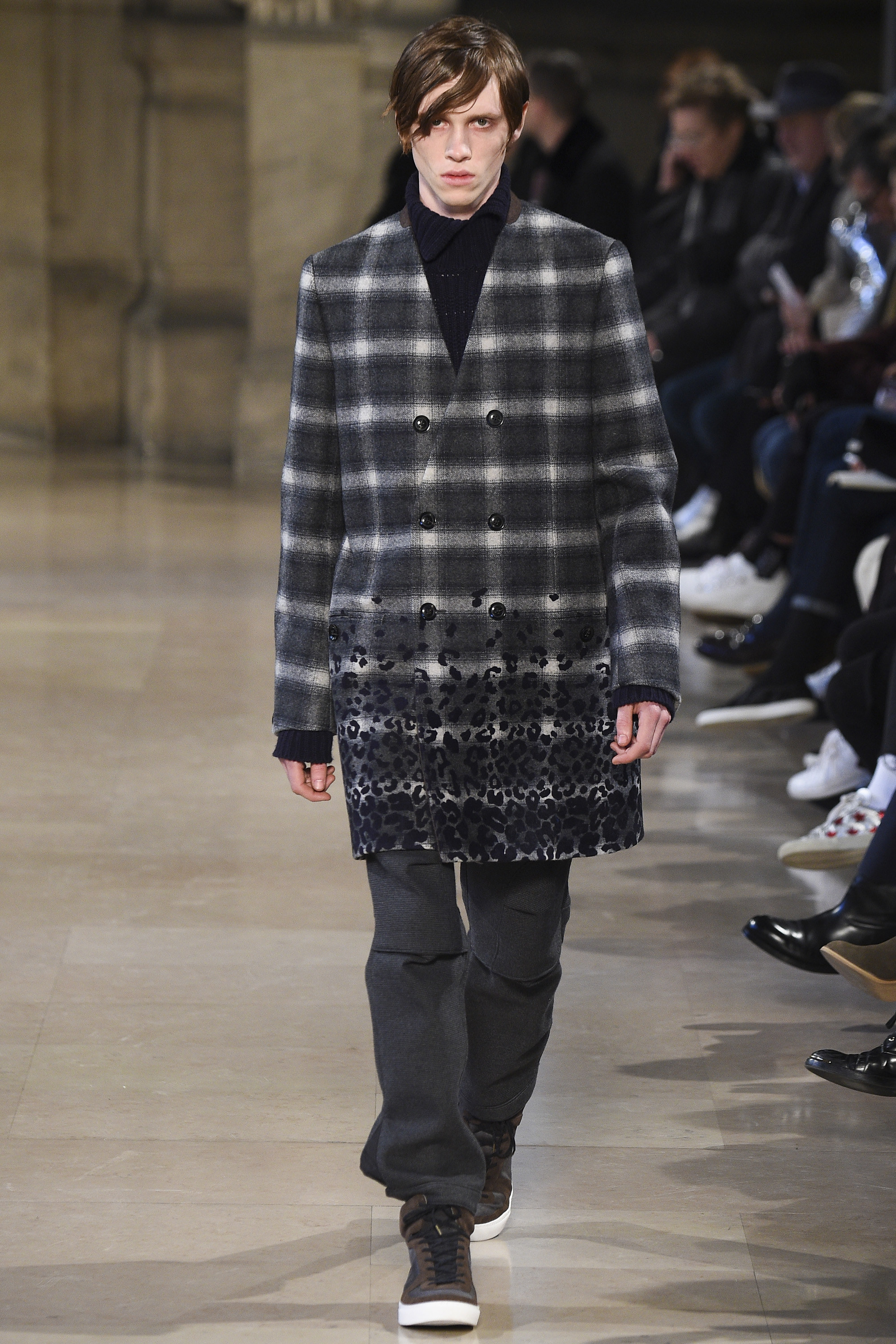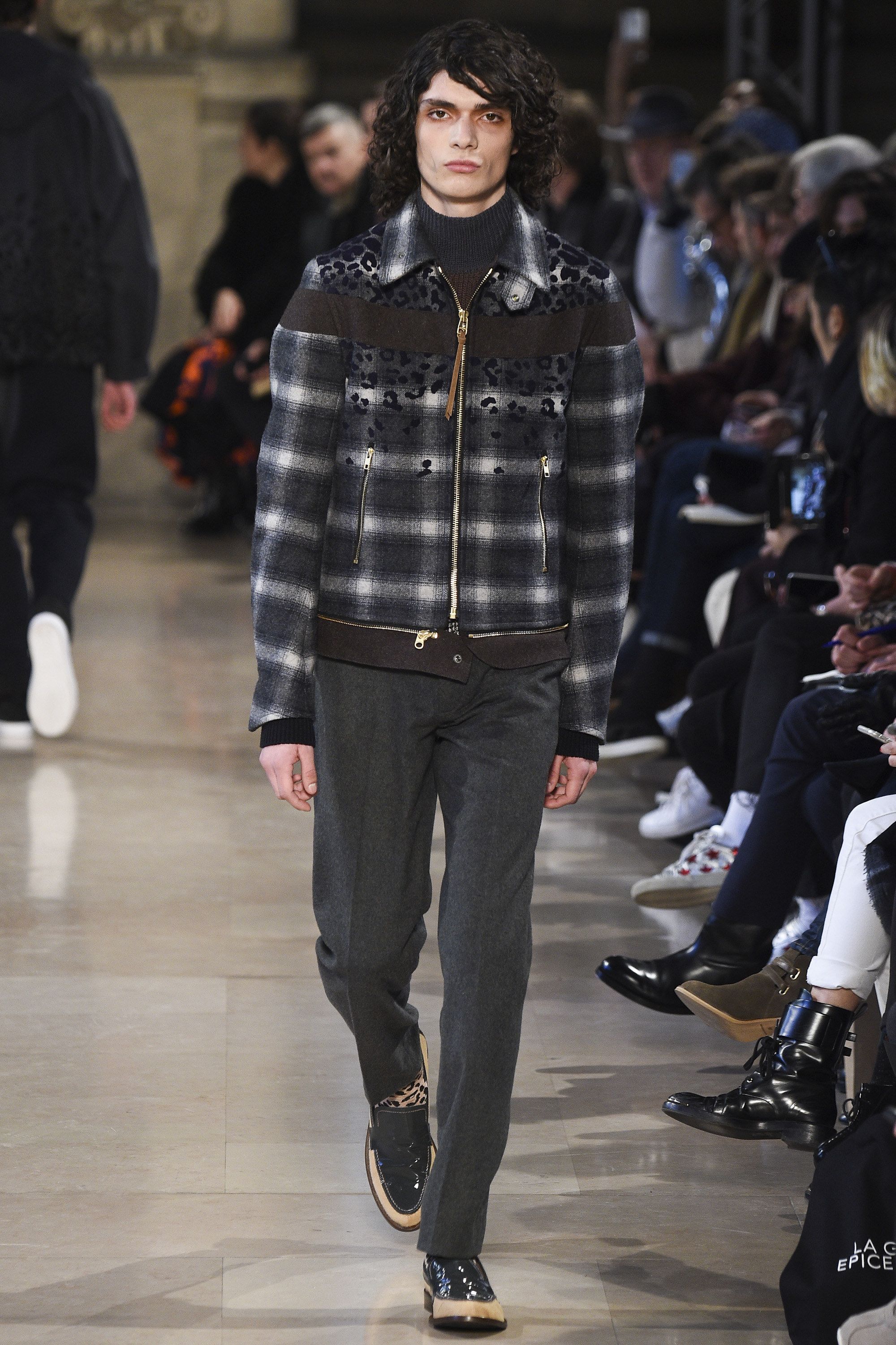 It was a mellow and dapper collection from Junichi Abe for his brand Kolor, and not only because of the warmth of the downbeat jazzy soundtrack — it was one of his best Kolor collections to date, full of nonchalant smartness. The show started with a tough, chic navy blue patent leather coat balanced by the soft beige of a tailored pant and the muted colors of a silk shirt. The look sent the message that Abe was in a glamorized mode, but the designer did it with a subtle touch and never fell into too precious of territory. Leopard dots came flocked on gray tailoring, such as down the belt of a pant or at the bottom of a roomy coat. Polka dots overprinted on a masculine cotton tartan shirt; dark ponyskin on the collars of checked coats and suits, and a Lurex tweed fabric inserted at the waistband of tailored flannel pants were some of the feminine elements spicing the collection, which was tinged with casual and sporty elements, giving them a dressy glaze.