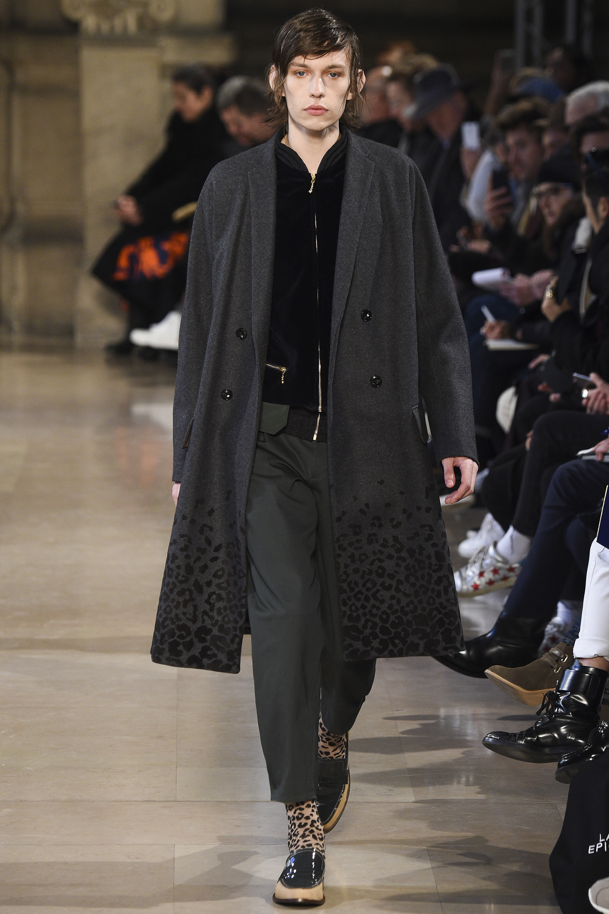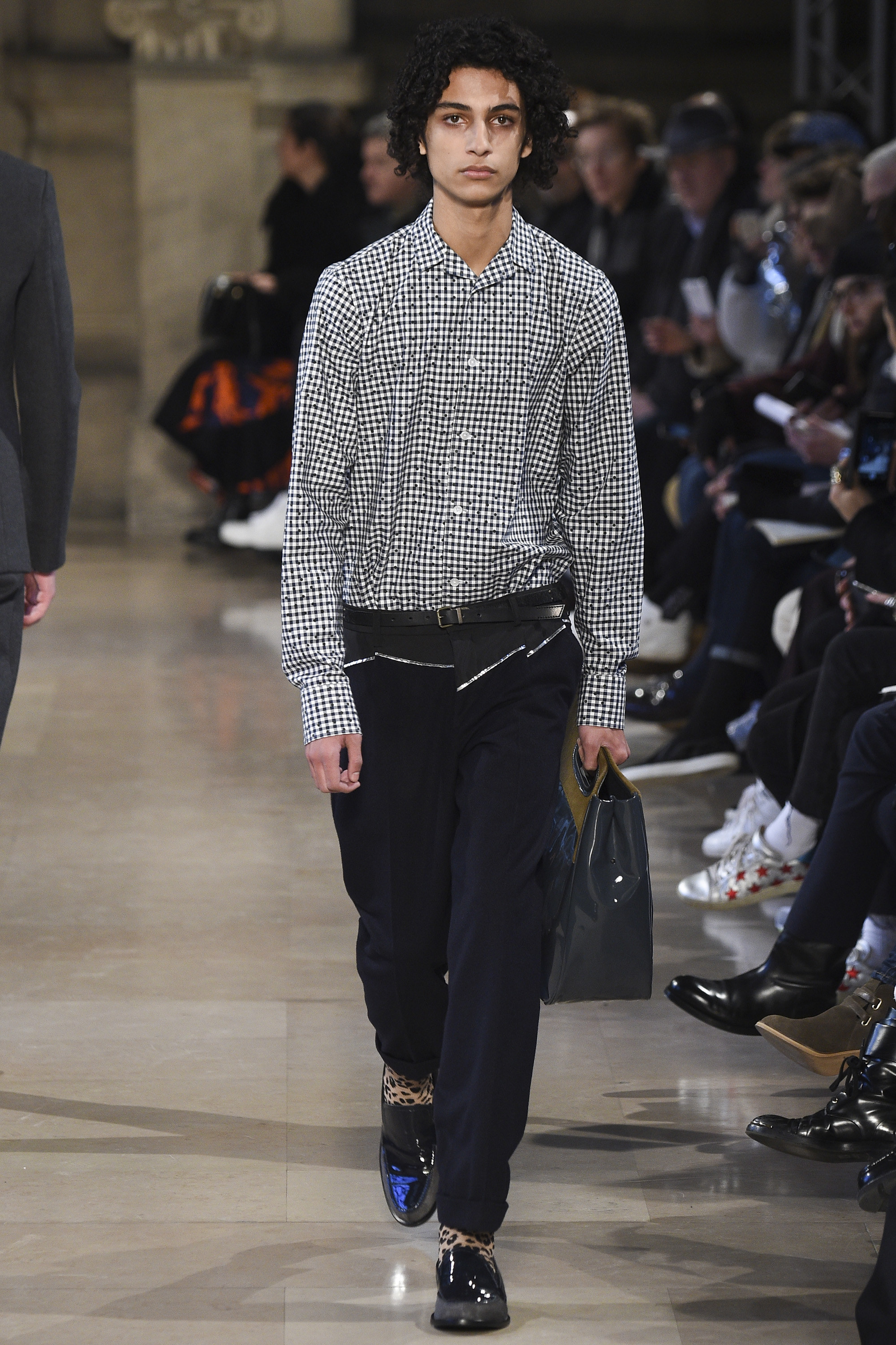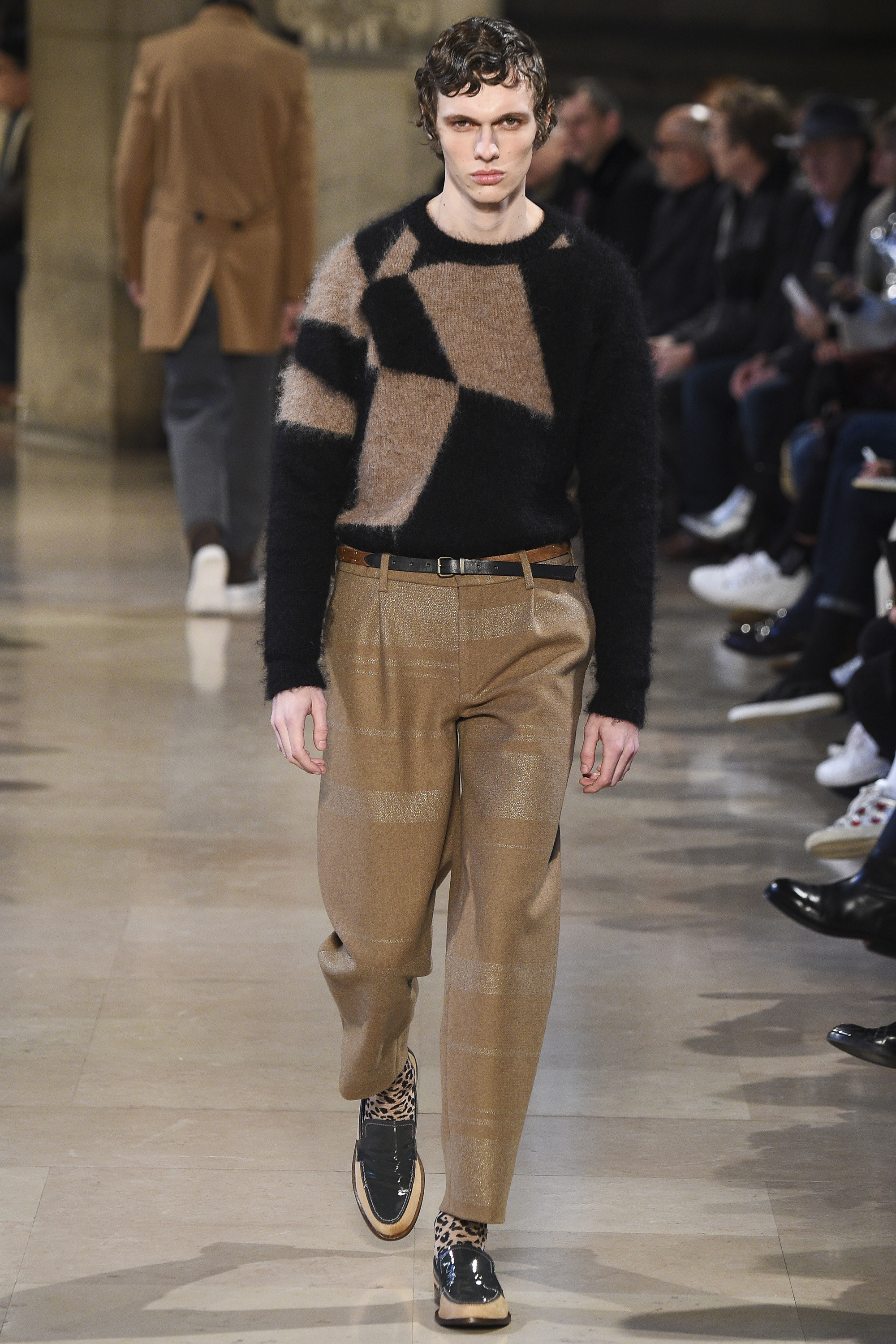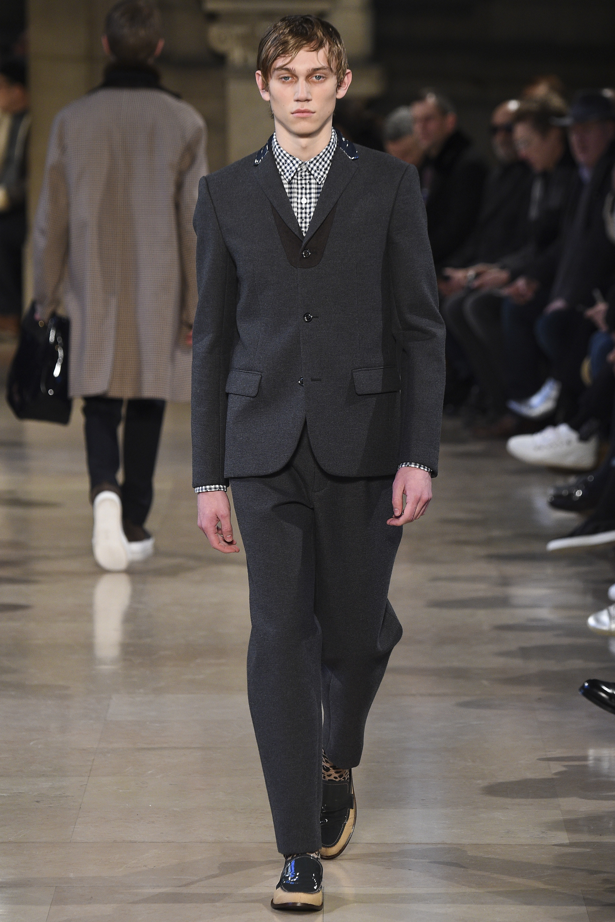 It was a mellow and dapper collection from Junichi Abe for his brand Kolor, and not only because of the warmth of the downbeat jazzy soundtrack — it was one of his best Kolor collections to date, full of nonchalant smartness. The show started with a tough, chic navy blue patent leather coat balanced by the soft beige of a tailored pant and the muted colors of a silk shirt. The look sent the message that Abe was in a glamorized mode, but the designer did it with a subtle touch and never fell into too precious of territory. Leopard dots came flocked on gray tailoring, such as down the belt of a pant or at the bottom of a roomy coat. Polka dots overprinted on a masculine cotton tartan shirt; dark ponyskin on the collars of checked coats and suits, and a Lurex tweed fabric inserted at the waistband of tailored flannel pants were some of the feminine elements spicing the collection, which was tinged with casual and sporty elements, giving them a dressy glaze.