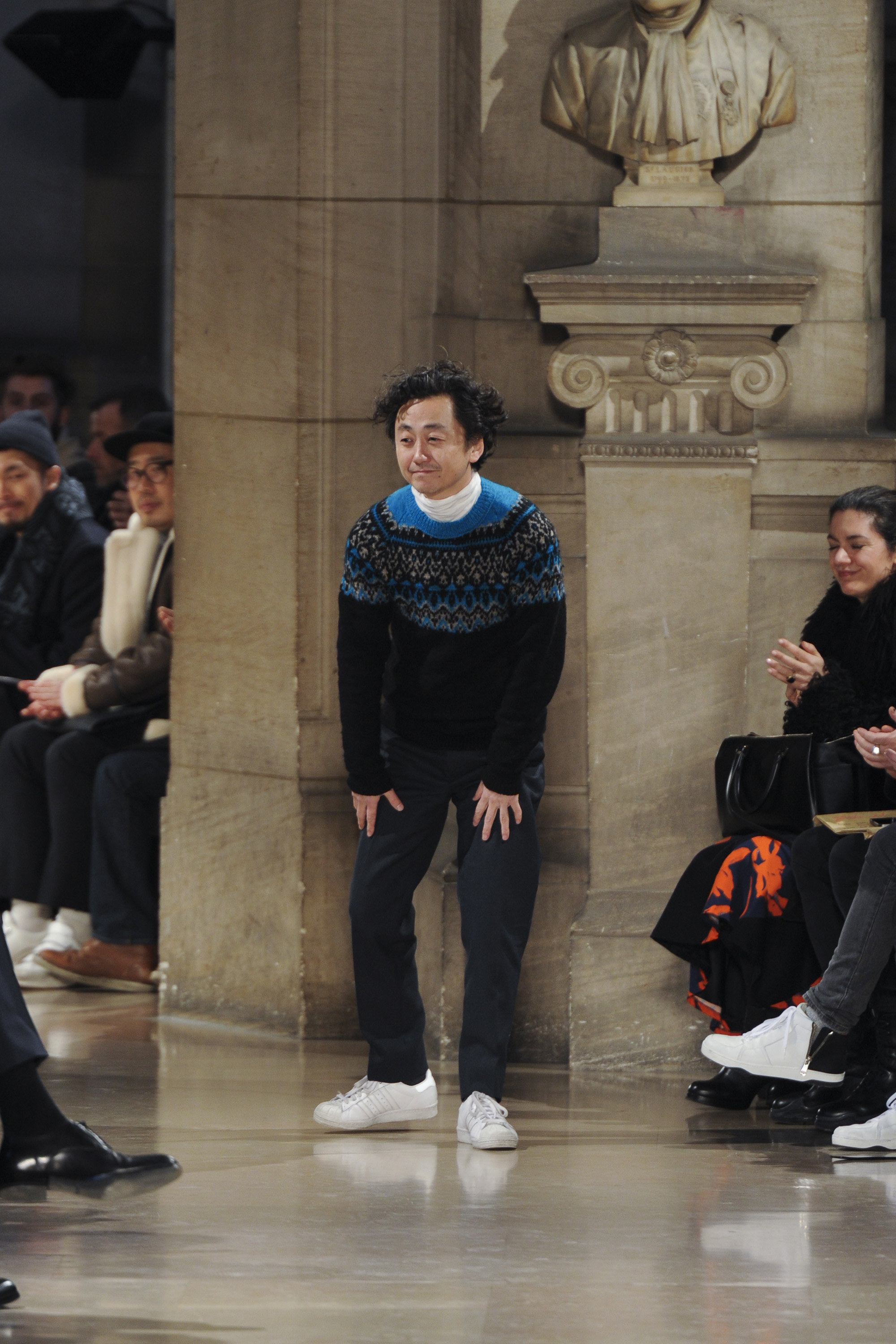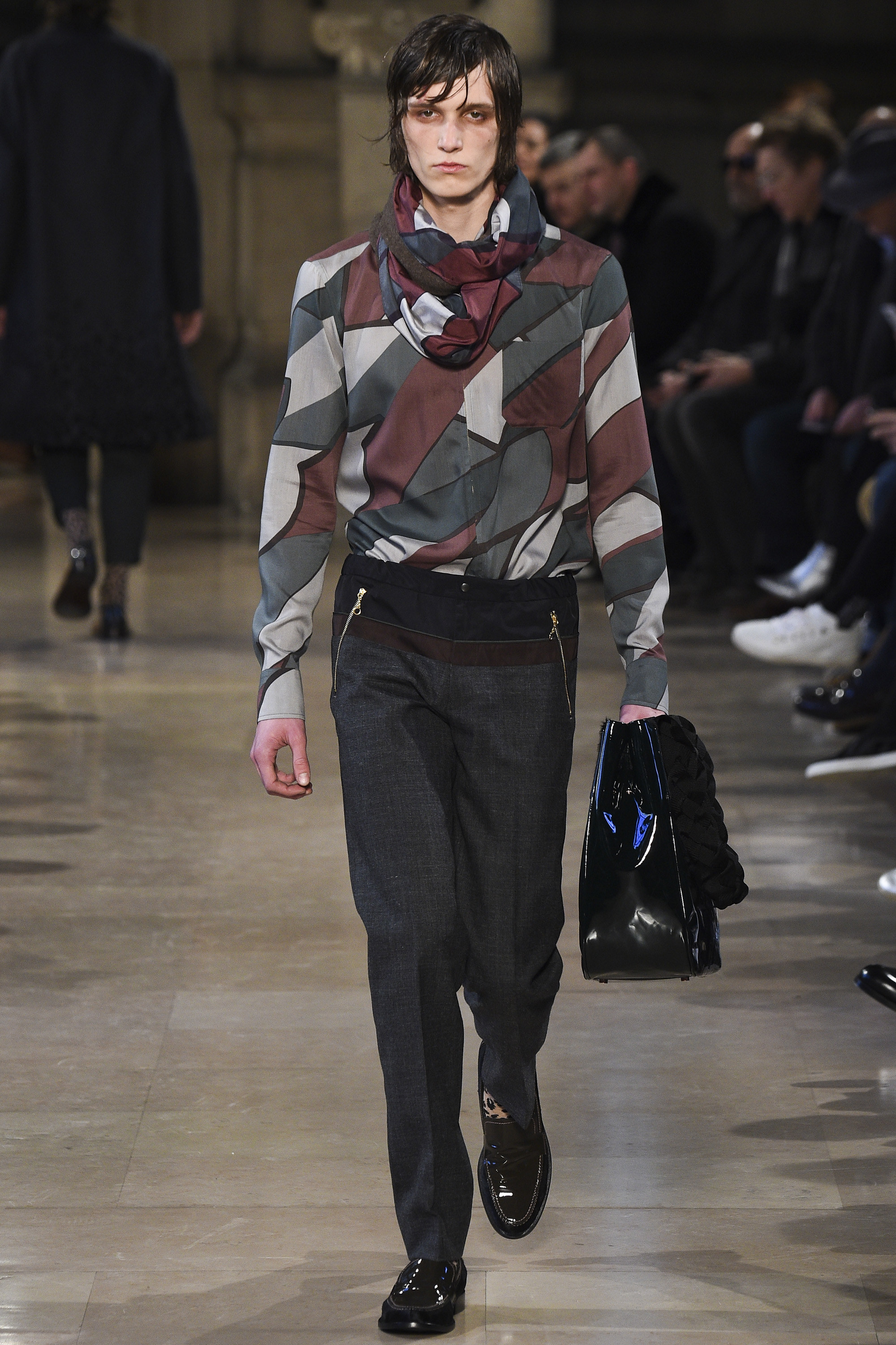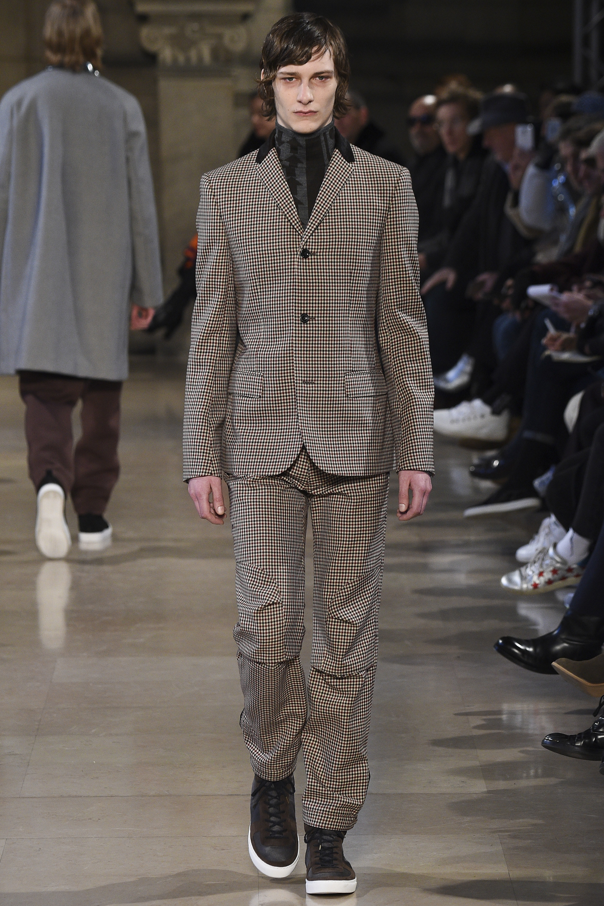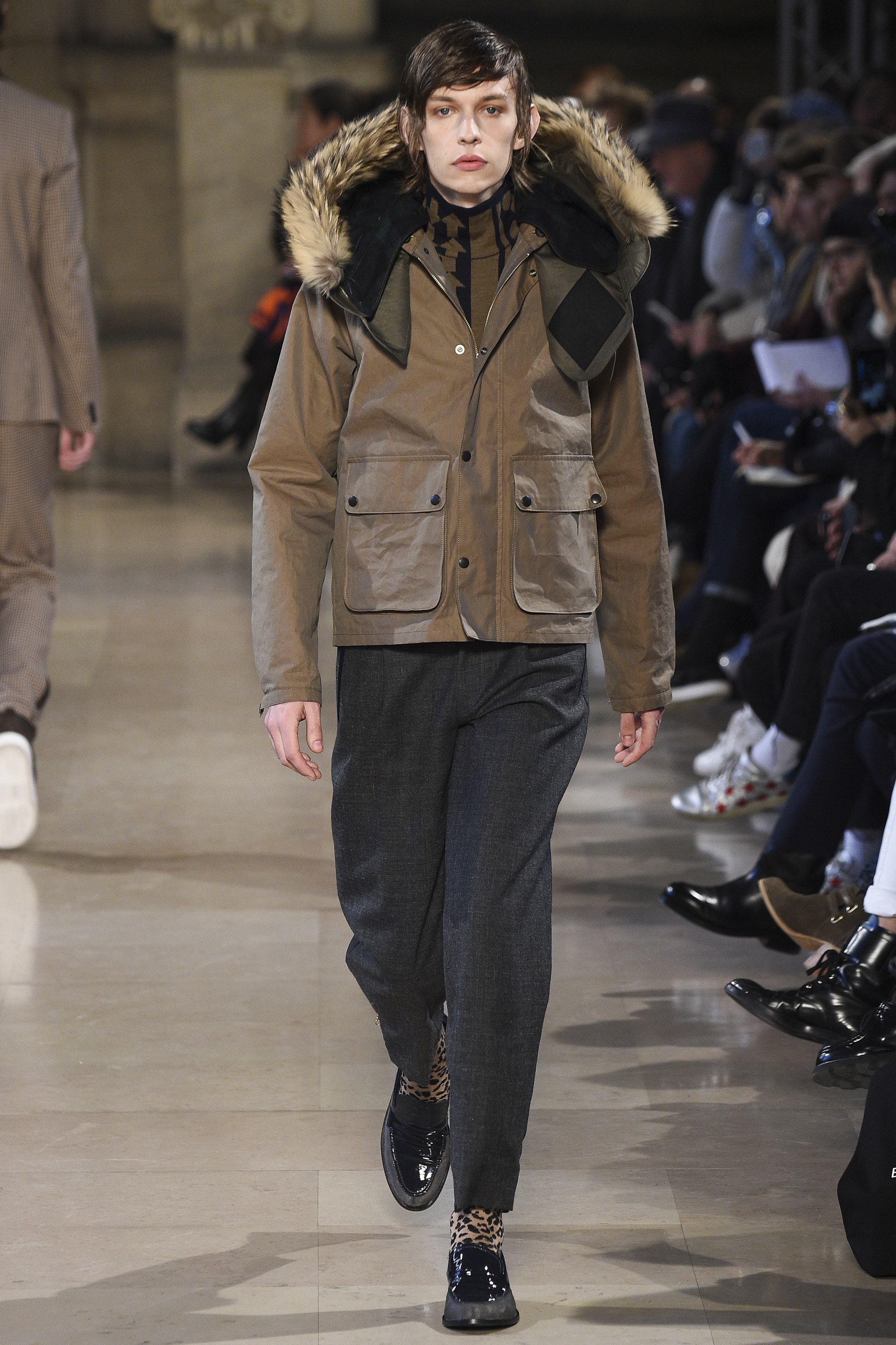 It was a mellow and dapper collection from Junichi Abe for his brand Kolor, and not only because of the warmth of the downbeat jazzy soundtrack — it was one of his best Kolor collections to date, full of nonchalant smartness. The show started with a tough, chic navy blue patent leather coat balanced by the soft beige of a tailored pant and the muted colors of a silk shirt. The look sent the message that Abe was in a glamorized mode, but the designer did it with a subtle touch and never fell into too precious of territory. Leopard dots came flocked on gray tailoring, such as down the belt of a pant or at the bottom of a roomy coat. Polka dots overprinted on a masculine cotton tartan shirt; dark ponyskin on the collars of checked coats and suits, and a Lurex tweed fabric inserted at the waistband of tailored flannel pants were some of the feminine elements spicing the collection, which was tinged with casual and sporty elements, giving them a dressy glaze.